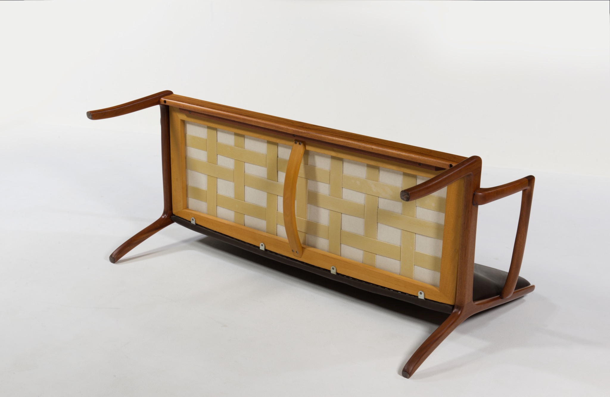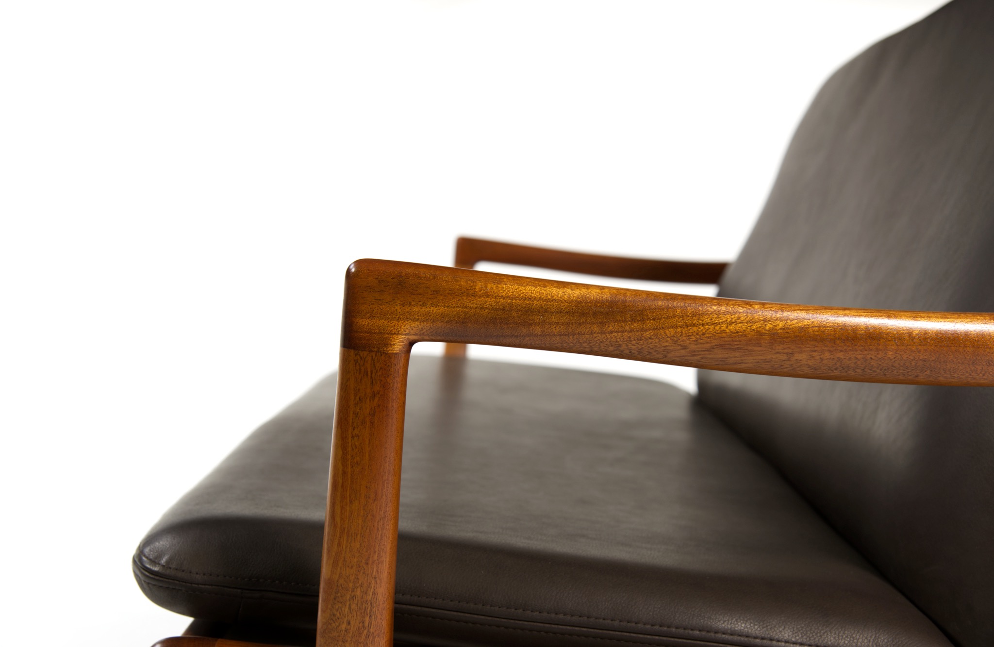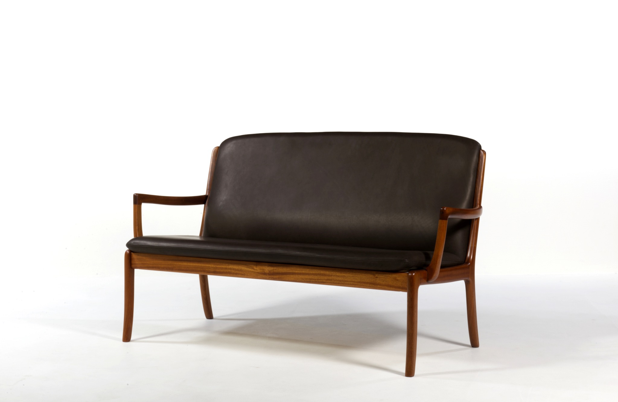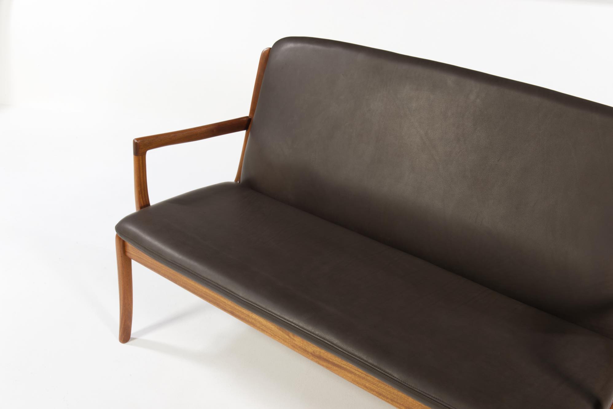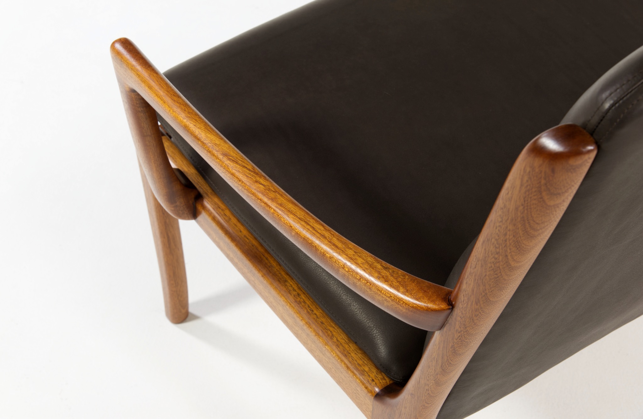 デンマークを代表する家具デザイナー、Ole Wanscher/オーレ・ヴァンシャーによるセッティです。1960~70年代頃に作られたものでしょう。マホガニーのフレームはしっかりとした構造で、ヴァンシャー ならではの優美な曲線を有した座りやすい椅子です。シートは新たにデンマークのCAMO leather社のダークブラウンの皮革で張り替えました。向かって左後脚に古い補修が見られますが、緩みなどはなく使用上の問題は無いでしょう。その他、コンディションは良好です。