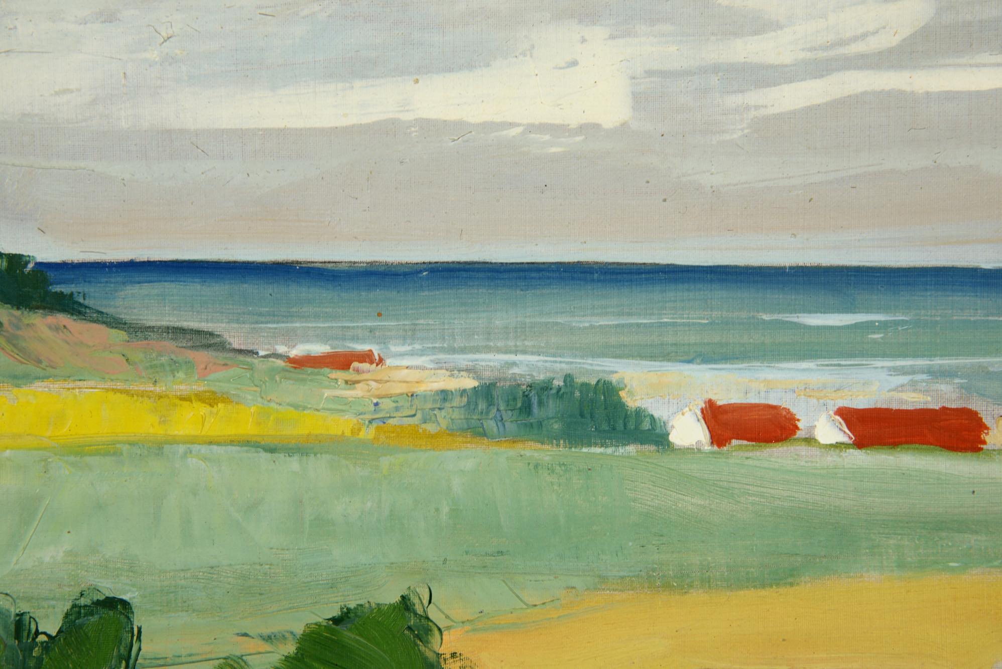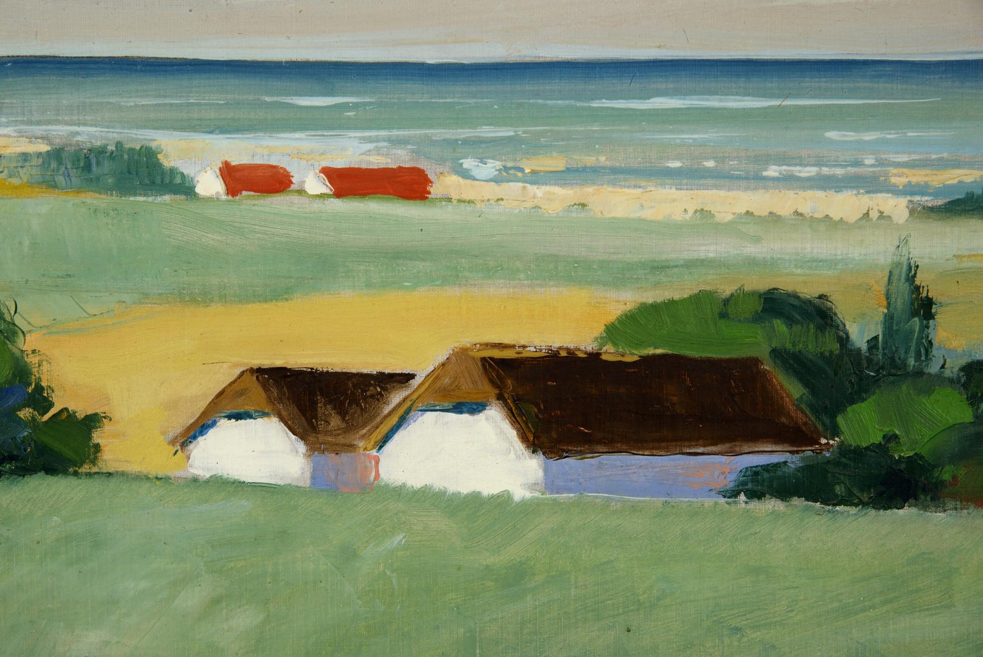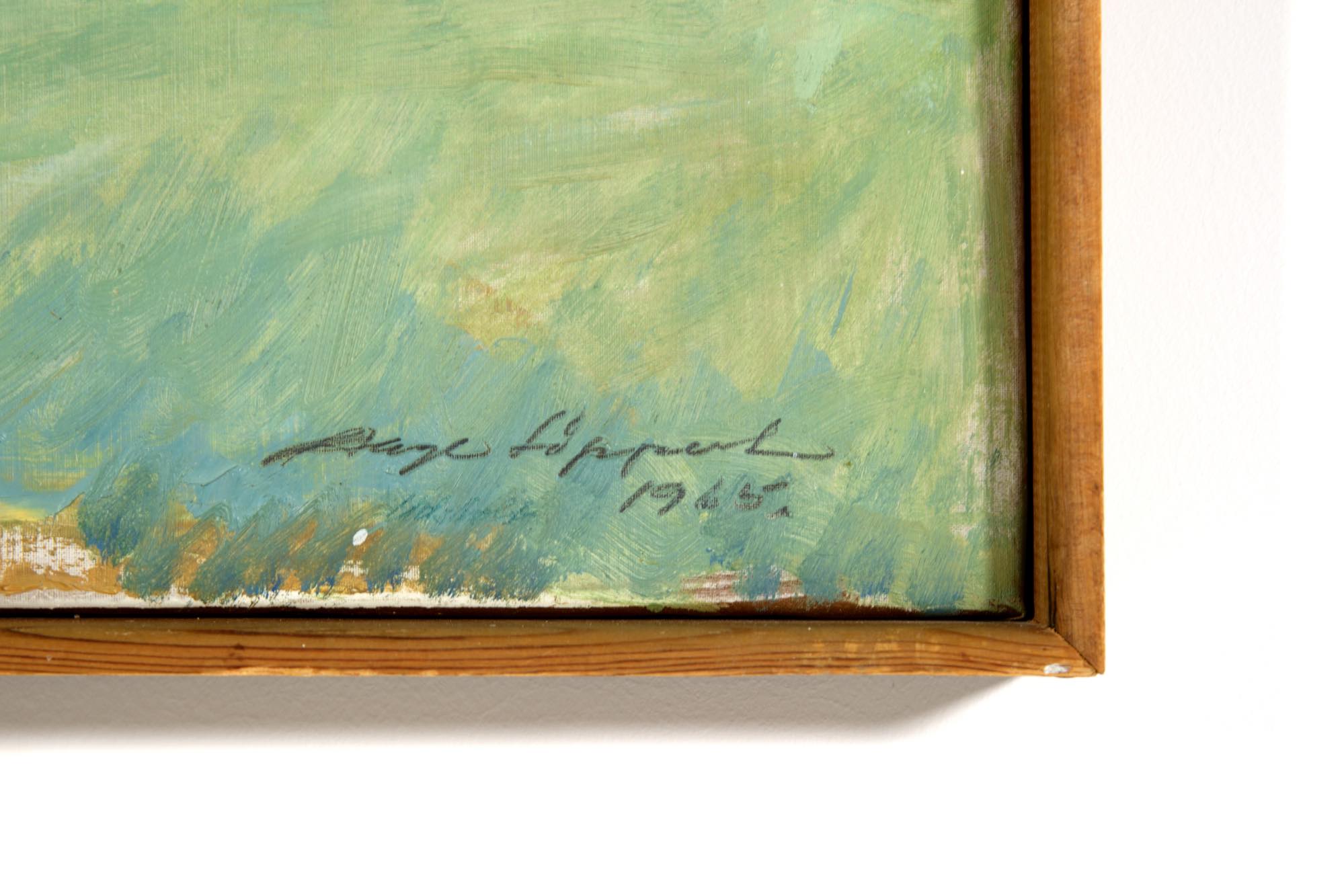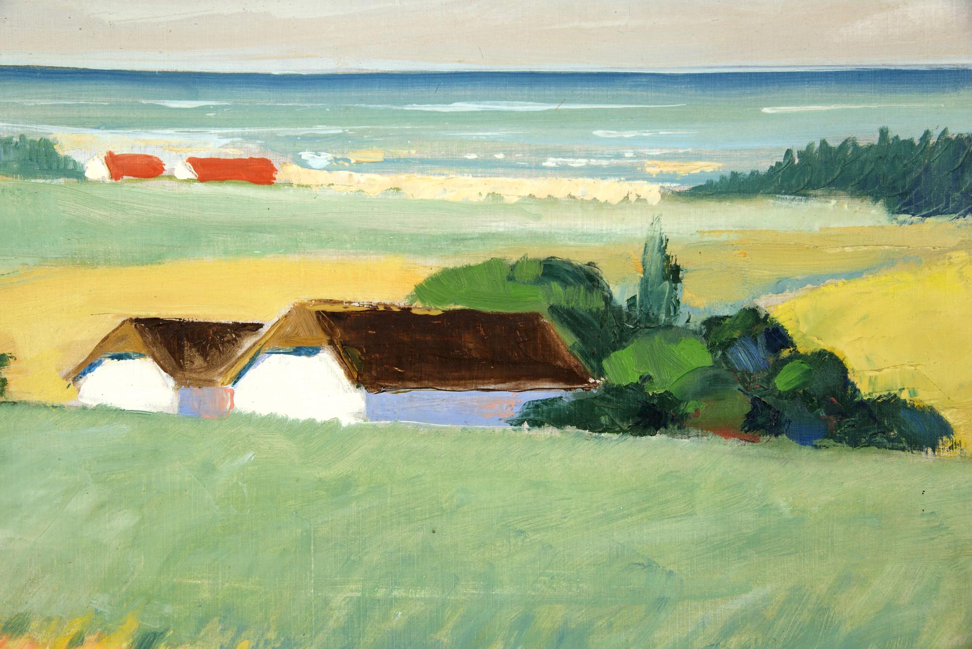 デンマークの画家で、イラストレーターとしても活躍した Aage Lippert/オーゲ・リパートによる風景画作品です。1965年に描かれたもので、遠くに菜の花の咲く海岸沿いの風景を描いています。パイン材のフレームはオリジナルで、コンディションは良好です。