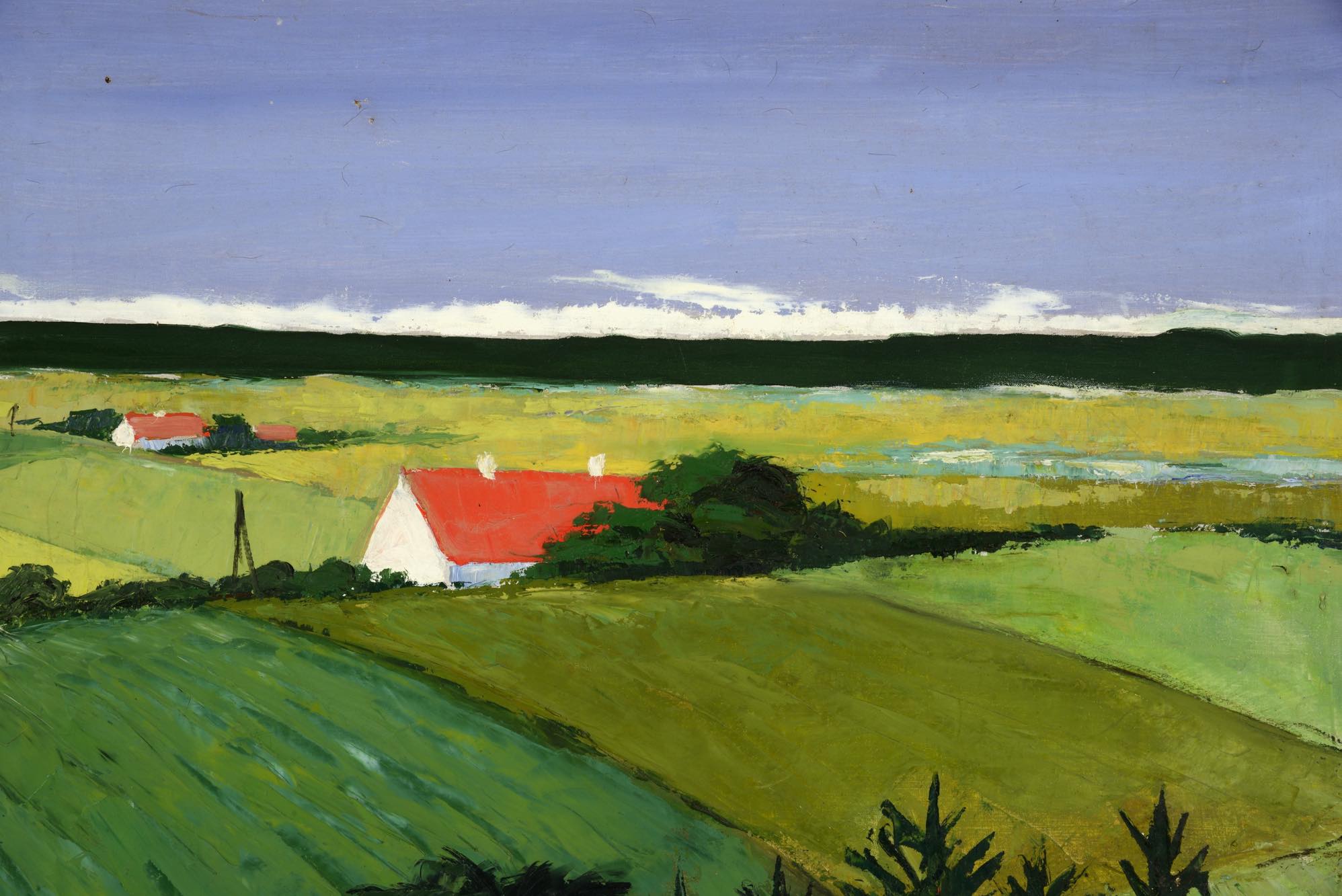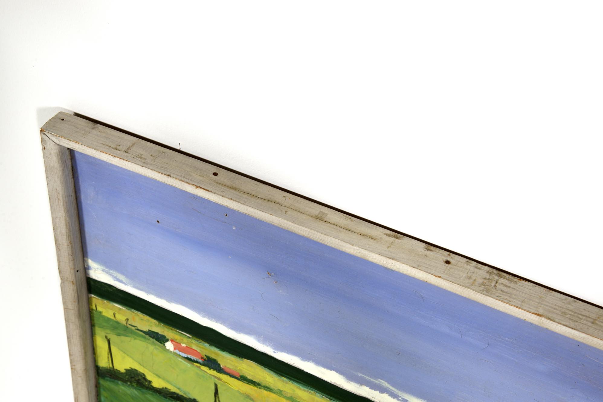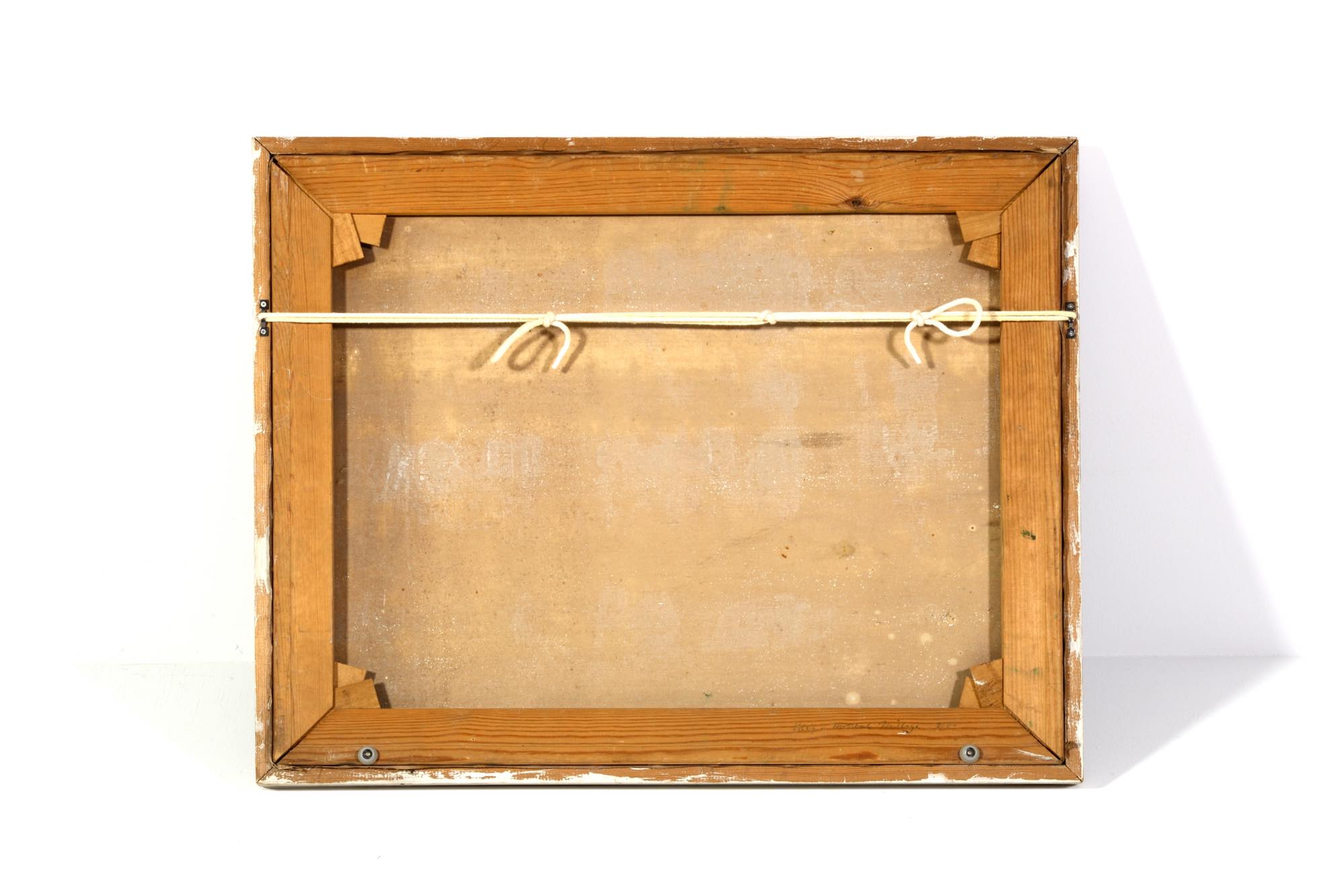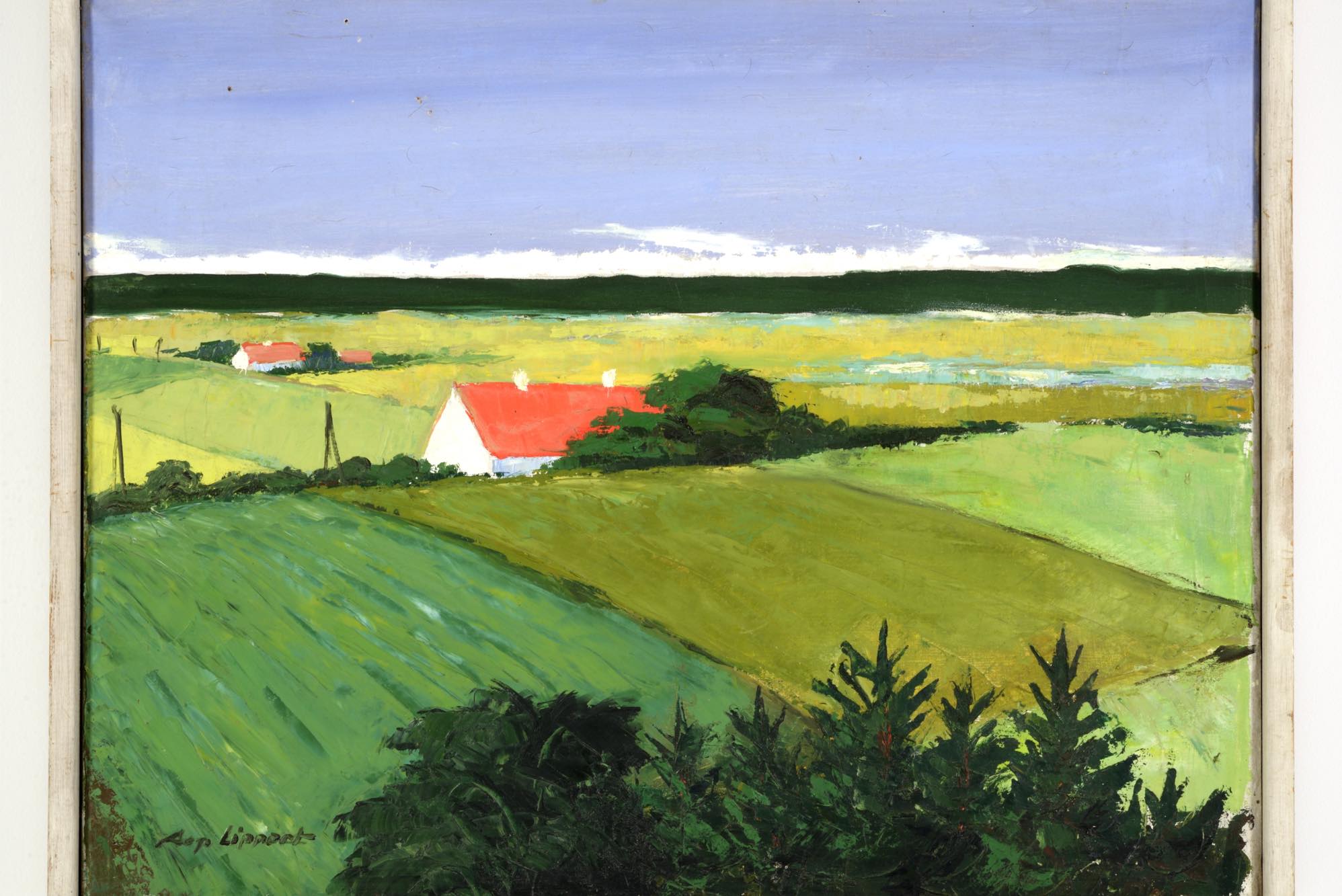 デンマークの画家で、イラストレーターとしても活躍した Aage Lippert/オーゲ・リパートによる風景画作品です。1960年代に描かれたものと思われ、遠くに菜の花の咲く田園風景を描いています。ペイントのフレームはオリジナルですが、経年の劣化が見られます。また、キャンバスにも小穴が見られ、ややダメージのあるコンディションとなりますが、鑑賞には差し支えないでしょう。