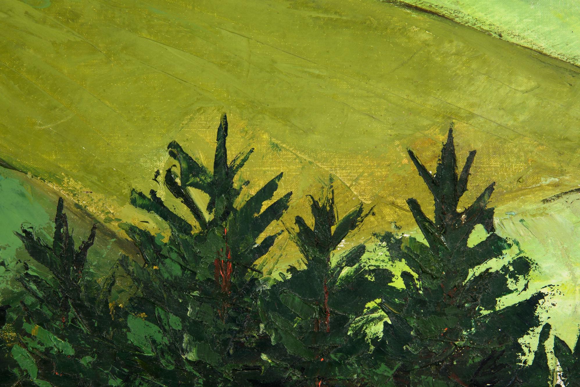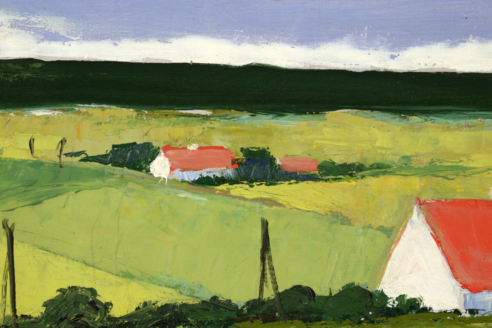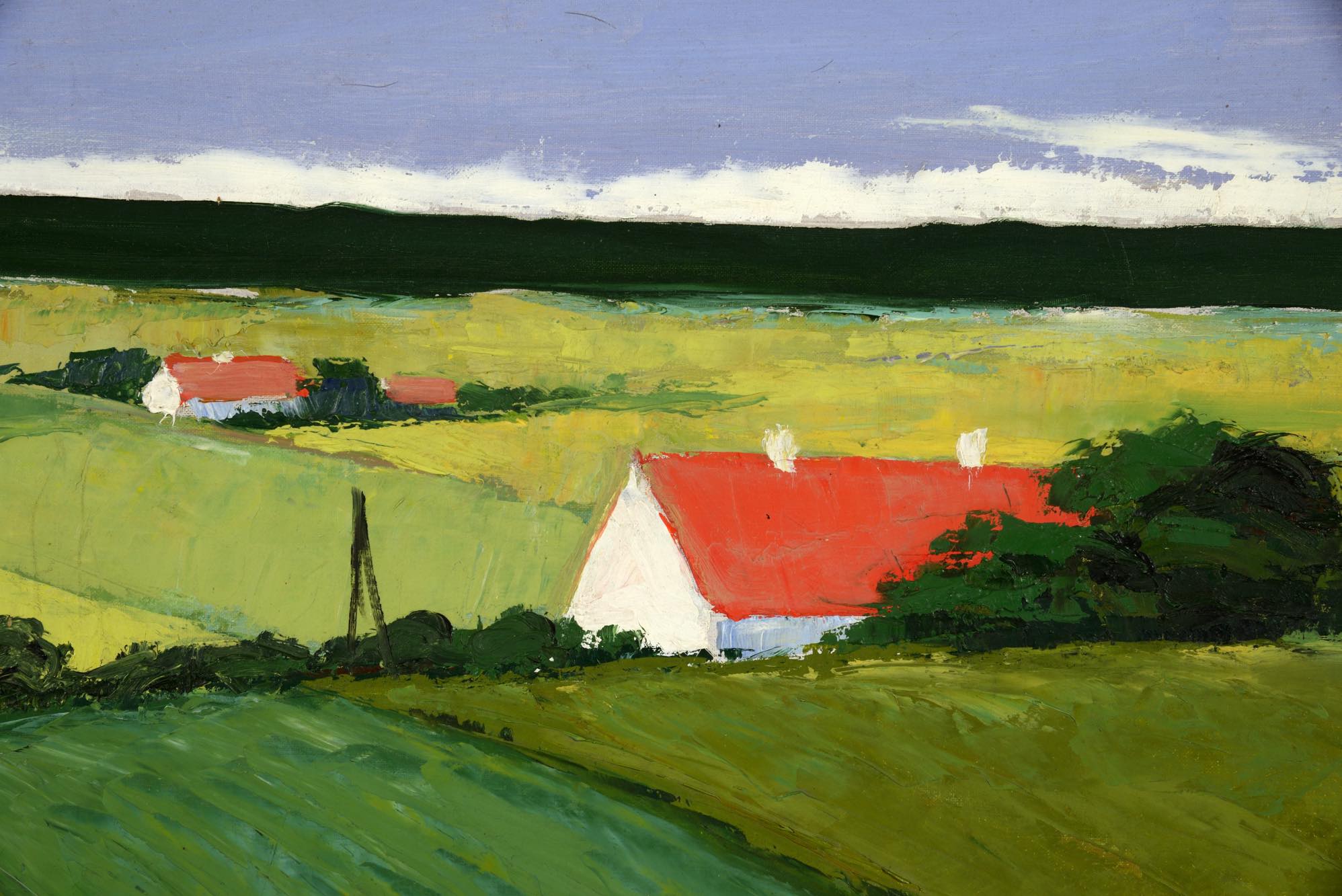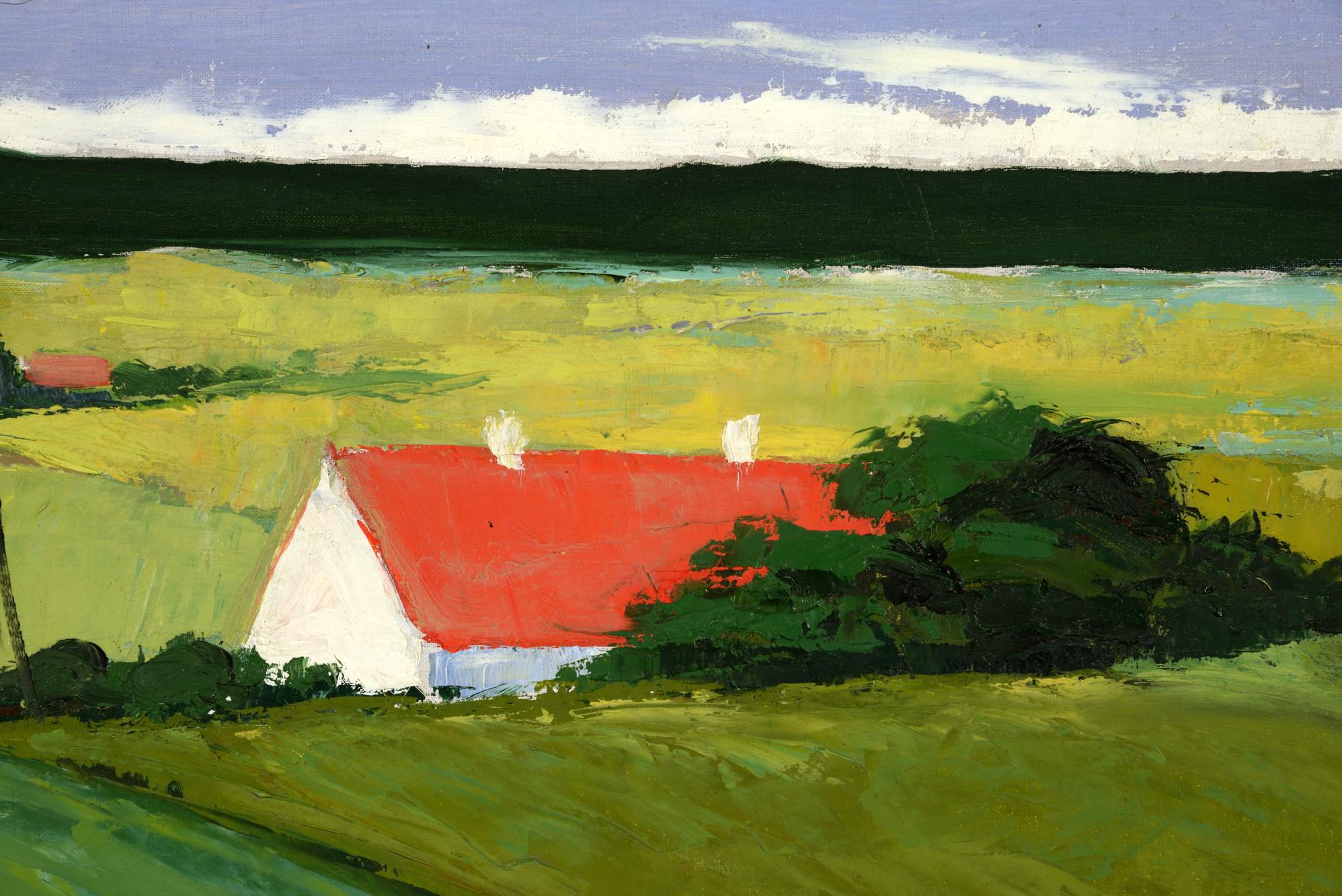 デンマークの画家で、イラストレーターとしても活躍した Aage Lippert/オーゲ・リパートによる風景画作品です。1960年代に描かれたものと思われ、遠くに菜の花の咲く田園風景を描いています。ペイントのフレームはオリジナルですが、経年の劣化が見られます。また、キャンバスにも小穴が見られ、ややダメージのあるコンディションとなりますが、鑑賞には差し支えないでしょう。