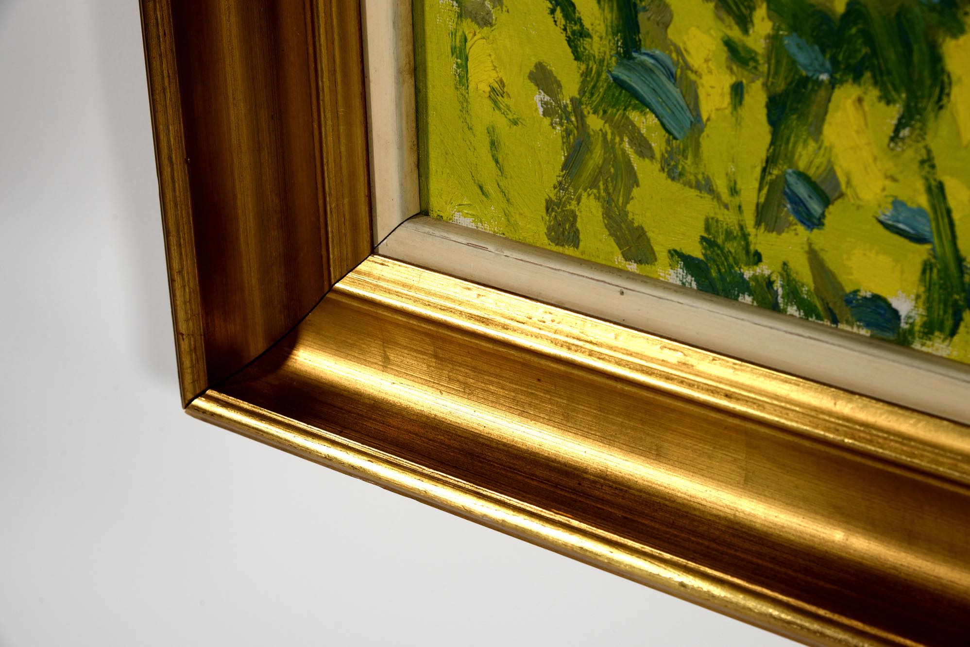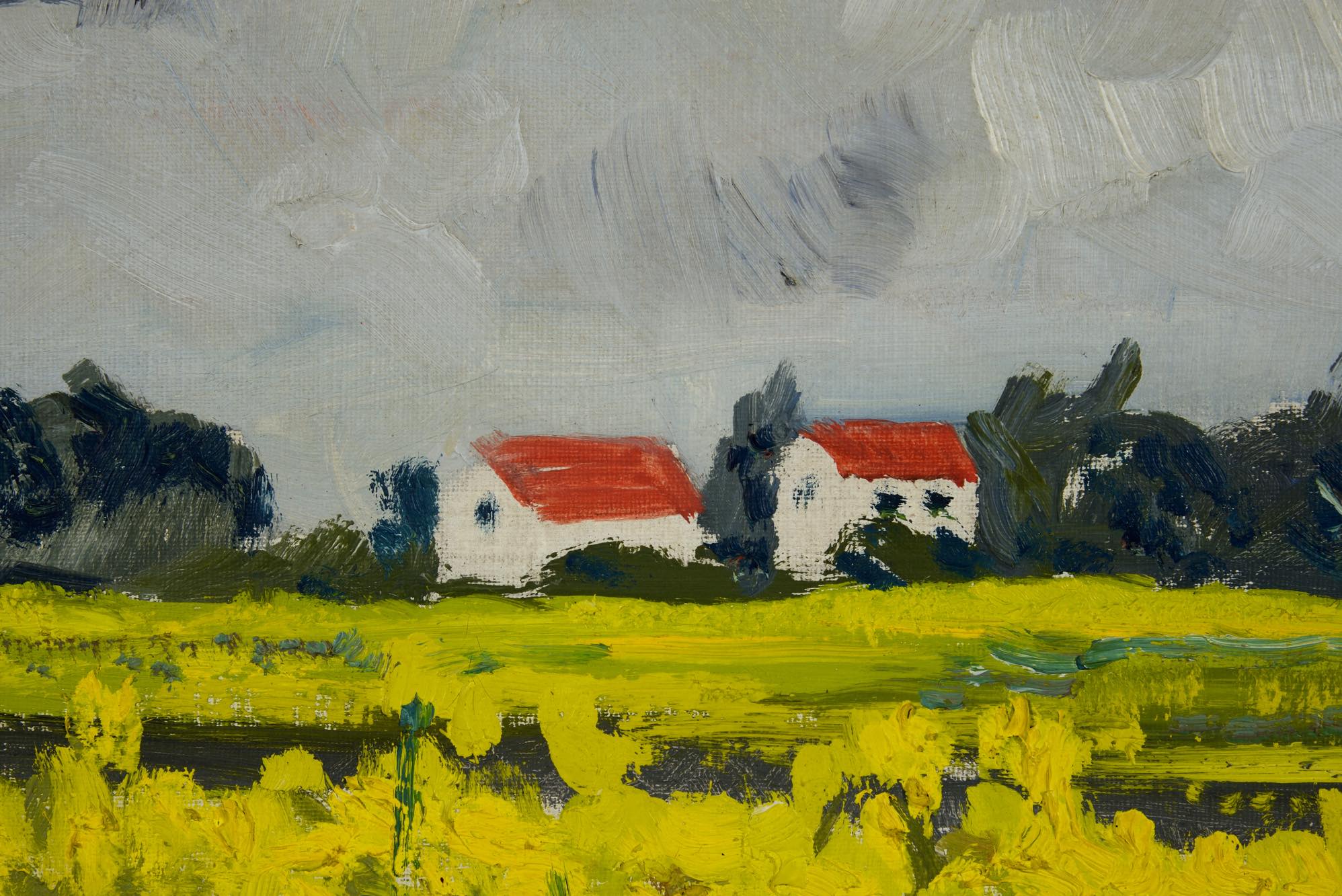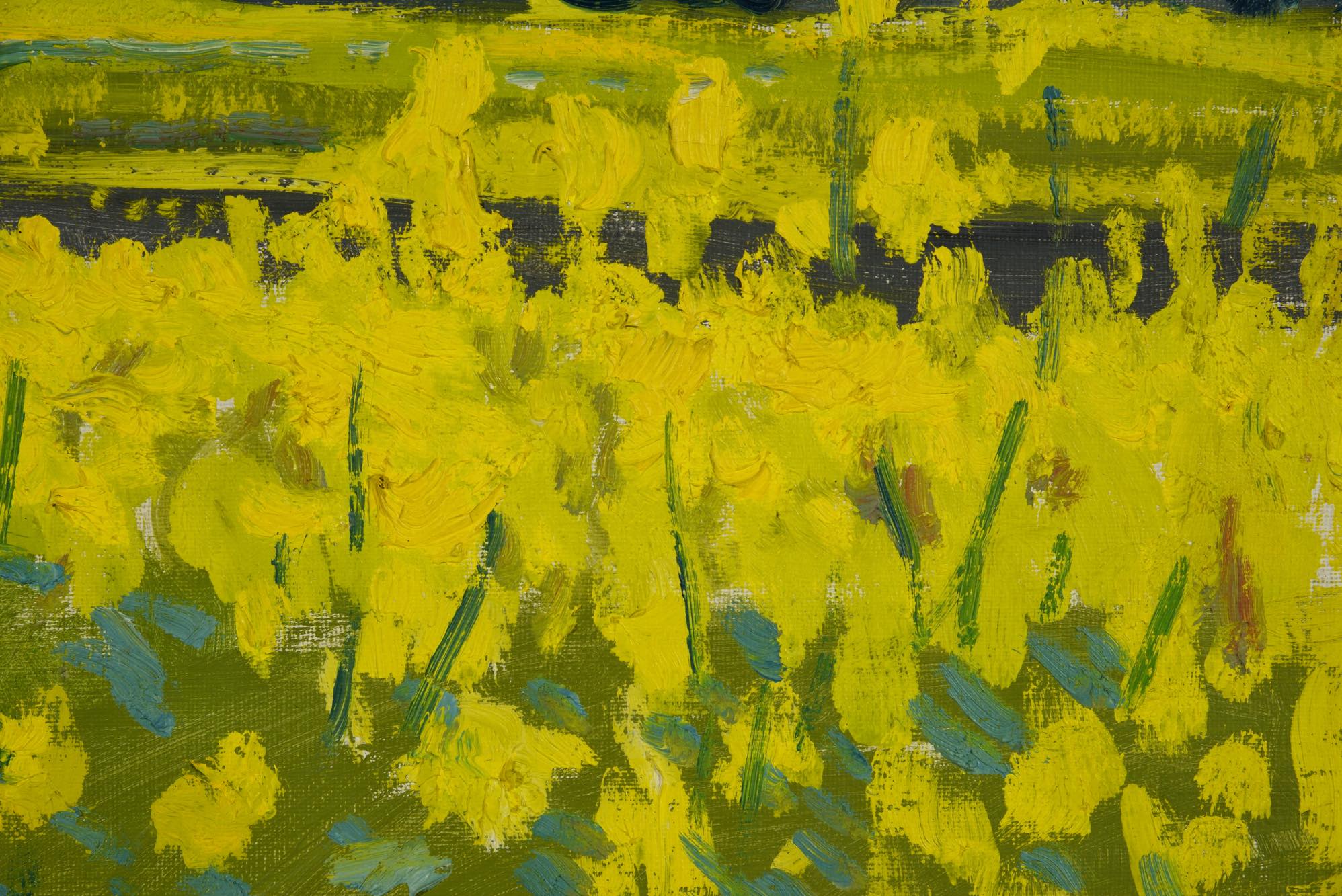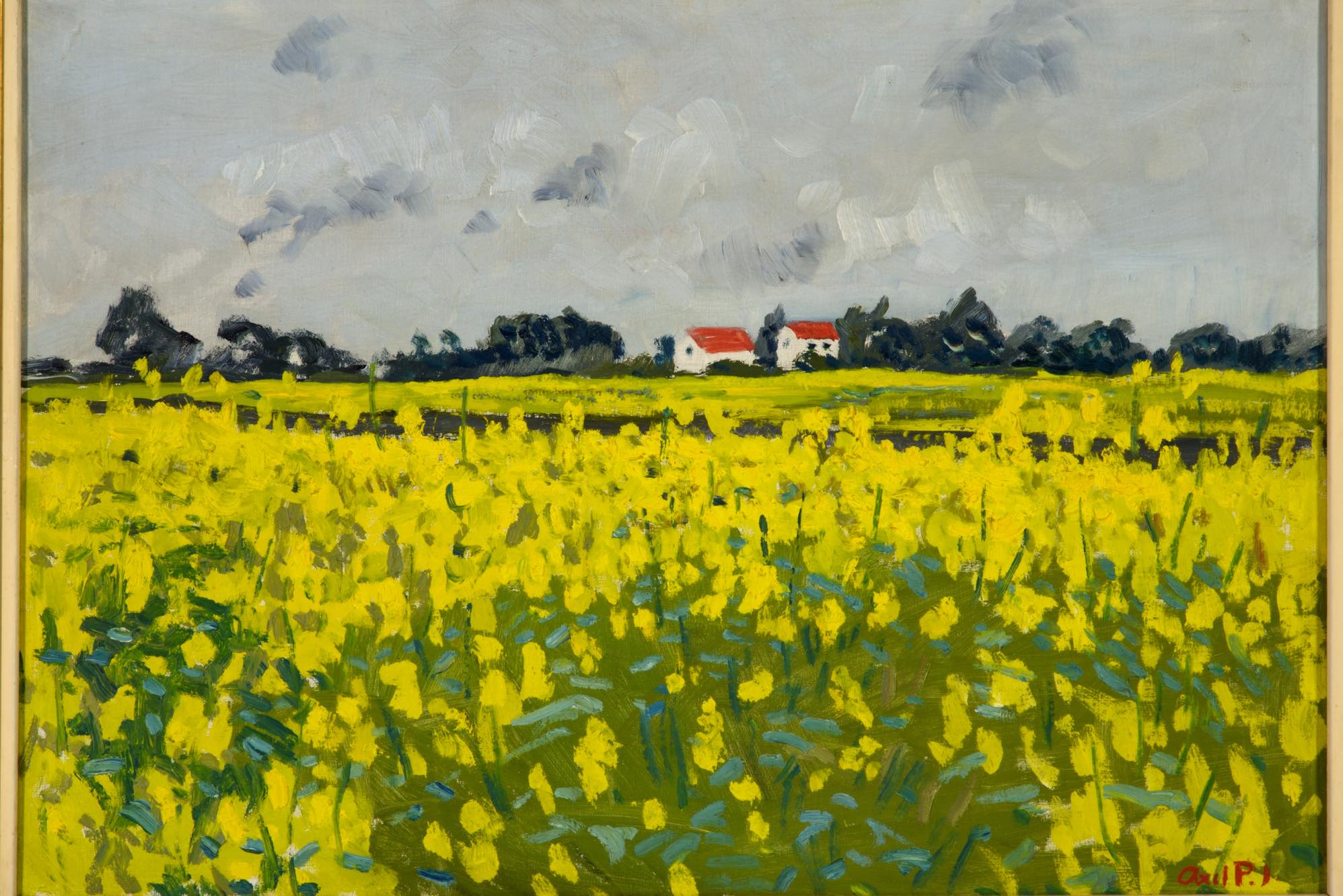 デンマークの画家、Axel Peder Jensen/アクセル・ペダー・イェンセンによる風景画油彩作品です。春の薄曇りの空のもと、あたり一面に咲き乱れる菜の花畑の風景を描いた作品で、大ぶりなキャンバスに描かれています。金箔のフレームはオリジナルで、コンディションは良好です。原題のない作品には便宜上当店でタイトルを設定しております。