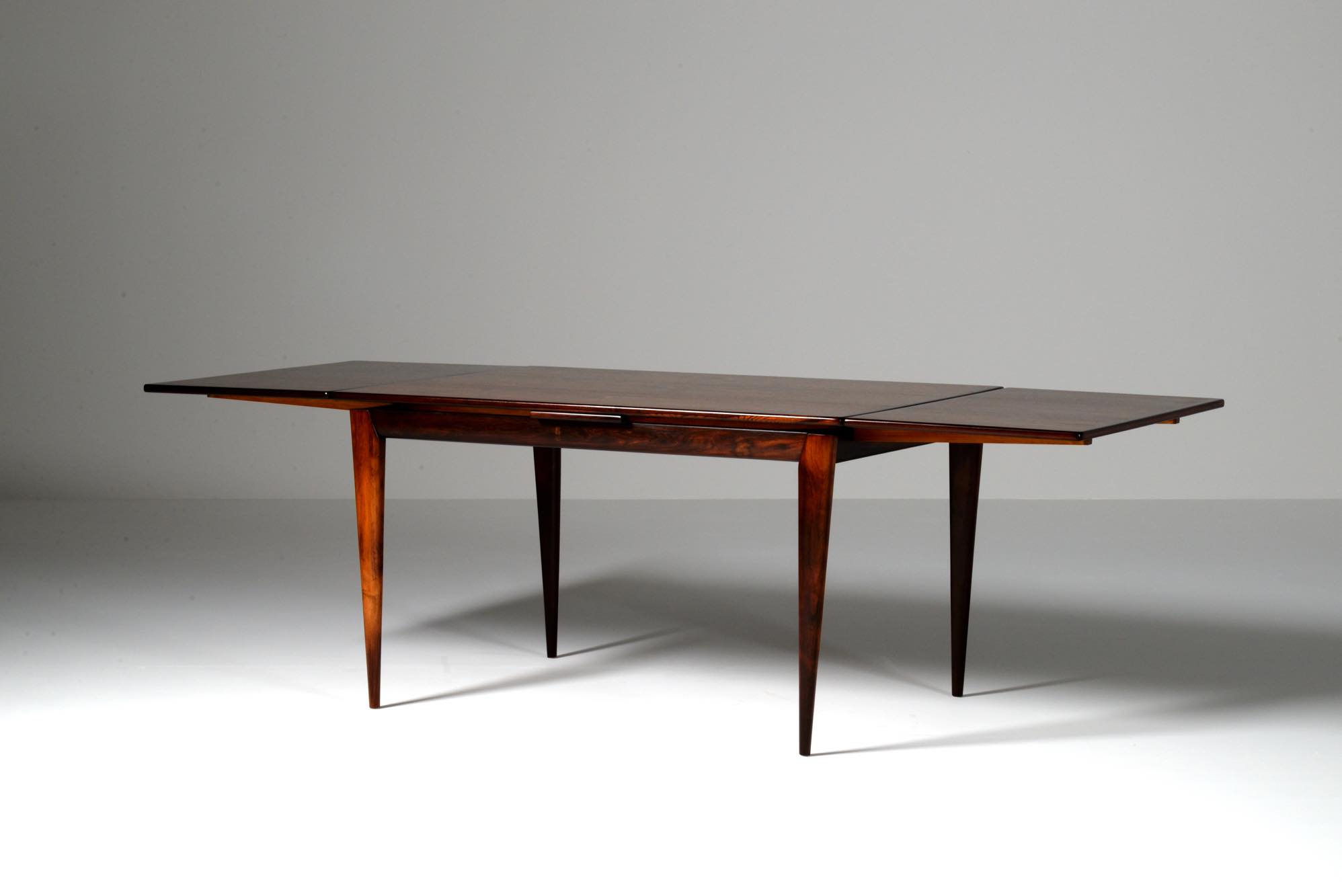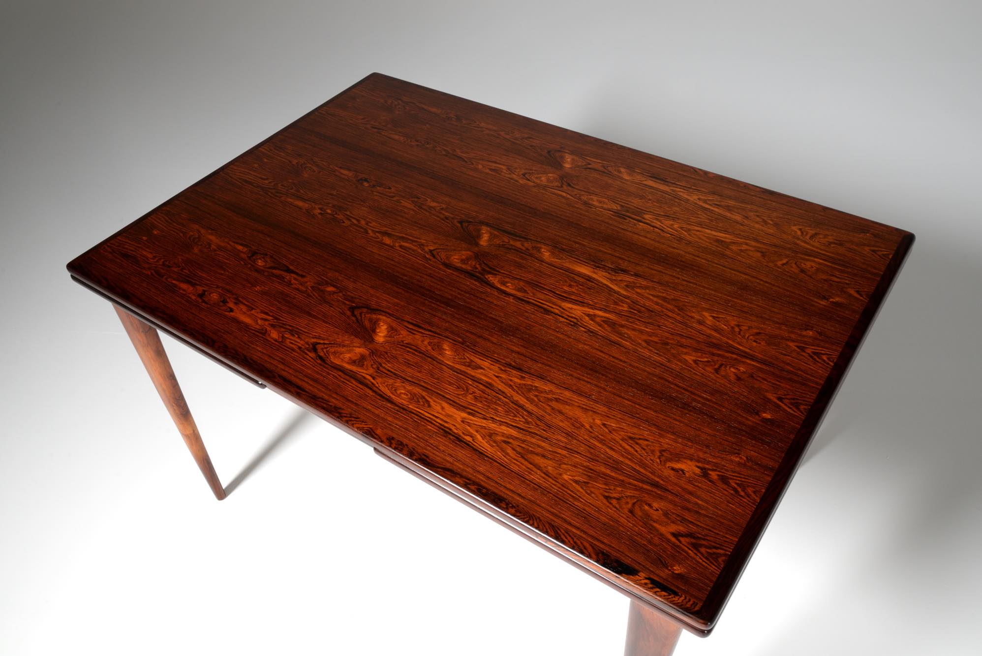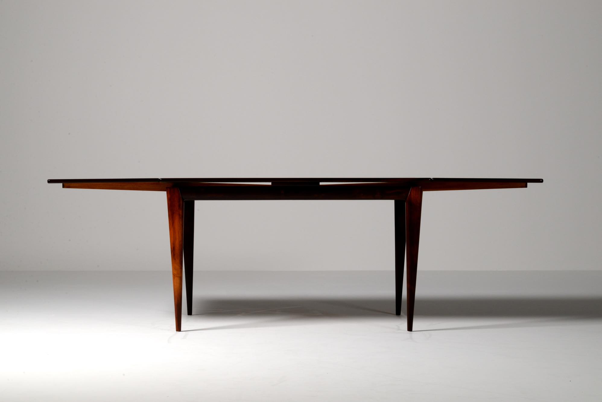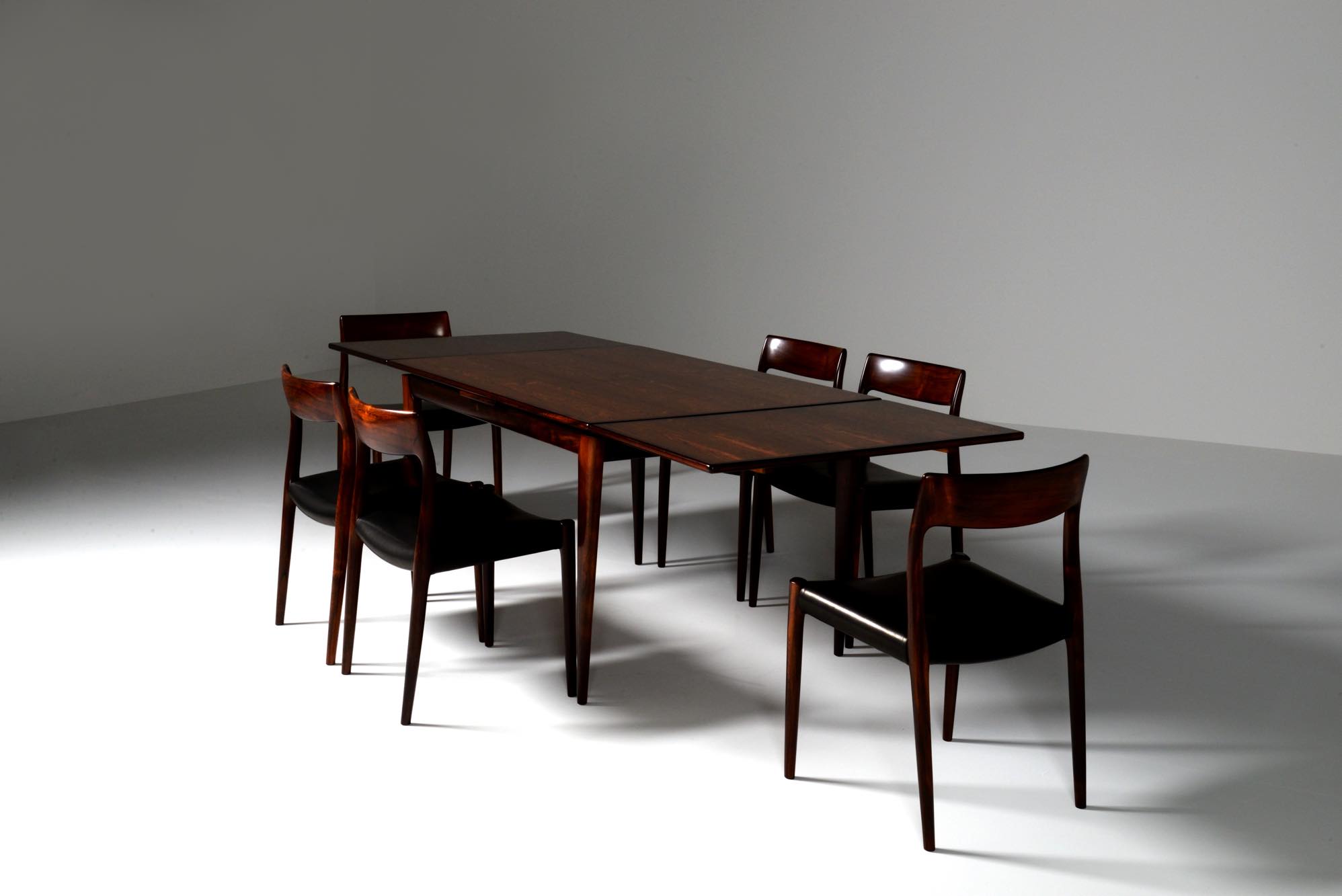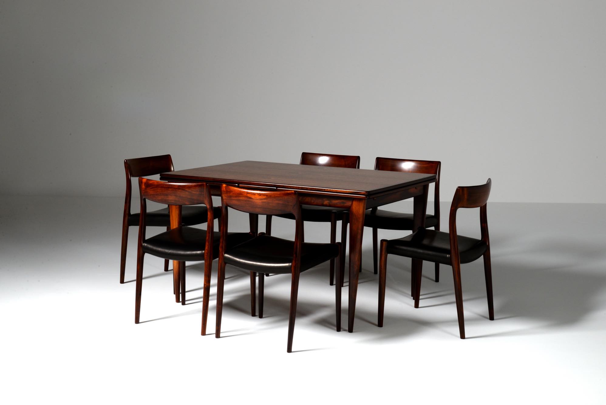 デンマークの家具工房、J.L. Møller/J.L.モラーによるダイニングテーブル "Model 254"(A)です。創業者のN.O. Moller/ニルス・オット・モラーによってデザインされたモデルで、こちらは1960年代頃に作られたヴィンテージ品となります。脚や幕板などが無垢材で作られたもので、重厚で丁寧な作りのテーブルです。主天板の下にエクステンションリーフが備わり、天板面積を拡張できます。同モデルの(B)を同時に出品しており、コンディションもそれぞれ良好です。