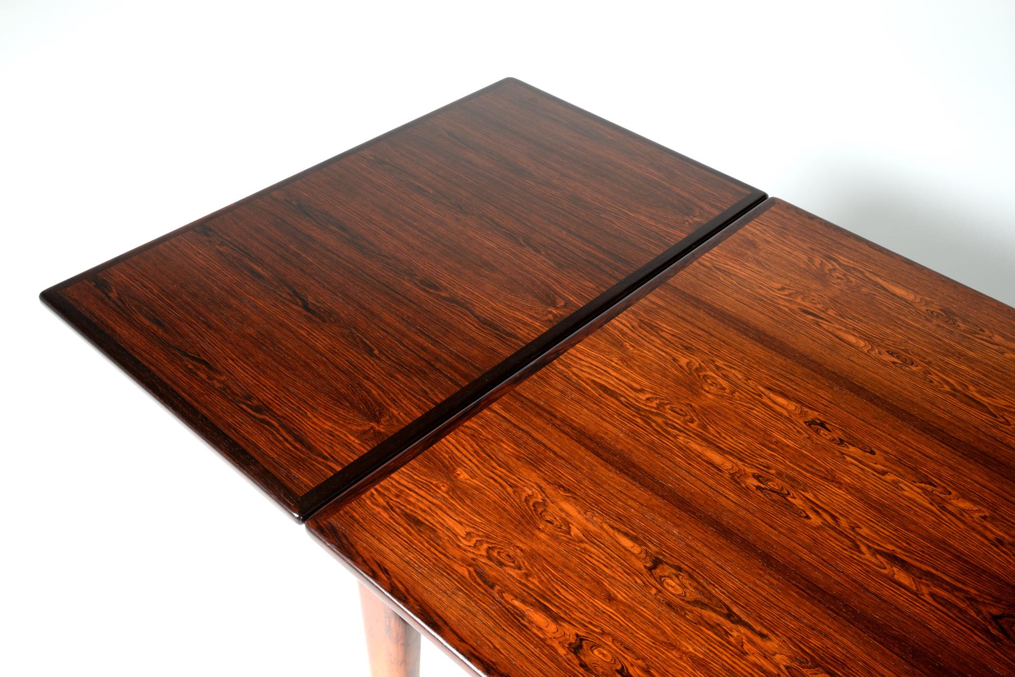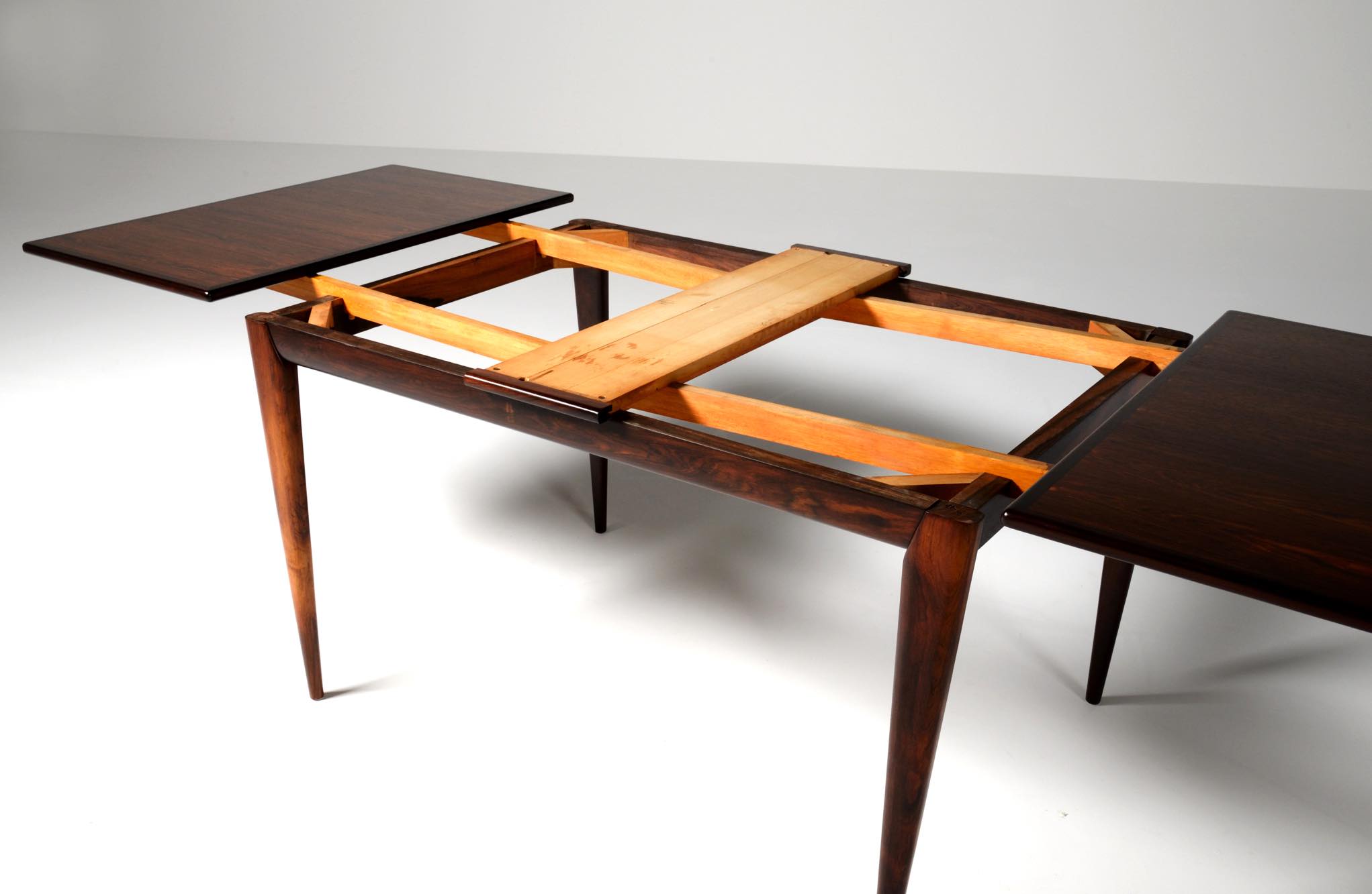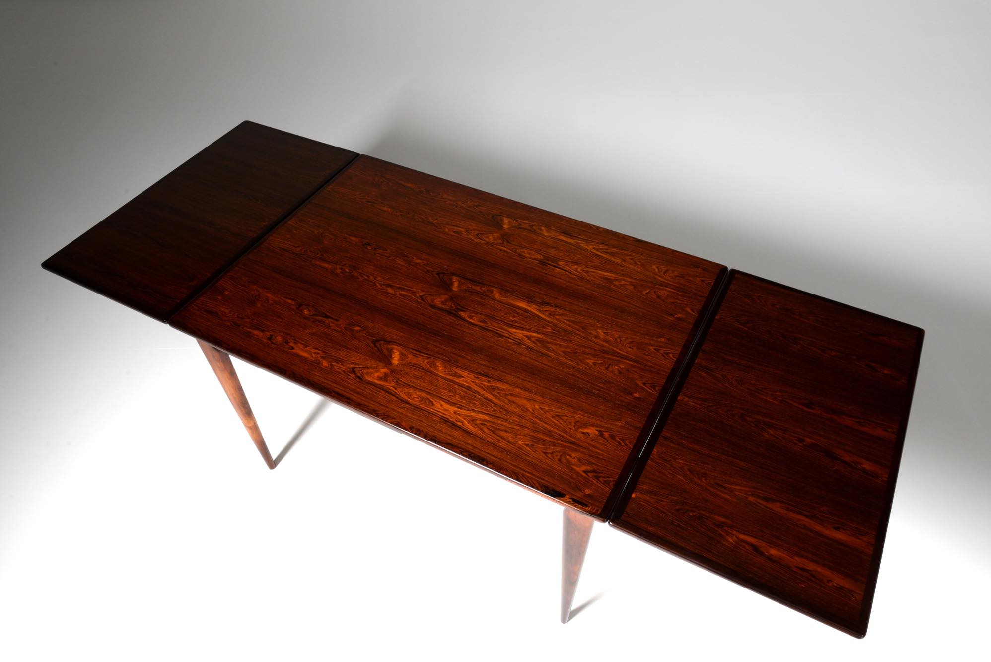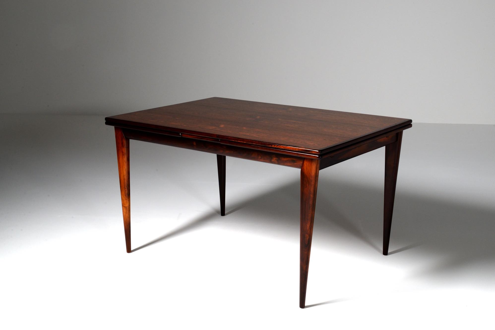 デンマークの家具工房、J.L. Møller/J.L.モラーによるダイニングテーブル "Model 254"(A)です。創業者のN.O. Moller/ニルス・オット・モラーによってデザインされたモデルで、こちらは1960年代頃に作られたヴィンテージ品となります。脚や幕板などが無垢材で作られたもので、重厚で丁寧な作りのテーブルです。主天板の下にエクステンションリーフが備わり、天板面積を拡張できます。同モデルの(B)を同時に出品しており、コンディションもそれぞれ良好です。