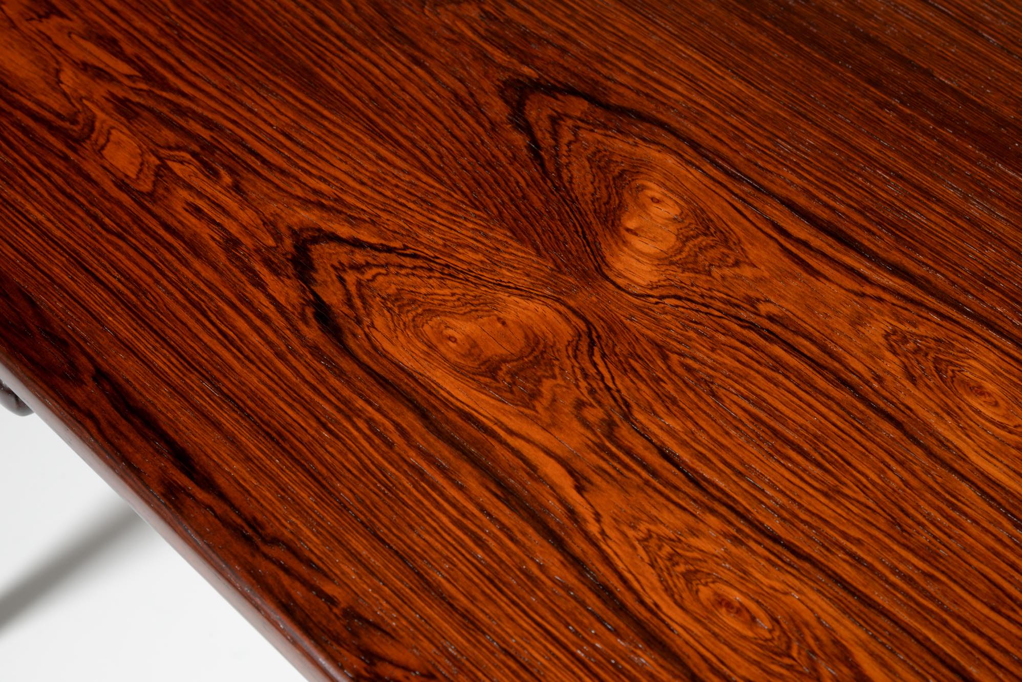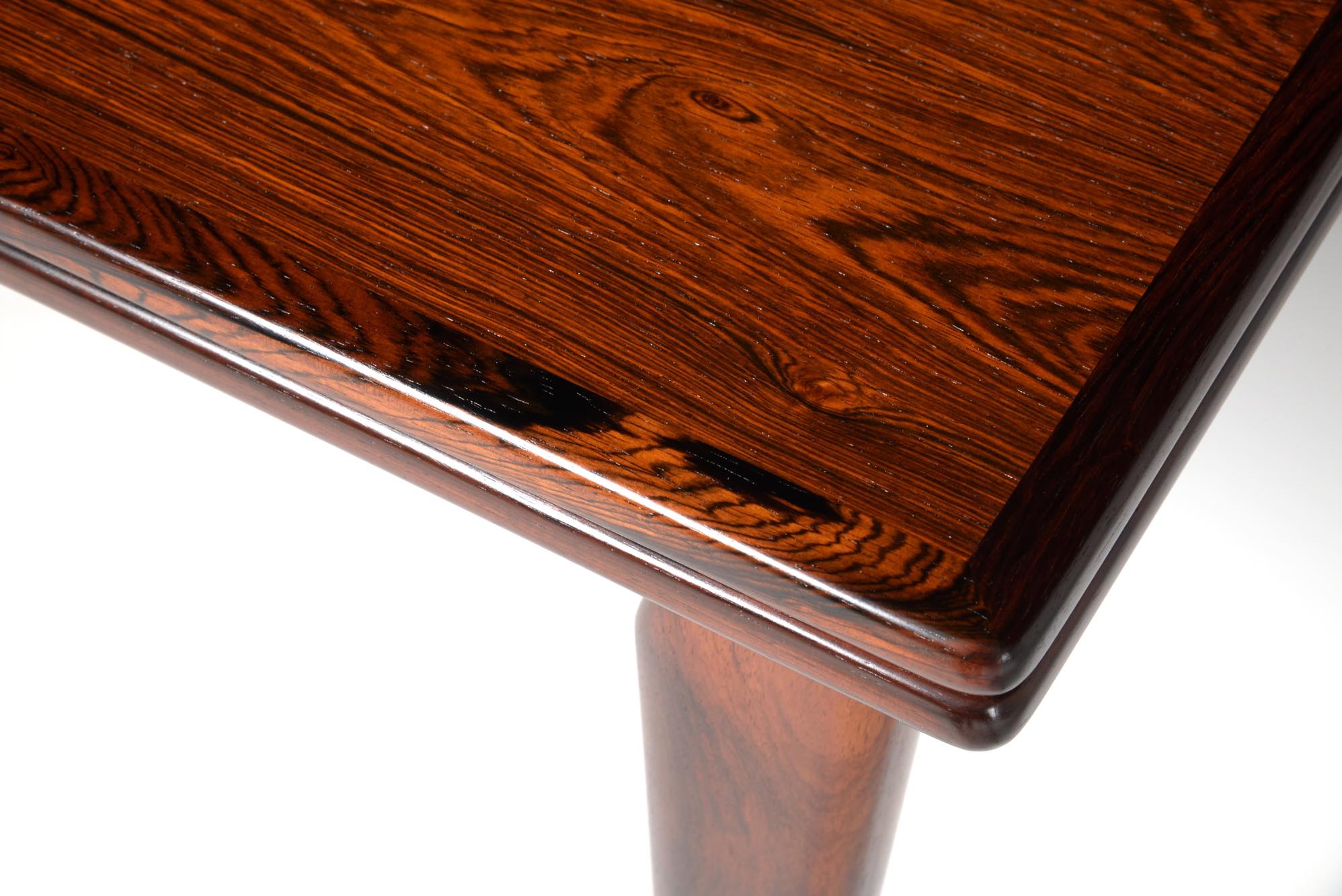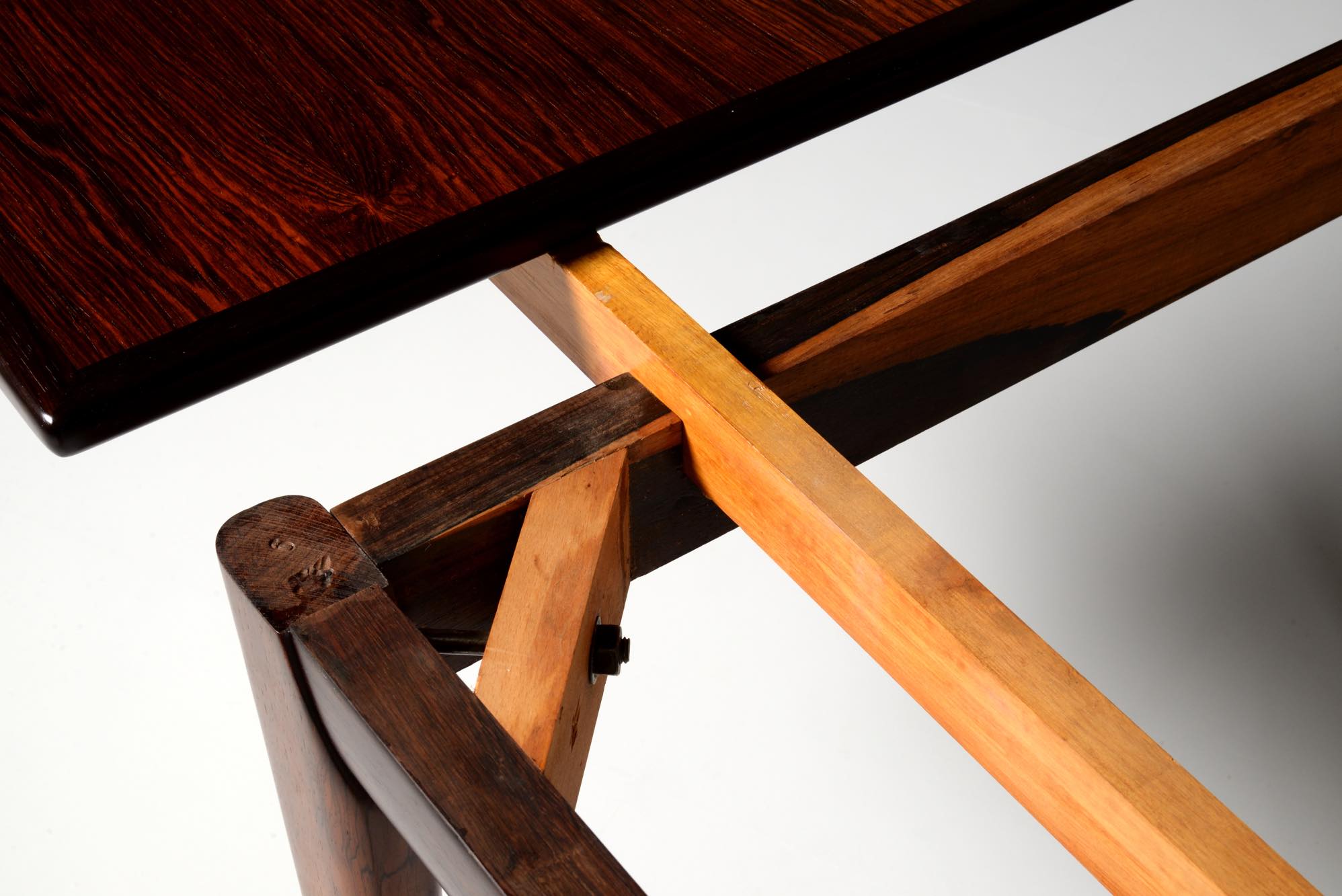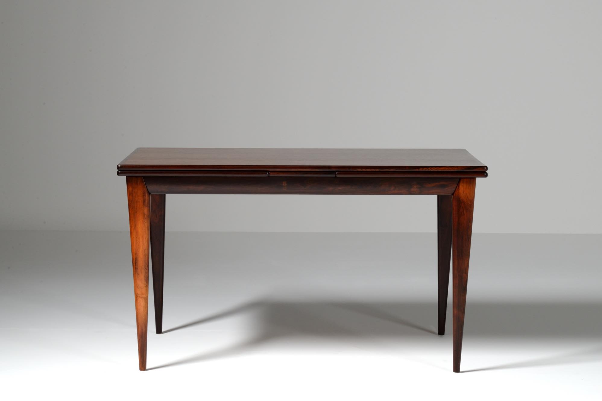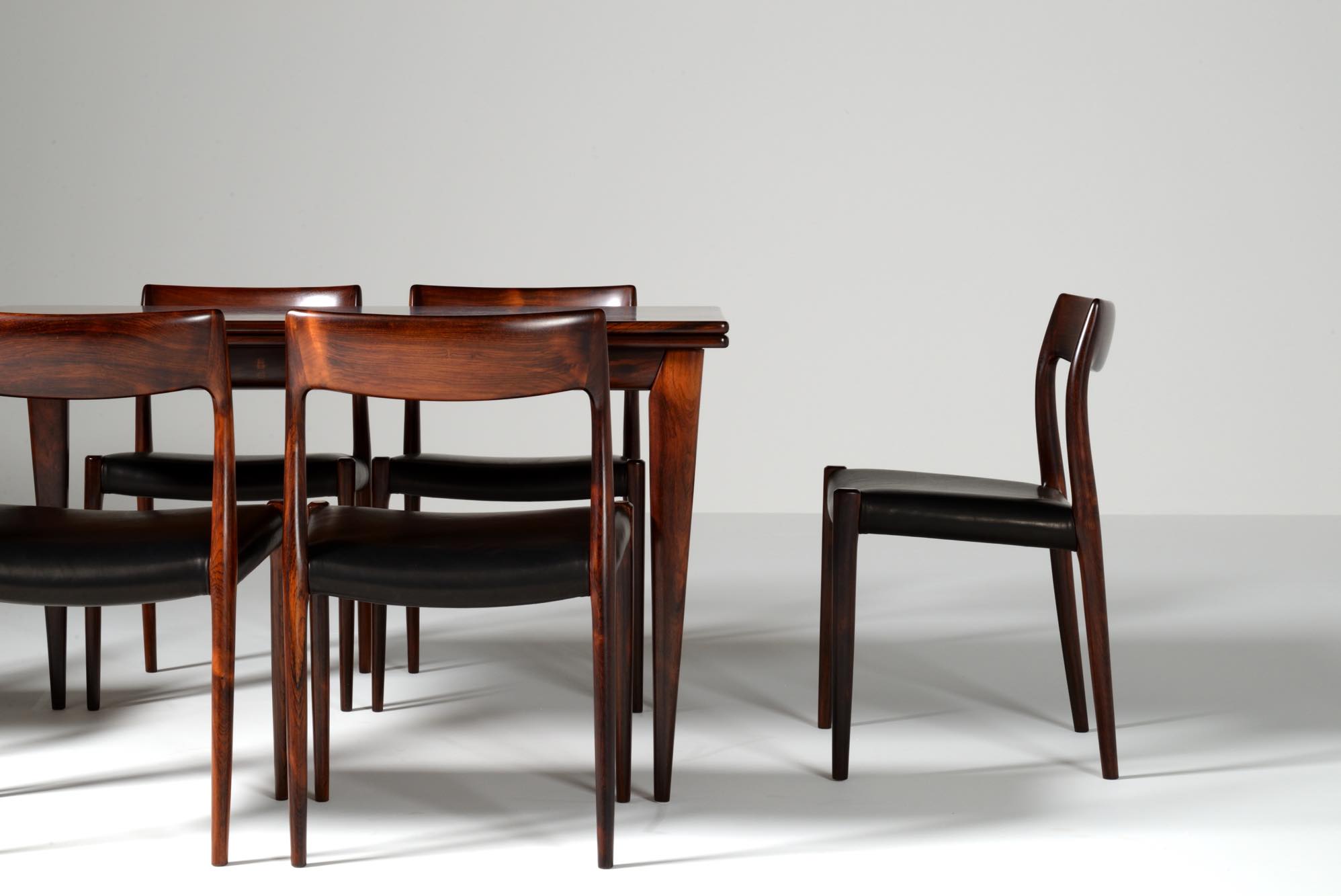 デンマークの家具工房、J.L. Møller/J.L.モラーによるダイニングテーブル "Model 254"(A)です。創業者のN.O. Moller/ニルス・オット・モラーによってデザインされたモデルで、こちらは1960年代頃に作られたヴィンテージ品となります。脚や幕板などが無垢材で作られたもので、重厚で丁寧な作りのテーブルです。主天板の下にエクステンションリーフが備わり、天板面積を拡張できます。同モデルの(B)を同時に出品しており、コンディションもそれぞれ良好です。