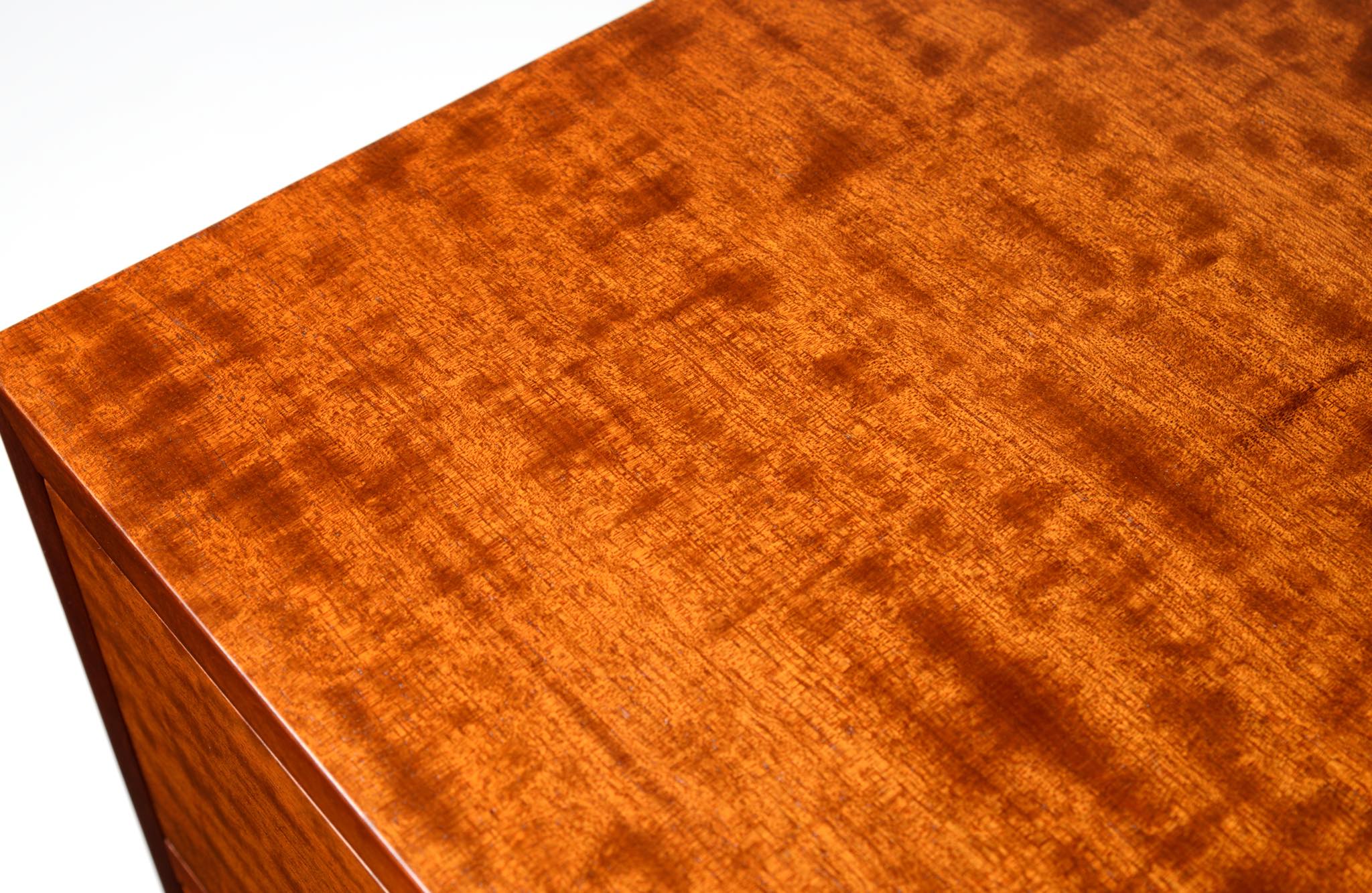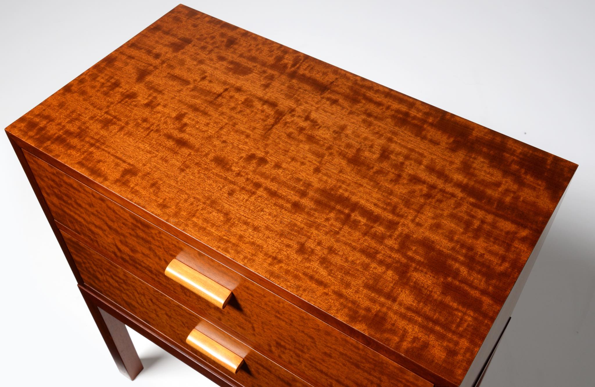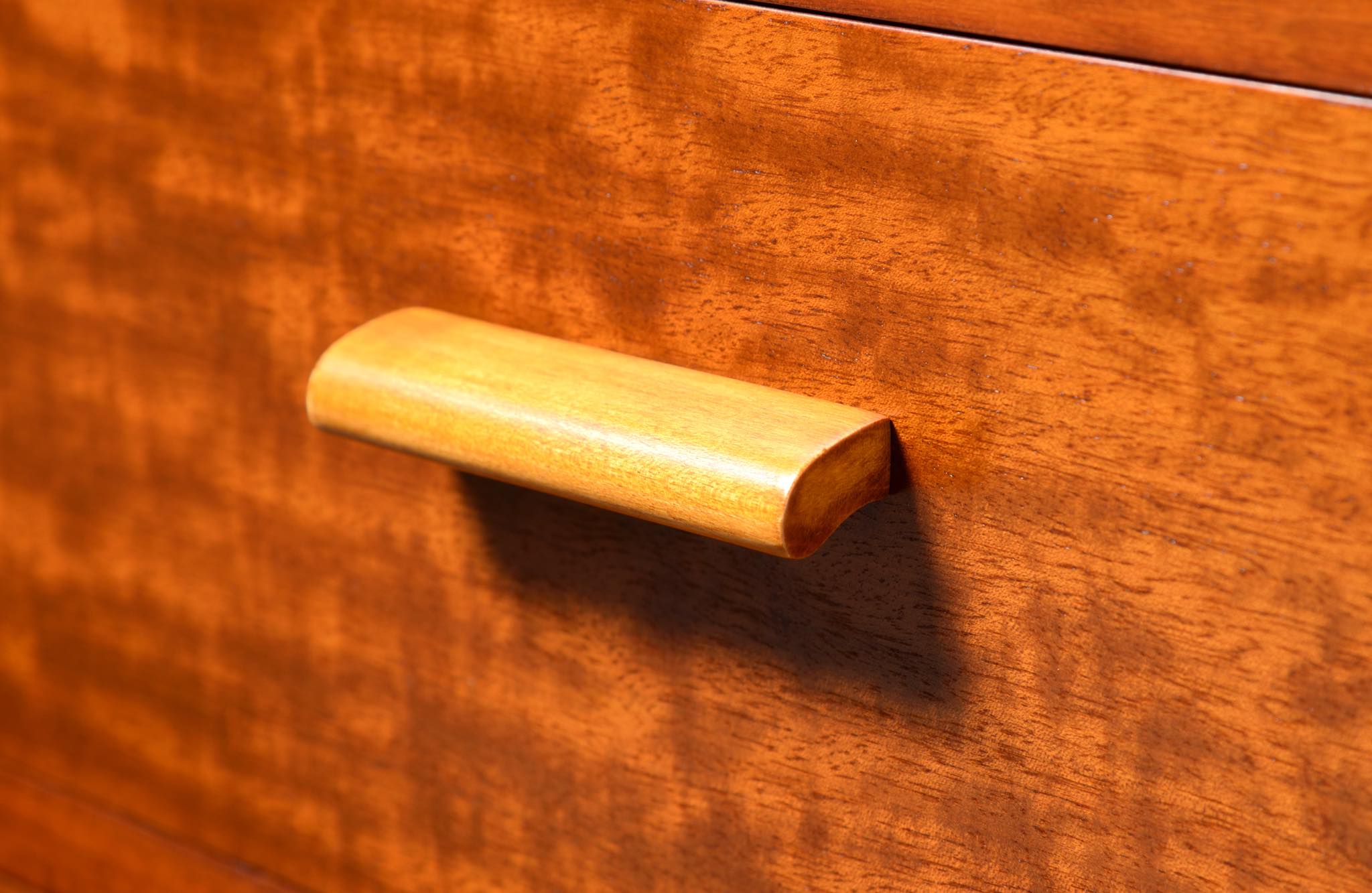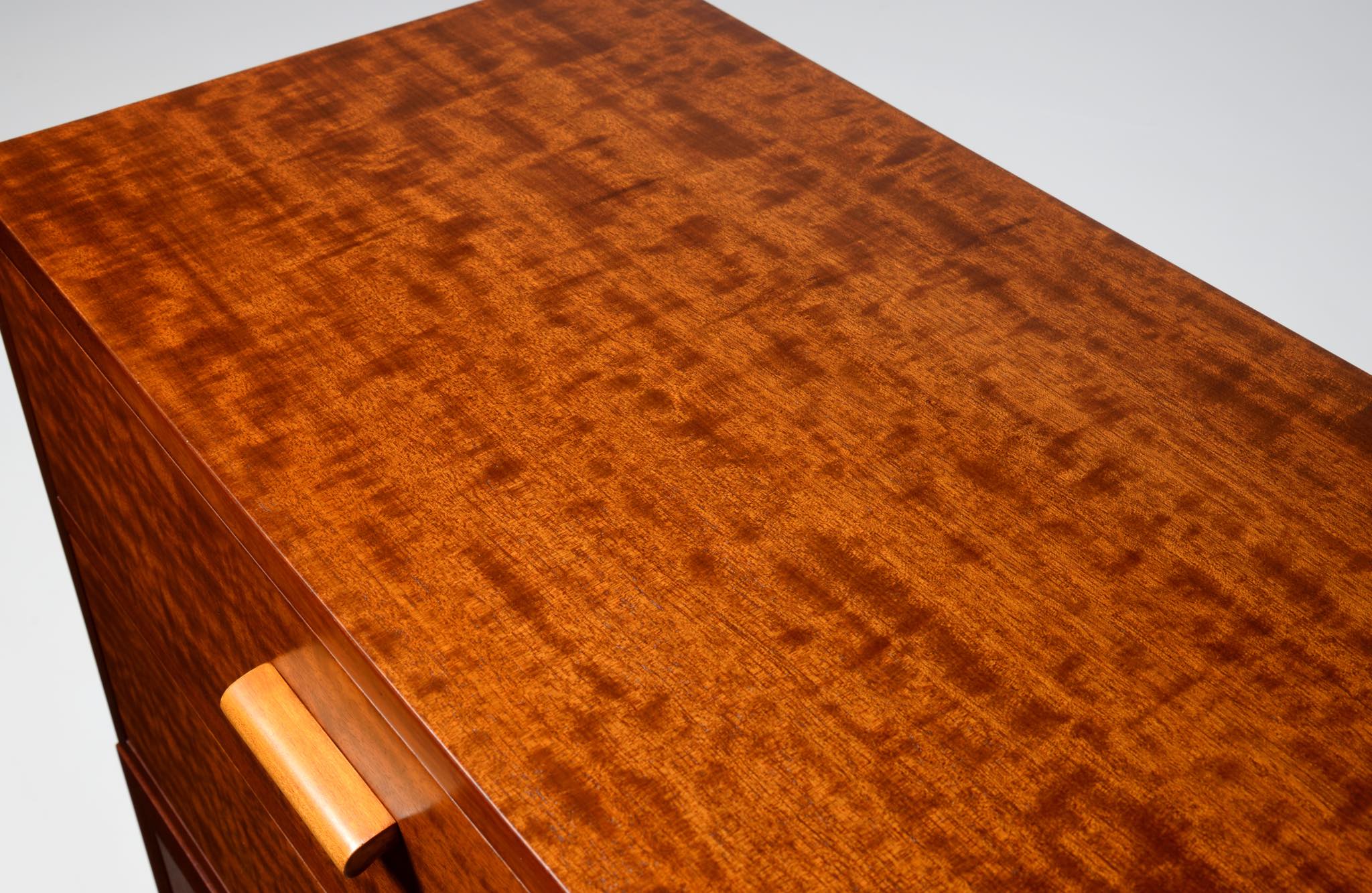 デンマーク製、1940年代頃に作られたチェストです。デザイナーや工房等詳しいことは分かりませんが、丁寧に作られた作品です。アール・デコのデザイン様式を思わせるメープル材を削り出した引手が特徴的で、シャトヤンシーと呼ばれる見事な変彩効果の現れた奥ゆかしい光沢を持つマホガニー材が用いられており、特有の木目文様に見応えがあります。抽斗内部に若干の染みが見られますが、全体的にきれいな状態です。