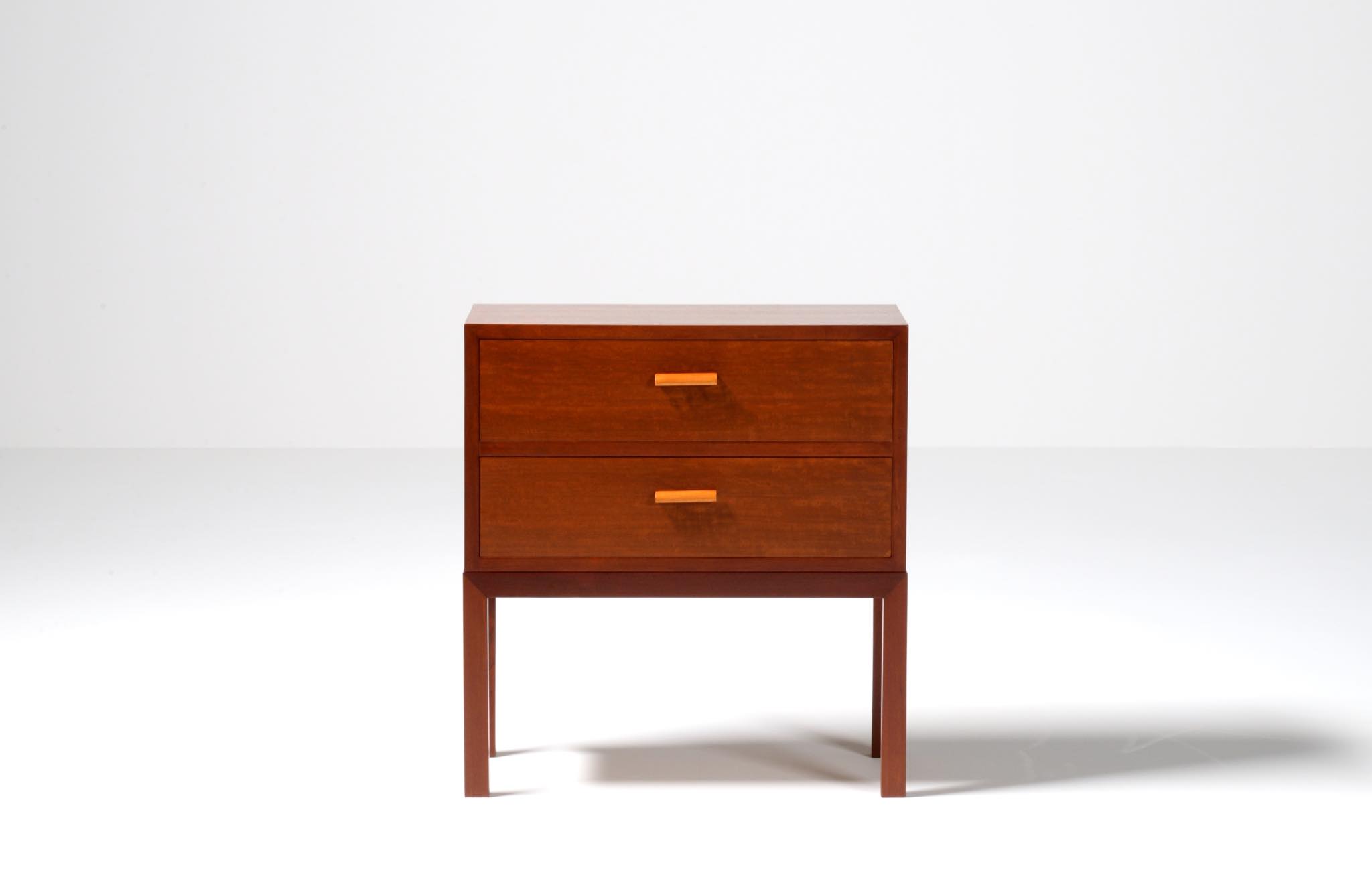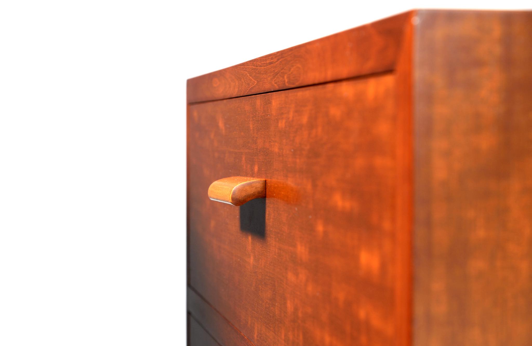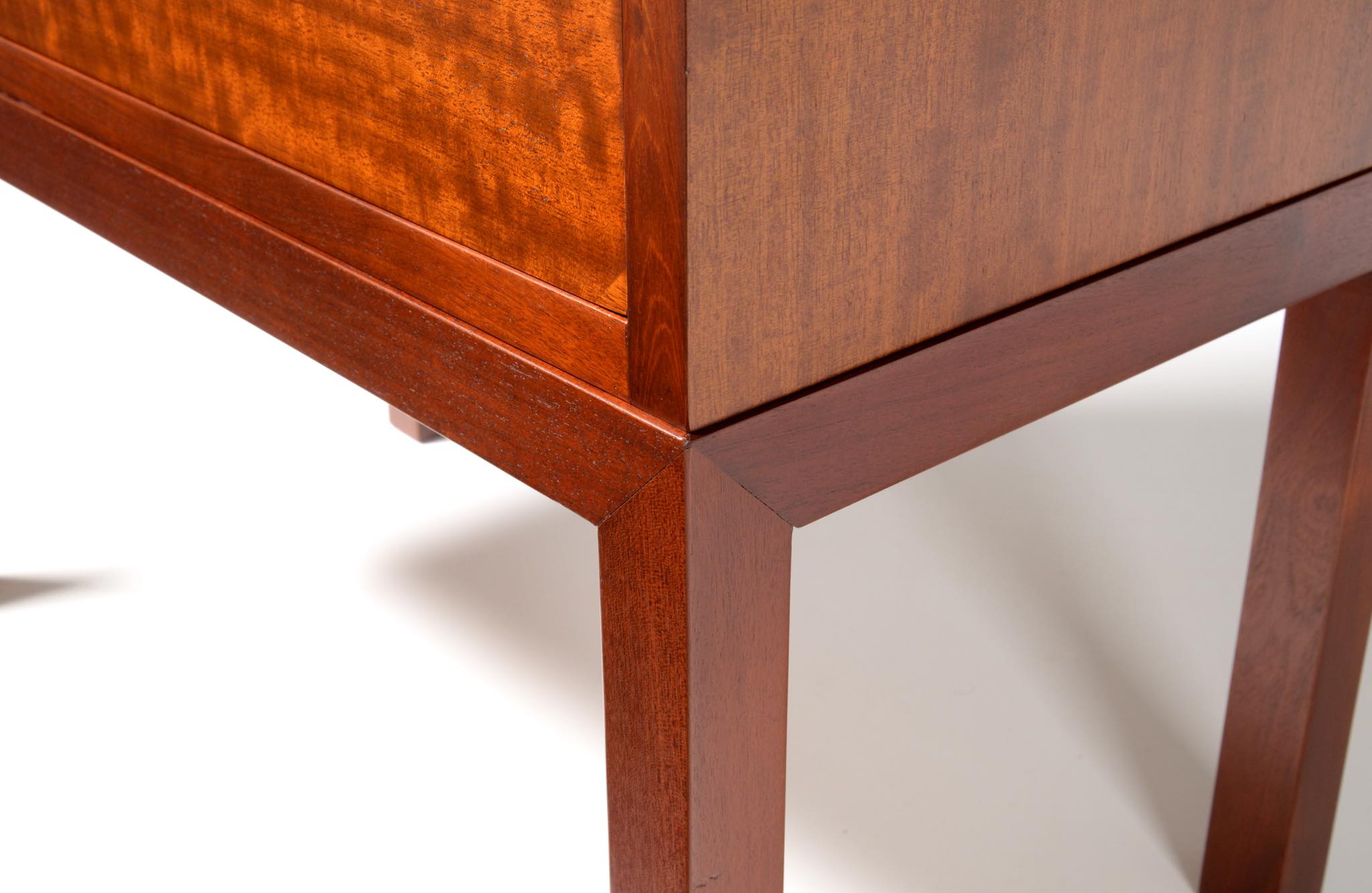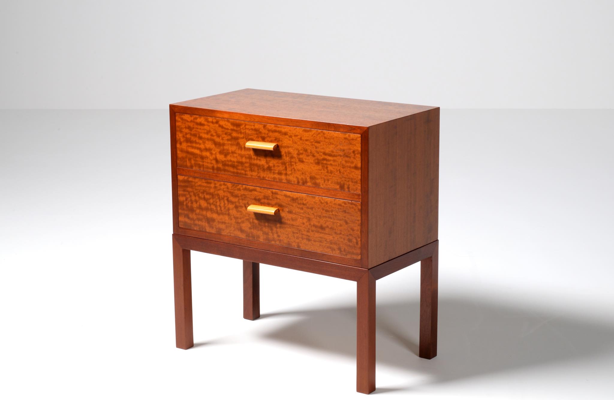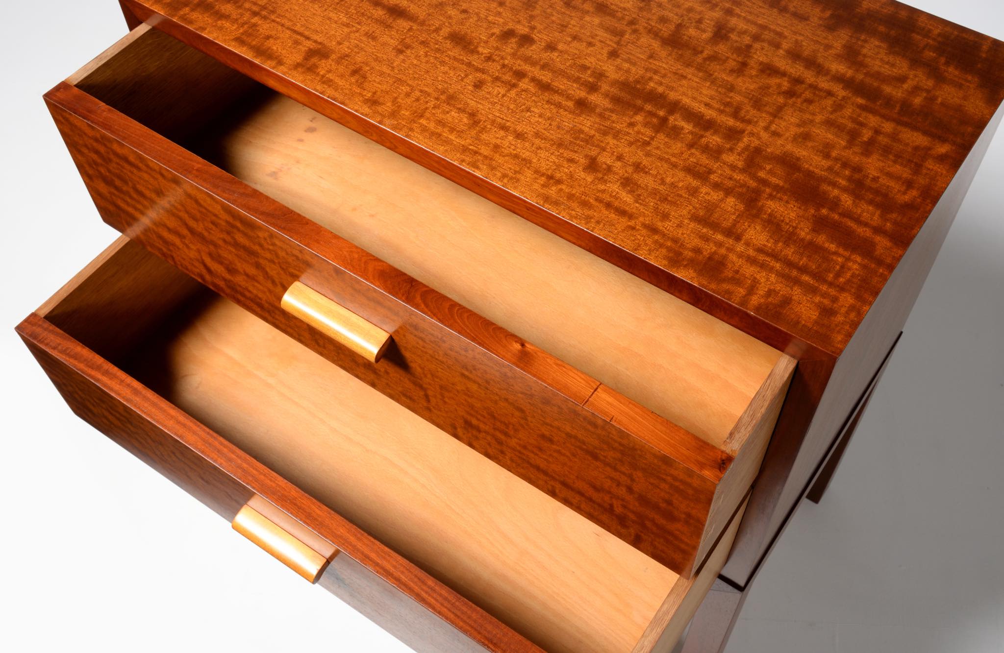 デンマーク製、1940年代頃に作られたチェストです。デザイナーや工房等詳しいことは分かりませんが、丁寧に作られた作品です。アール・デコのデザイン様式を思わせるメープル材を削り出した引手が特徴的で、シャトヤンシーと呼ばれる見事な変彩効果の現れた奥ゆかしい光沢を持つマホガニー材が用いられており、特有の木目文様に見応えがあります。抽斗内部に若干の染みが見られますが、全体的にきれいな状態です。