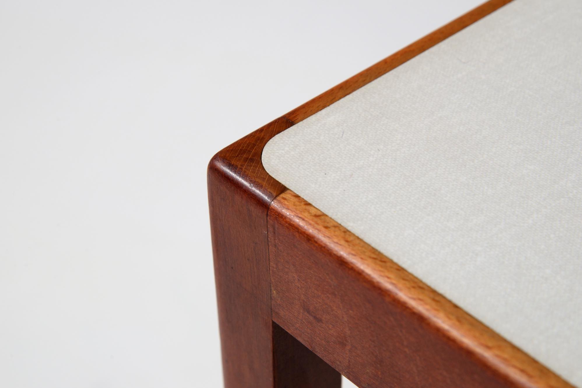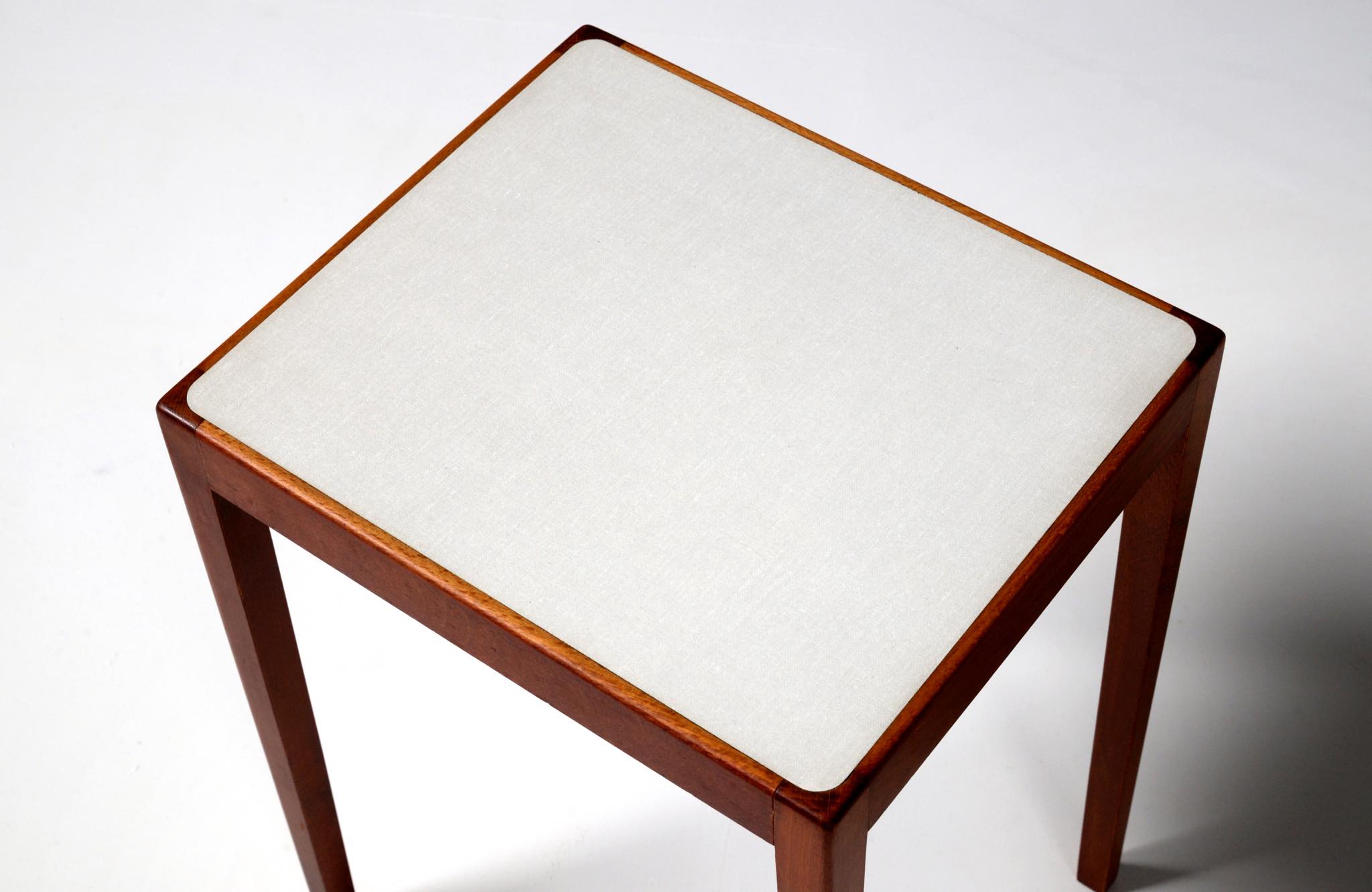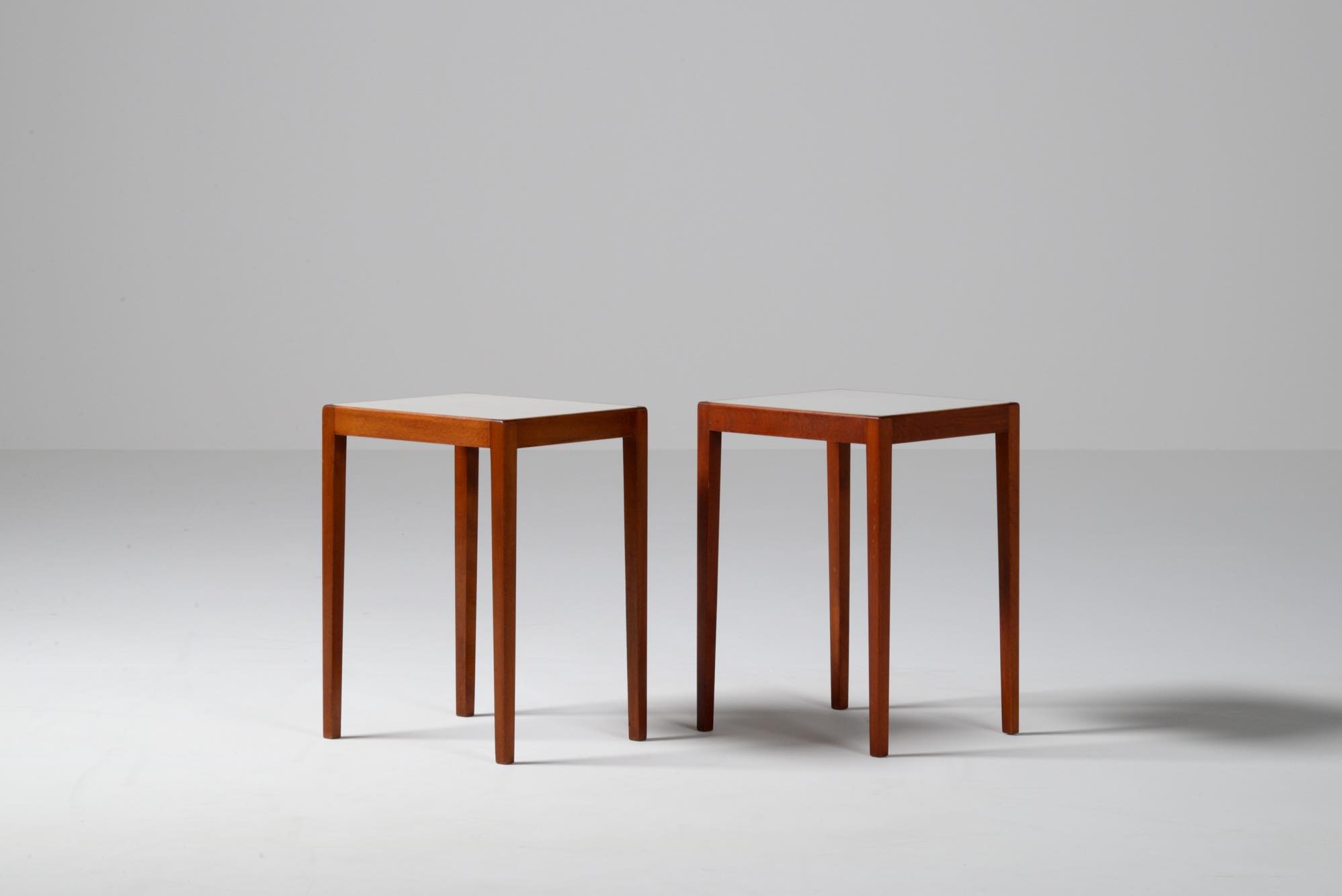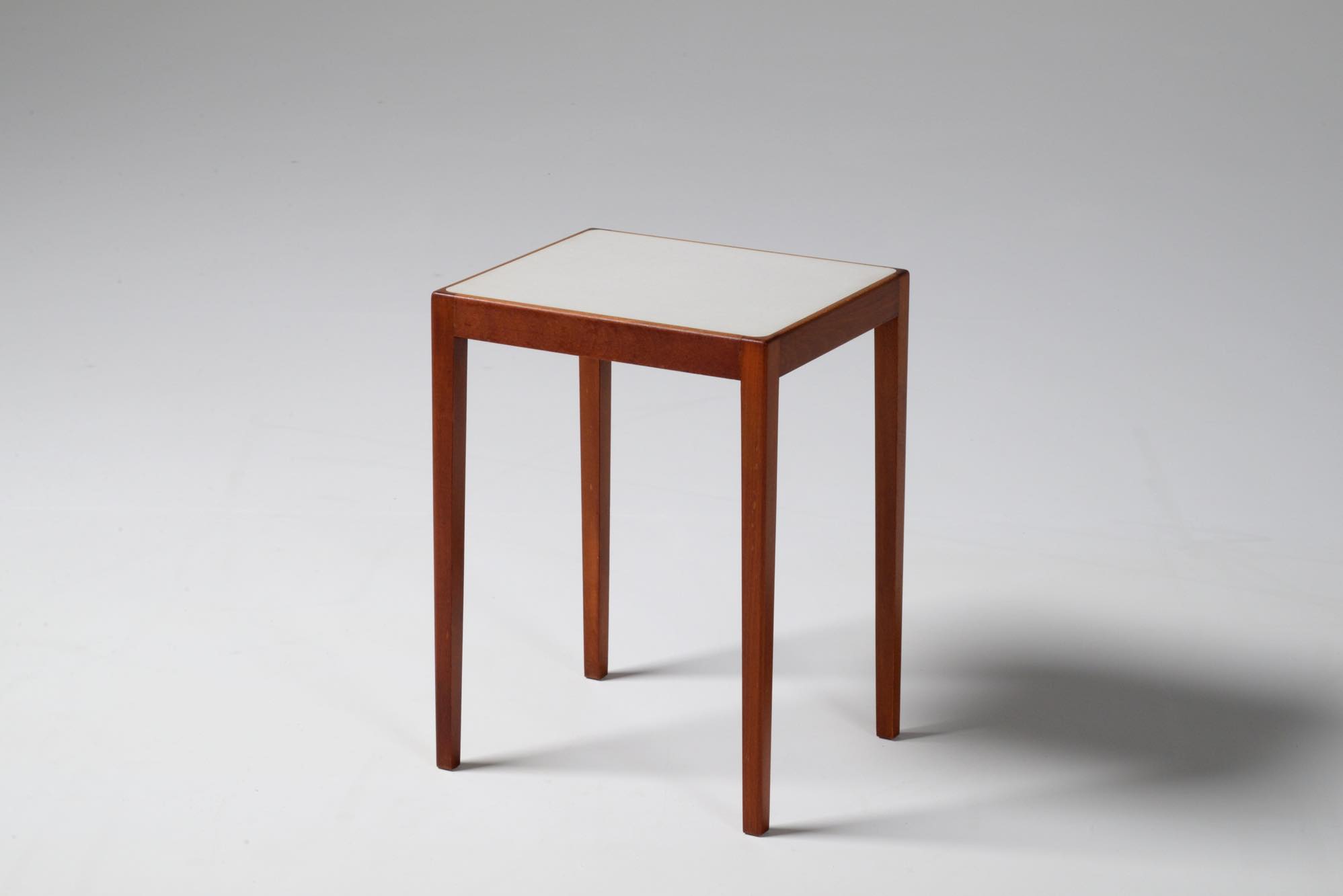 デンマークを代表する家具メーカー、フリッツ・ハンセン社にて1950年代頃に作られたサイドテーブルです。ステインされたビーチ材にホワイトフォーマイカが象眼され、淡い小紋がプリントされています。フォーマイカは1912年に米国ウェスティングハウス・エレクトリック社によって開発されたメラミン系の積層複合材で、当初は電気絶縁体として雲母の代用品として使われていたものの、やがてその用途が広められ、当時はモダンなインテリア素材として人気を博し、デンマークでも多くの家具作家がコーヒーテーブルやトローリーに使用しています。経年の影響か、フォーマイカと木部の隙間に僅かな隙間が生じていますが、緩みなど目立ったダメージは無く、とてもきれいな状態です。こちらは一対での販売となります。