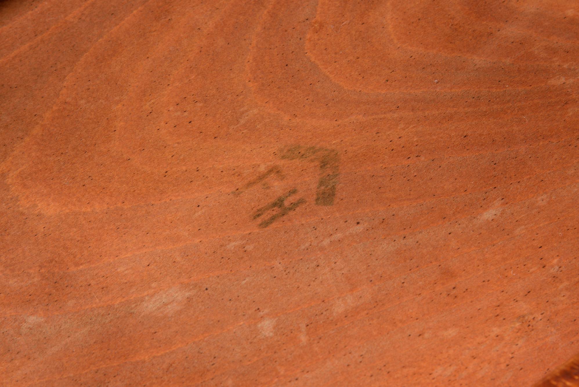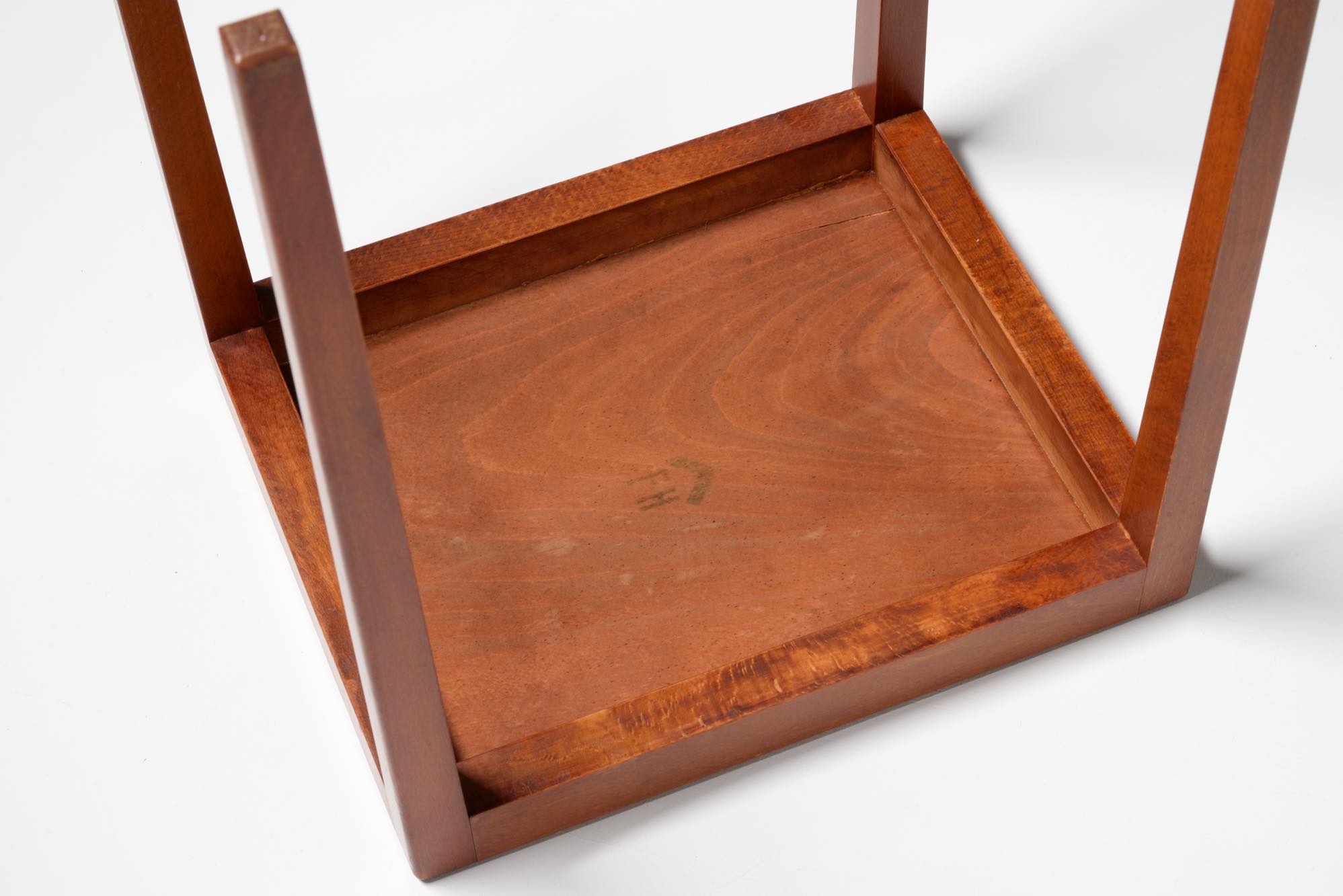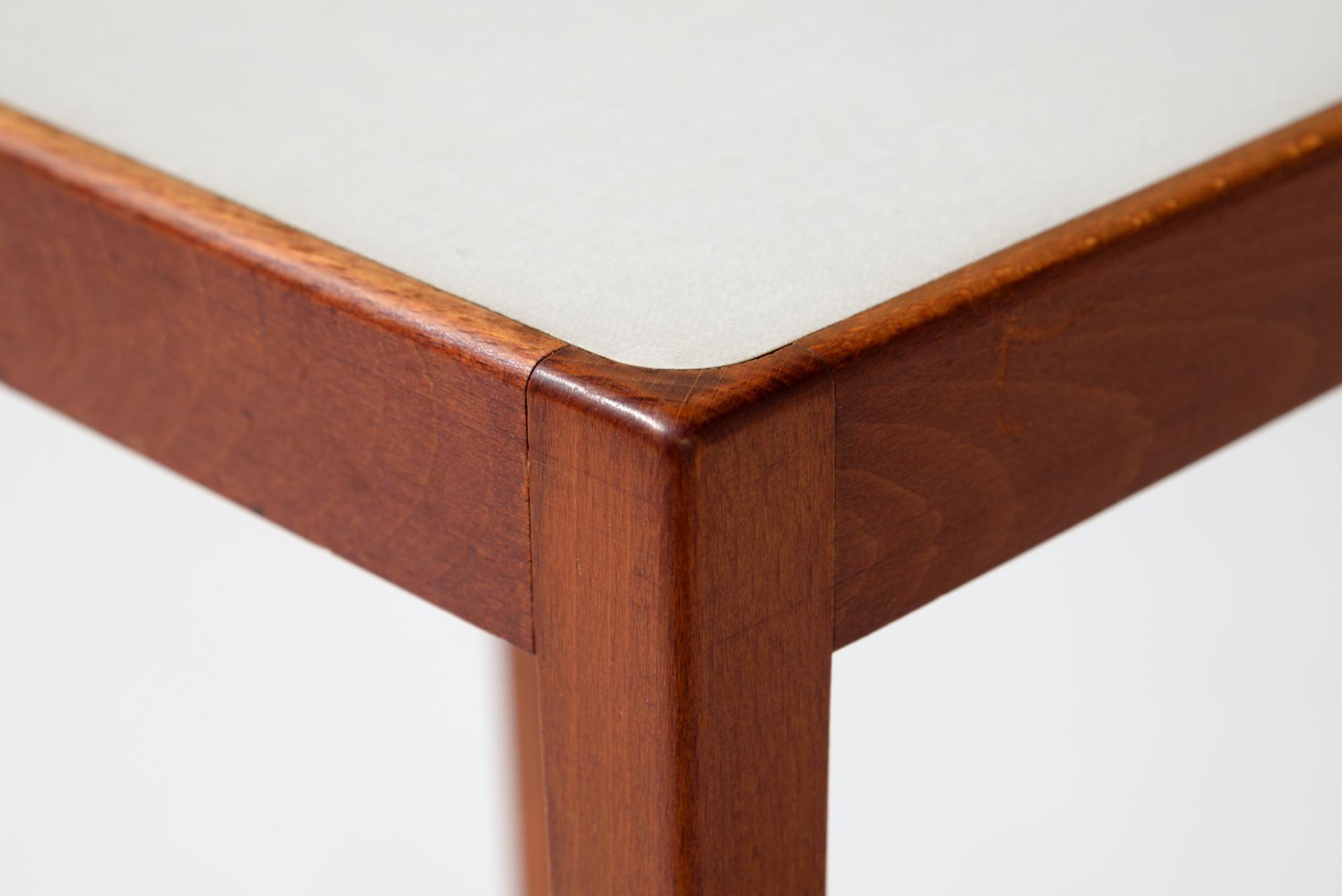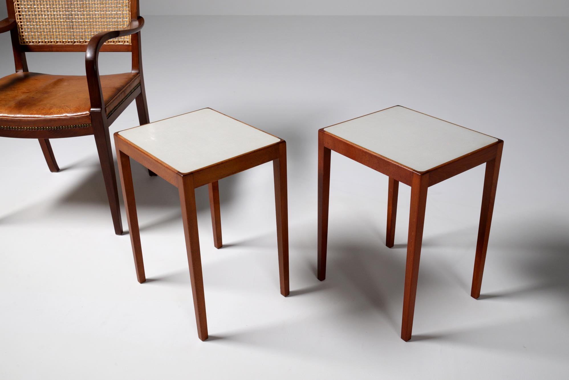 デンマークを代表する家具メーカー、フリッツ・ハンセン社にて1950年代頃に作られたサイドテーブルです。ステインされたビーチ材にホワイトフォーマイカが象眼され、淡い小紋がプリントされています。フォーマイカは1912年に米国ウェスティングハウス・エレクトリック社によって開発されたメラミン系の積層複合材で、当初は電気絶縁体として雲母の代用品として使われていたものの、やがてその用途が広められ、当時はモダンなインテリア素材として人気を博し、デンマークでも多くの家具作家がコーヒーテーブルやトローリーに使用しています。経年の影響か、フォーマイカと木部の隙間に僅かな隙間が生じていますが、緩みなど目立ったダメージは無く、とてもきれいな状態です。こちらは一対での販売となります。