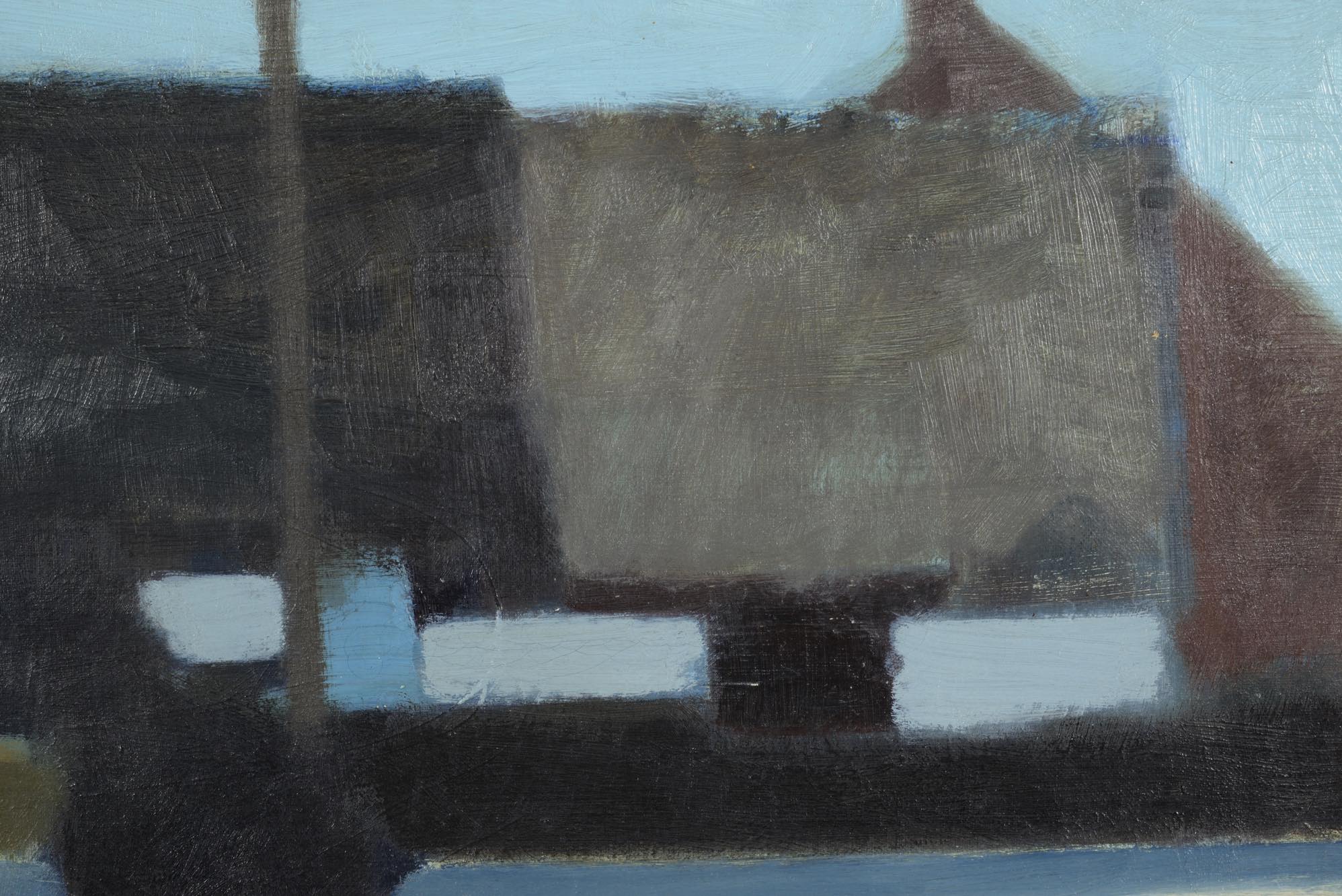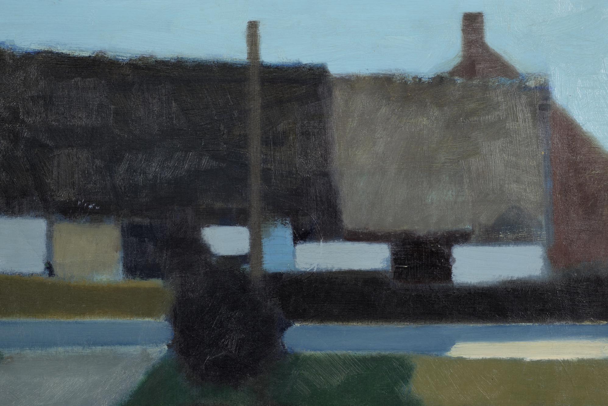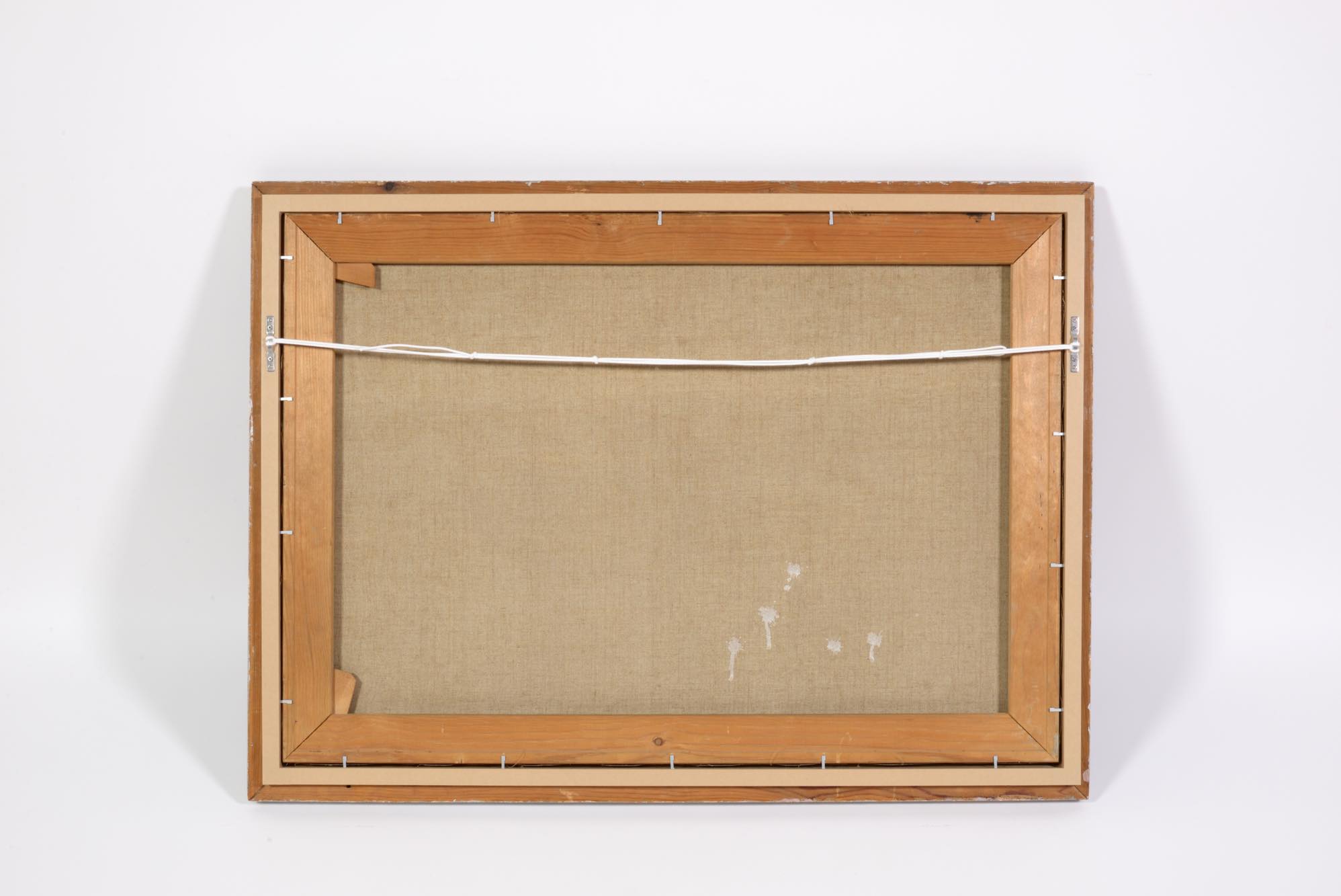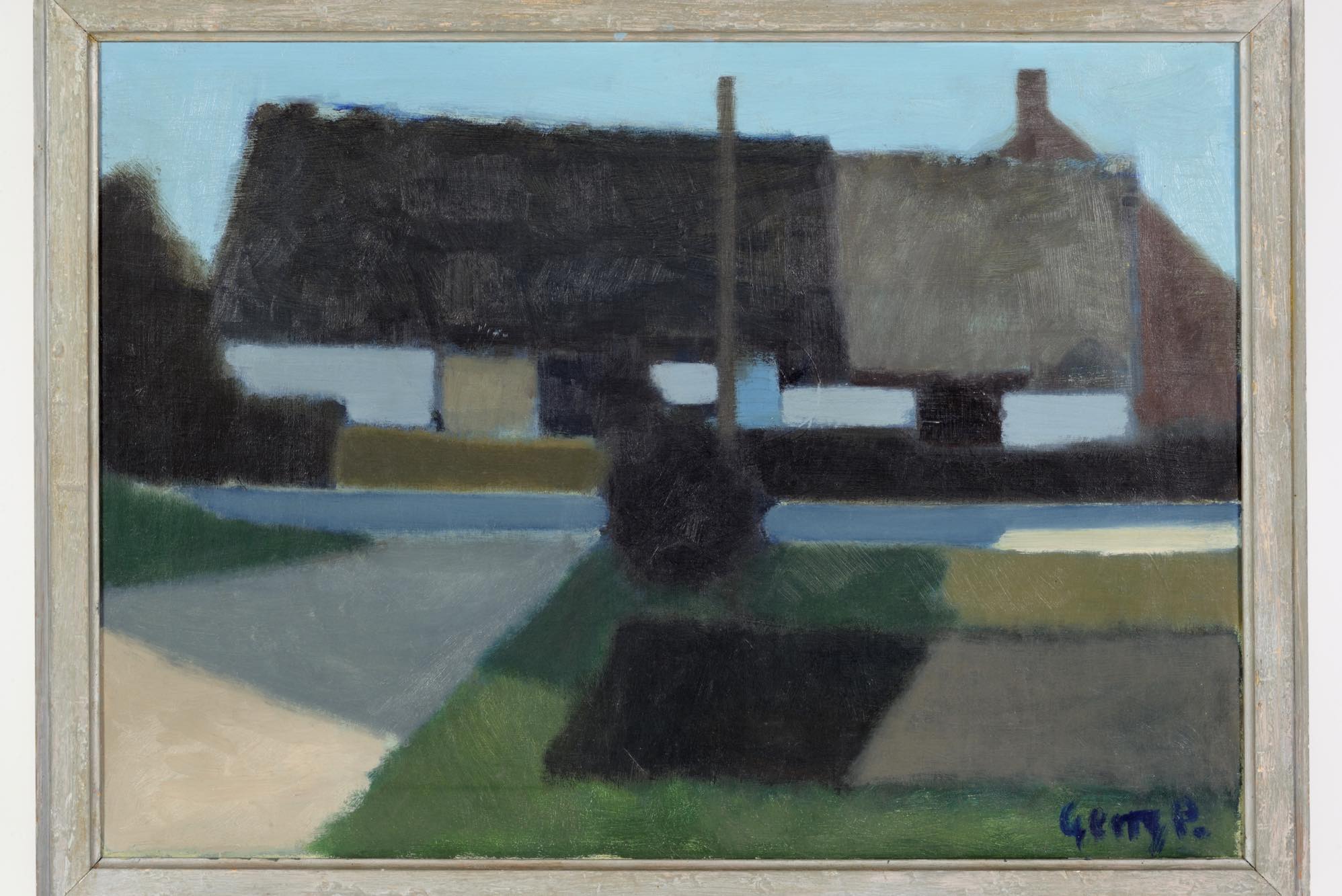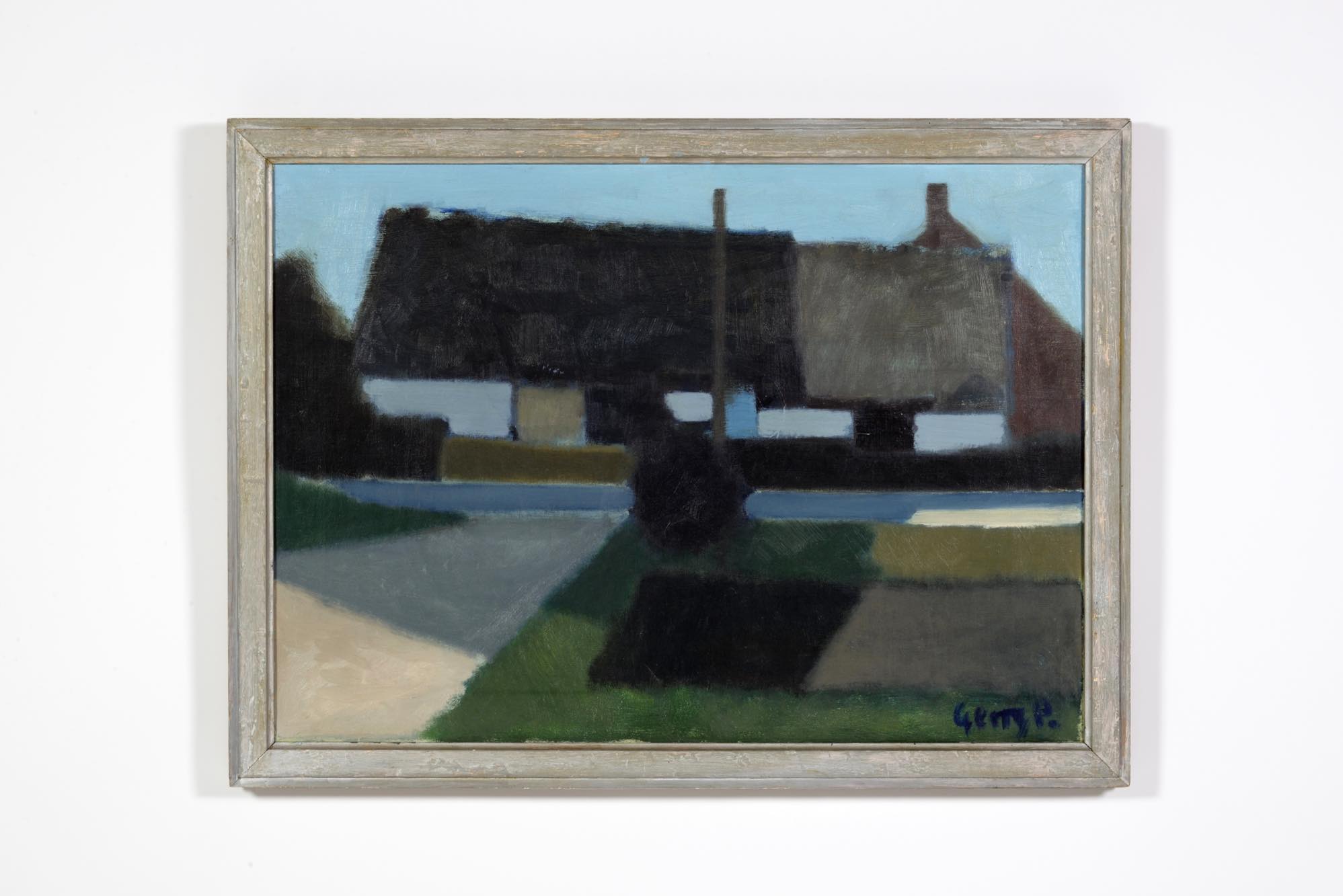 デンマークの画家、Georg Poulsen/ジョージ・ポールセンによる油彩風景画作品、1960年代に描かれたものと思われます。氏は大気感や湿度を表現した風景画、あるいは幻想的で夢の中とも捉えられる表現を得意とし、こちらの作品では暖かい季節の郊外の民家を描いています。塗られたフレームも本人によるものと思われ、作品共にコンディションは良好です。