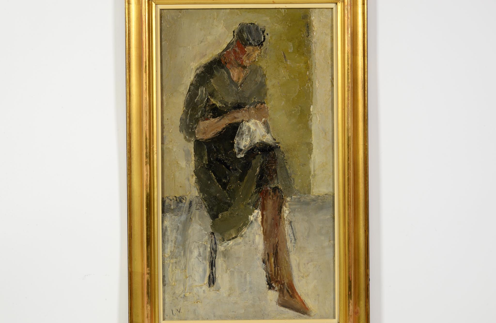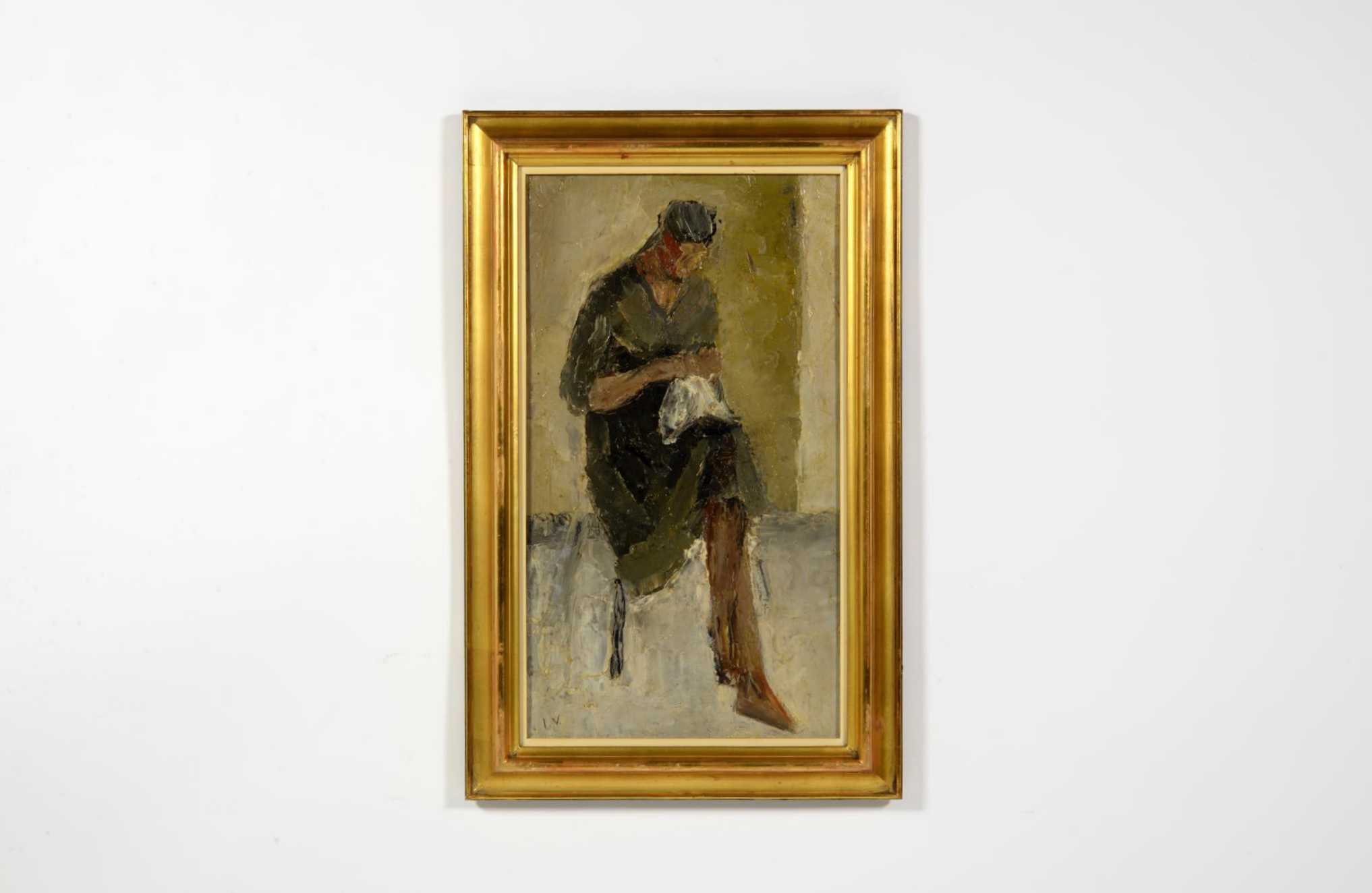 デンマークの画家、イェッペ・ヴォンティリウスによる人物画油彩作品です。やや大ぶりな作品で、ソファに座り手芸に勤しむ女性の姿が描かれています。金箔のフレームはオリジナルのようで、若干の劣化や小傷などが見られますが、コンディションは良好です。