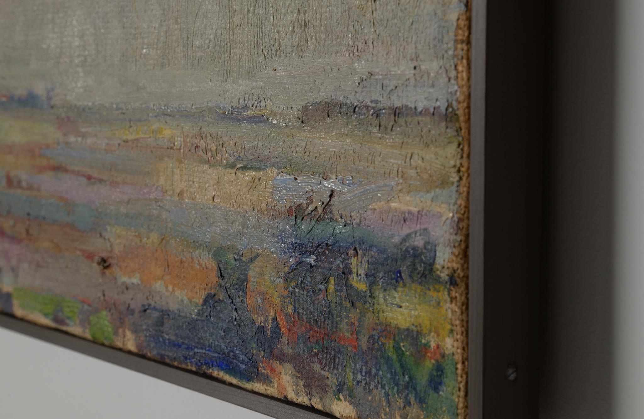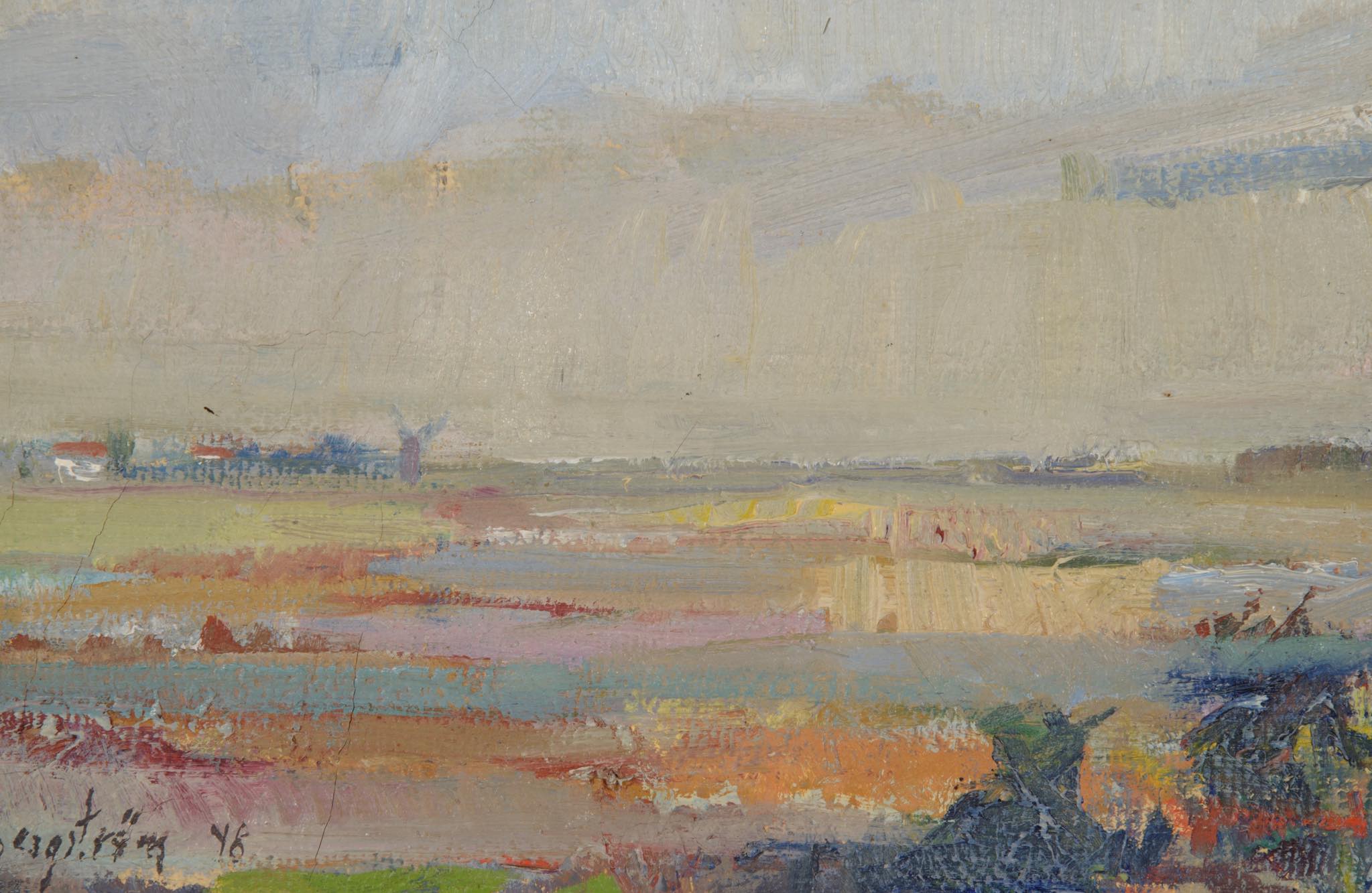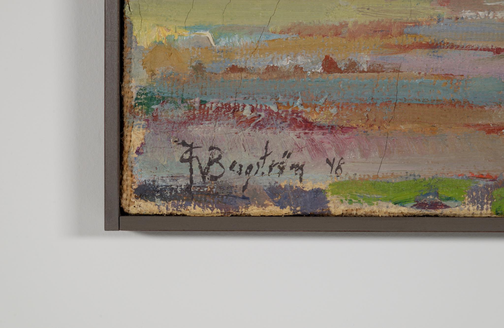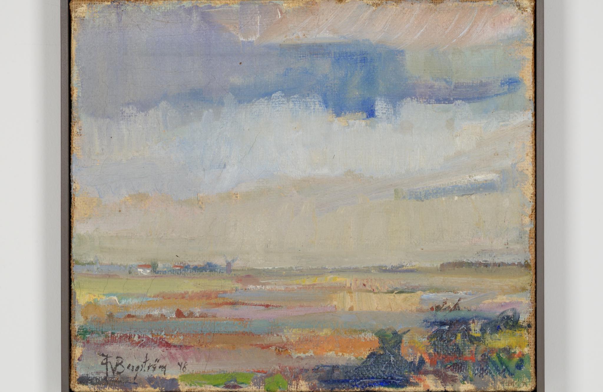スウェーデンの画家と思われるJohn Bergström/ジョン・ベリストロームによる油彩作品です。1948年に描かれた、スウェーデンのØland島の景色を描いた作品です。夏の終わりから秋にかけての、或いは、春の風景か空想上の色彩表現にも見て取れます。木製ペイントのフレームはこちらで整えました。コンディションは良好です。