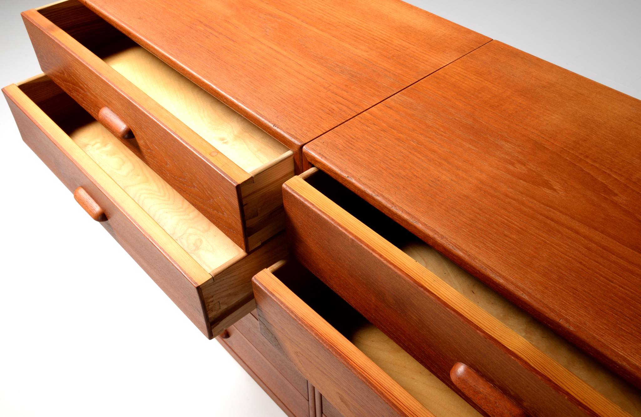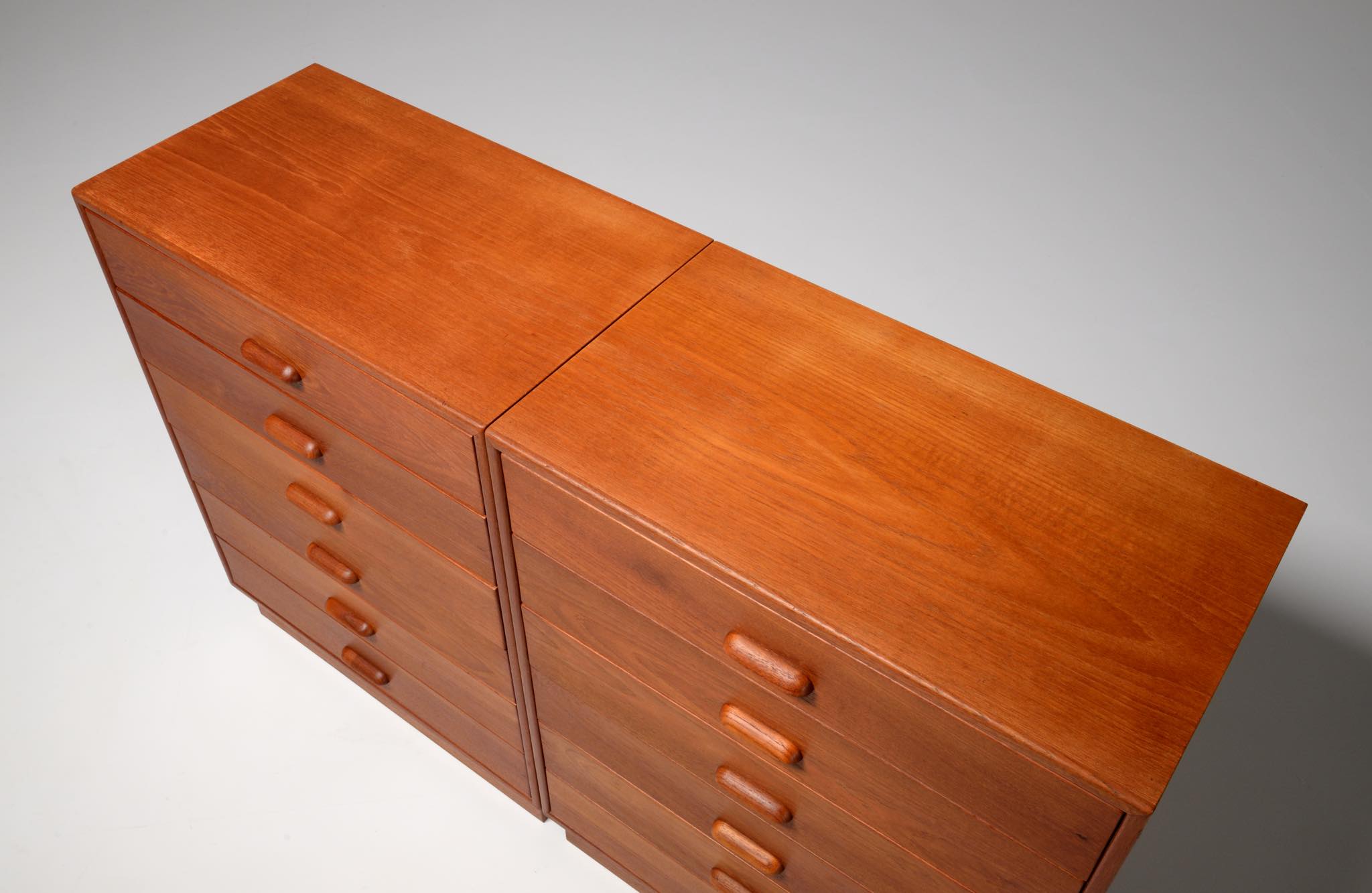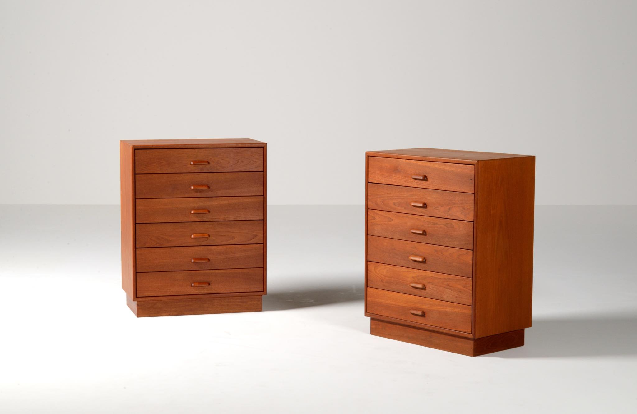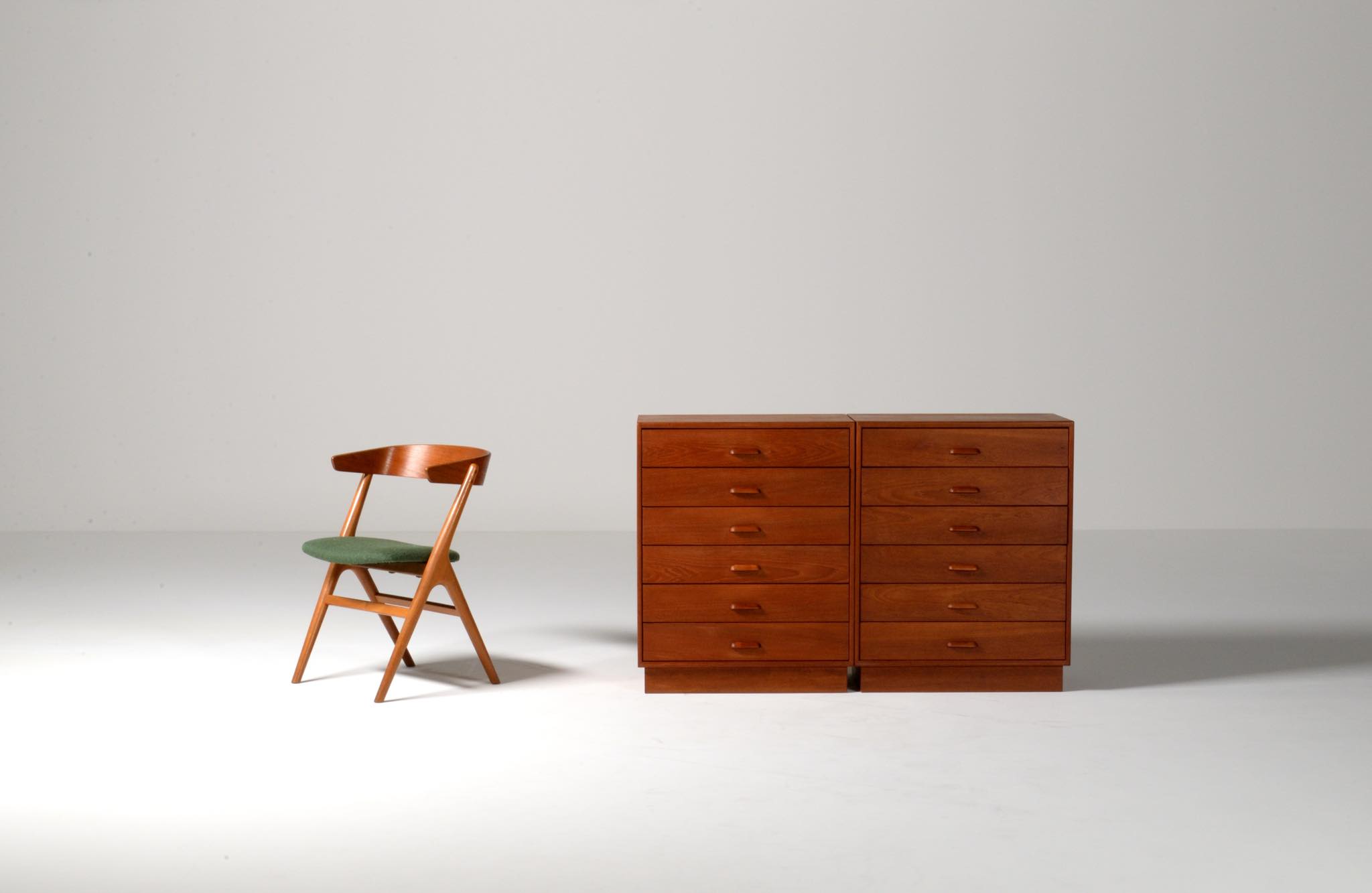 デンマークの家具デザイナー、Sigfred Omann/シグフレッド・オマーンと思われるチェスト一対です。引手に特徴のあるデザインで、抽斗の前板には無垢材が使われています。故に若干の反りが生じています。ひとつのチェストの最下段の引手や側面に呼び継補修があります。