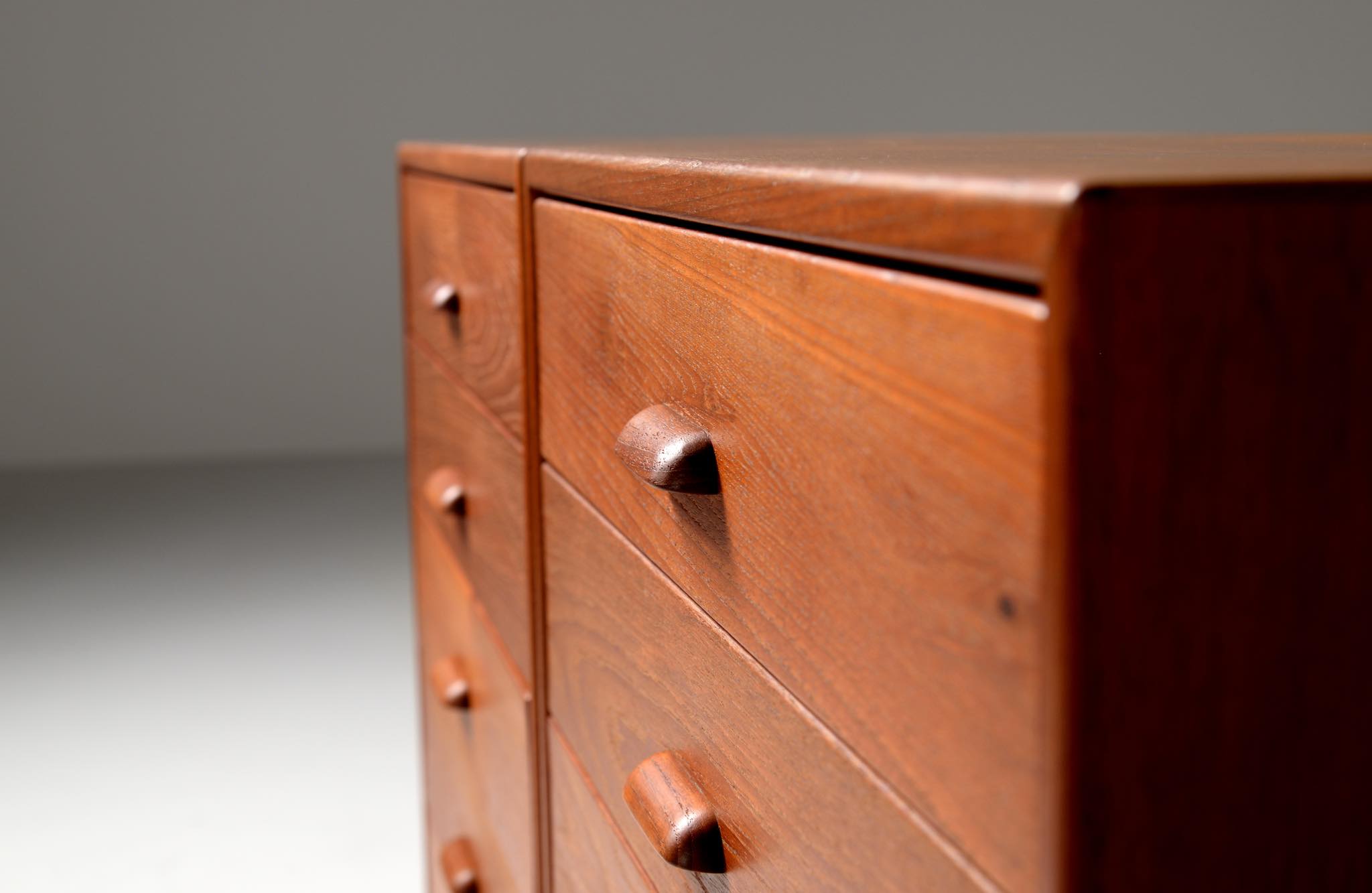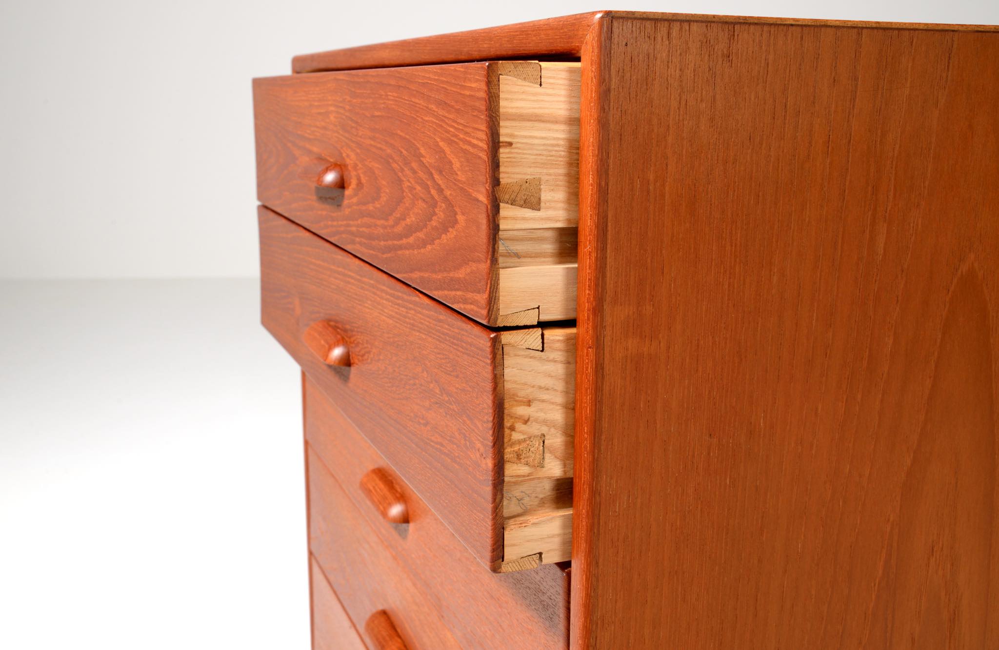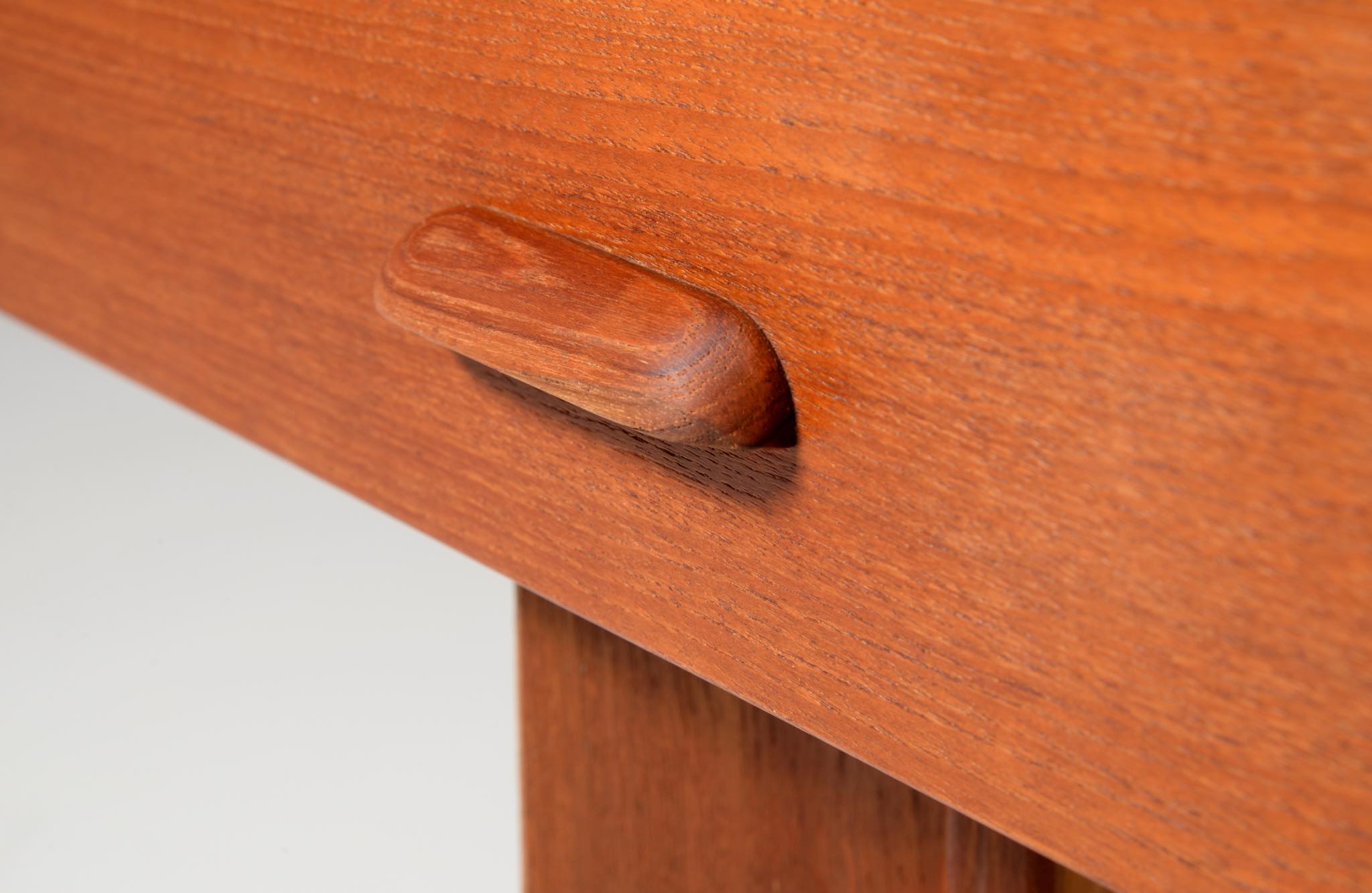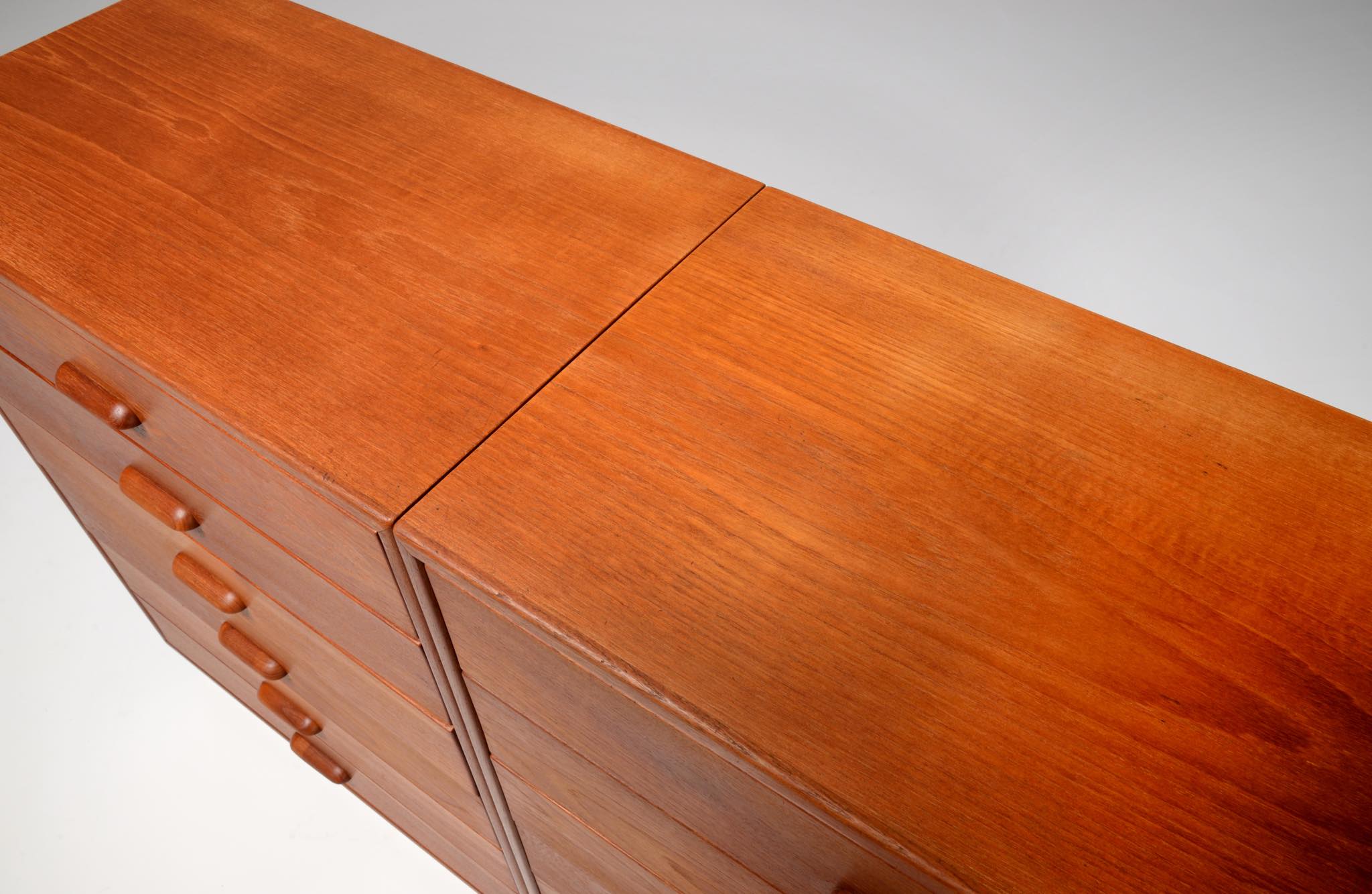 デンマークの家具デザイナー、Sigfred Omann/シグフレッド・オマーンと思われるチェスト一対です。引手に特徴のあるデザインで、抽斗の前板には無垢材が使われています。故に若干の反りが生じています。ひとつのチェストの最下段の引手や側面に呼び継補修があります。