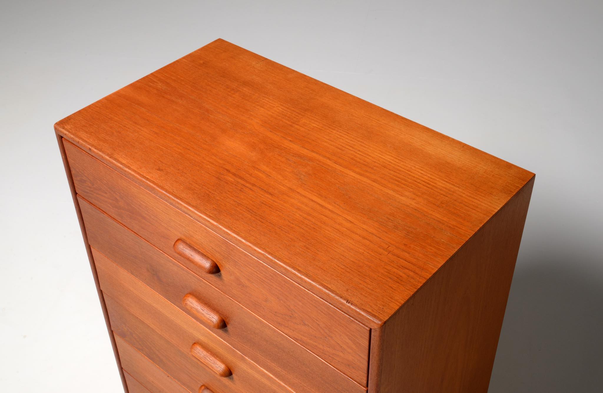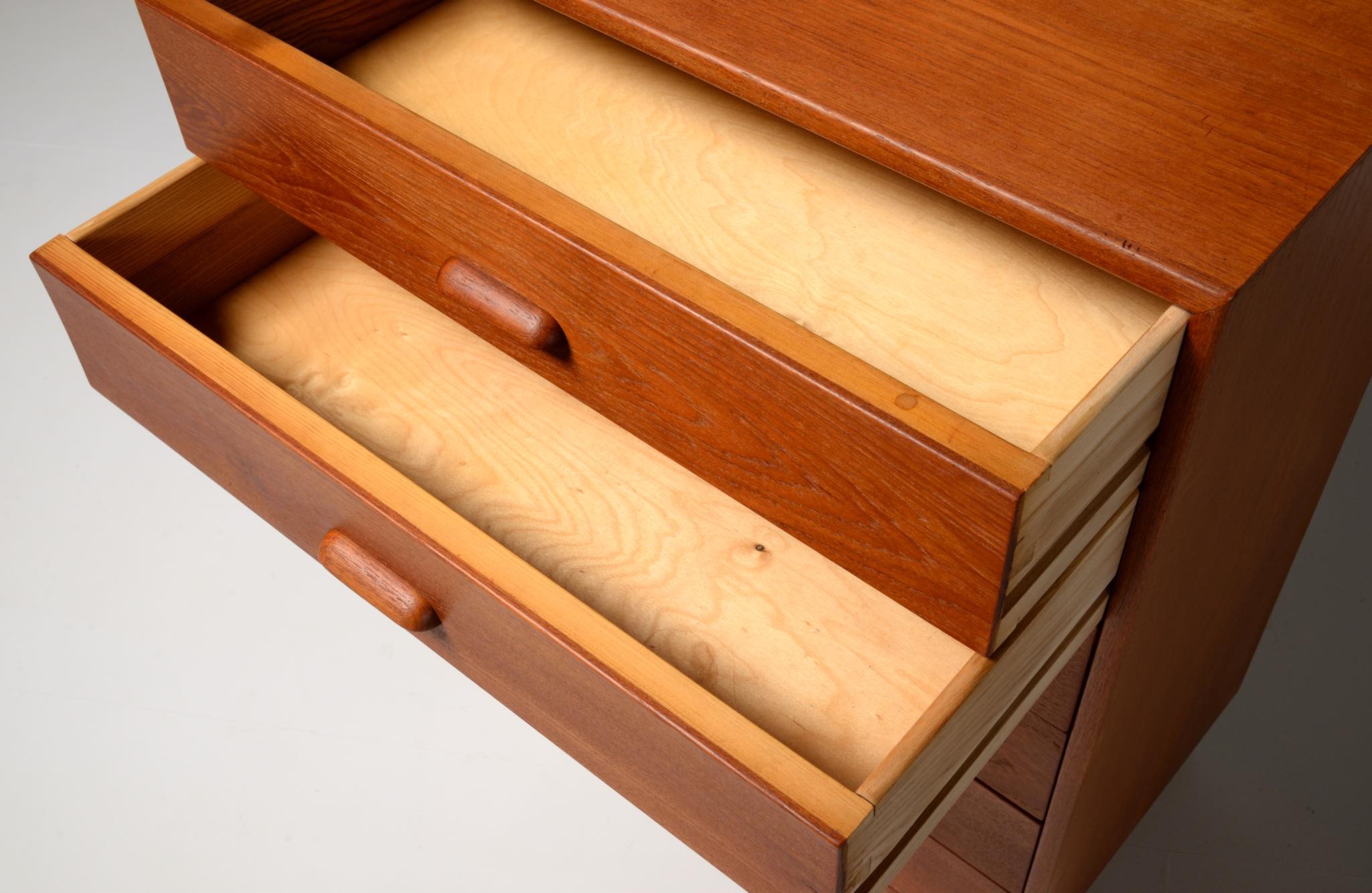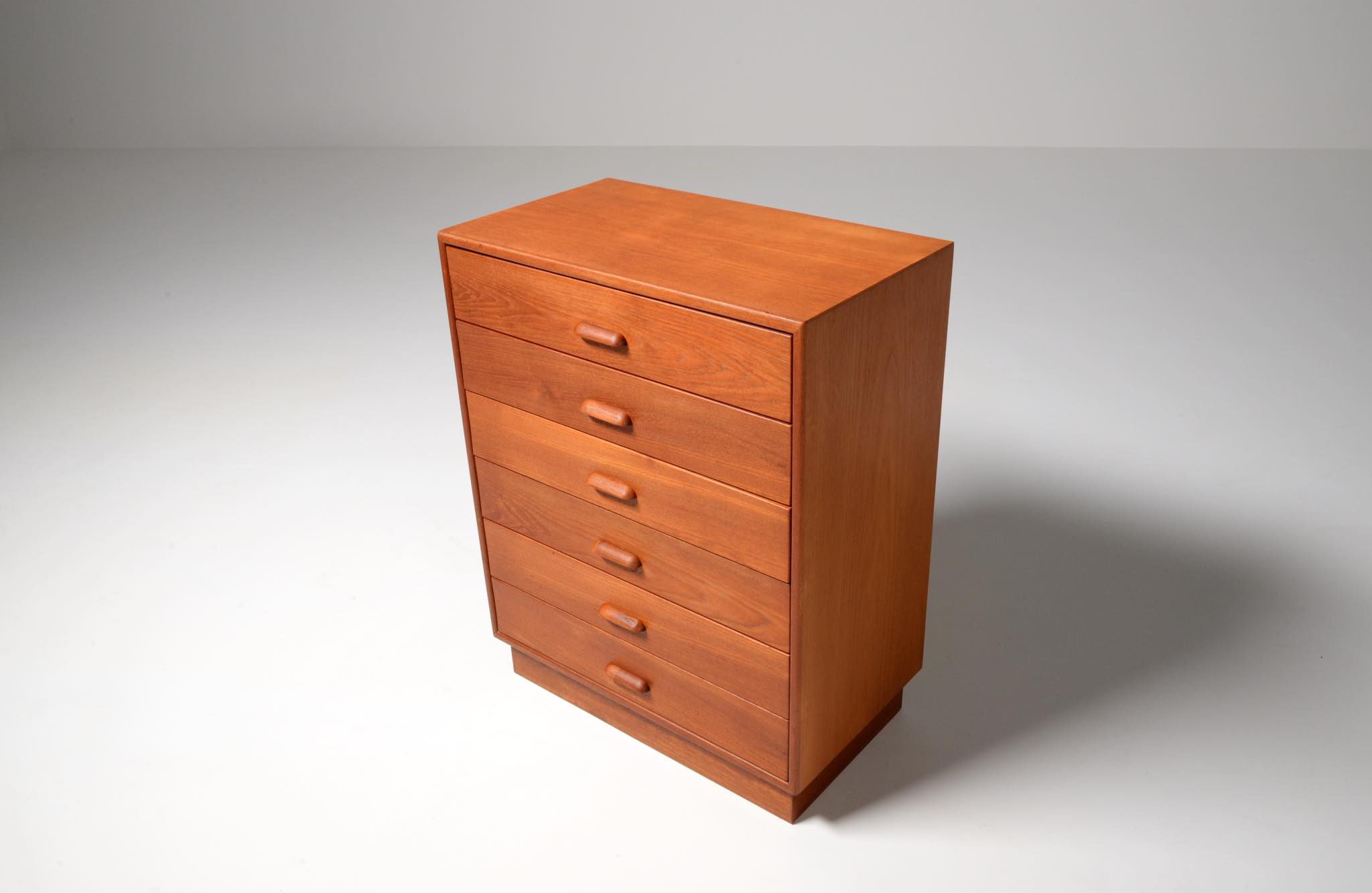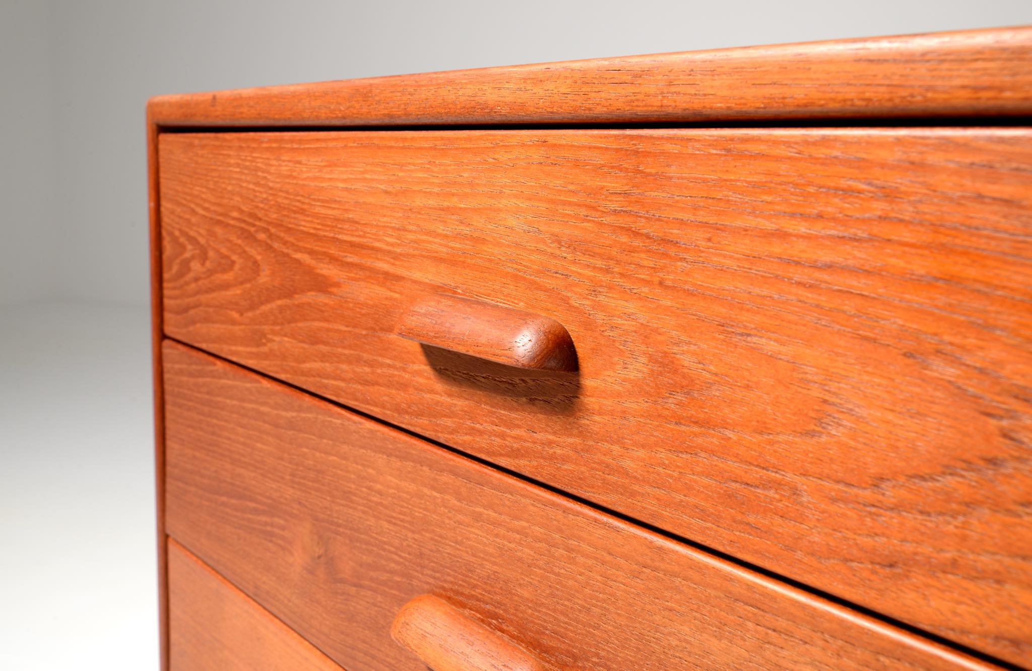 デンマークの家具デザイナー、Sigfred Omann/シグフレッド・オマーンと思われるチェスト一対です。引手に特徴のあるデザインで、抽斗の前板には無垢材が使われています。故に若干の反りが生じています。ひとつのチェストの最下段の引手や側面に呼び継補修があります。
