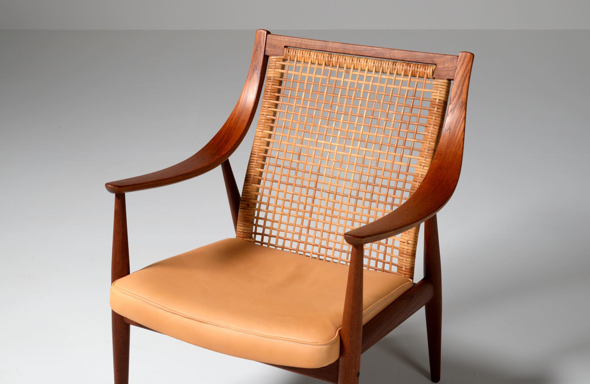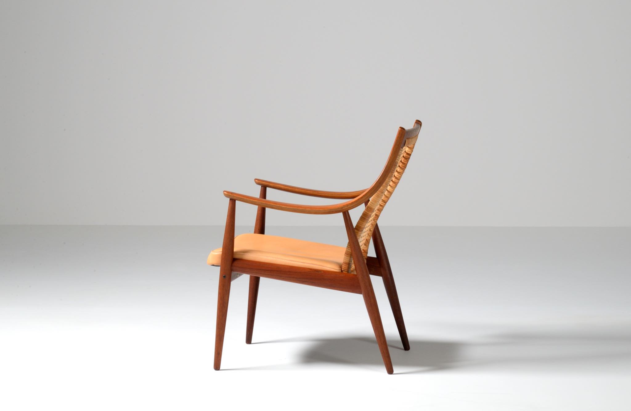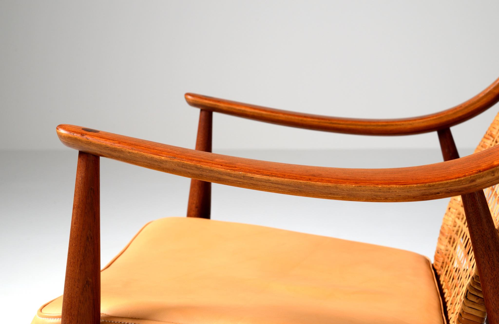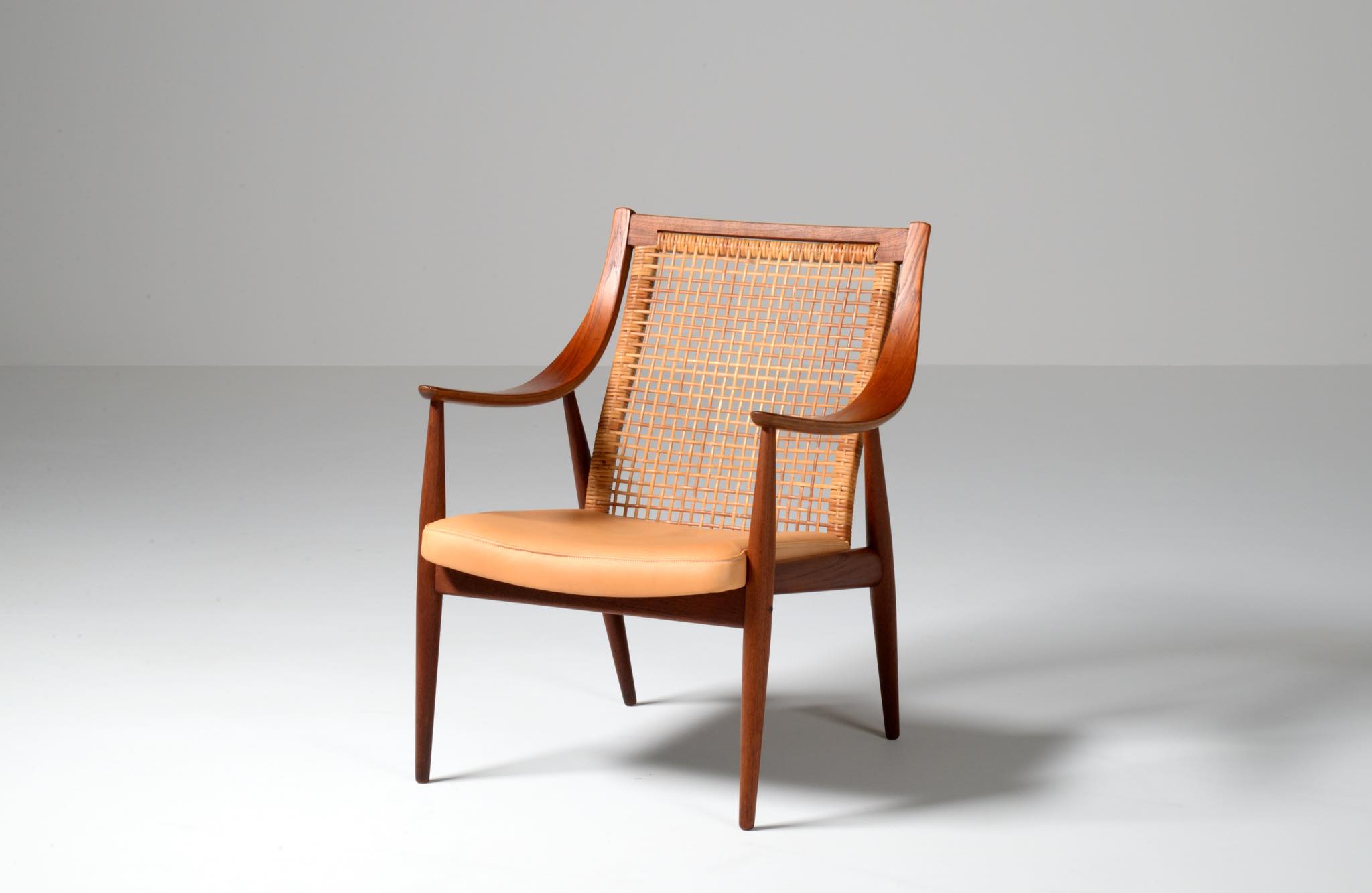1950年代に活躍したデンマークのデザイナーユニット、Peter Hvidt/ピーター・ヴィッツとOrla Mølgaard Nielsen/オルラ・ミュルゴー・ニールセンによるイージーチェアです。座り心地は良く、籐張りの背もたれが涼しげなデザインです。