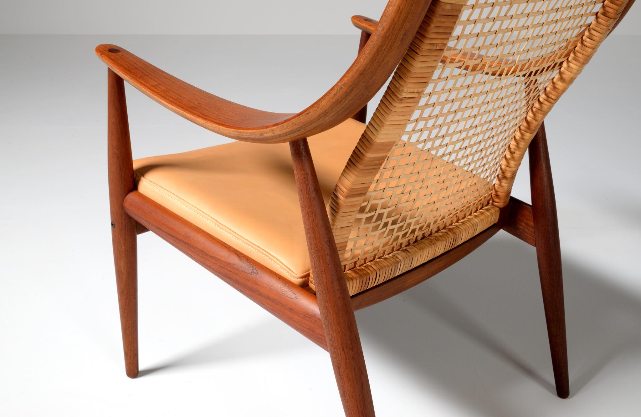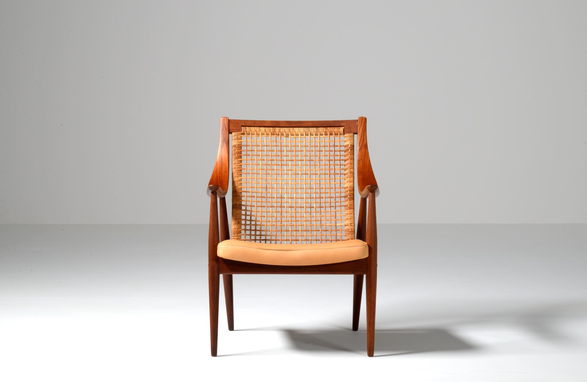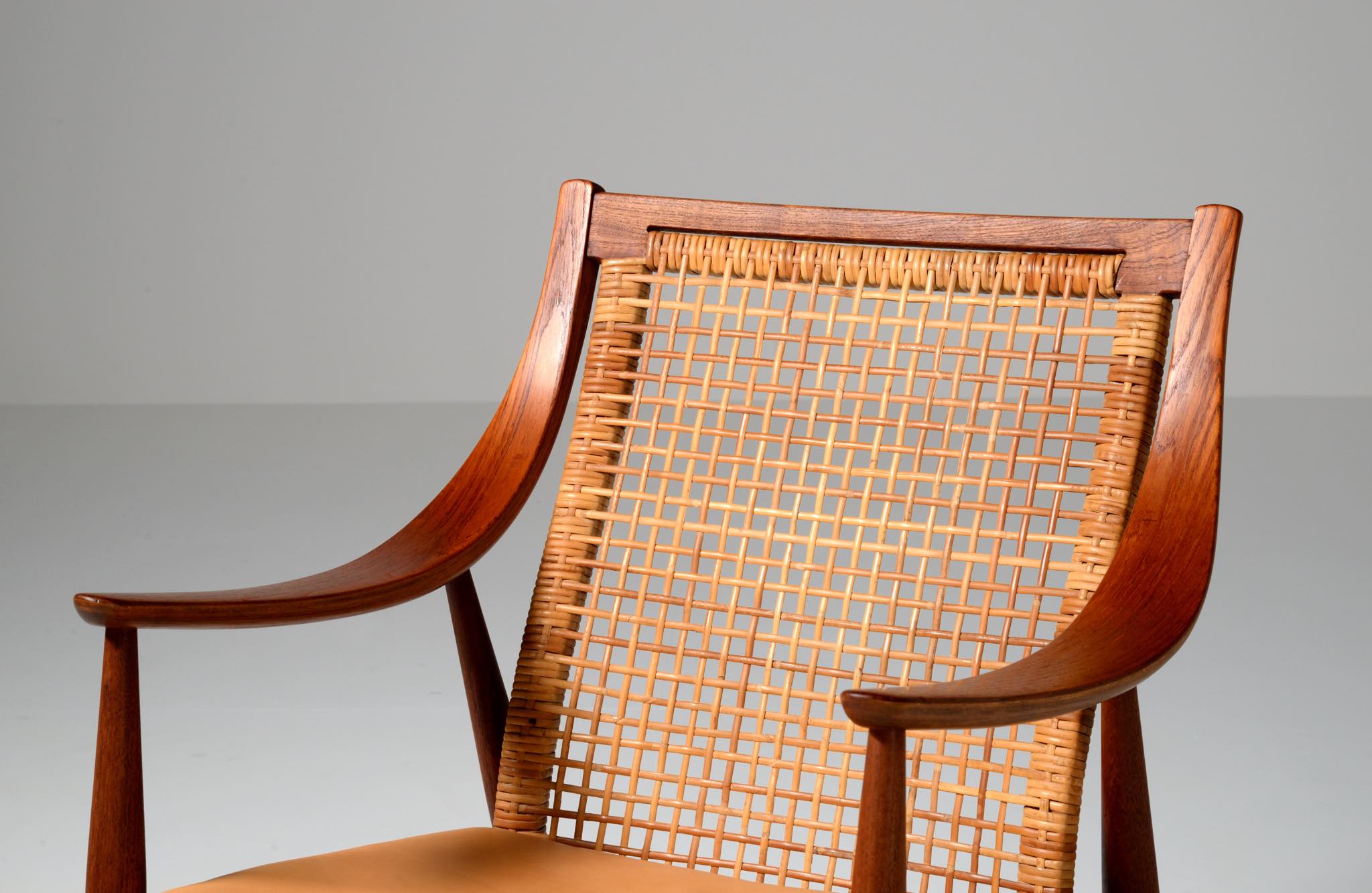 1950年代に活躍したデンマークのデザイナーユニット、Peter Hvidt/ピーター・ヴィッツとOrla Mølgaard Nielsen/オルラ・ミュルゴー・ニールセンによるイージーチェアです。座り心地は良く、籐張りの背もたれが涼しげなデザインです。