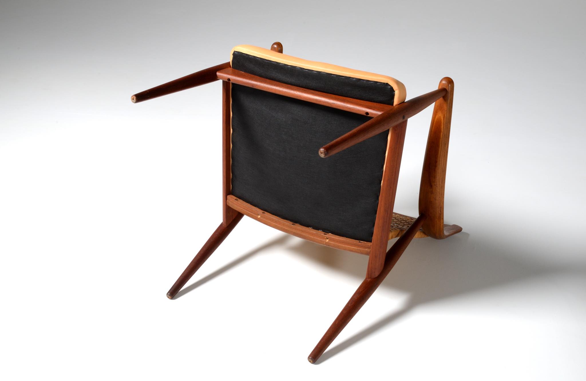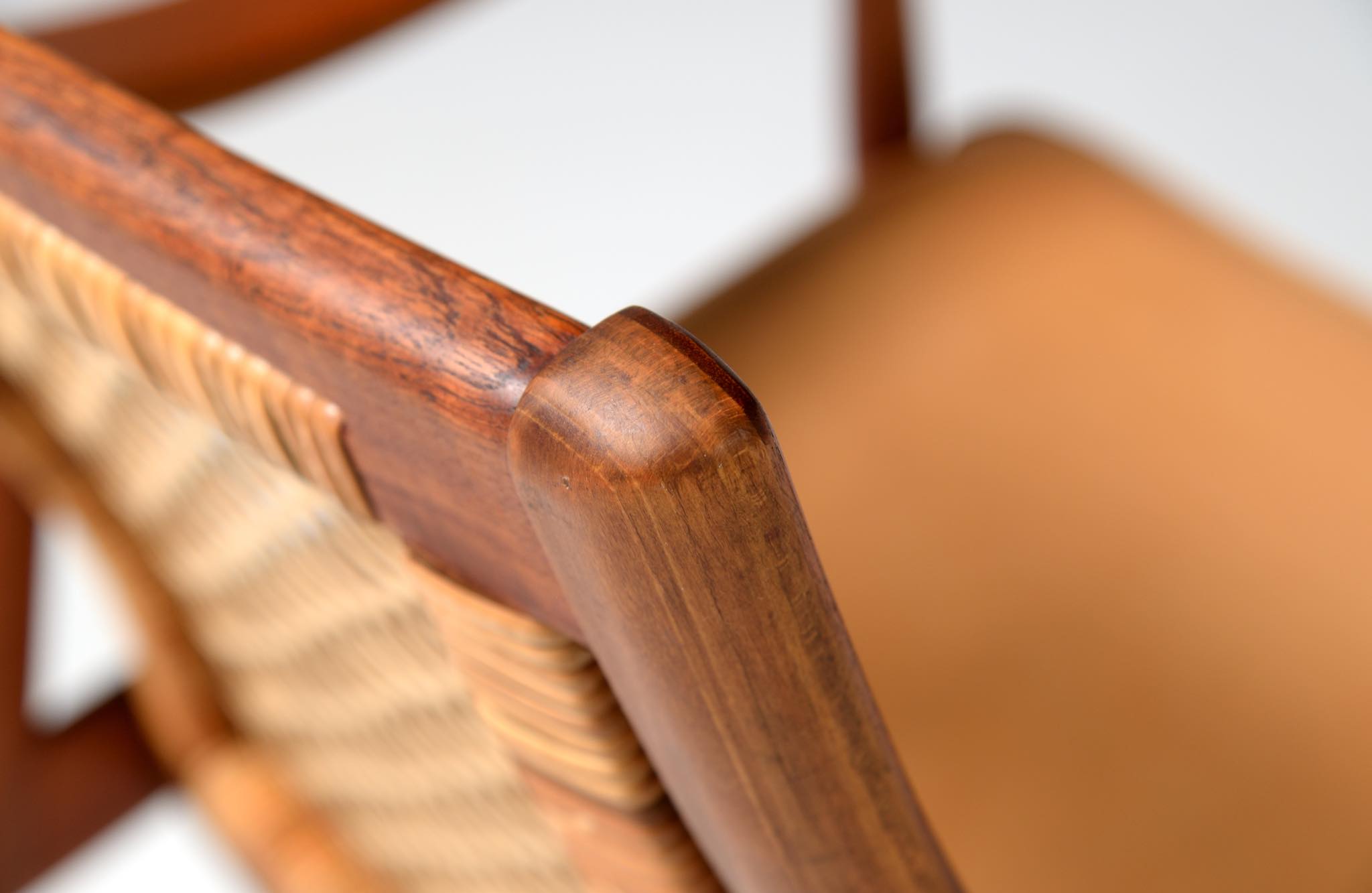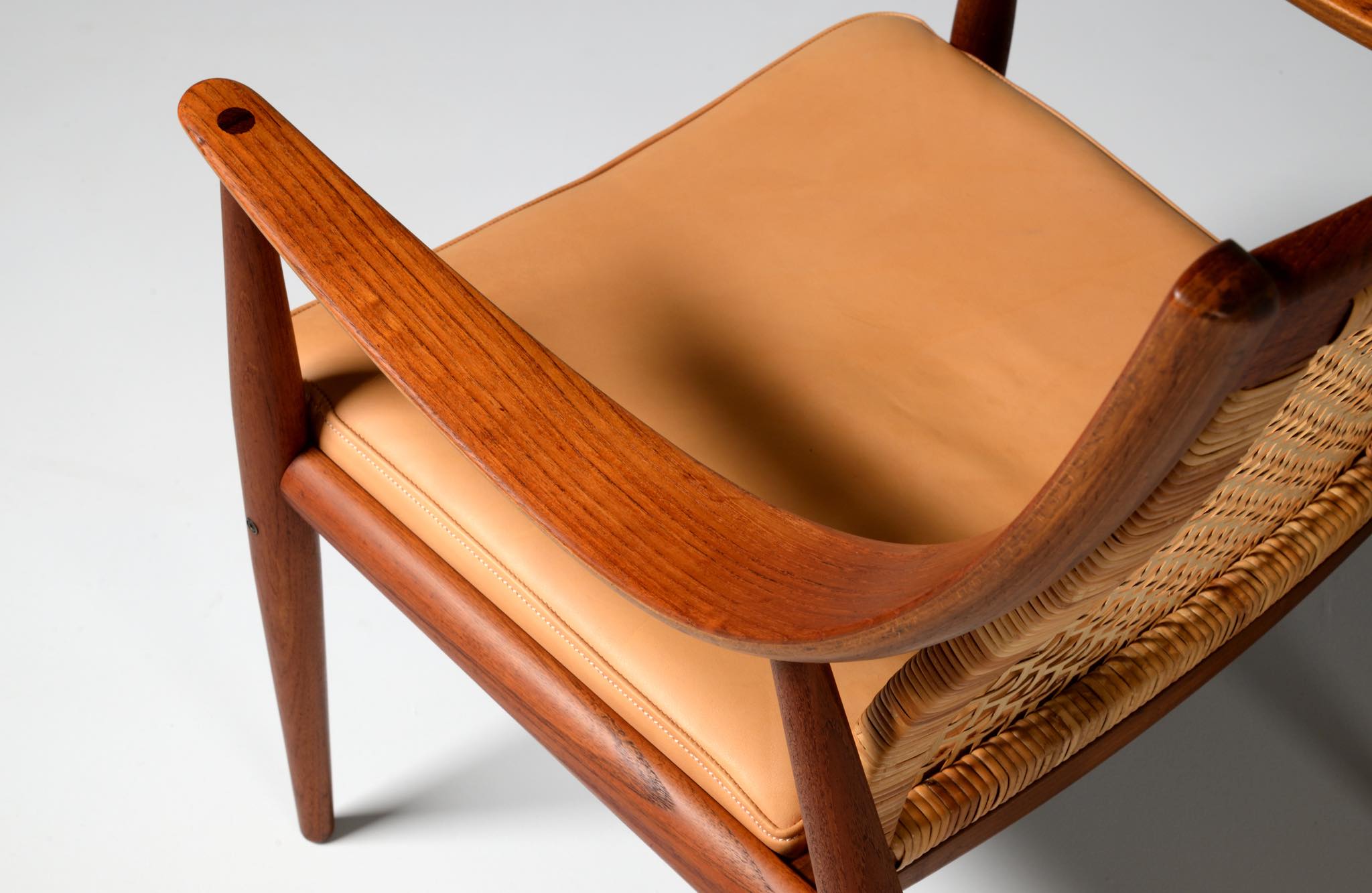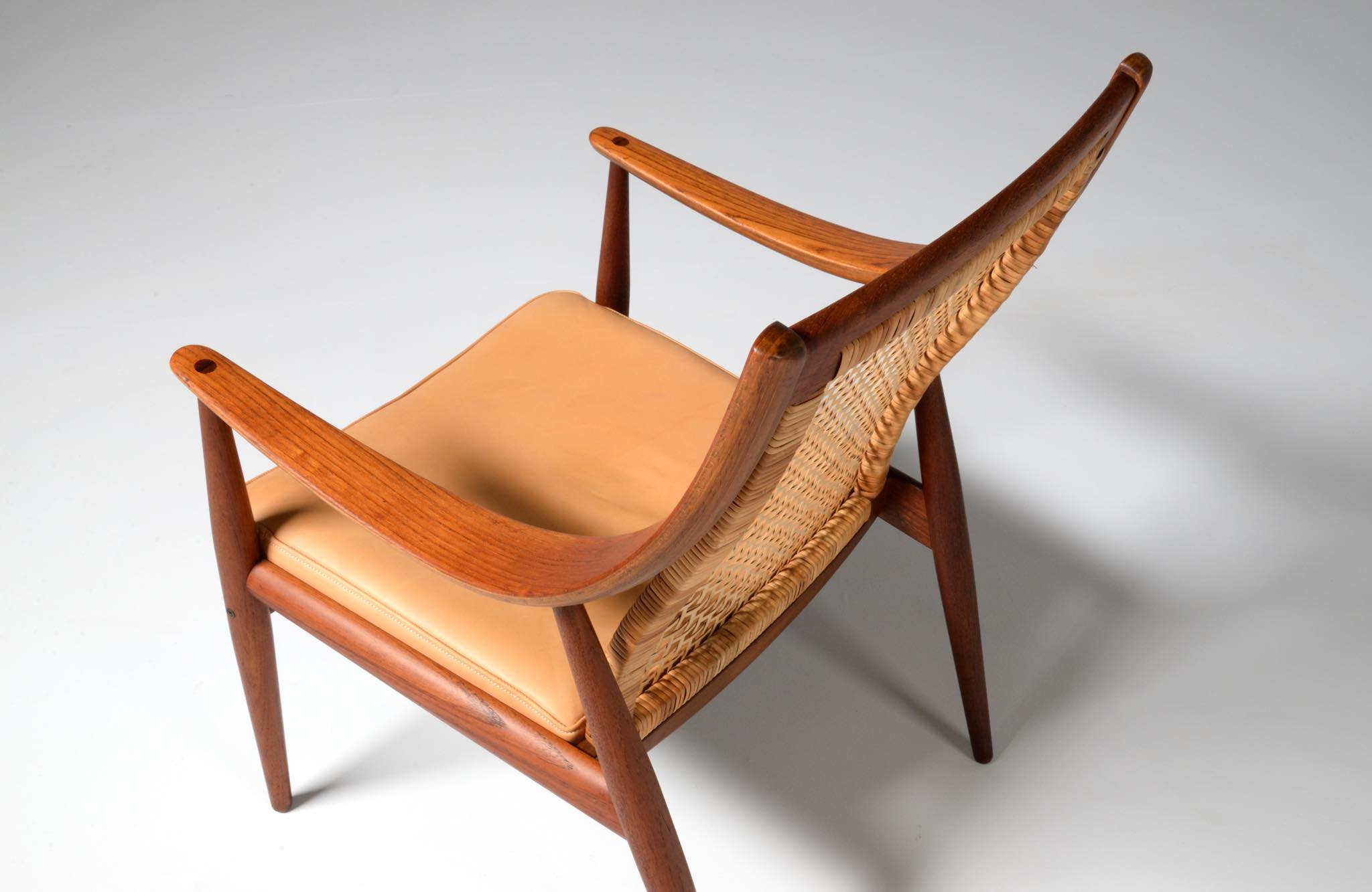1950年代に活躍したデンマークのデザイナーユニット、Peter Hvidt/ピーター・ヴィッツとOrla Mølgaard Nielsen/オルラ・ミュルゴー・ニールセンによるイージーチェアです。座り心地は良く、籐張りの背もたれが涼しげなデザインです。