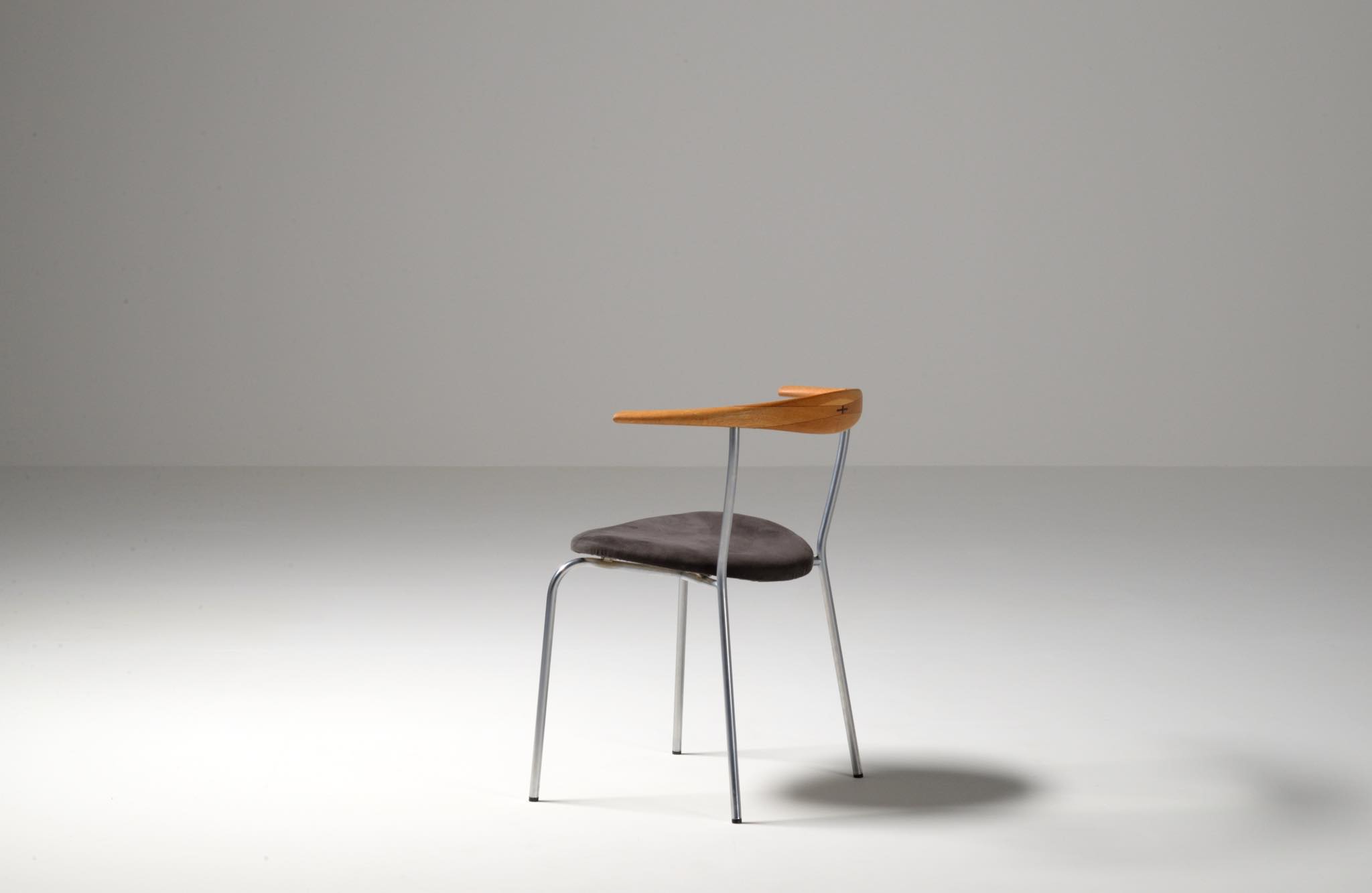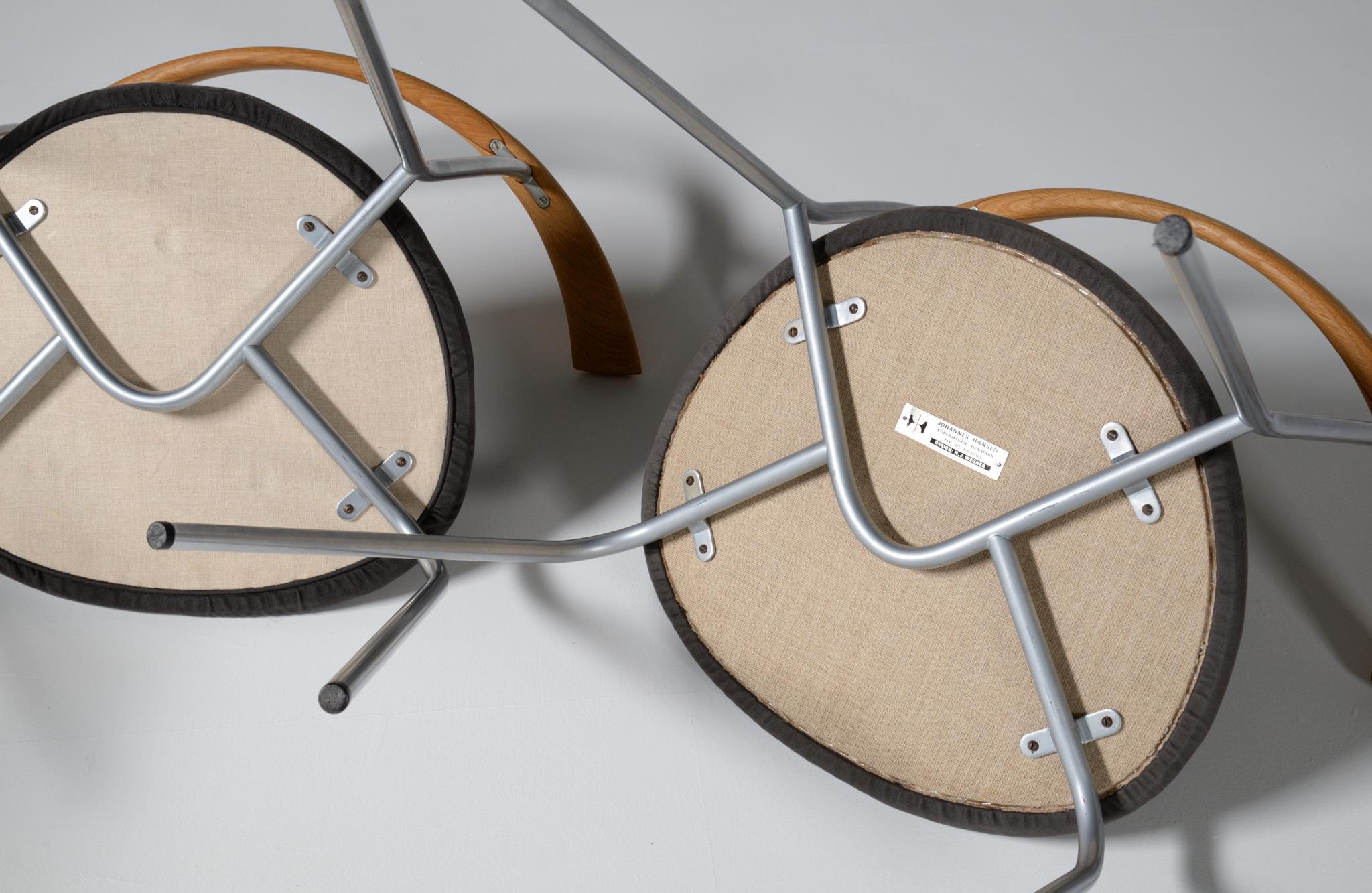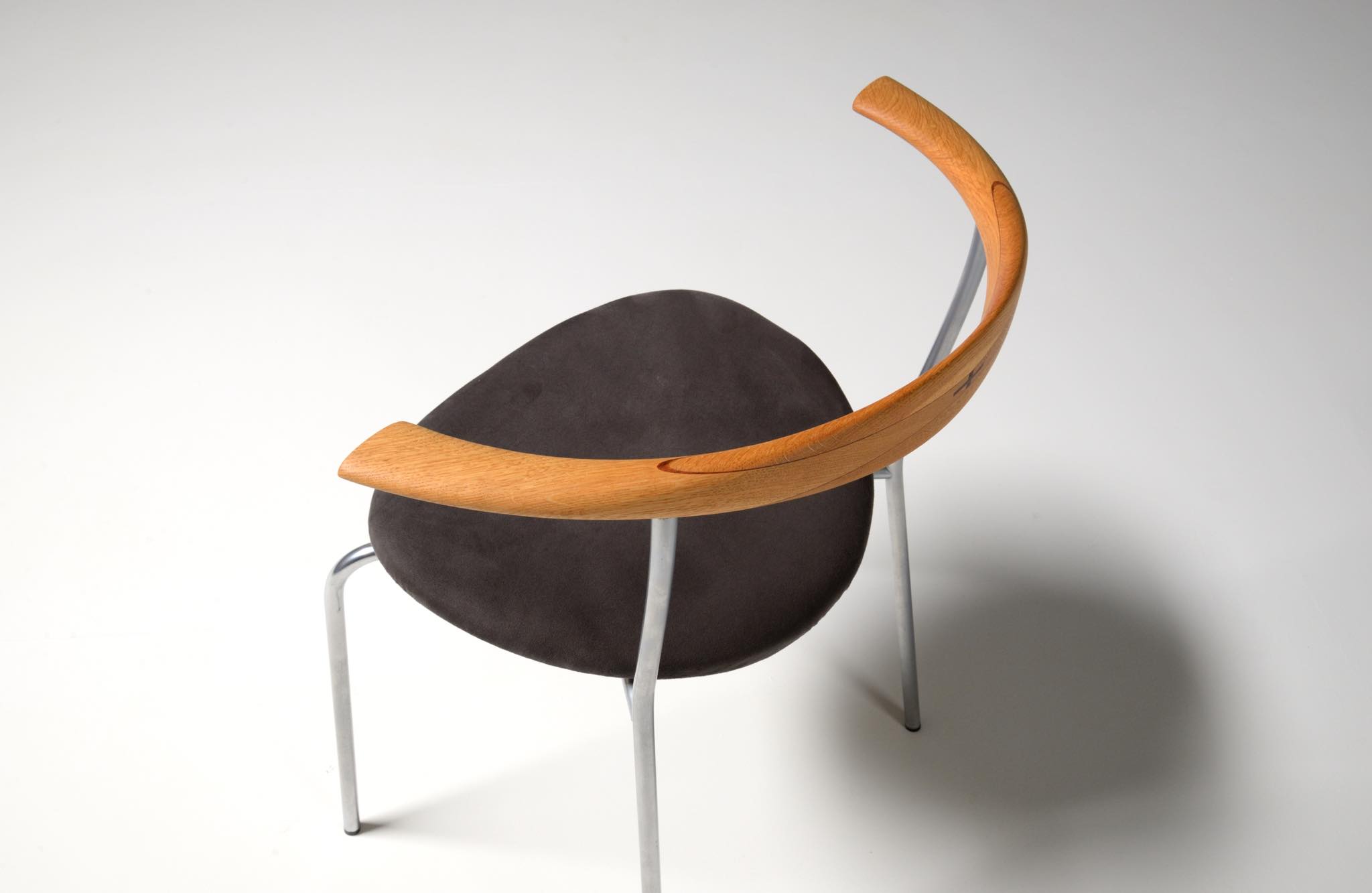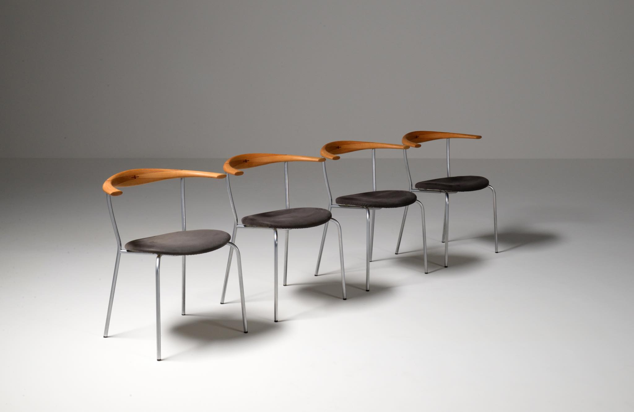 デンマークを代表する家具デザイナー、Hans J. Wegner/ハンス・ウェグナーによる ”JH701"ダイニングチェア、4脚セットです。初期の工房、ヨハネス・ハンセンにて作られたもので、オーク材のタイプです。笠木の契りにはローズウッドが象眼されています。シートは近年にアルカンターラにて張り替えられています。メーカープレートは1脚にのみ備わります。全体的にとてもきれいな状態です。