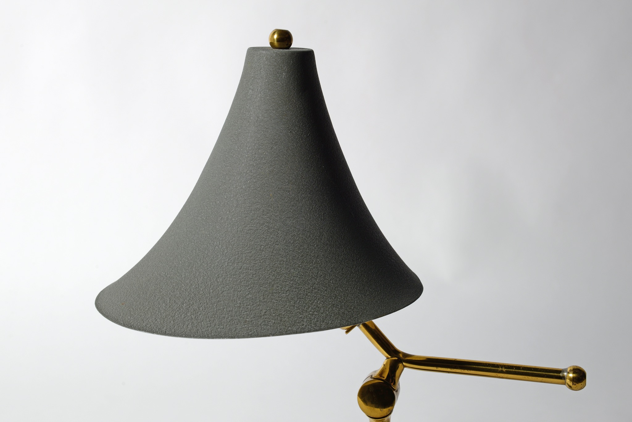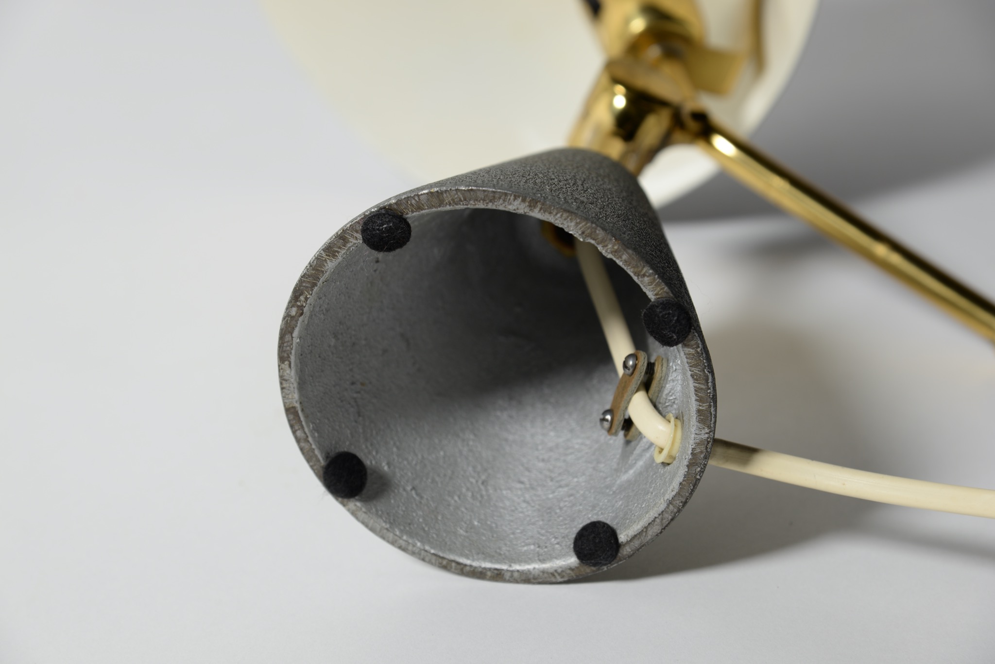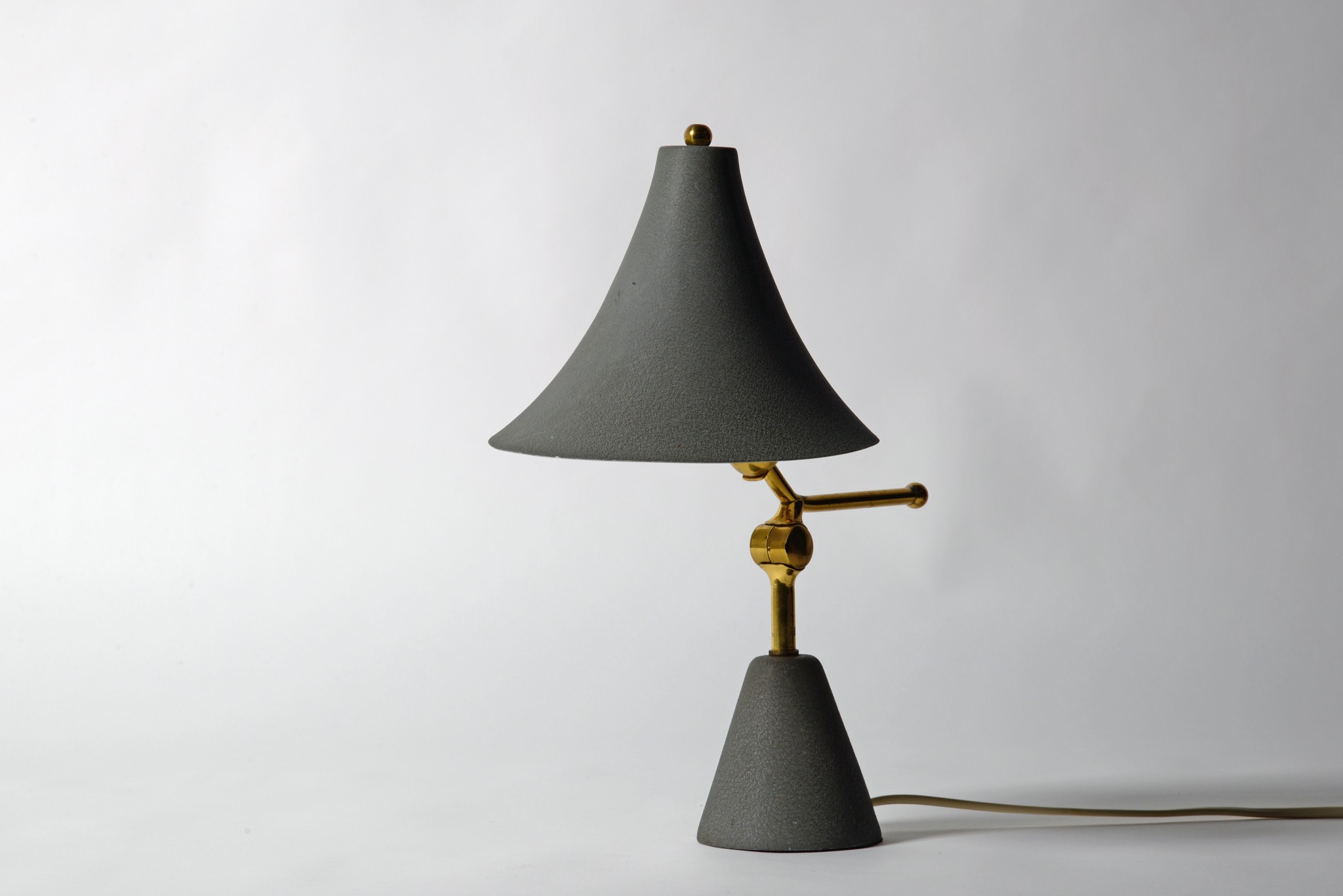 デンマーク製、ユニークな形状のテーブルランプです。支柱のハンドルを操作することでシェードの向きが変わり、リーディングランプとしてもお使いいただけます。ベースは鋳物のようで安定感があります。支柱は真鍮製、シェードはアルミのようです。コンディションは良好です。戦前までのデンマークには多くの銀細工師が存在していたものの、戦争が近付く頃に発せられた金属類回収令によって多くの職人が職を失い、戦後になりこのような照明などを作る小さな工房が無数に生まれたと云われています。