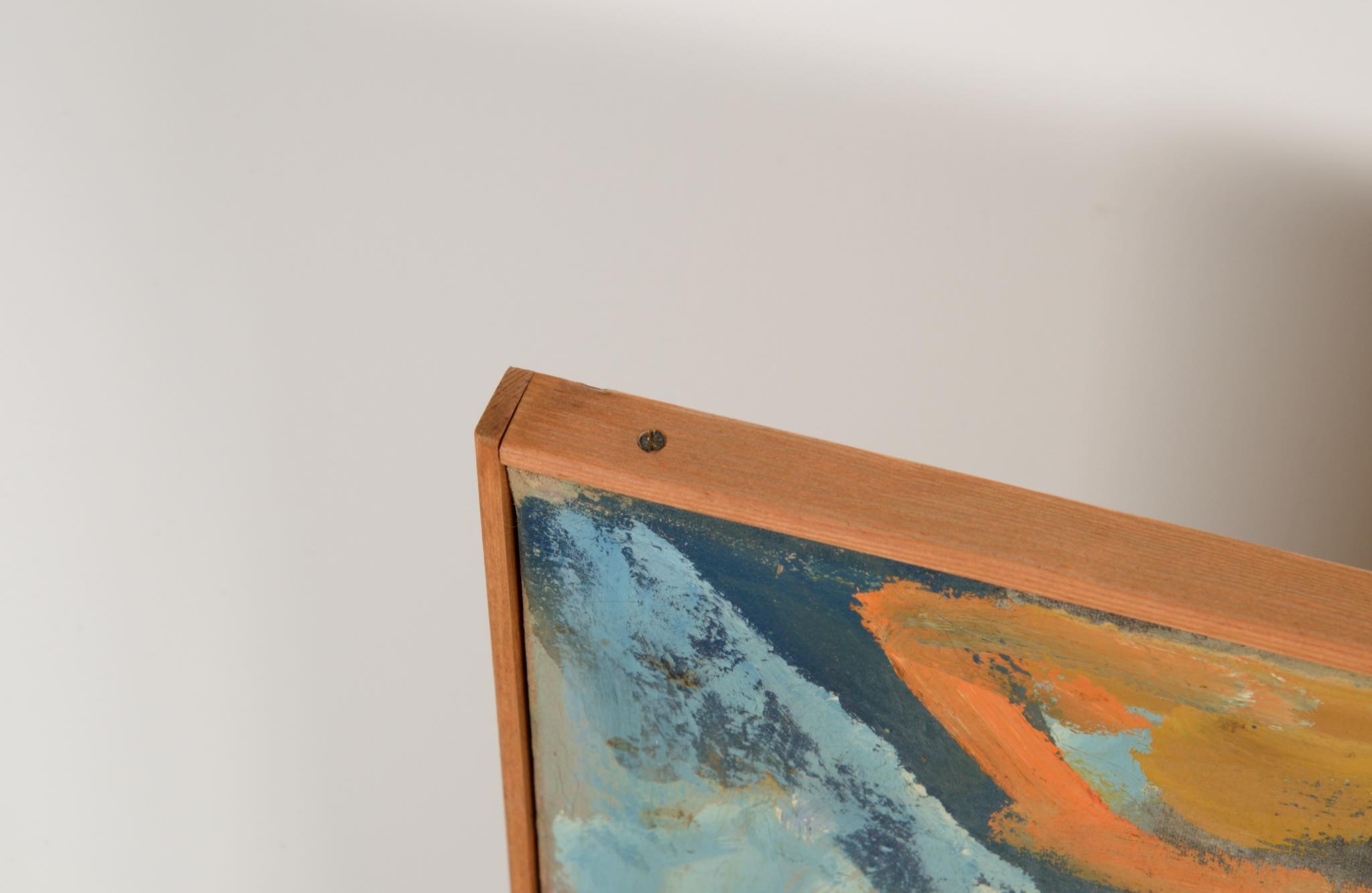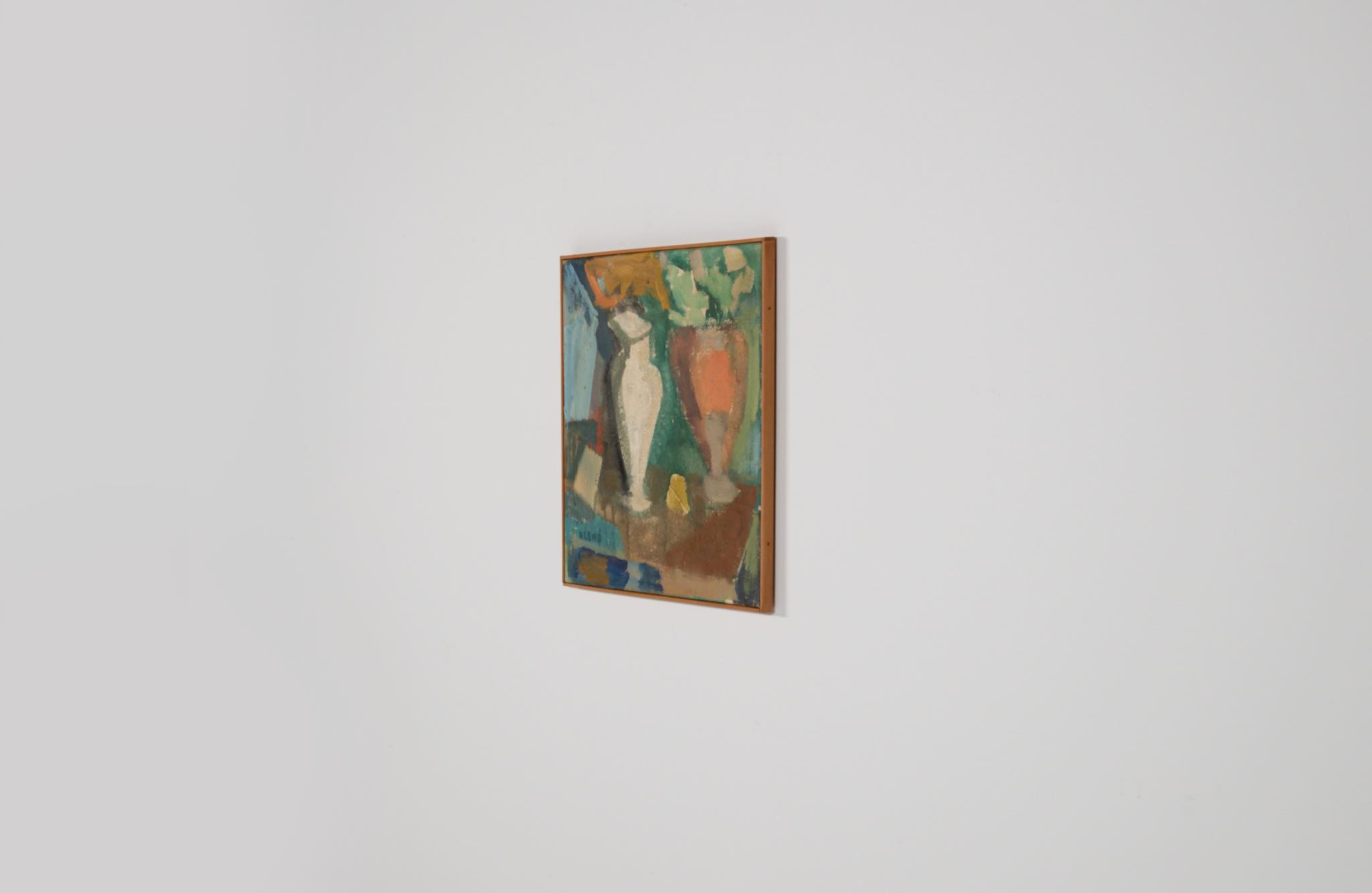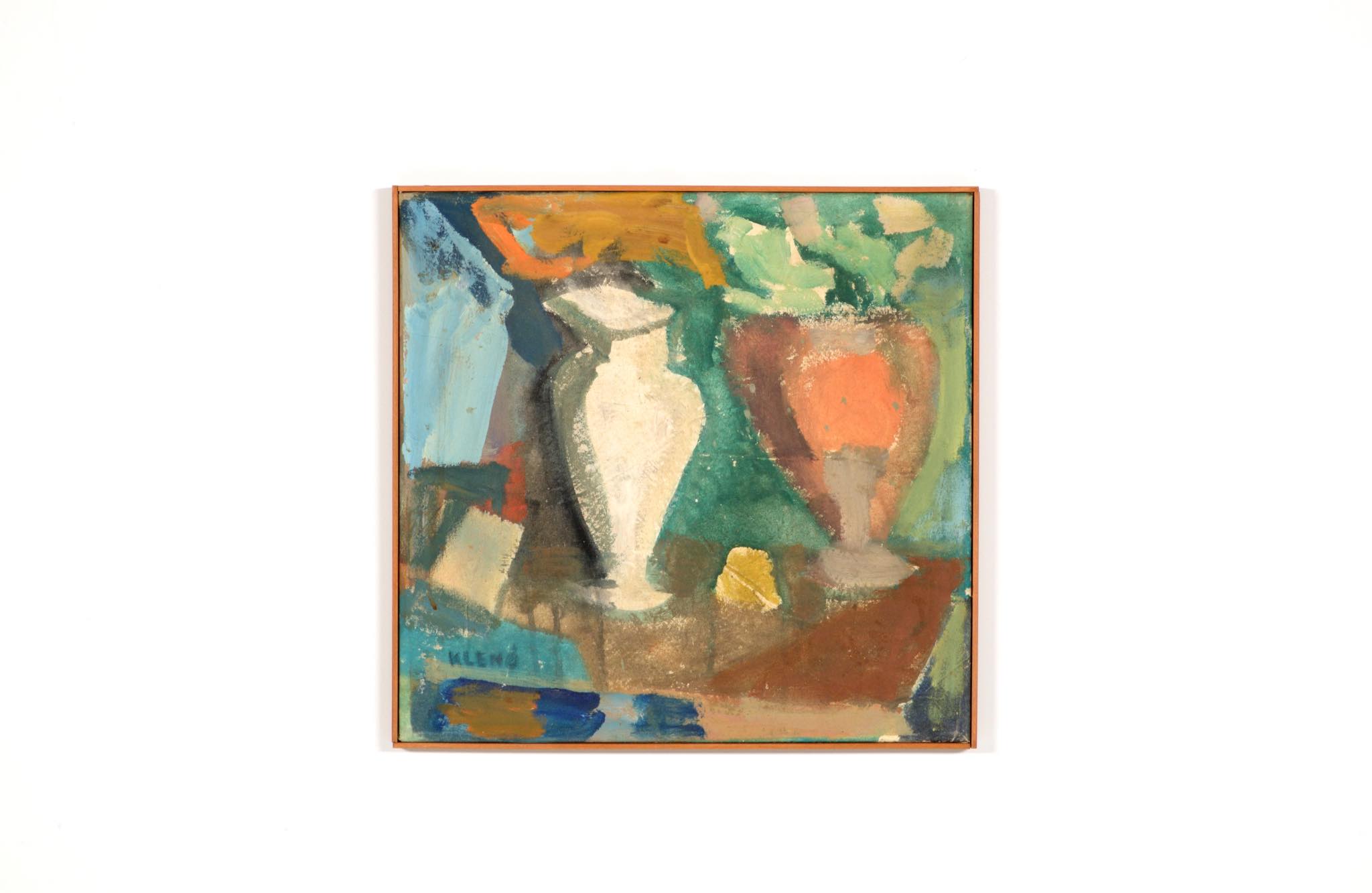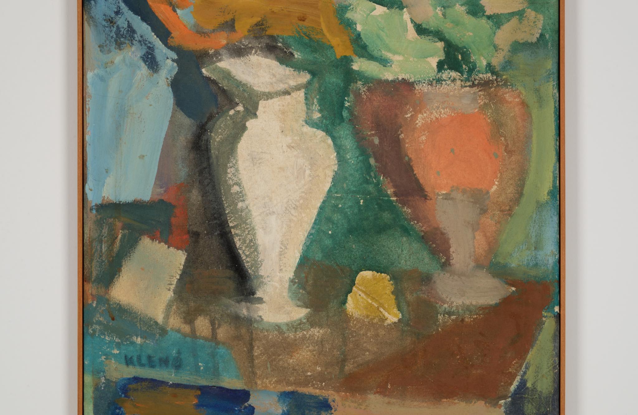 デンマークの芸術家、Evgenij Klenø/エヴゲニー・クレノによる油彩作品です。卓上に置かれた磁器の花瓶などの静物が独自の筆致で描かれており、クレノによる特有の世界観が表現されています。こちらは1988年に描かれた作品で、近年、ファミリーによるコレクションより売り立てられたものとされています。フレームはパイン材を用いて新たに作成しました。