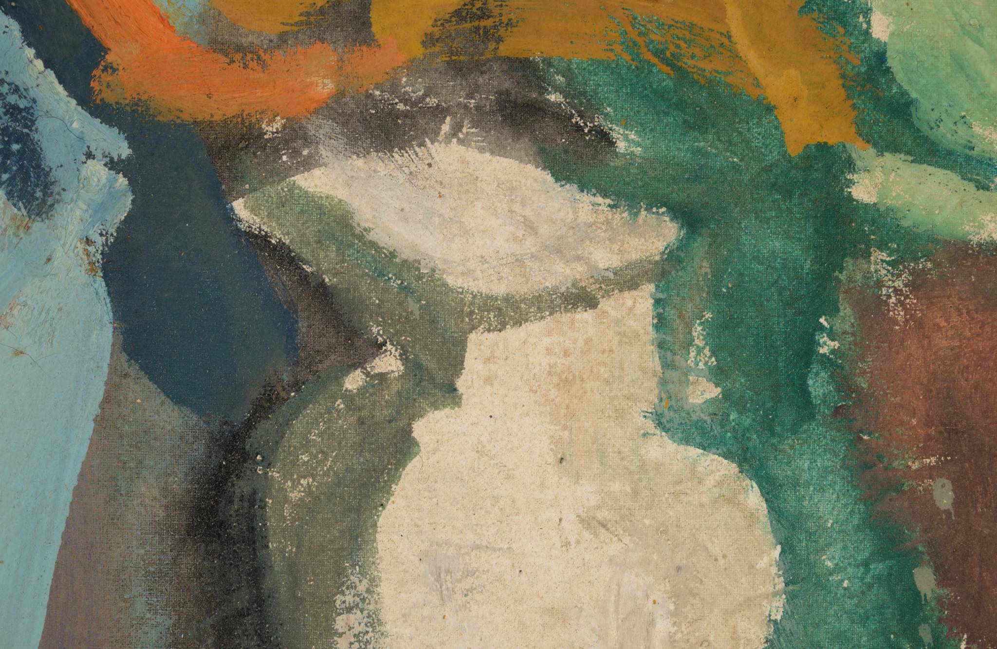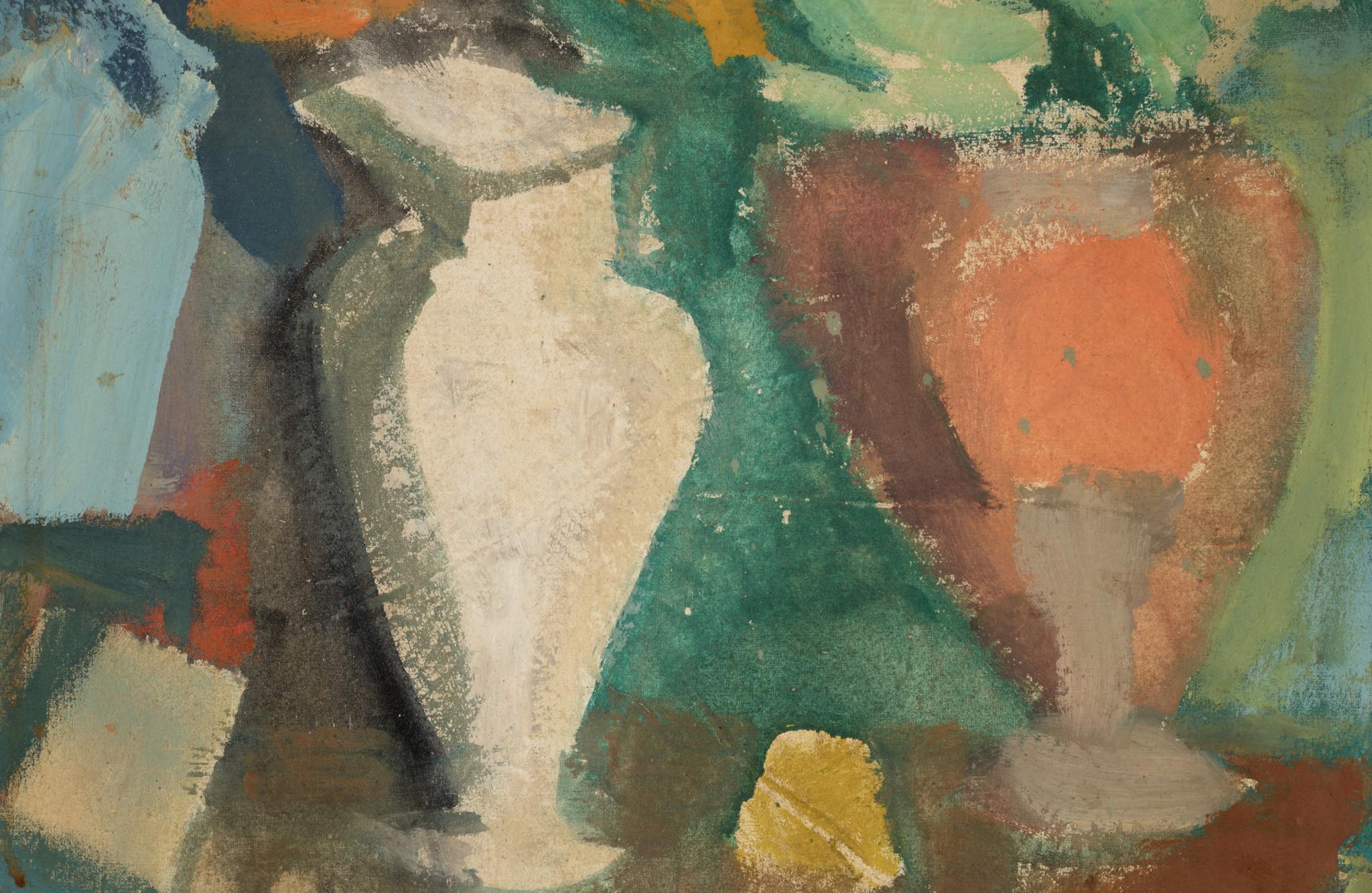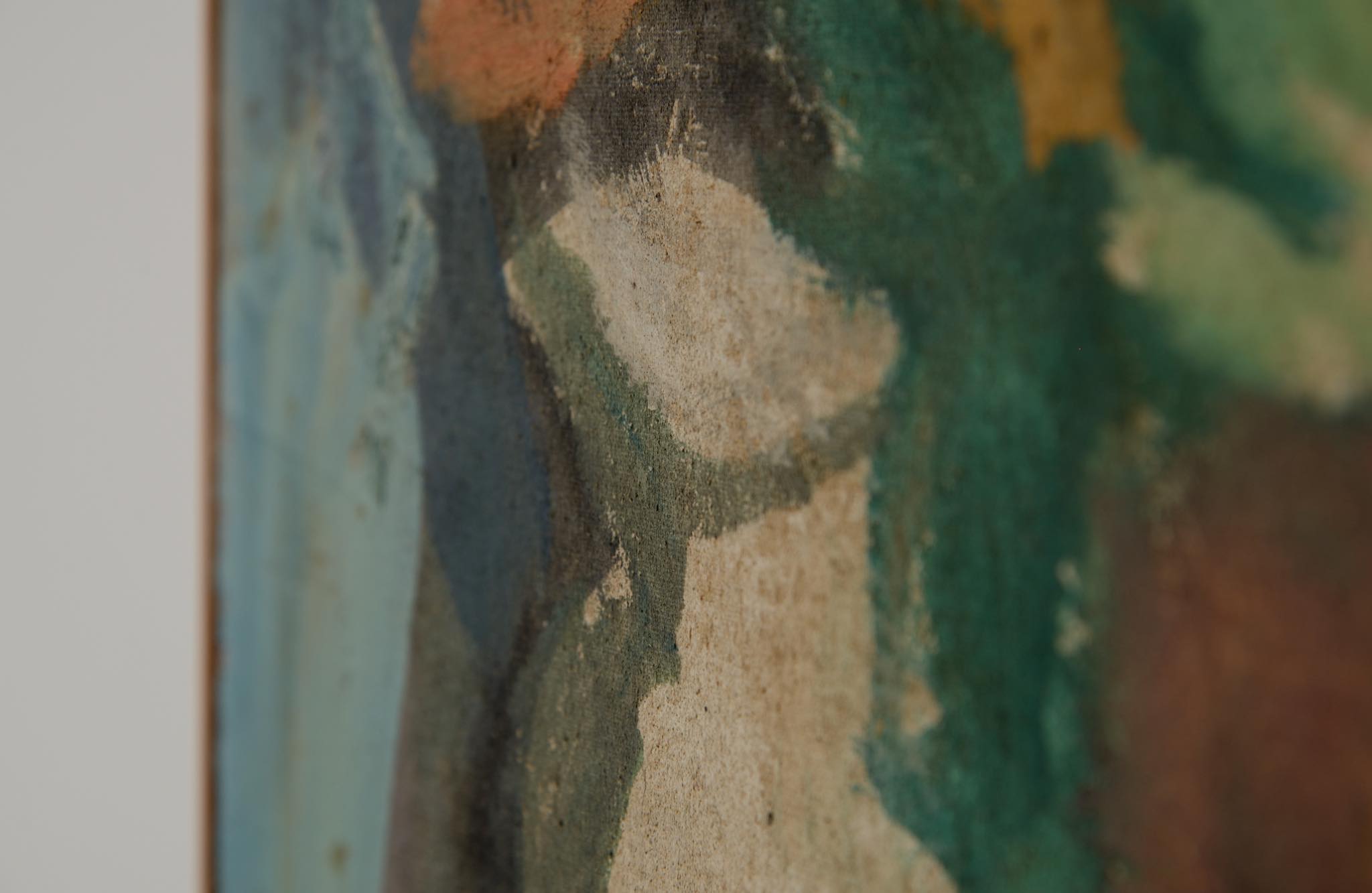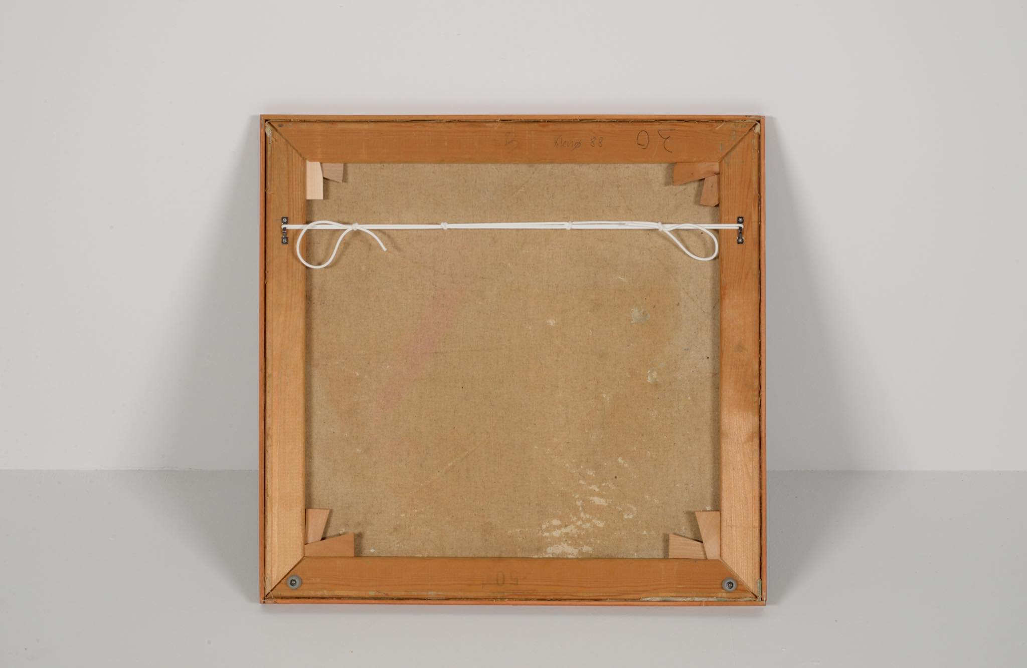デンマークの芸術家、Evgenij Klenø/エヴゲニー・クレノによる油彩作品です。卓上に置かれた磁器の花瓶などの静物が独自の筆致で描かれており、クレノによる特有の世界観が表現されています。こちらは1988年に描かれた作品で、近年、ファミリーによるコレクションより売り立てられたものとされています。フレームはパイン材を用いて新たに作成しました。
