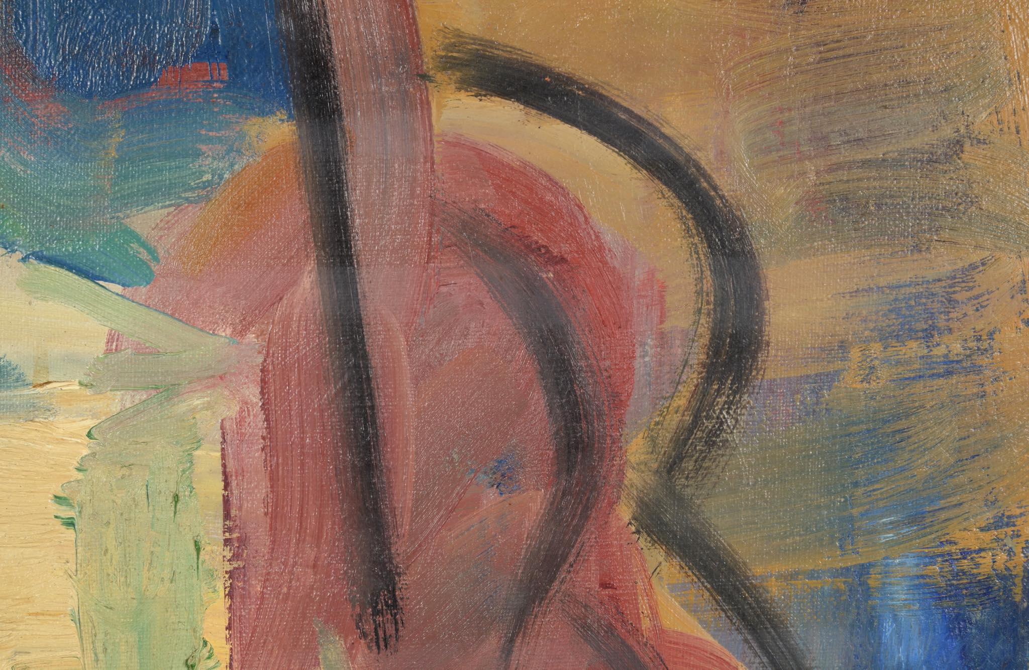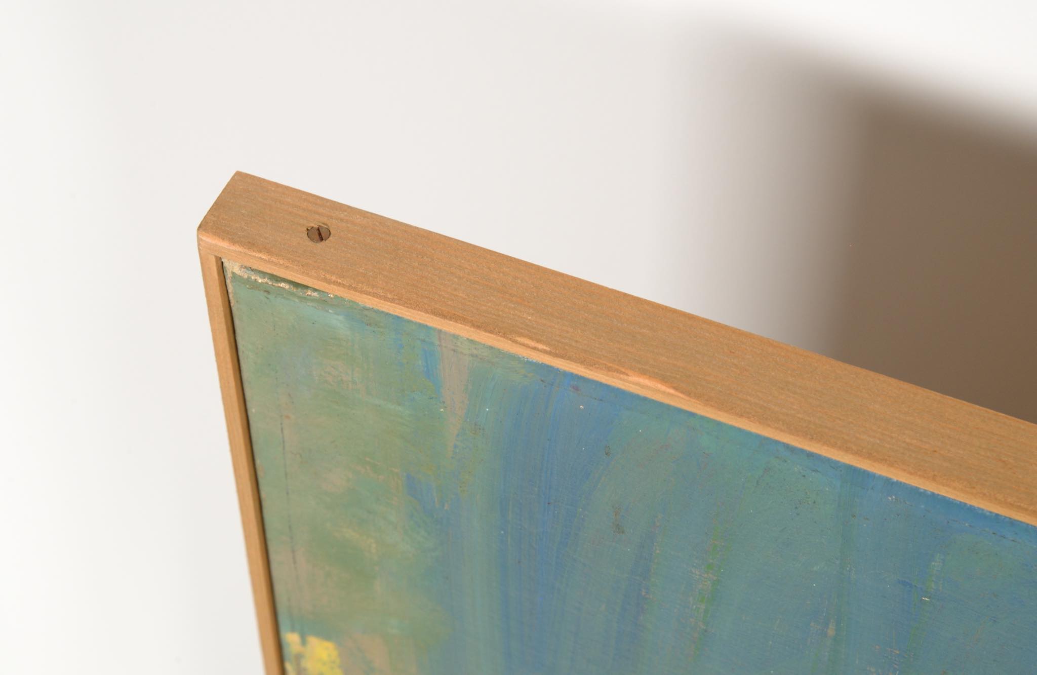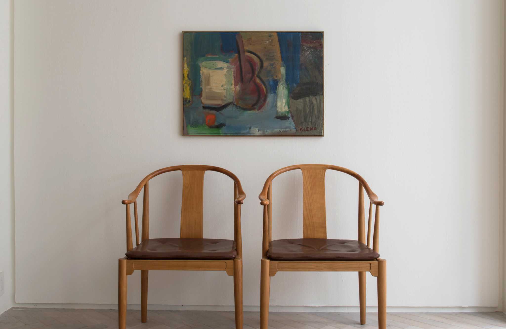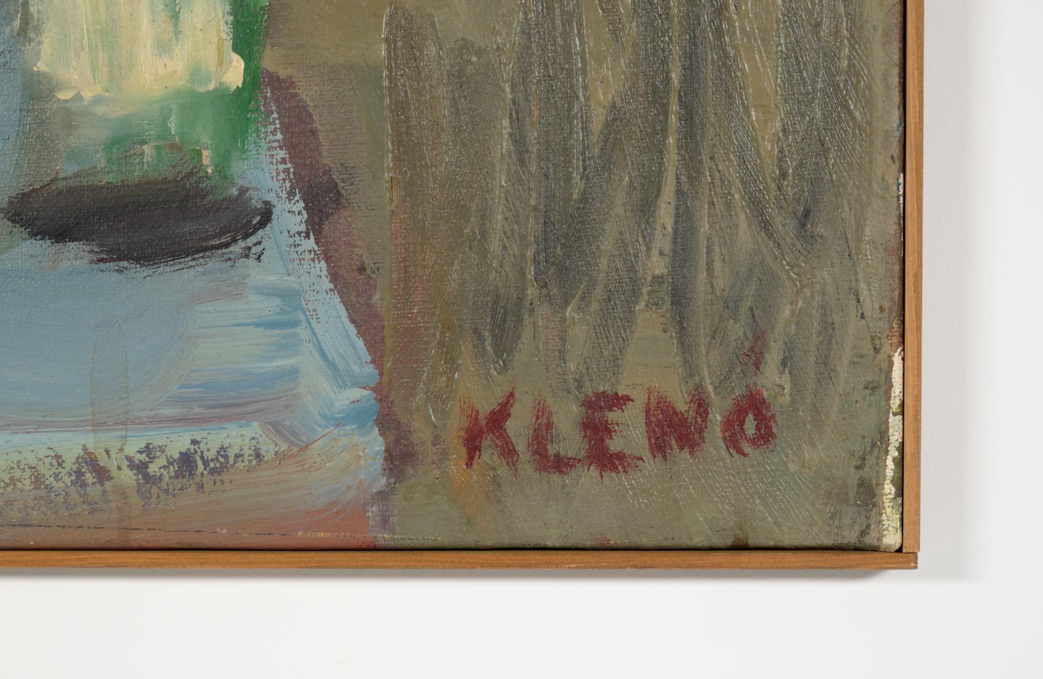 デンマークの芸術家、Evgenij Klenø/エヴゲニー・クレノによる油彩作品です。"Opstillet Violin"と題された作品で、卓上に並ぶバイオリンが独自の筆致で描かれており、クレノによる特有の世界観が表現されています。こちらは1978年にシャーロッテンボー宮殿で開催された「秋の展覧会」に出展された作品で、アーティストのファミリーによるコレクションより売り立てられたものとされています。フレームはパイン材を用いて新たに作成しました。