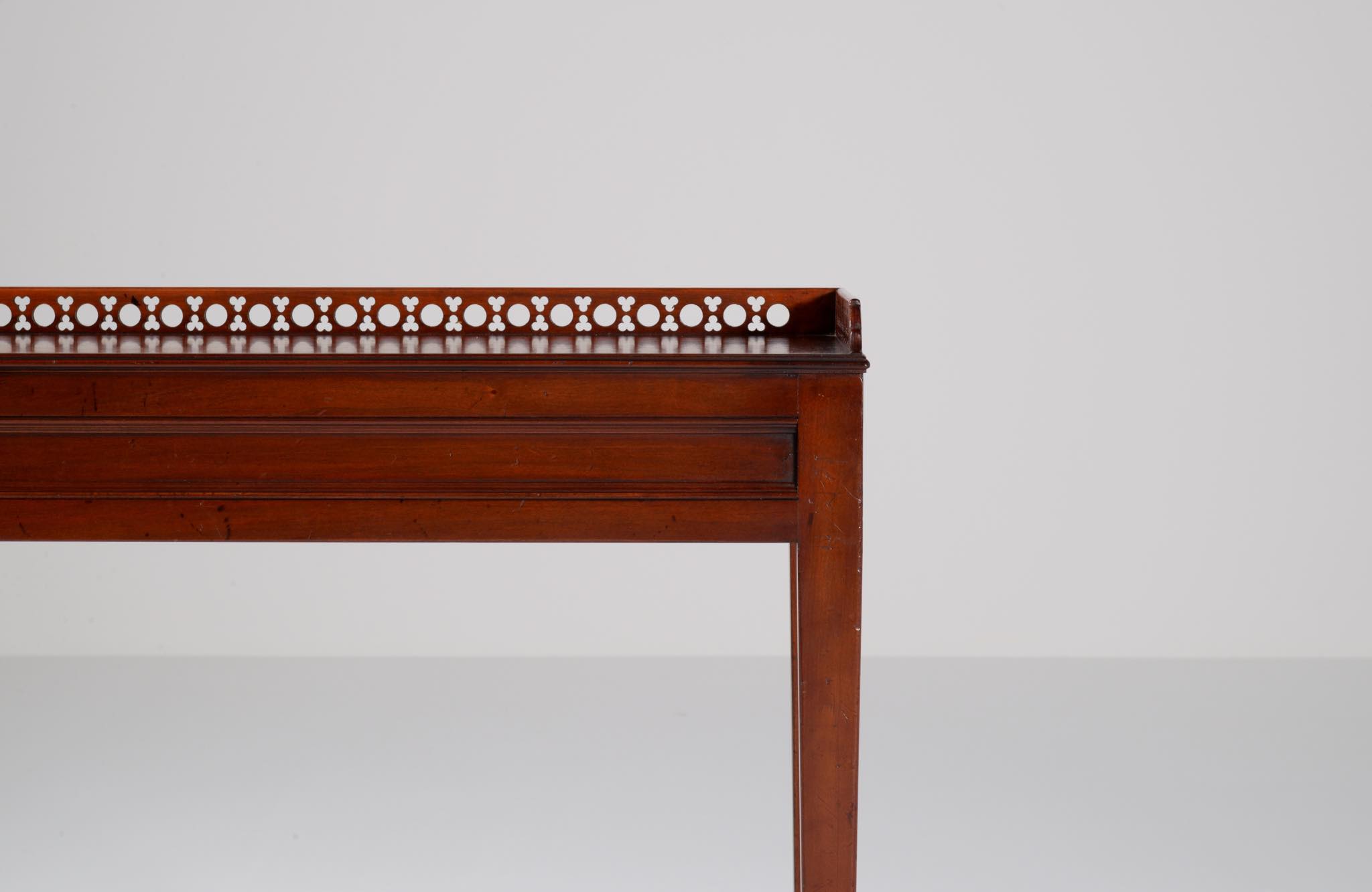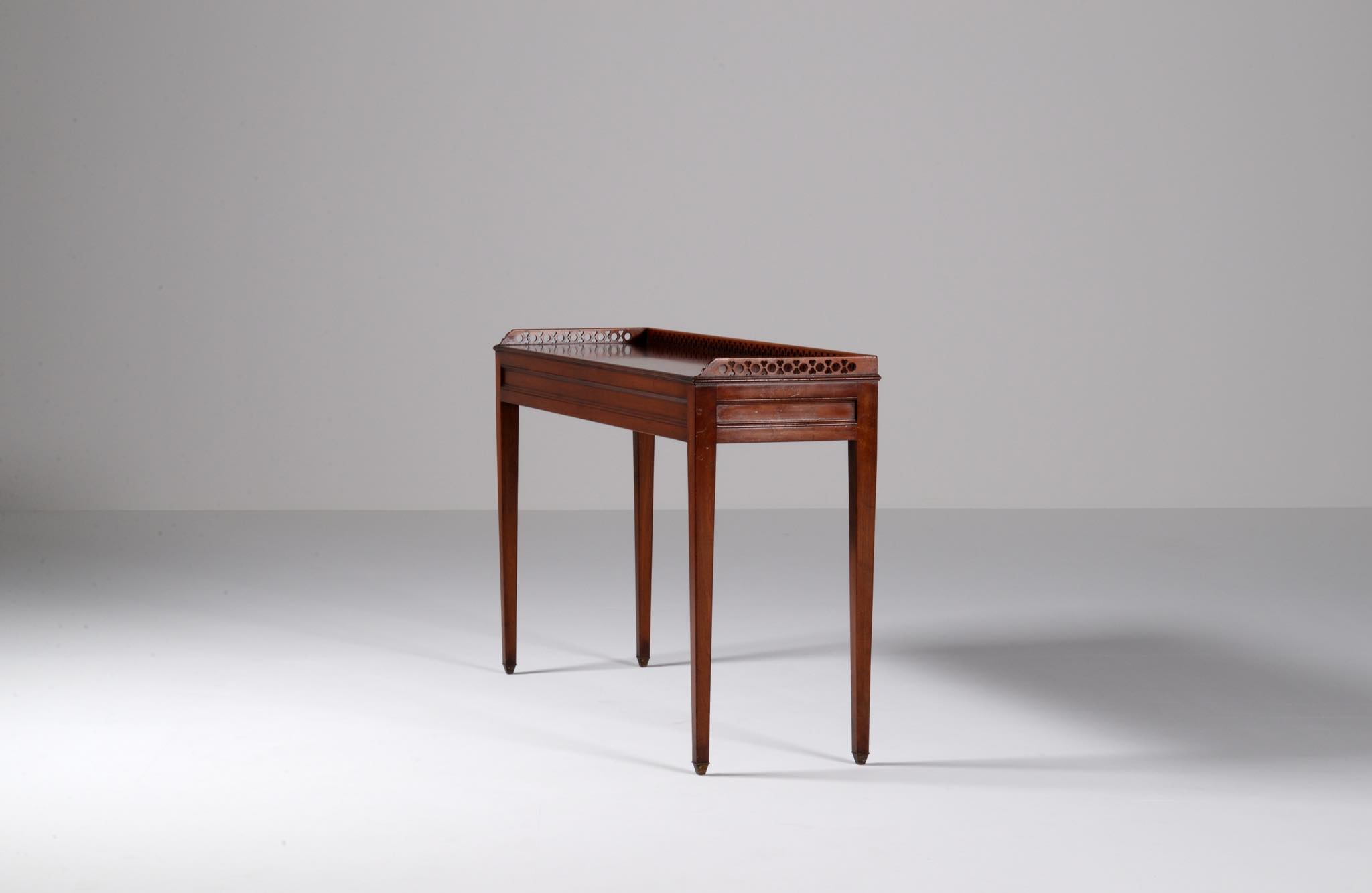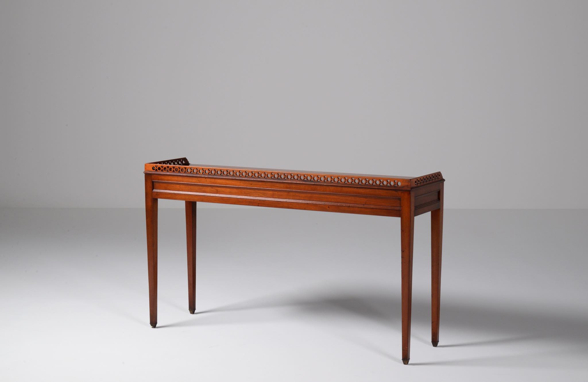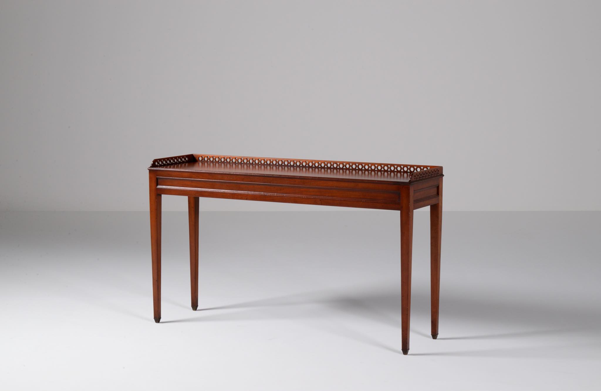 デンマークの家具店、Lysberg Hansen & Therp/リスバーグ・ハンセン&ティアプによって生産、販売されたコンソールテーブルです。1950年代頃に作られたもののようで、マホガニー材と思われる光沢のある材が用いられています。抽斗などはなく、純粋にコンソールとしてのつくりのものです。天板の周囲に設えられたギャラリーバックには丸文様を繋げたような透かし文様が施されています。脚先には真鍮のシューズを履いており、丁寧に作らたものです。フリースタンディングのため、間仕切りとしてもお使いいただけます。天板に古い擦り傷が見られますが、綺麗な状態です。