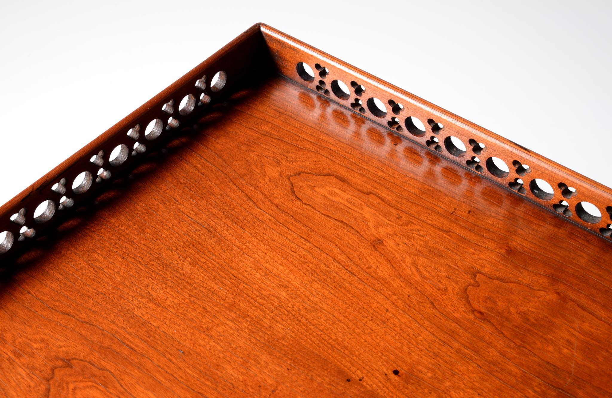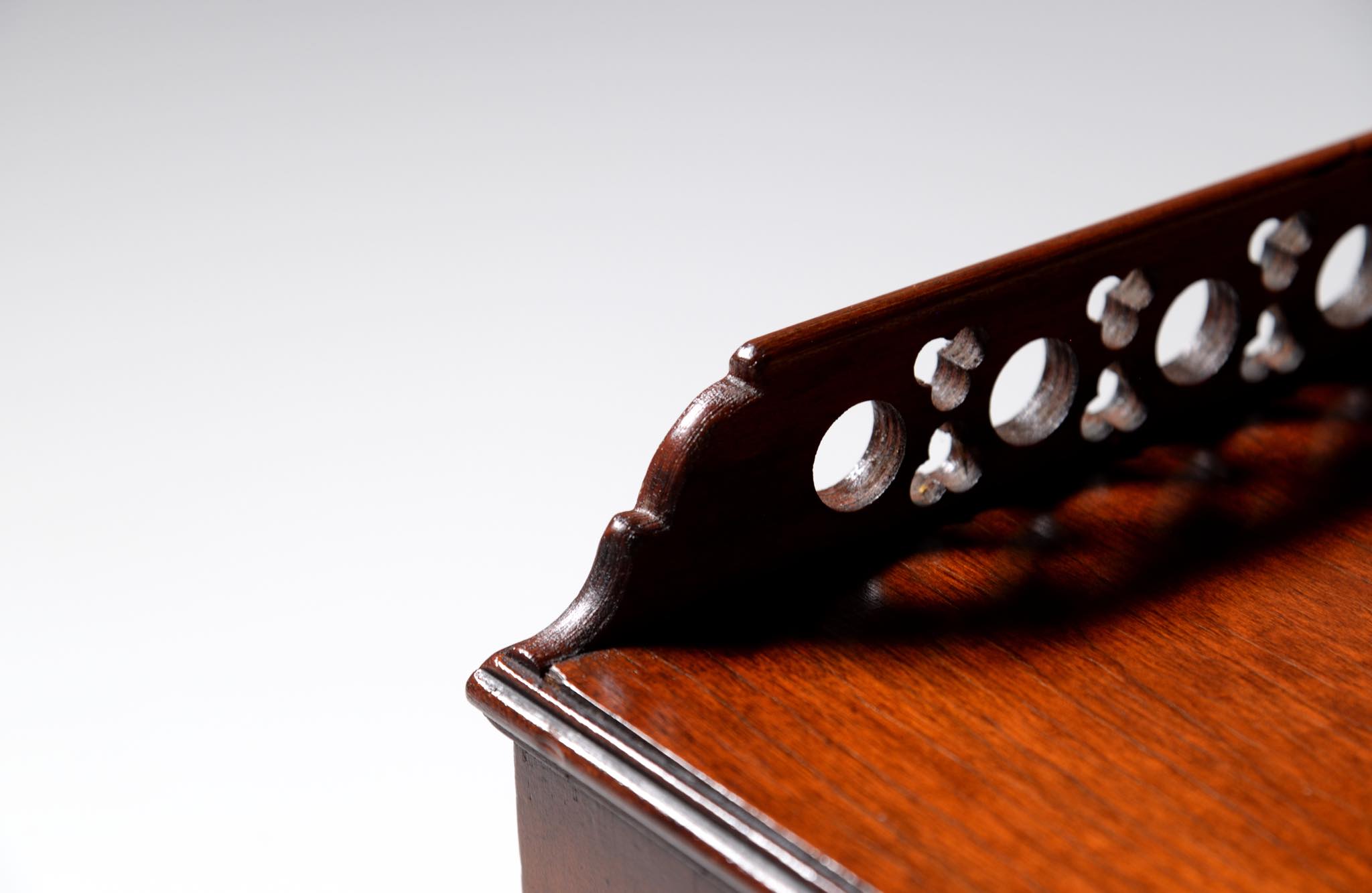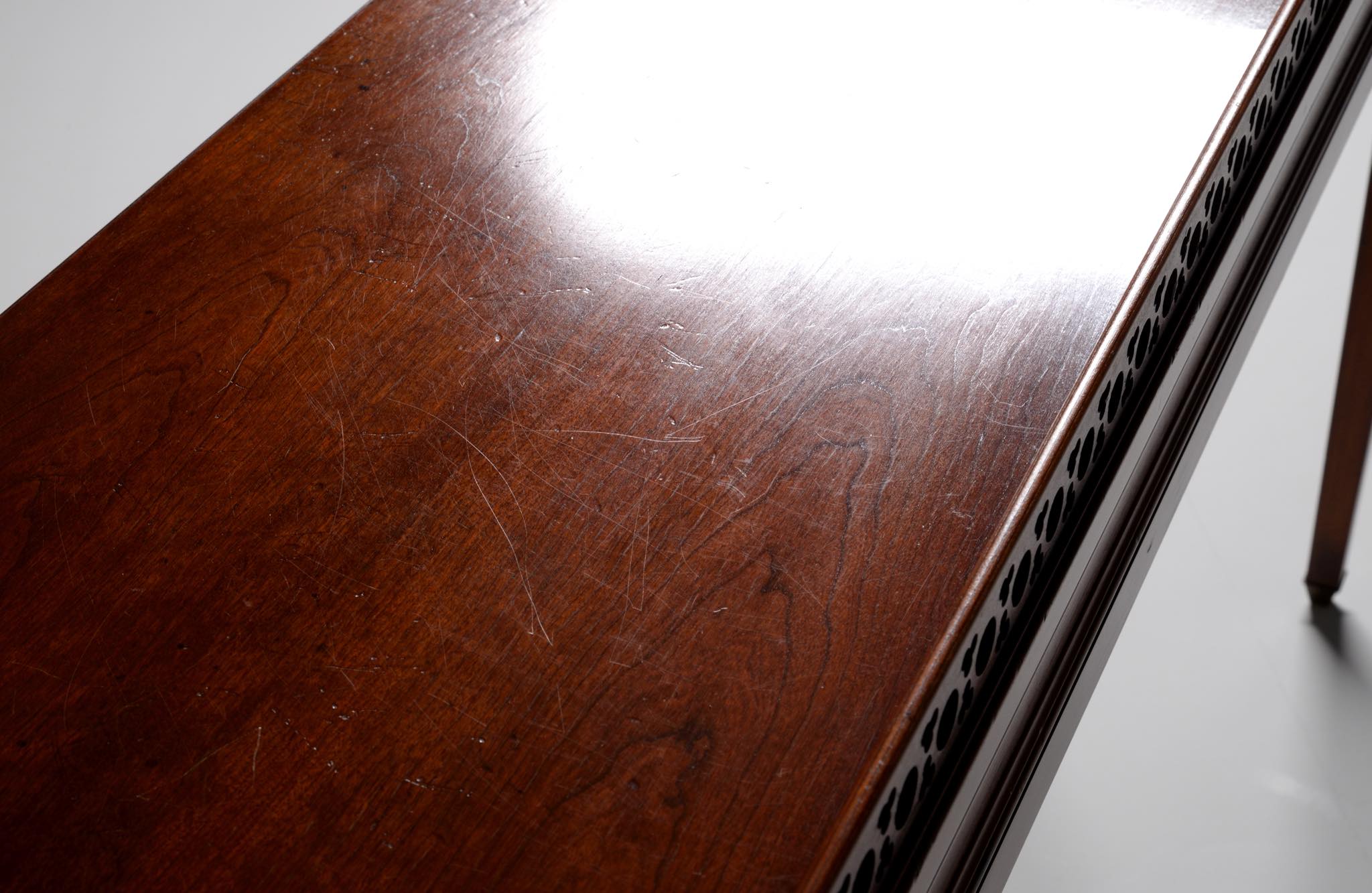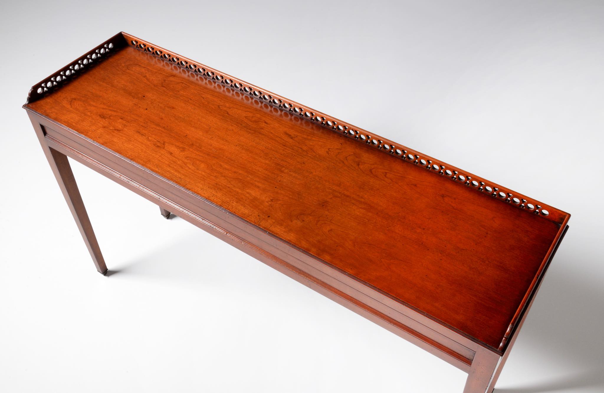 デンマークの家具店、Lysberg Hansen & Therp/リスバーグ・ハンセン&ティアプによって生産、販売されたコンソールテーブルです。1950年代頃に作られたもののようで、マホガニー材と思われる光沢のある材が用いられています。抽斗などはなく、純粋にコンソールとしてのつくりのものです。天板の周囲に設えられたギャラリーバックには丸文様を繋げたような透かし文様が施されています。脚先には真鍮のシューズを履いており、丁寧に作らたものです。フリースタンディングのため、間仕切りとしてもお使いいただけます。天板に古い擦り傷が見られますが、綺麗な状態です。