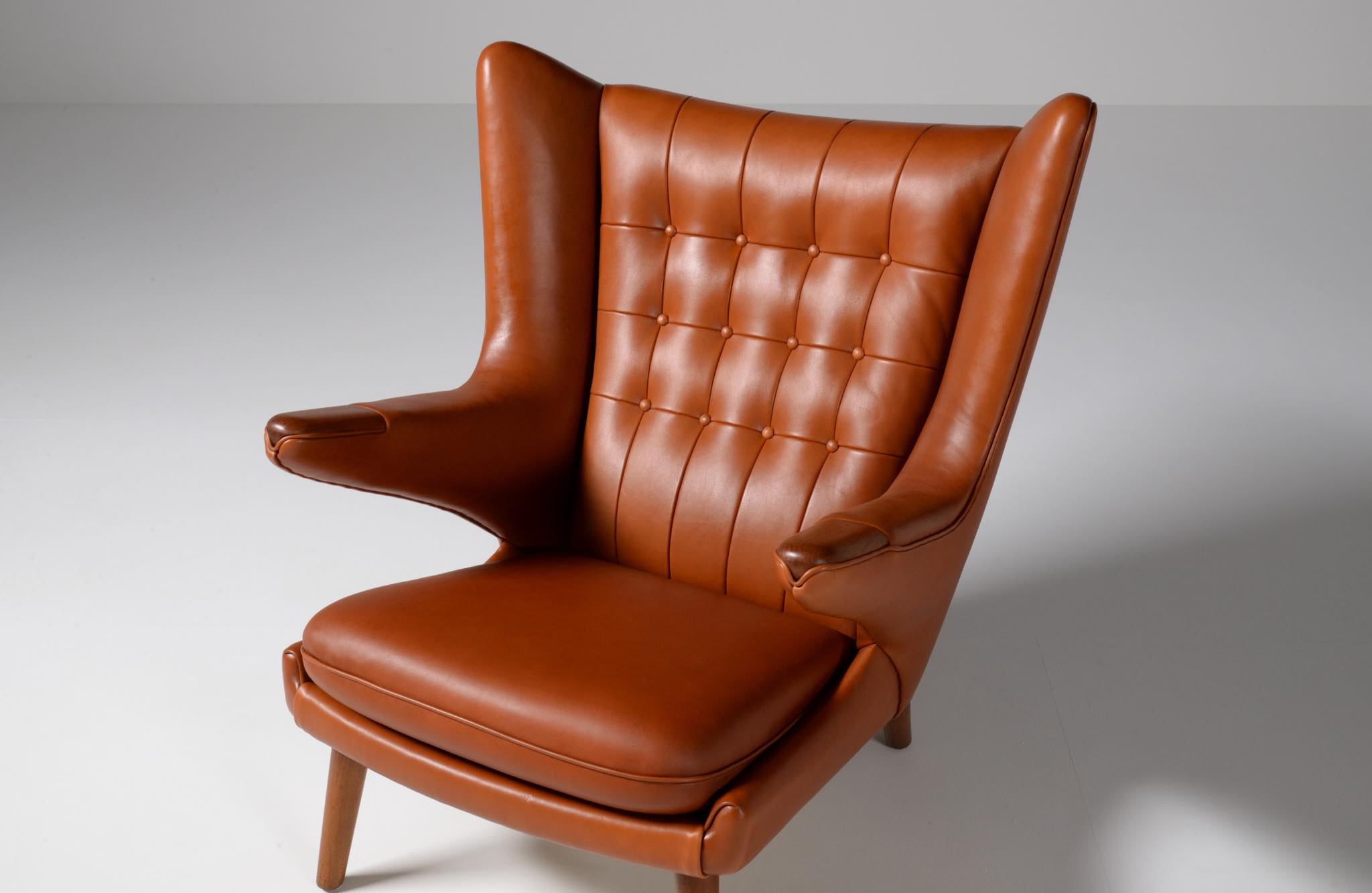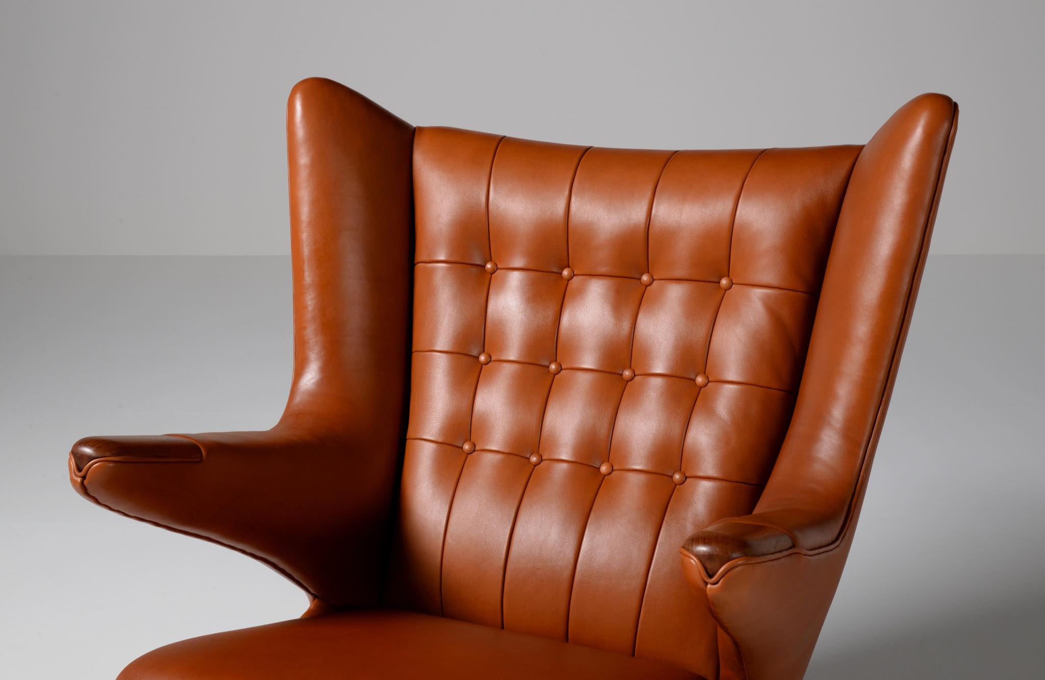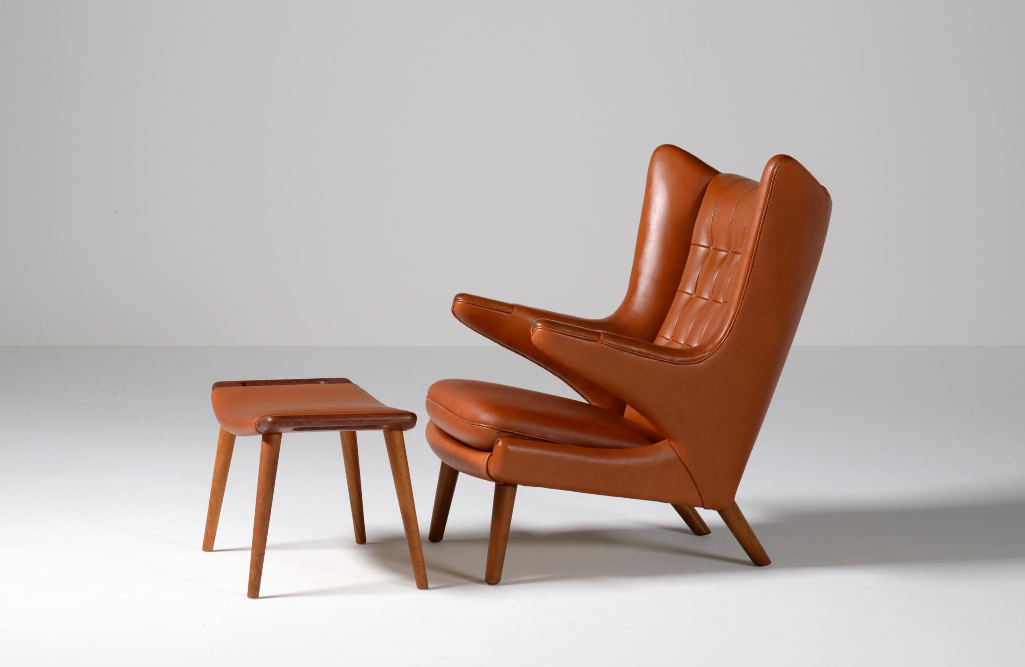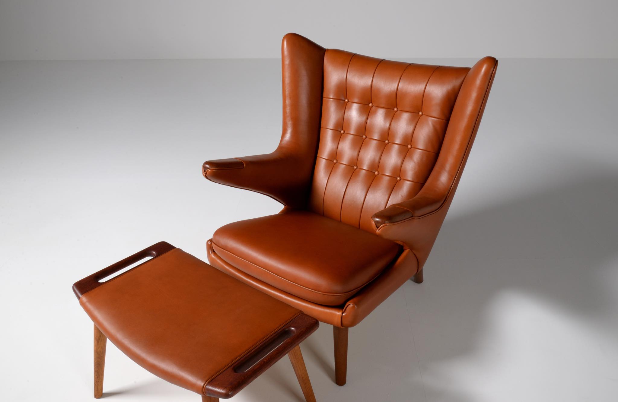 デンマークを代表する家具デザイナー、Hans J. Wegner/ハンス・ウェグナーによる ”パパベア” チェア、フットスツールとのセットです。これらは1950~60年代頃に作られたヴィンテージモデルで、椅子の爪はチーク材、脚はアフロルモシア材、フットスツールのハンドルはステインドのオーク材、脚はナチュラルオーク材が用いられています。皮革は比較的近年に張り替えられ、しばらくショールームの展示用に置かれていたようで、座る機会が少なかったのか使用感少なく綺麗な状態です。こちらは椅子とフットスツールのセット販売となります。