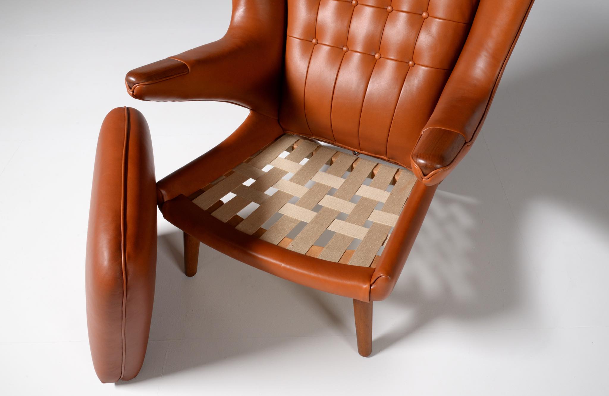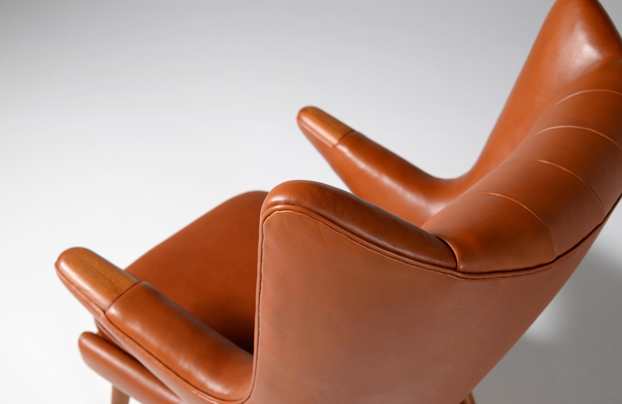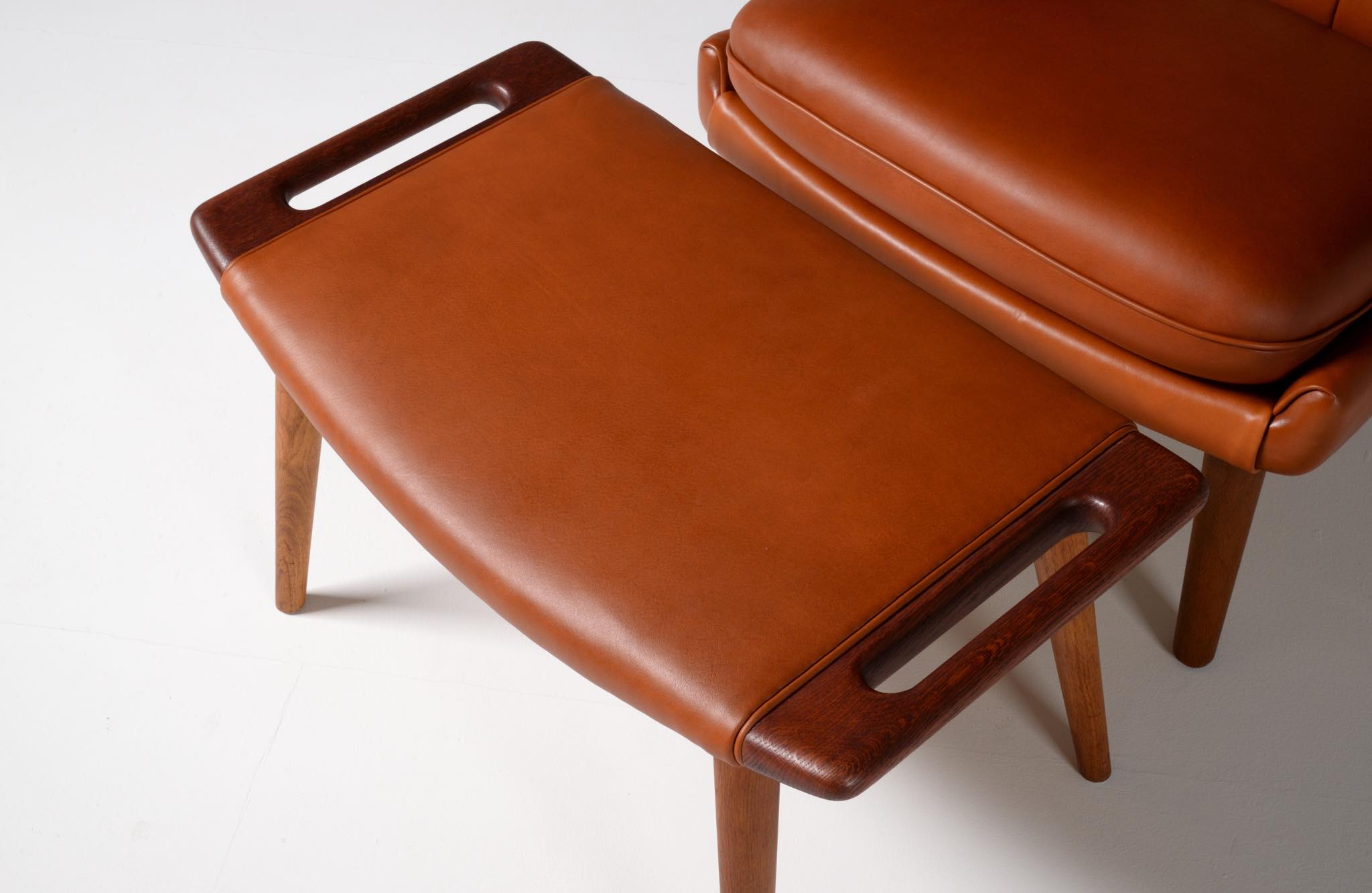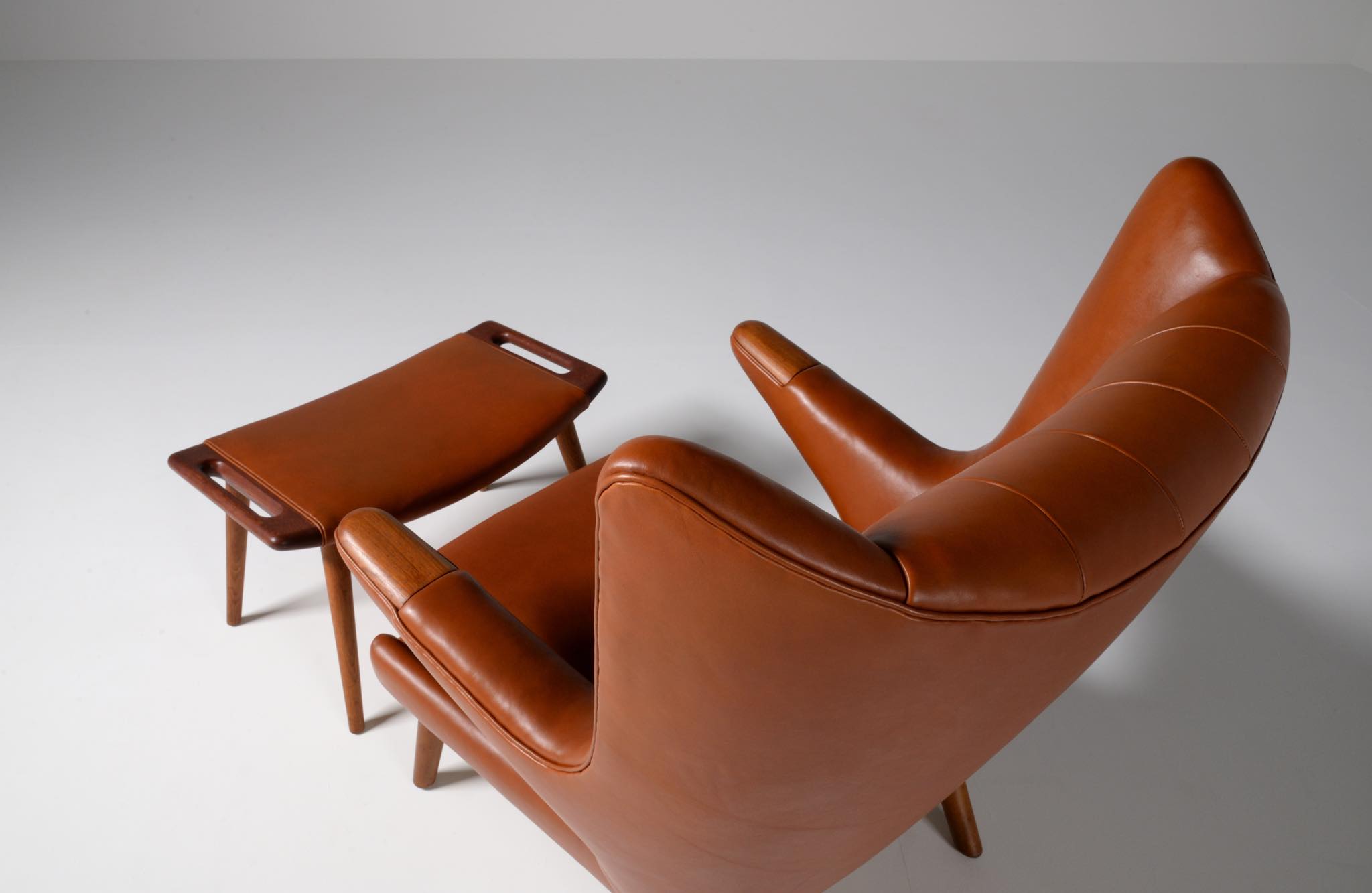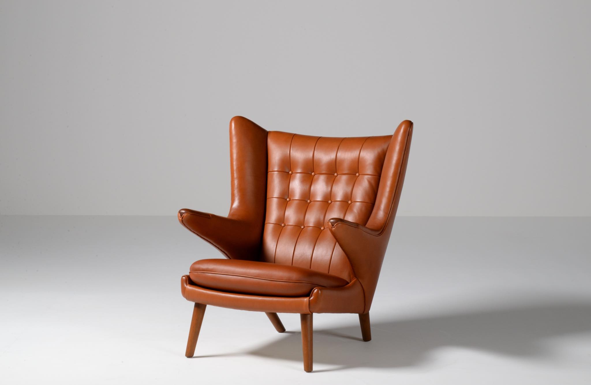 デンマークを代表する家具デザイナー、Hans J. Wegner/ハンス・ウェグナーによる ”パパベア” チェア、フットスツールとのセットです。これらは1950~60年代頃に作られたヴィンテージモデルで、椅子の爪はチーク材、脚はアフロルモシア材、フットスツールのハンドルはステインドのオーク材、脚はナチュラルオーク材が用いられています。皮革は比較的近年に張り替えられ、しばらくショールームの展示用に置かれていたようで、座る機会が少なかったのか使用感少なく綺麗な状態です。こちらは椅子とフットスツールのセット販売となります。