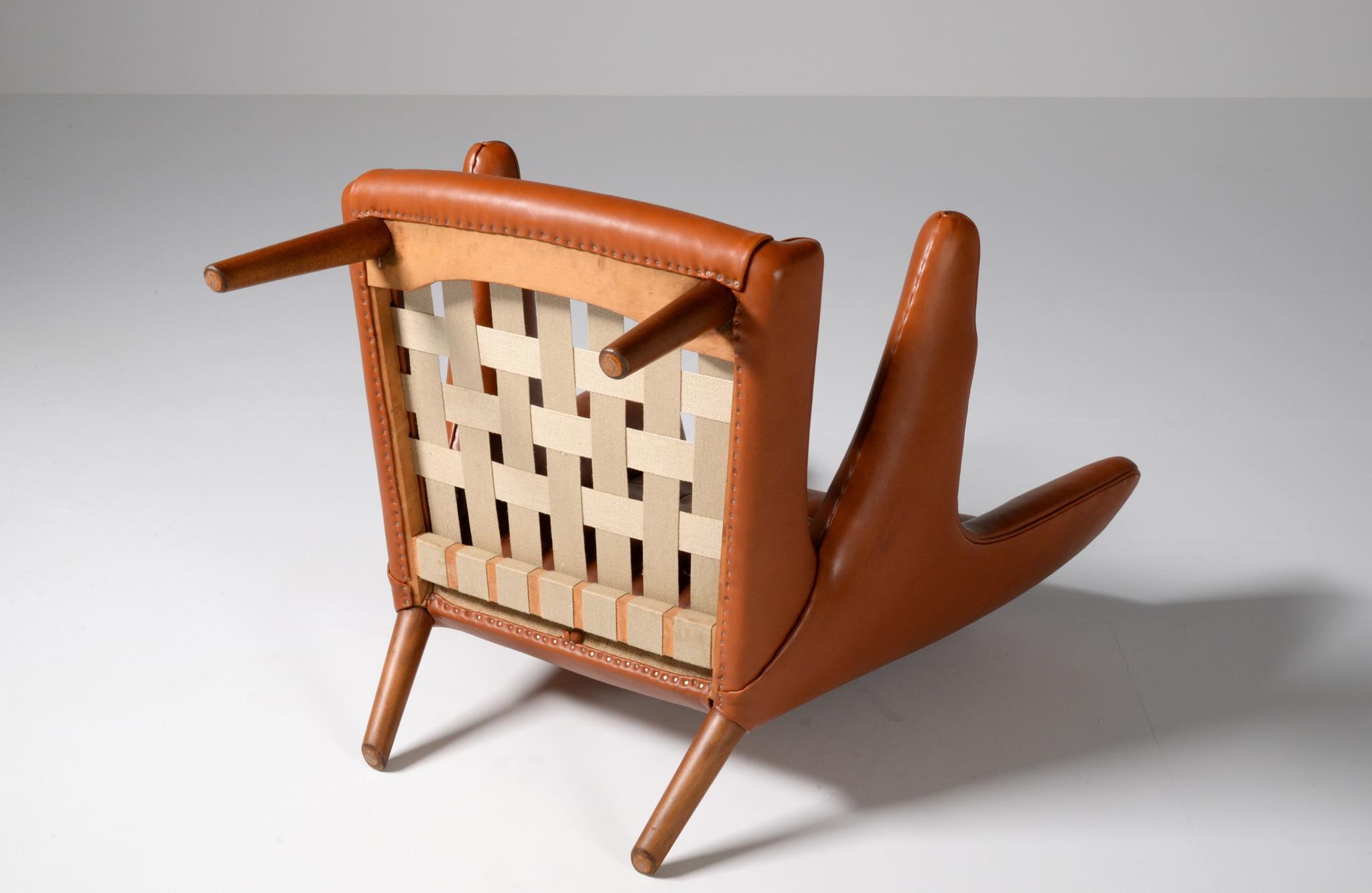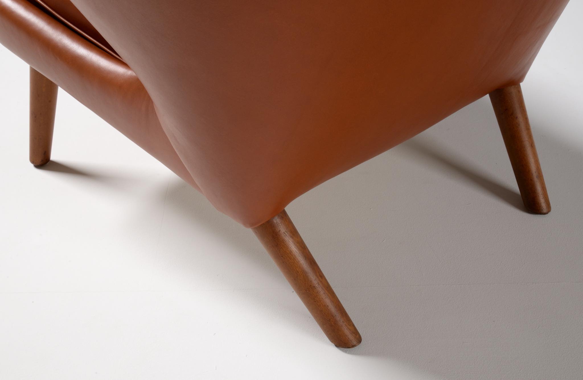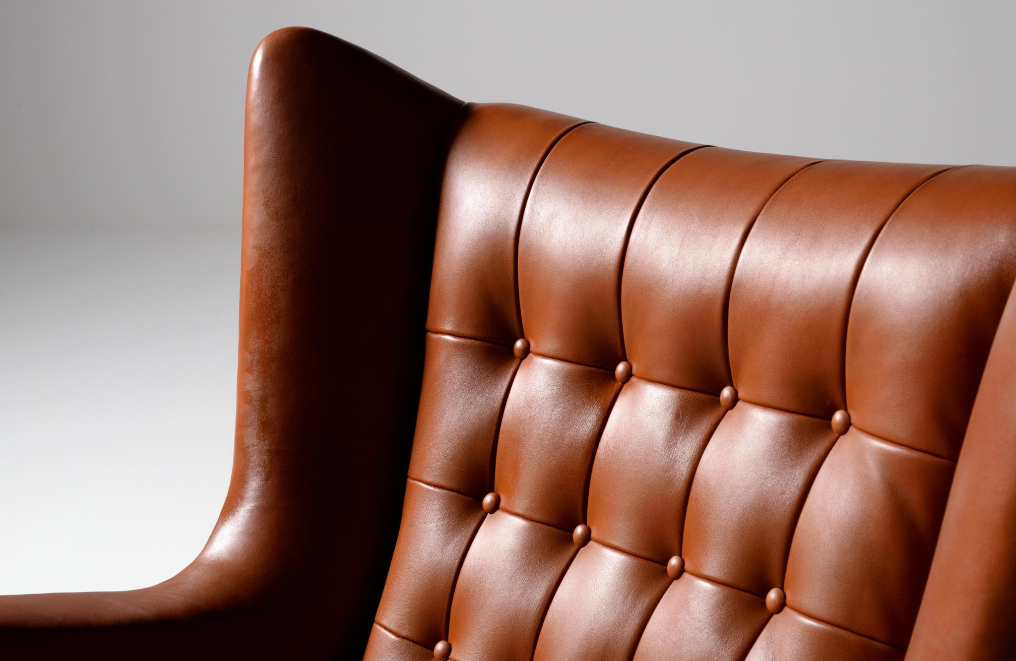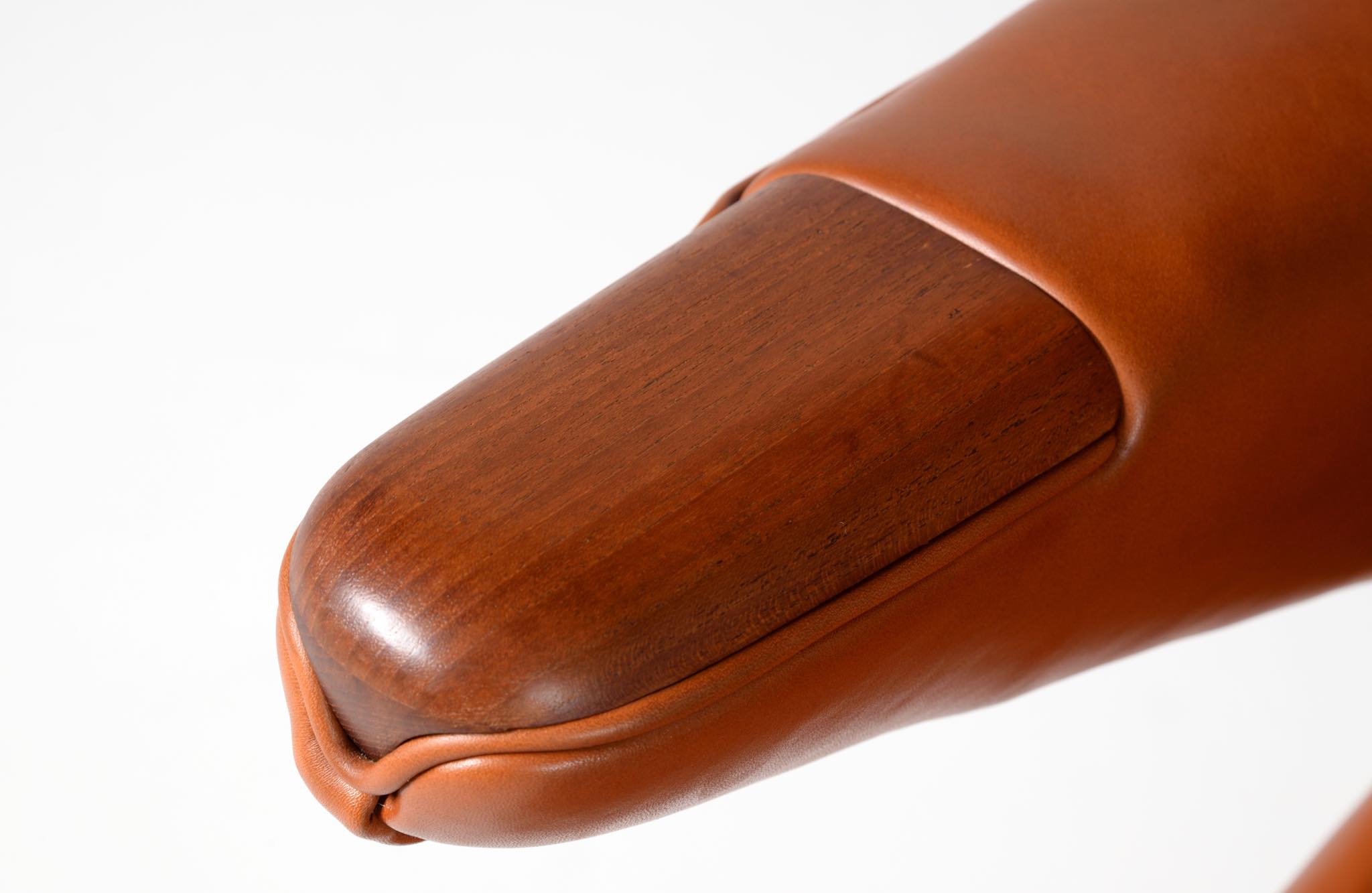 デンマークを代表する家具デザイナー、Hans J. Wegner/ハンス・ウェグナーによる ”パパベア” チェア、フットスツールとのセットです。これらは1950~60年代頃に作られたヴィンテージモデルで、椅子の爪はチーク材、脚はアフロルモシア材、フットスツールのハンドルはステインドのオーク材、脚はナチュラルオーク材が用いられています。皮革は比較的近年に張り替えられ、しばらくショールームの展示用に置かれていたようで、座る機会が少なかったのか使用感少なく綺麗な状態です。こちらは椅子とフットスツールのセット販売となります。