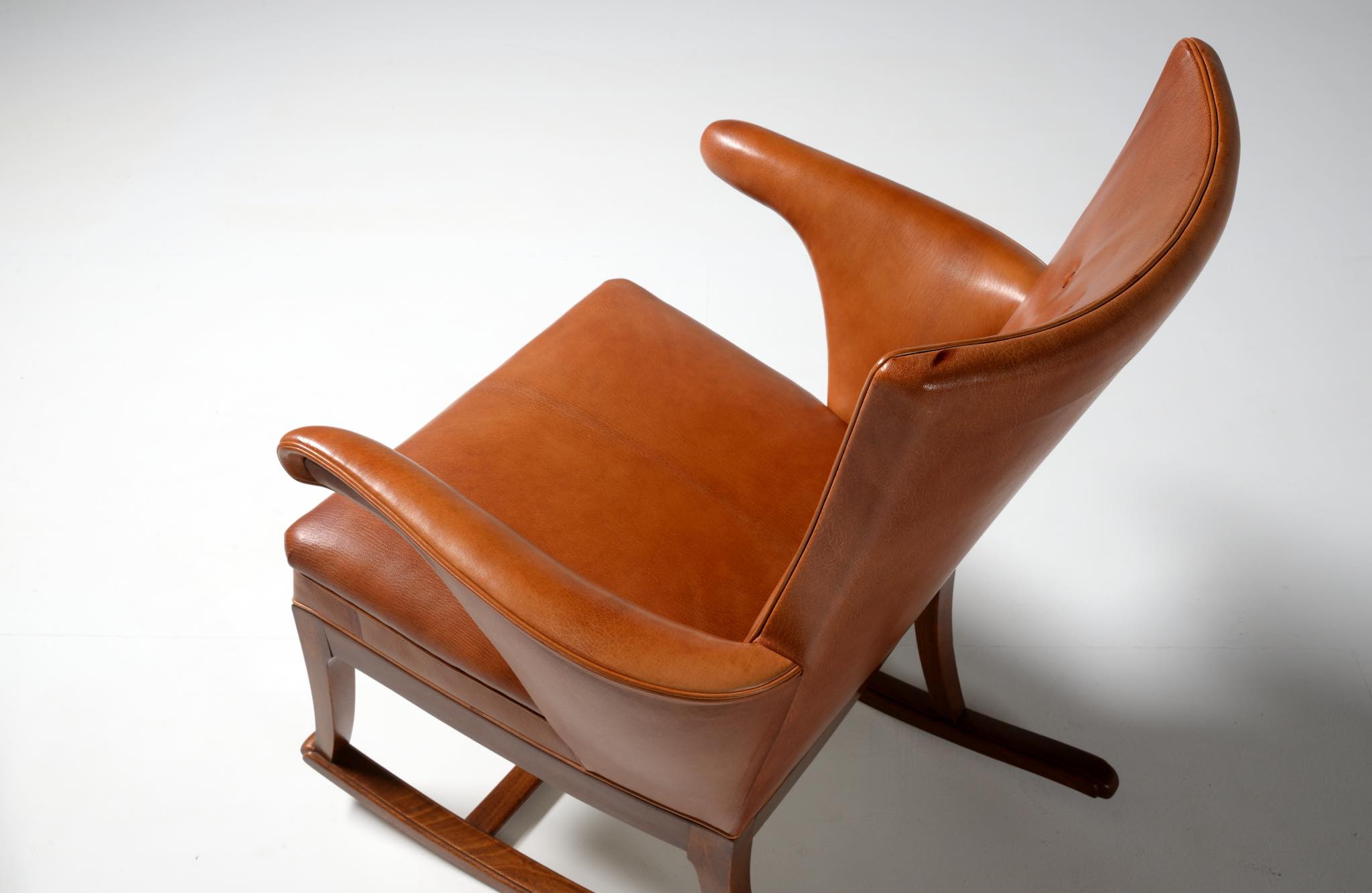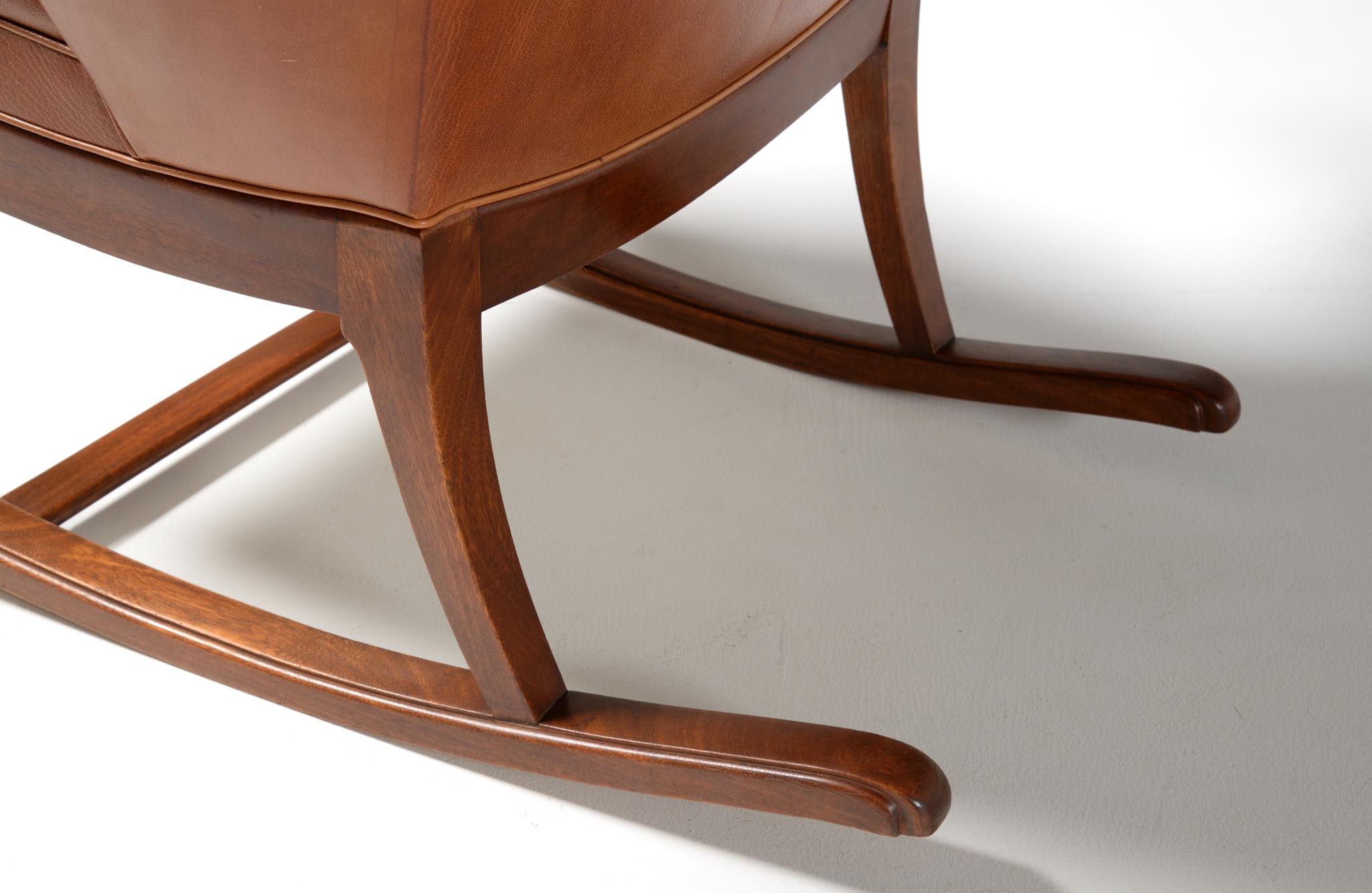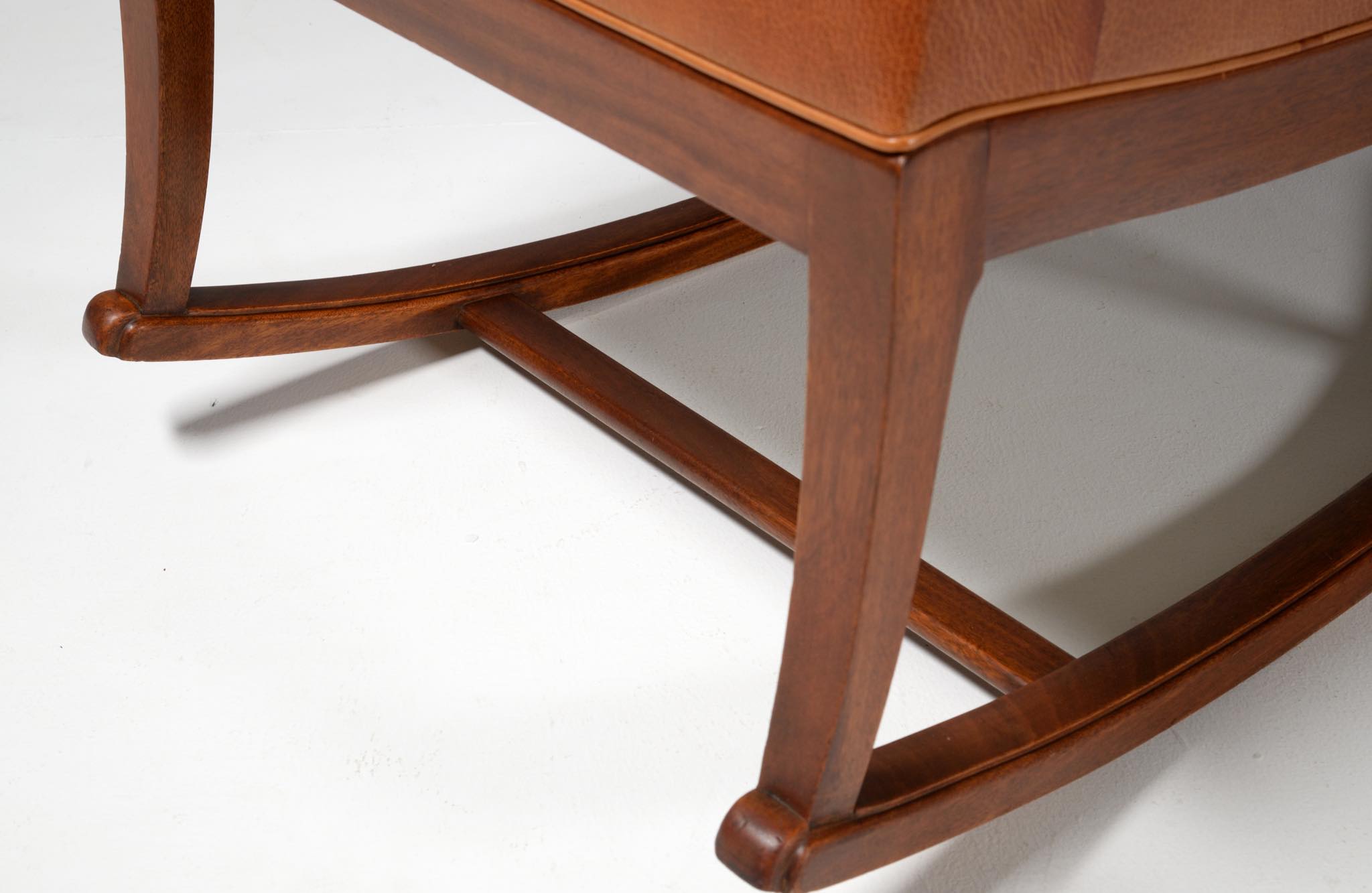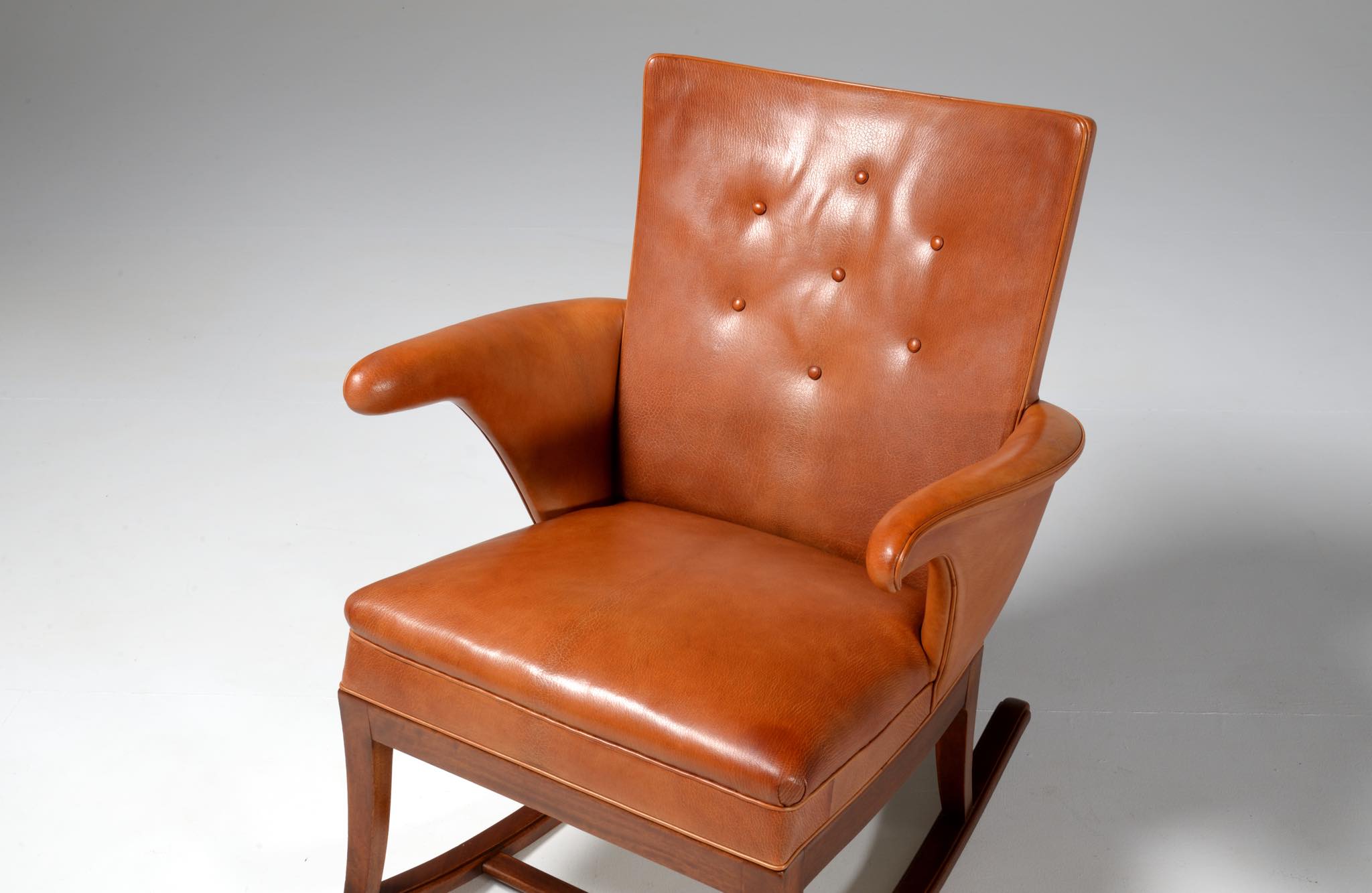 20世紀に於けるデンマーク家具デザインの礎を築いたキャビネットメーカーの Frits Henningsen/フリッツ・ヘニングセンによるロッキングチェアです。1930~40年代頃に作られたものでしょう。かつてデンマークで山羊皮で張り替えられたもので、程よい経年感が魅力です。木部はマホガニー材が用いられており、綺麗な木目が現れています。背もたれに若干のあたり傷が見られますが、とても綺麗な状態です。