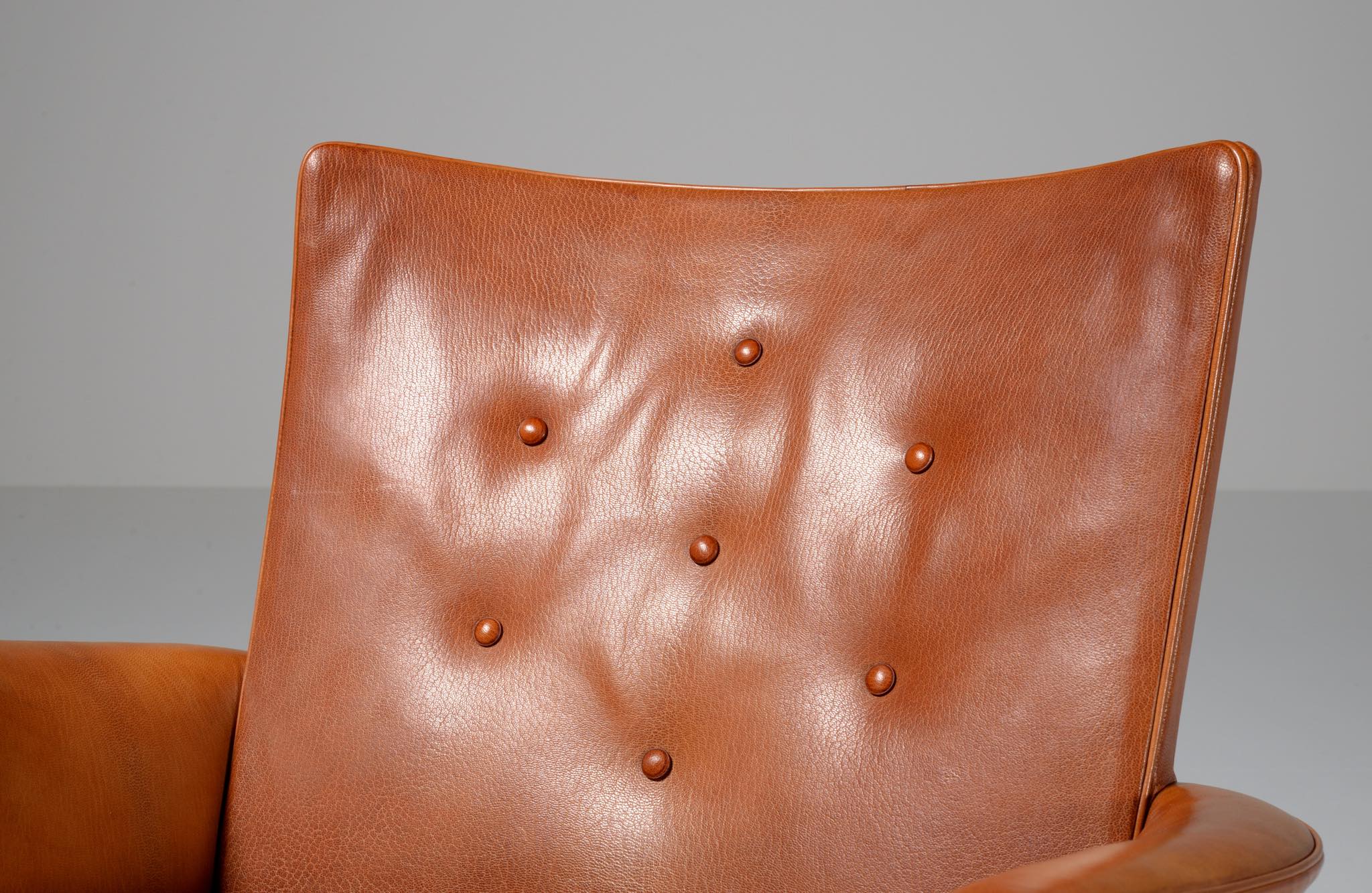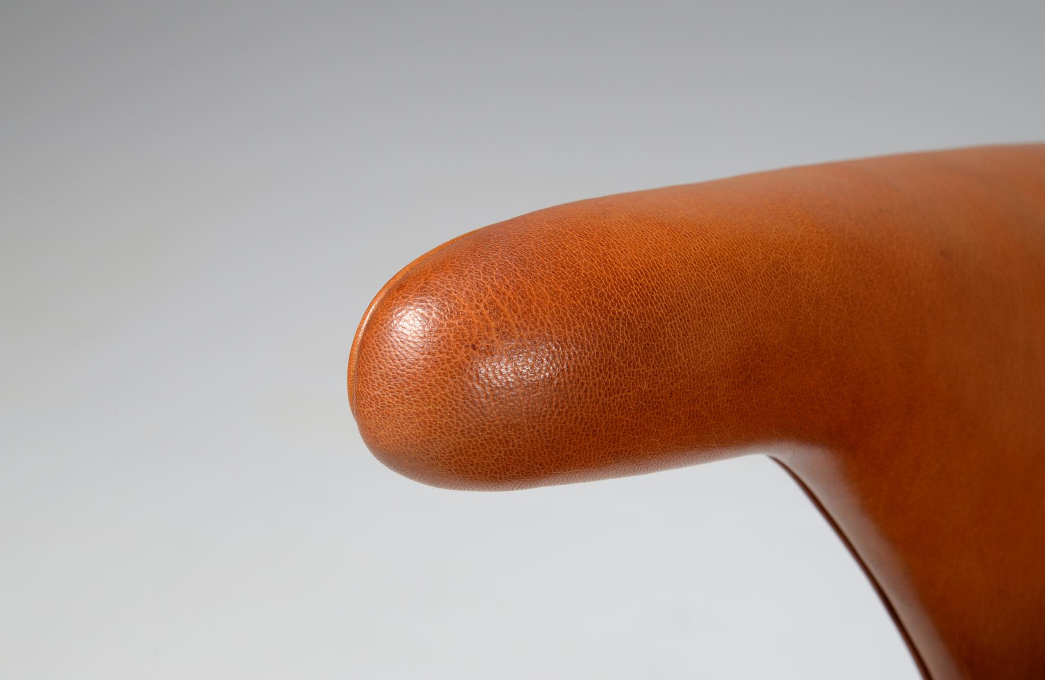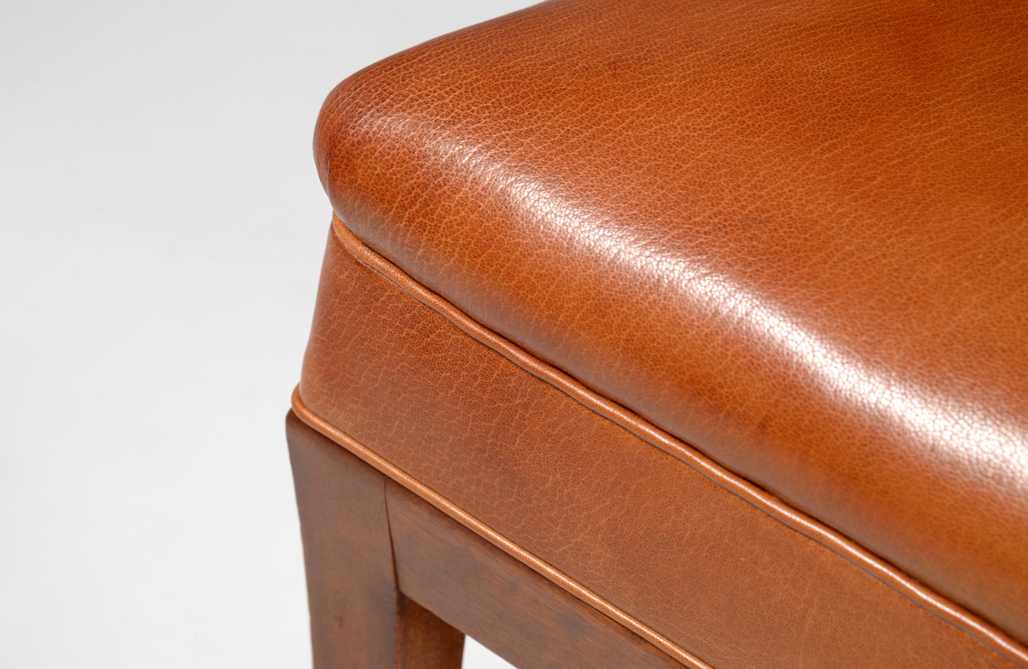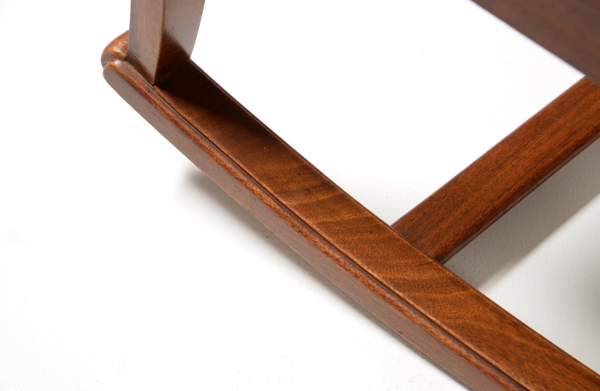 20世紀に於けるデンマーク家具デザインの礎を築いたキャビネットメーカーの Frits Henningsen/フリッツ・ヘニングセンによるロッキングチェアです。1930~40年代頃に作られたものでしょう。かつてデンマークで山羊皮で張り替えられたもので、程よい経年感が魅力です。木部はマホガニー材が用いられており、綺麗な木目が現れています。背もたれに若干のあたり傷が見られますが、とても綺麗な状態です。