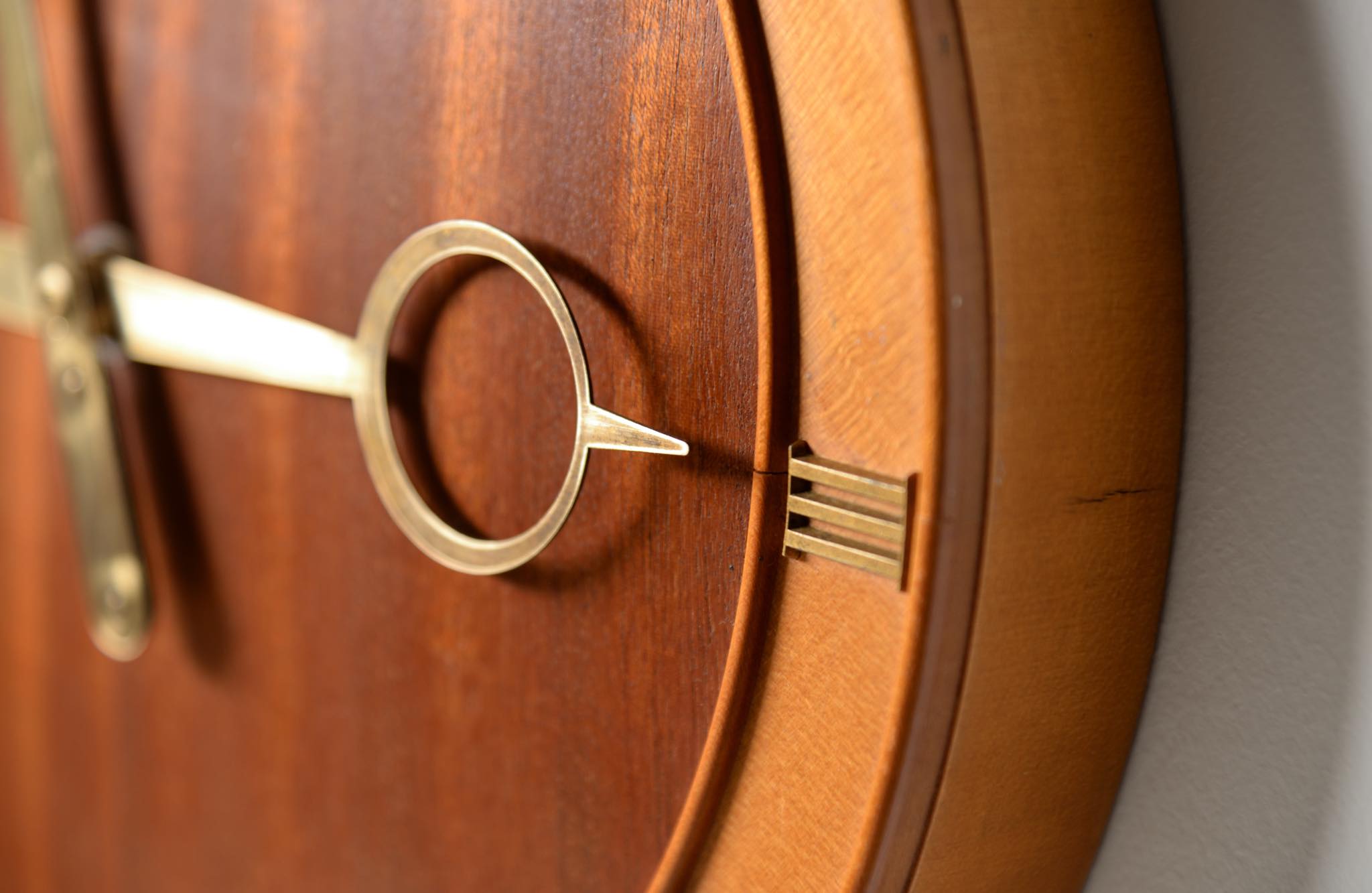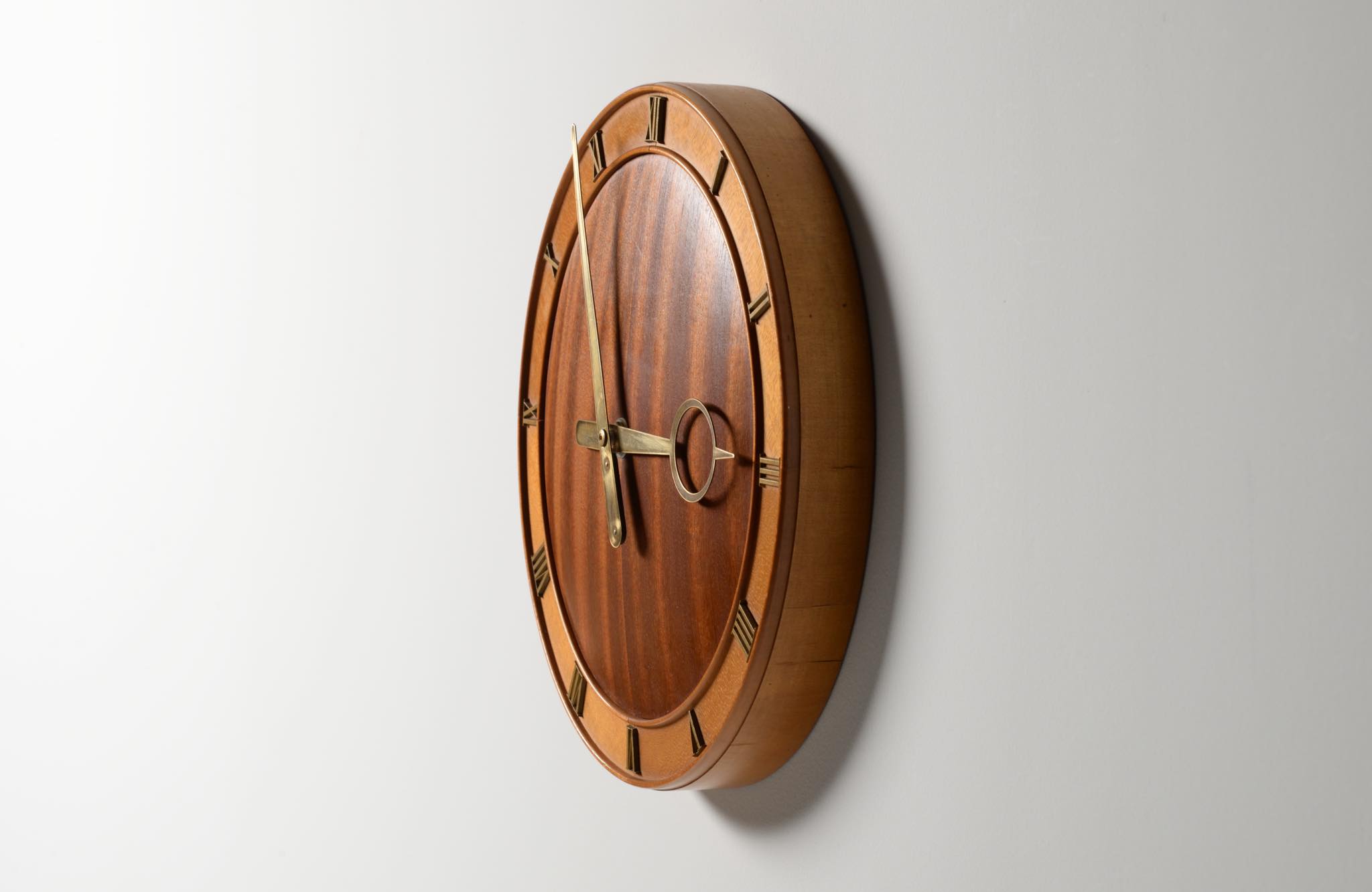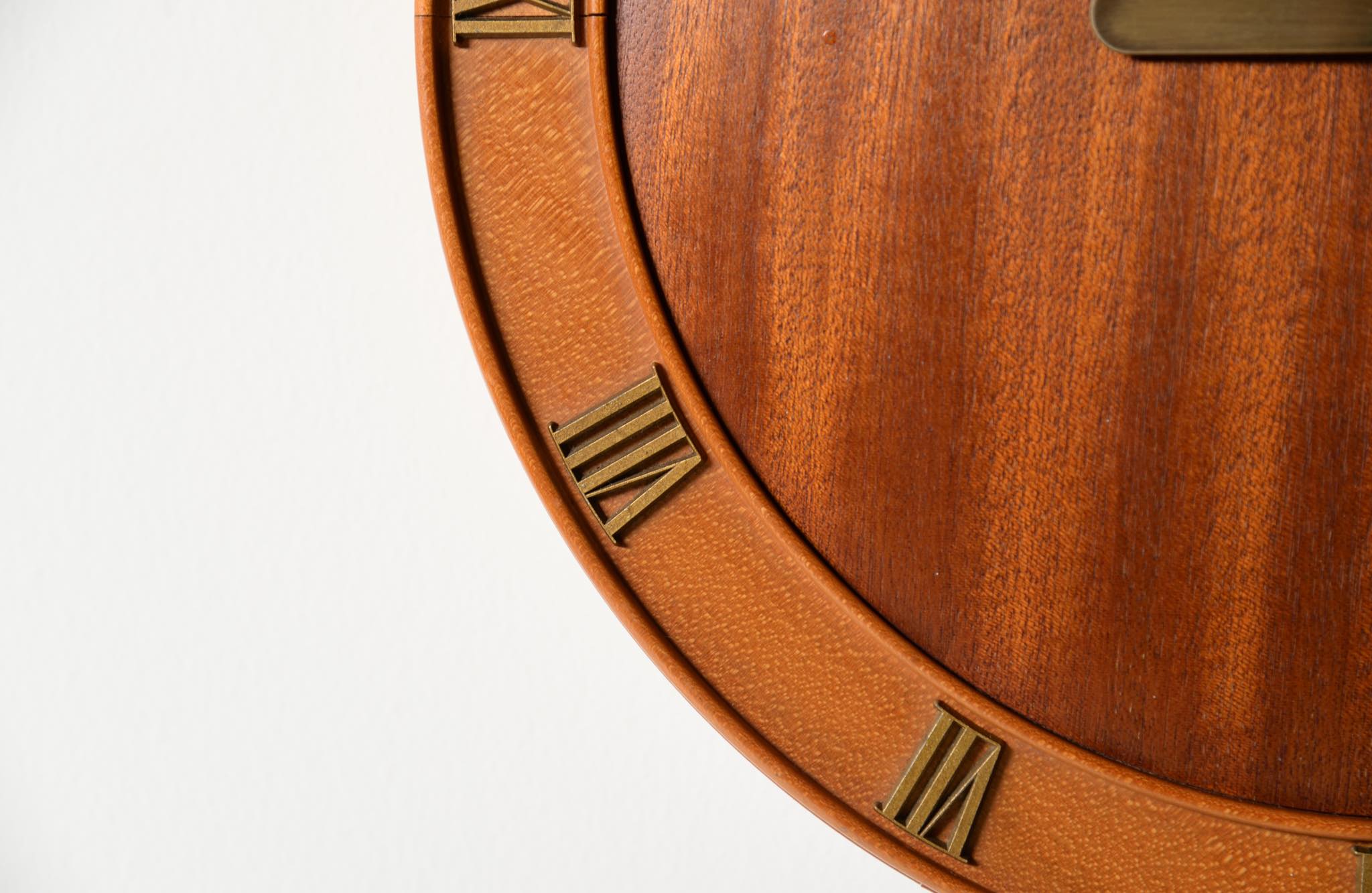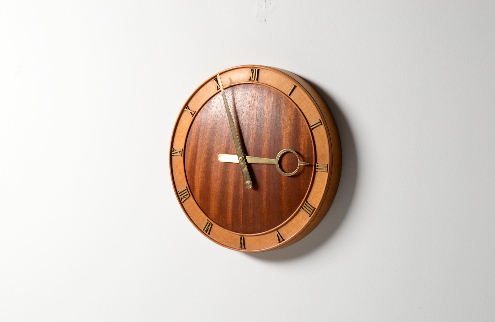 20世紀前葉に活躍したデンマークの建築家、Kaj Gottlob/カイ・ゴットロブによる掛け時計です。1930年代に作られたものでしょう。マホガニー材とバーチ材?とのコンビネーションの本体にブロンズの文字盤と針が備わります。本来ならば電気式ですが、壊れていたため電池式のムーブメントに変えました。よって正確に動いています。分針の軸に二つの凸があり、その周囲が円周状に擦れているようですが、その原因や理由はわかりません。