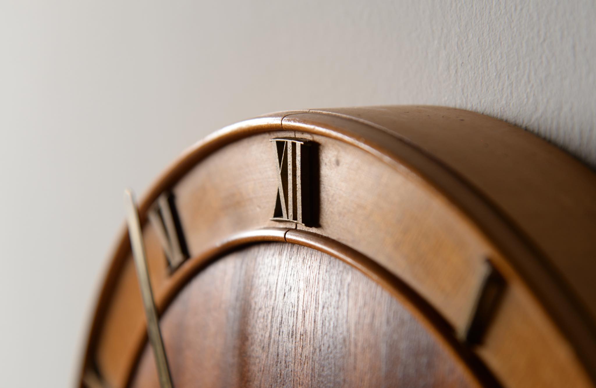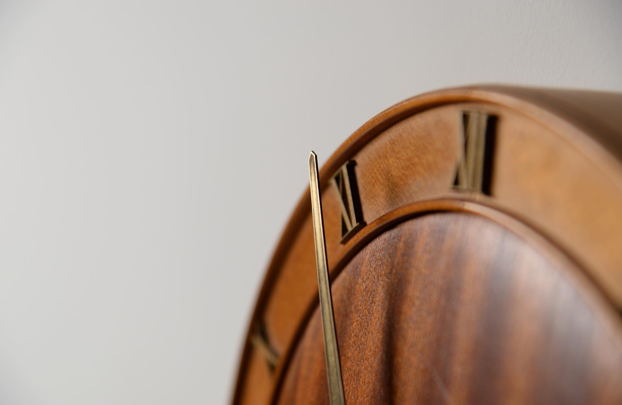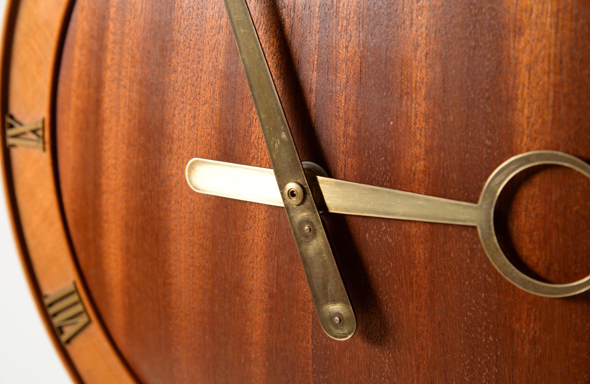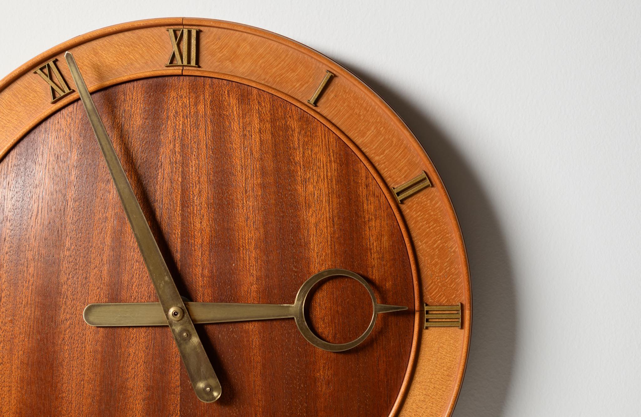 20世紀前葉に活躍したデンマークの建築家、Kaj Gottlob/カイ・ゴットロブによる掛け時計です。1930年代に作られたものでしょう。マホガニー材とバーチ材?とのコンビネーションの本体にブロンズの文字盤と針が備わります。本来ならば電気式ですが、壊れていたため電池式のムーブメントに変えました。よって正確に動いています。分針の軸に二つの凸があり、その周囲が円周状に擦れているようですが、その原因や理由はわかりません。