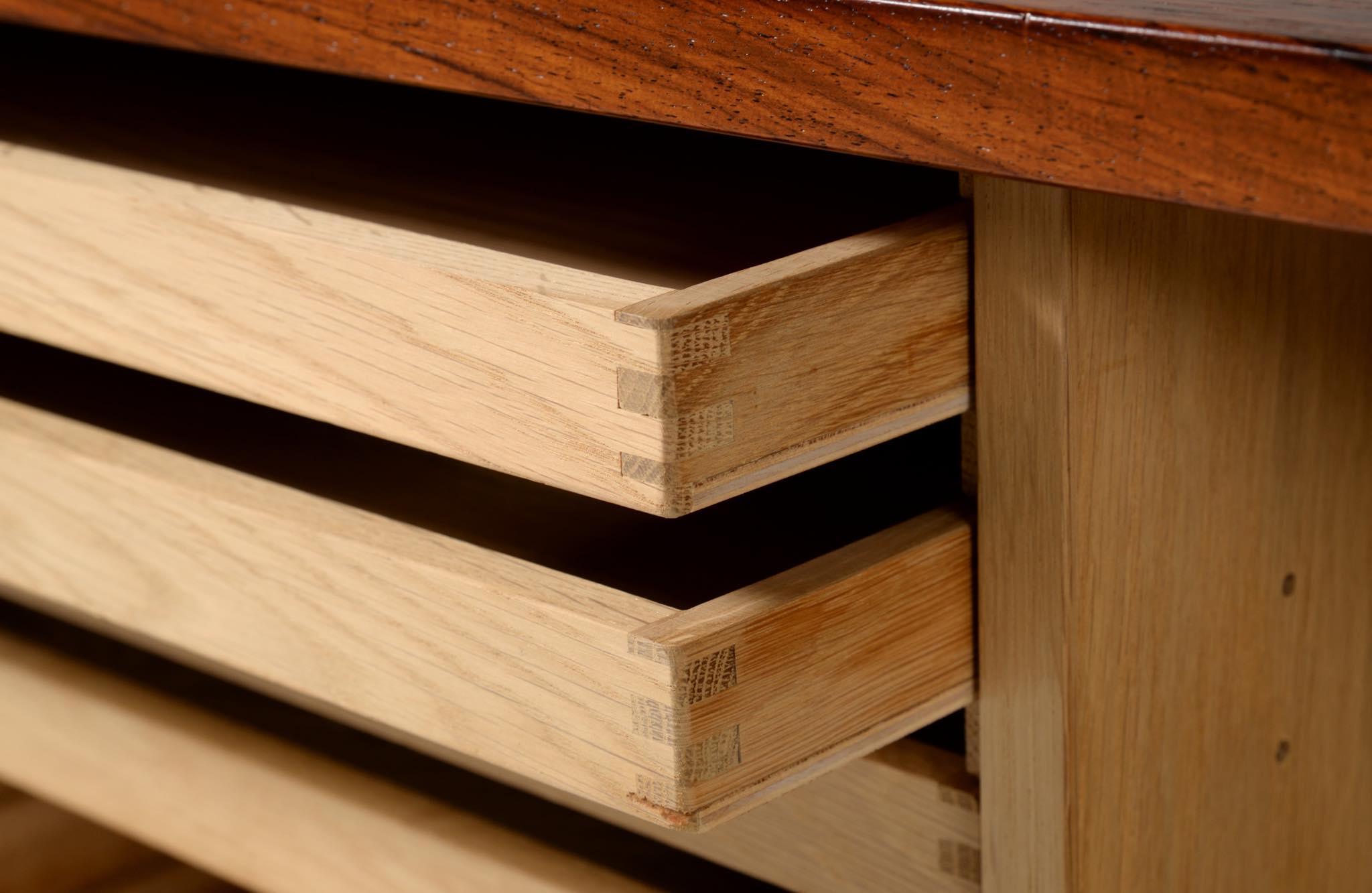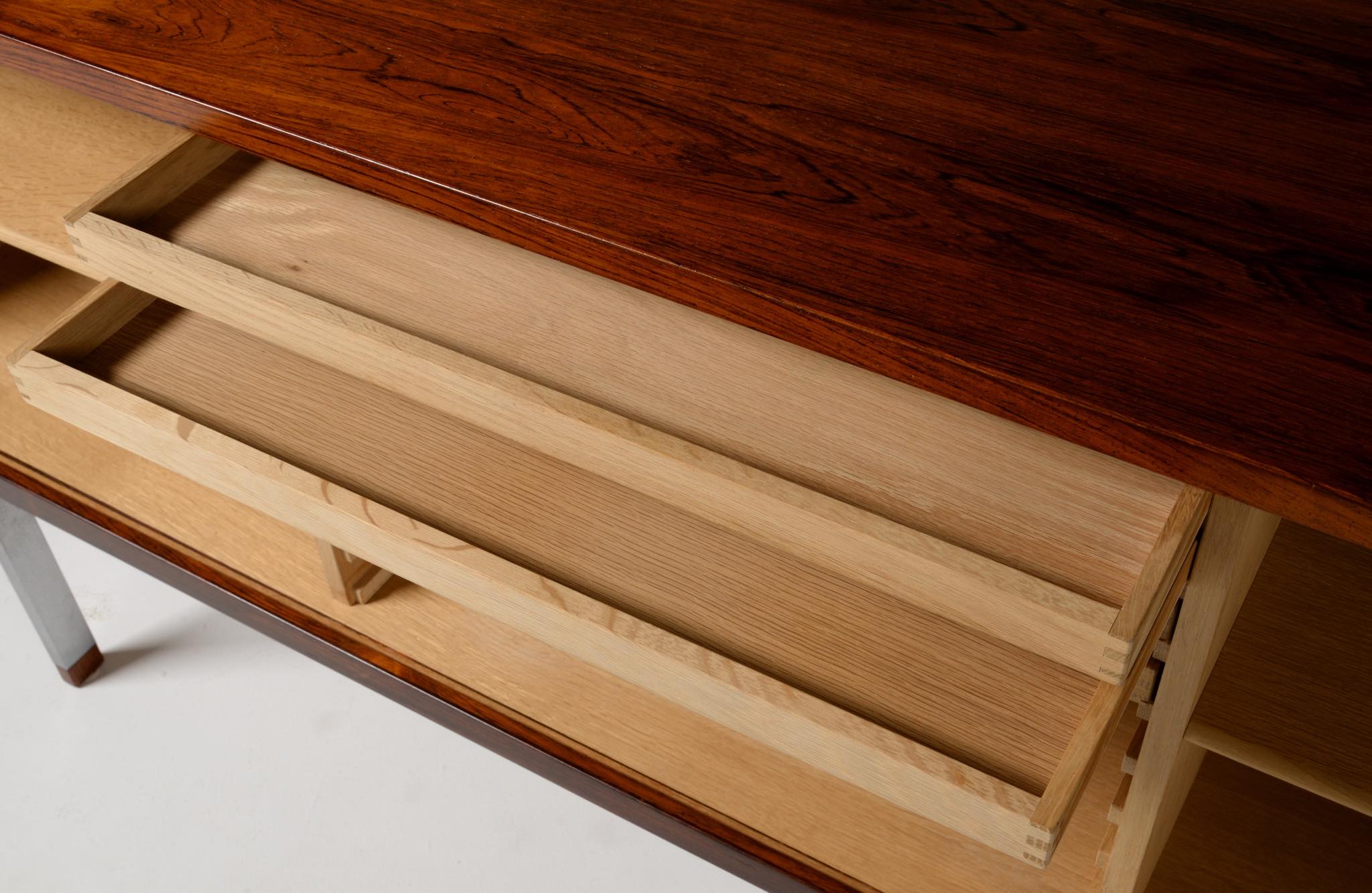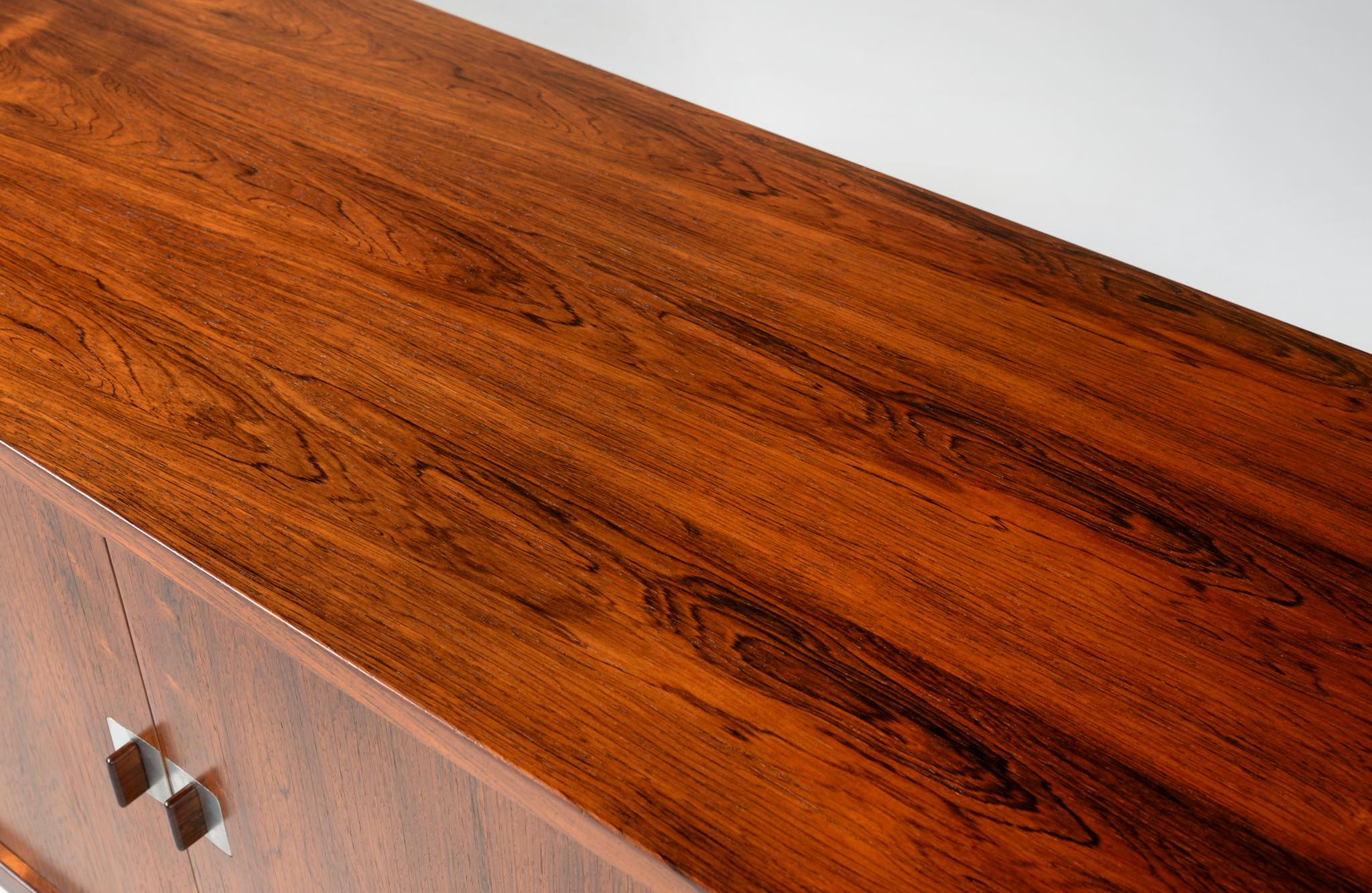 Hans J. Wegner/ハンス・ウェグナーによる RY25サイドボードキャビネット、ローズウッド材のタイプです。扉にはタンブールドアと称される蛇腹式で開閉する引戸を備えており、20世紀のデンマーク家具工芸の素晴らしさを垣間見ることができます。木取りも良く、コンディションは良好です。