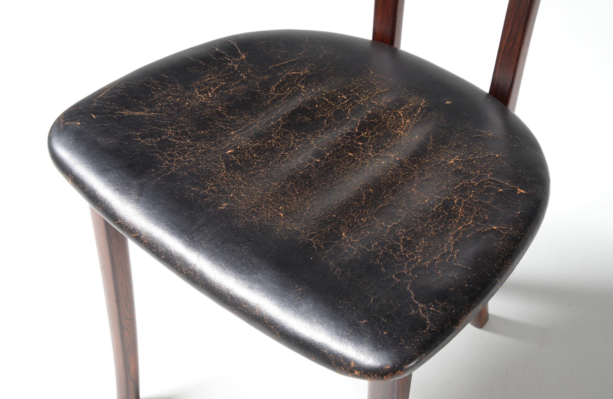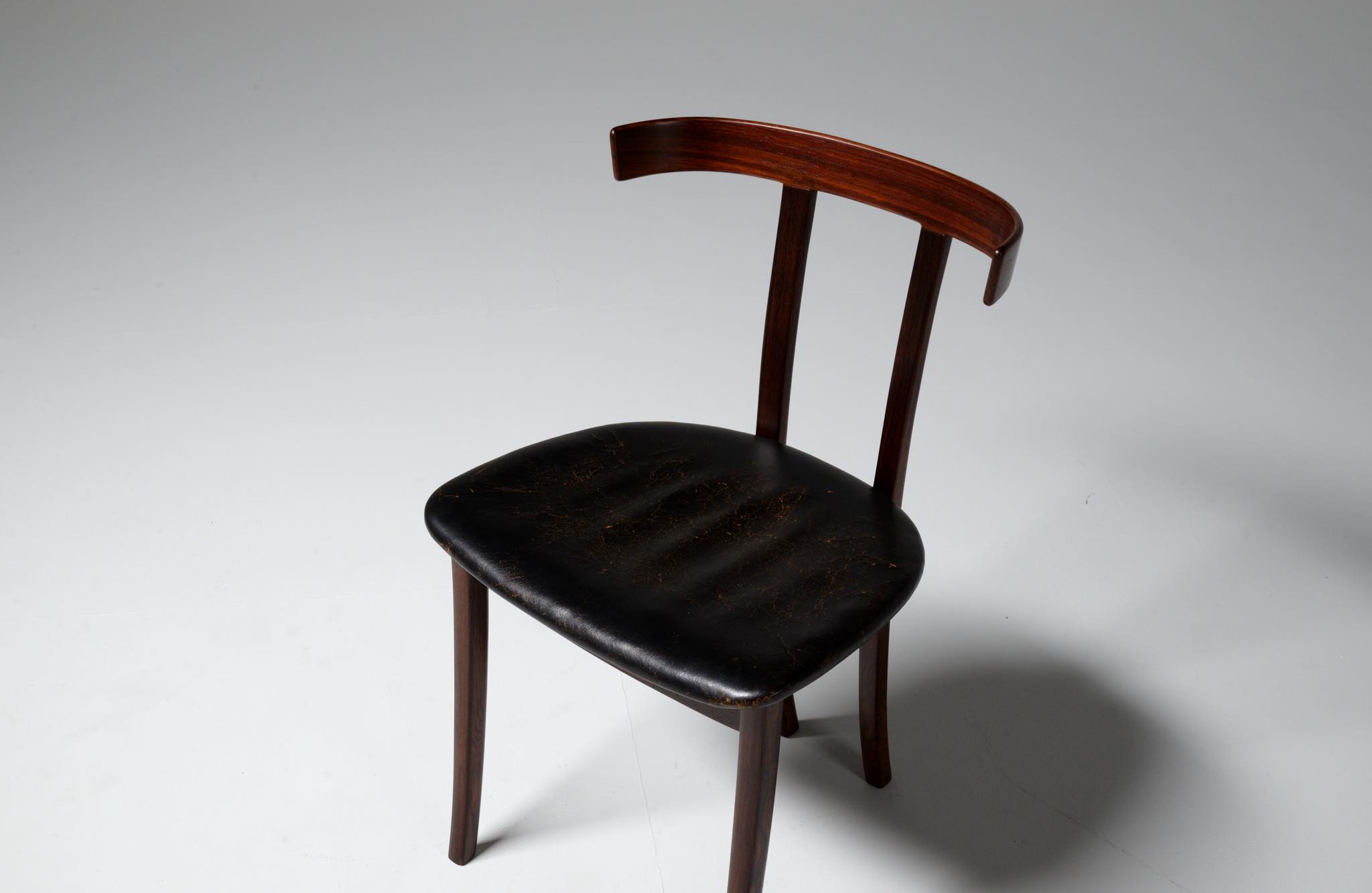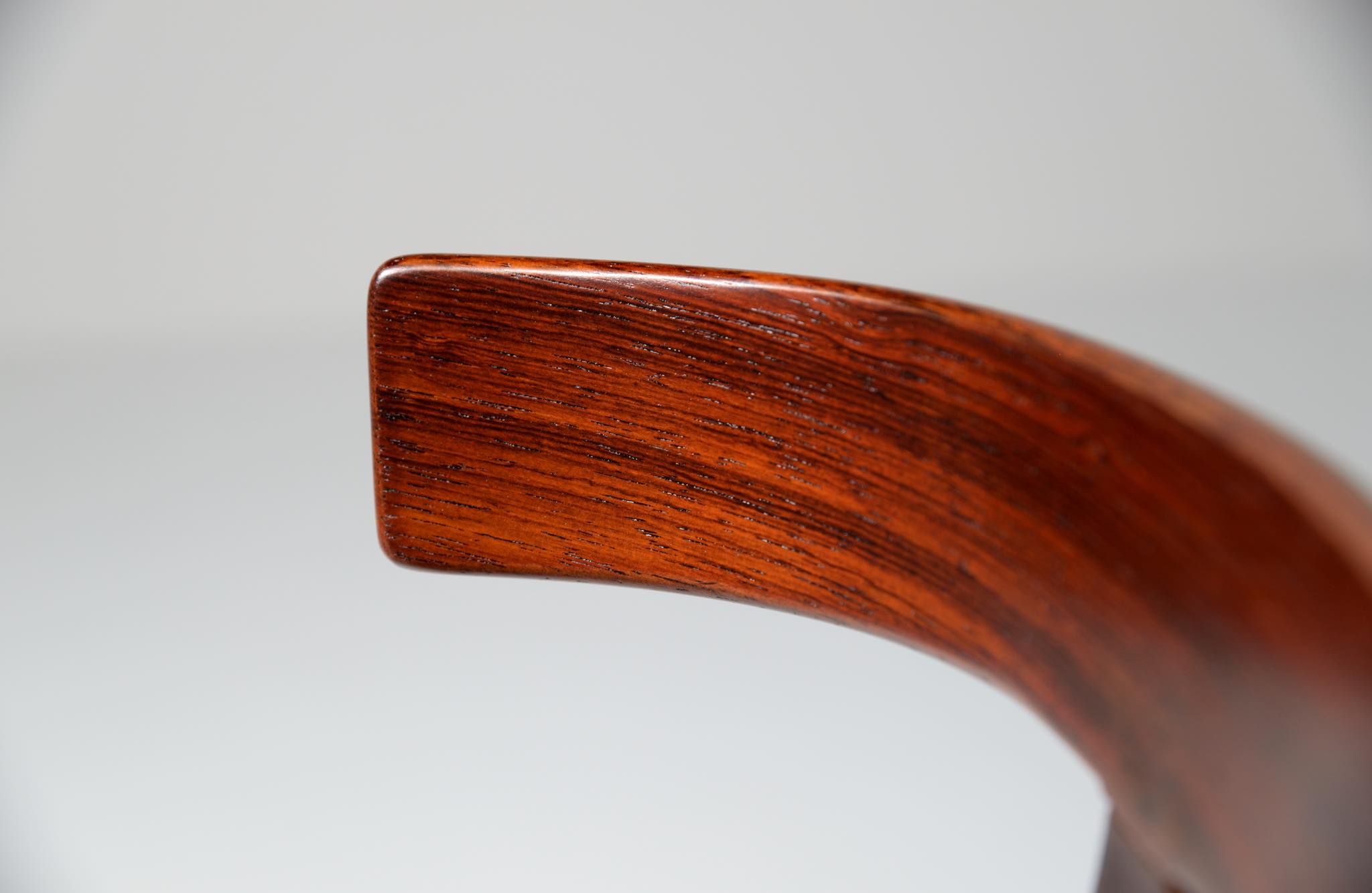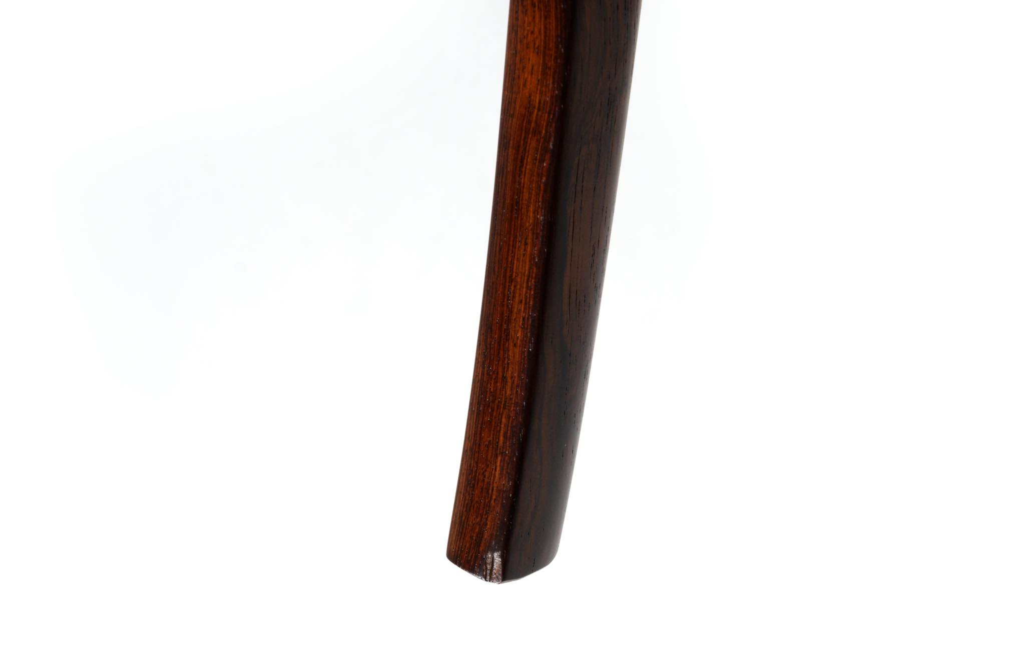デンマークを代表する家具デザイナー、Ole Wanscher/オーレ・ヴァンシャーによる"T-chair"です。ヴァンシャーの良質なプロダクトを手がけた名工 A.J.イヴァーセン工房によって作られたもので、T-chairは1957年に発表され、改良を重ね全部で4種類ほどあると云われています。1957年のモデルは笠木と後脚を縦軸に接合しており、このタイプは2003年にオーレ・ヴァンシャー生誕100歳を記念して P. Jeppesen社より限定で復刻生産されています。また現在ではCarl Hansen & Son社にて同じく1957年タイプが復刻生産されています。こちらは1961年に発表されたモデルで、大きく湾曲した笠木を横軸で後脚に留めた構造が特徴で、素材にはブラジリアンローズウッドが用いられています。笠木の一部にダメージが見られたため補修しています。シートはオリジナルの状態を留めています。