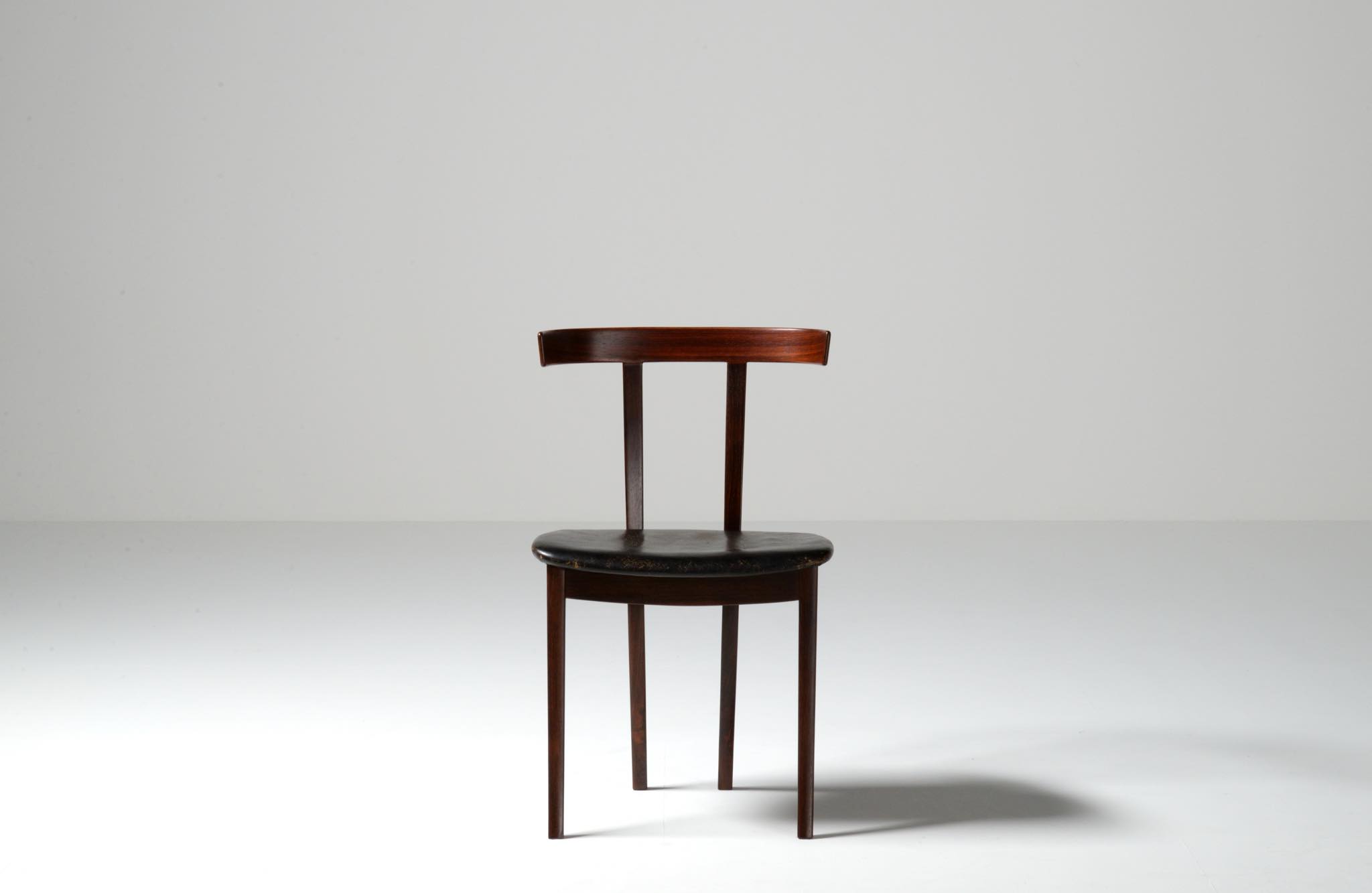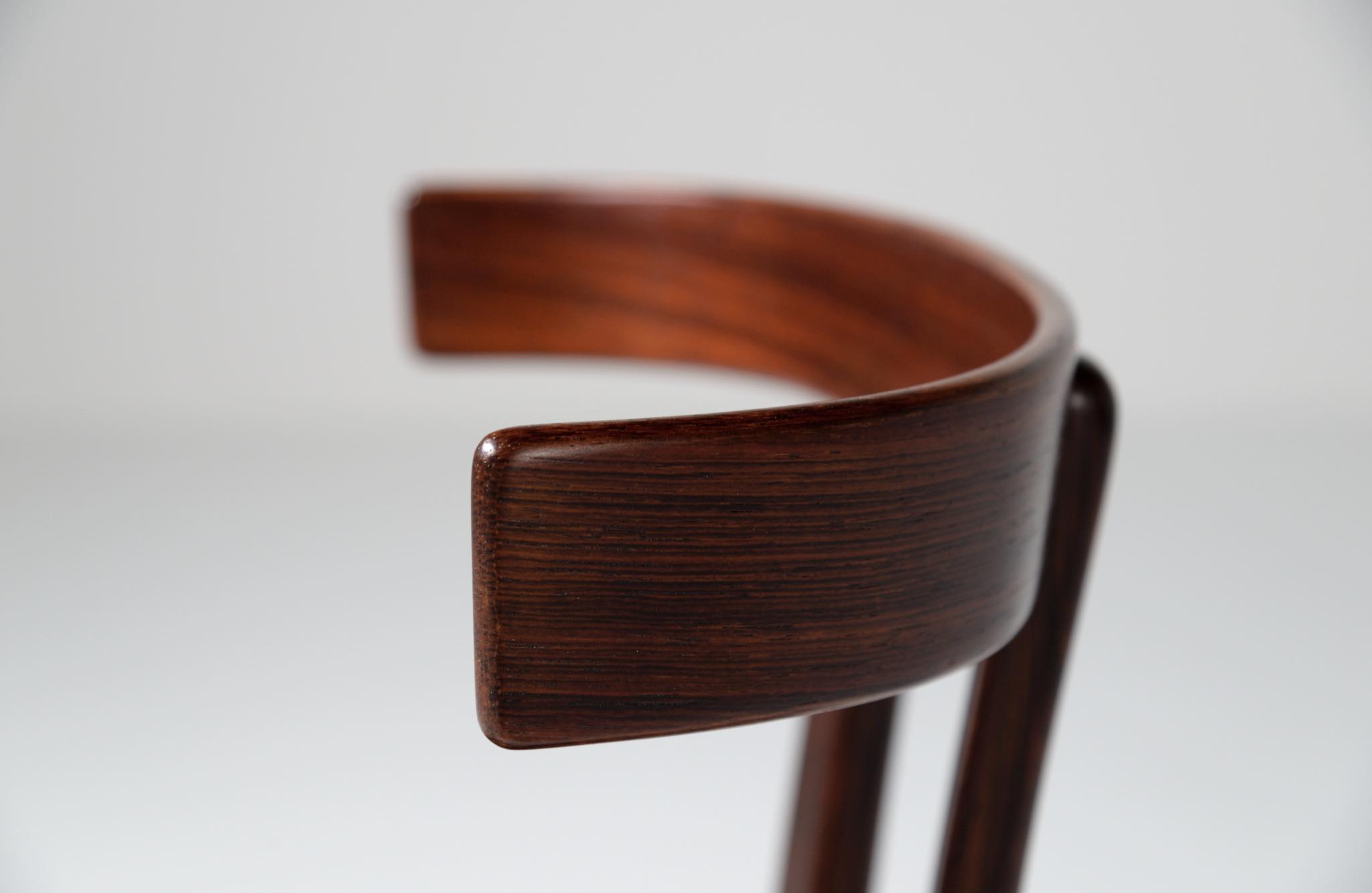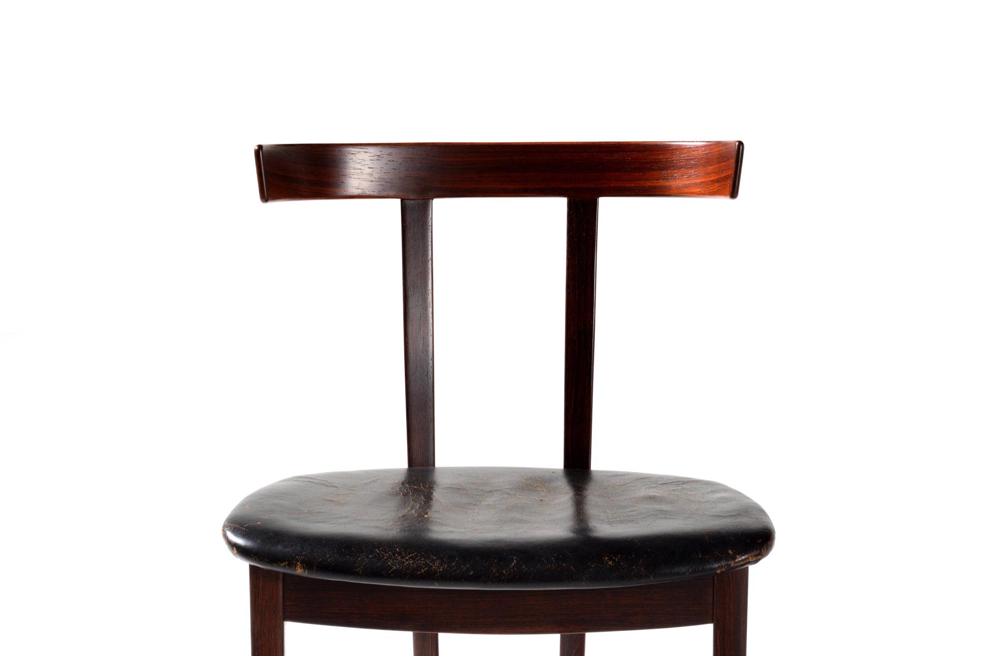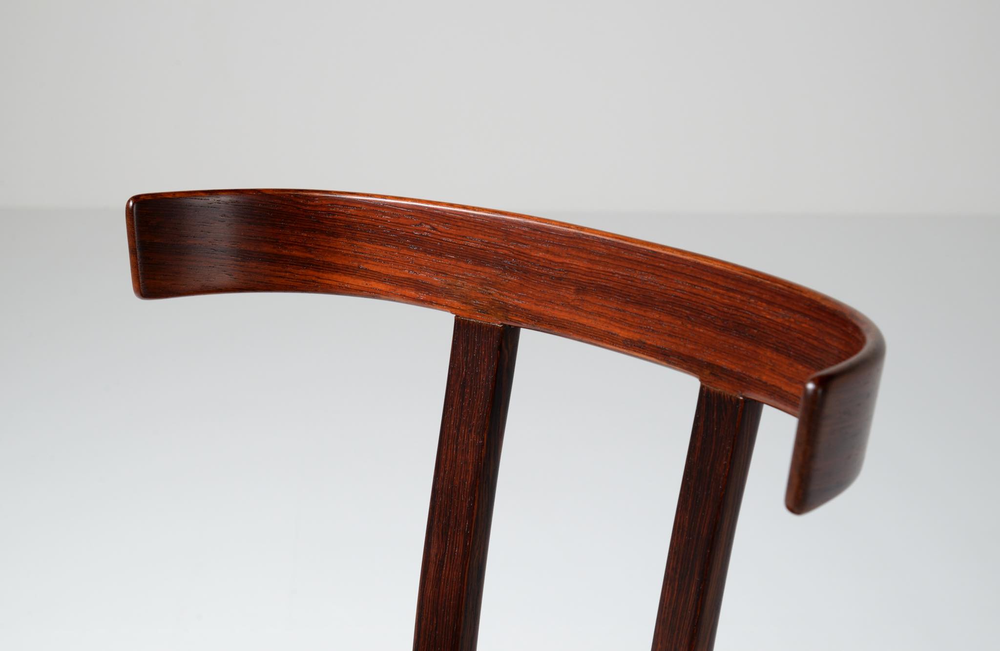 デンマークを代表する家具デザイナー、Ole Wanscher/オーレ・ヴァンシャーによる"T-chair"です。ヴァンシャーの良質なプロダクトを手がけた名工 A.J.イヴァーセン工房によって作られたもので、T-chairは1957年に発表され、改良を重ね全部で4種類ほどあると云われています。1957年のモデルは笠木と後脚を縦軸に接合しており、このタイプは2003年にオーレ・ヴァンシャー生誕100歳を記念して P. Jeppesen社より限定で復刻生産されています。また現在ではCarl Hansen & Son社にて同じく1957年タイプが復刻生産されています。こちらは1961年に発表されたモデルで、大きく湾曲した笠木を横軸で後脚に留めた構造が特徴で、素材にはブラジリアンローズウッドが用いられています。笠木の一部にダメージが見られたため補修しています。シートはオリジナルの状態を留めています。