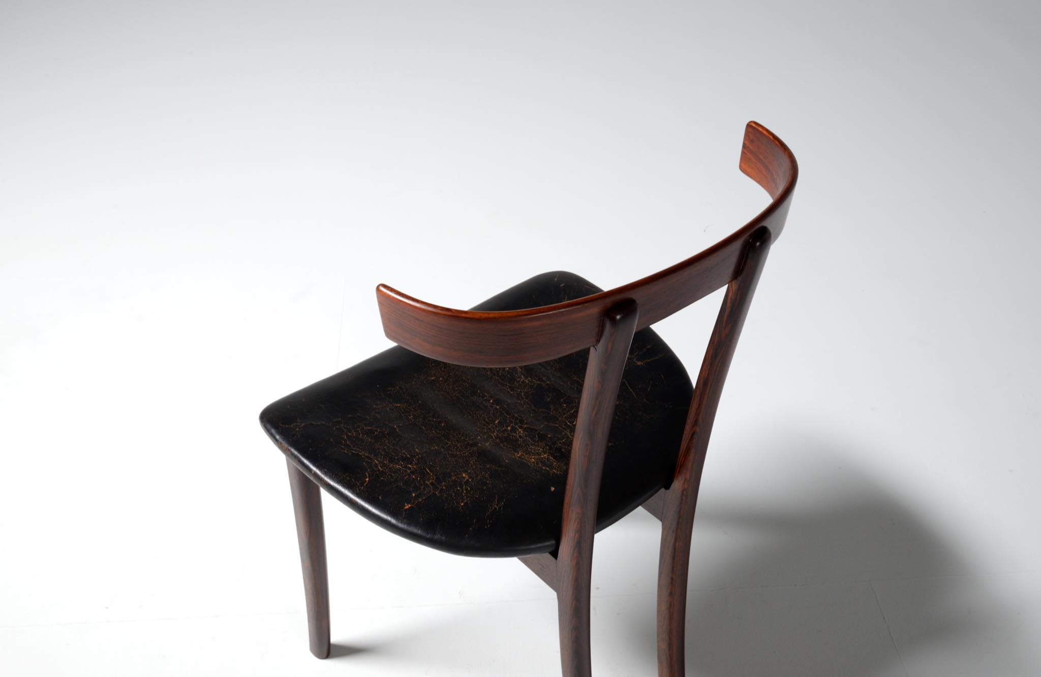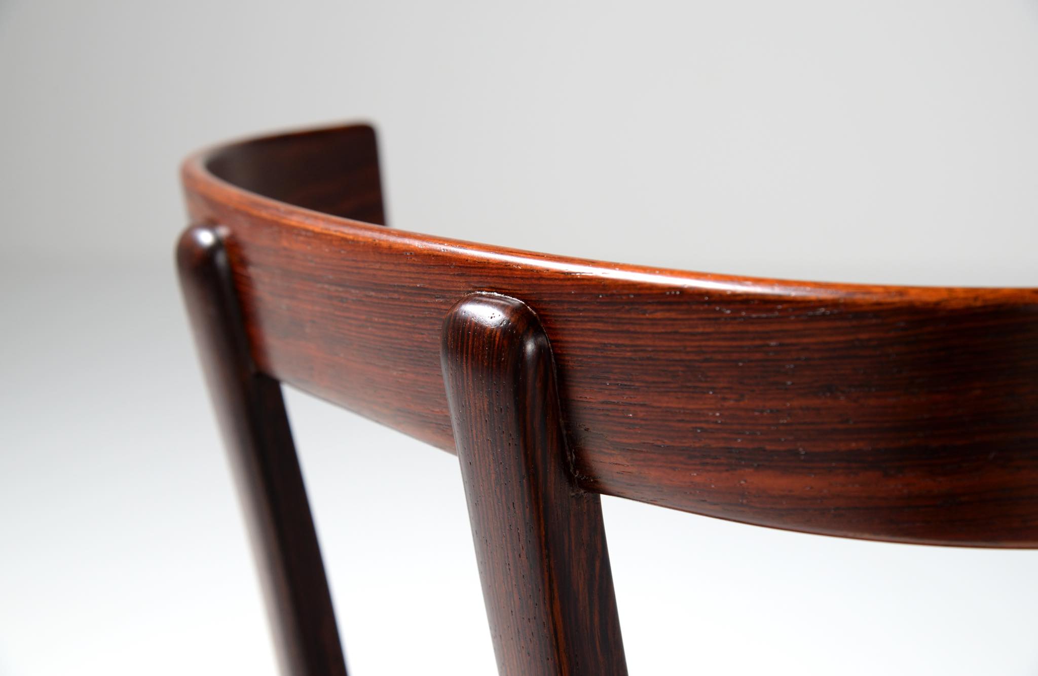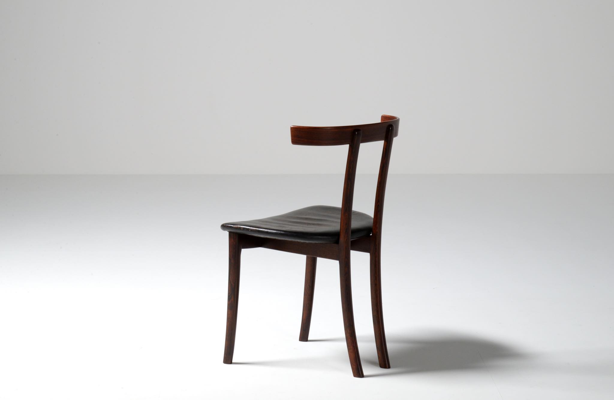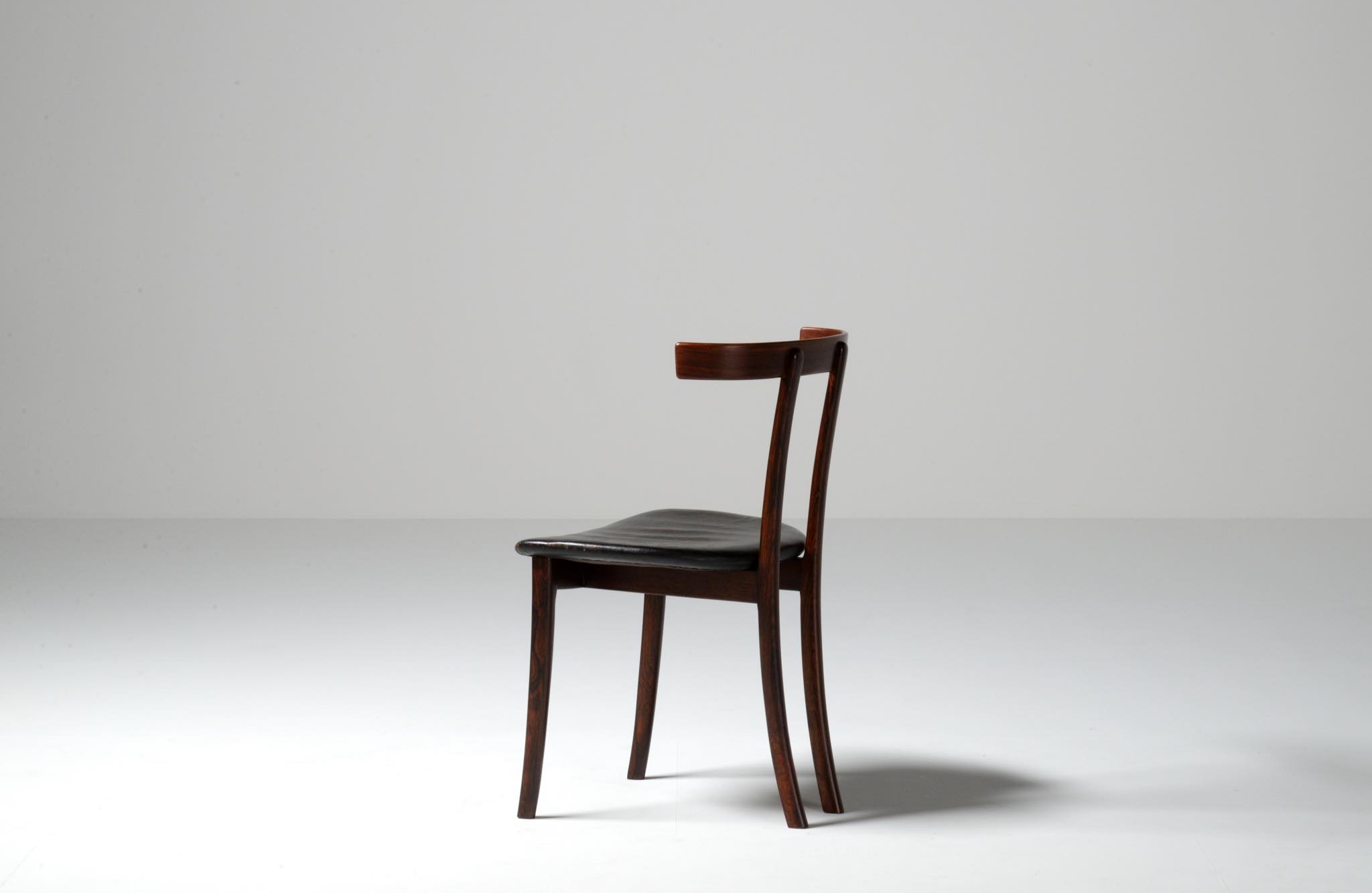 デンマークを代表する家具デザイナー、Ole Wanscher/オーレ・ヴァンシャーによる"T-chair"です。ヴァンシャーの良質なプロダクトを手がけた名工 A.J.イヴァーセン工房によって作られたもので、T-chairは1957年に発表され、改良を重ね全部で4種類ほどあると云われています。1957年のモデルは笠木と後脚を縦軸に接合しており、このタイプは2003年にオーレ・ヴァンシャー生誕100歳を記念して P. Jeppesen社より限定で復刻生産されています。また現在ではCarl Hansen & Son社にて同じく1957年タイプが復刻生産されています。こちらは1961年に発表されたモデルで、大きく湾曲した笠木を横軸で後脚に留めた構造が特徴で、素材にはブラジリアンローズウッドが用いられています。笠木の一部にダメージが見られたため補修しています。シートはオリジナルの状態を留めています。