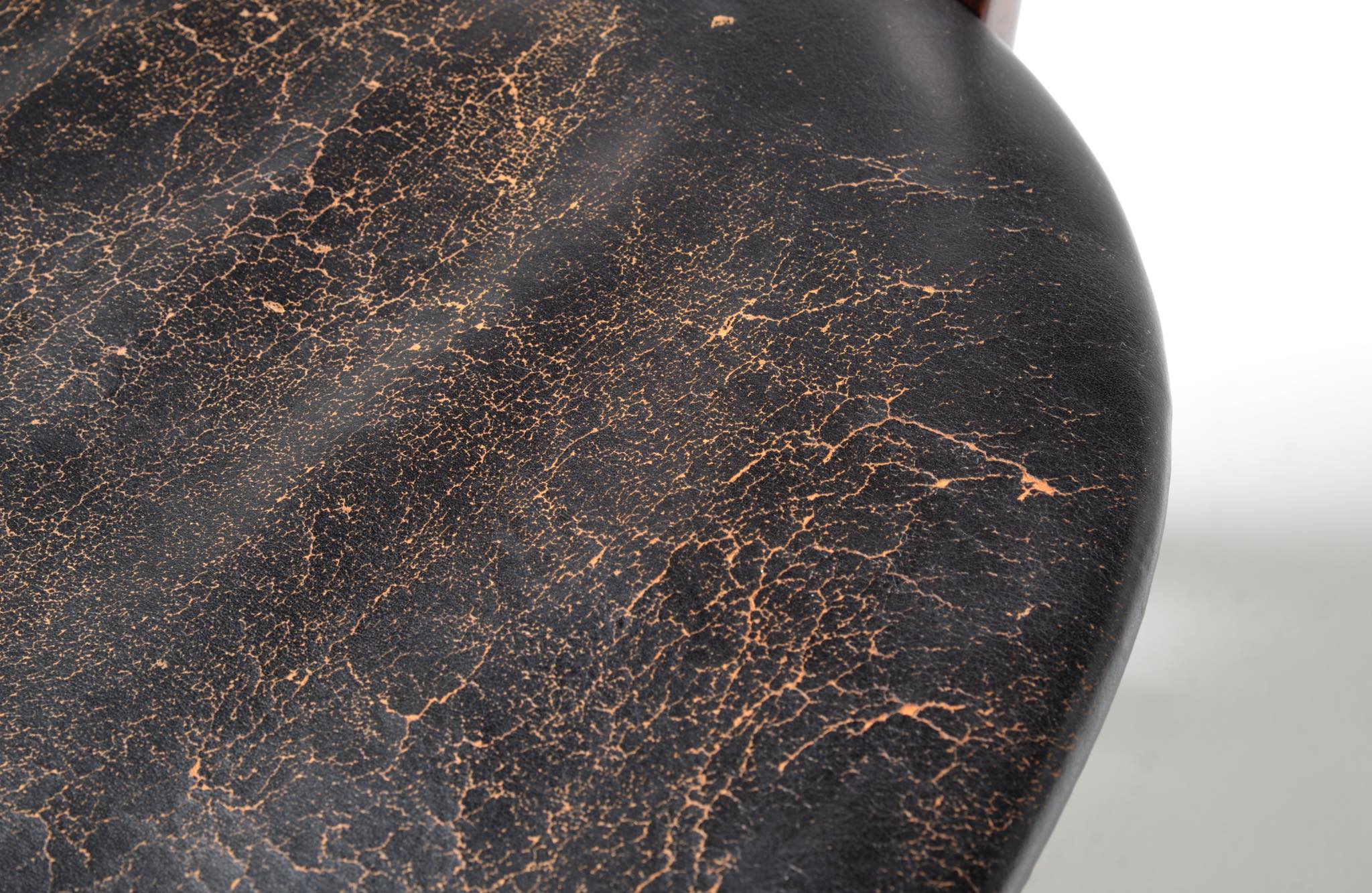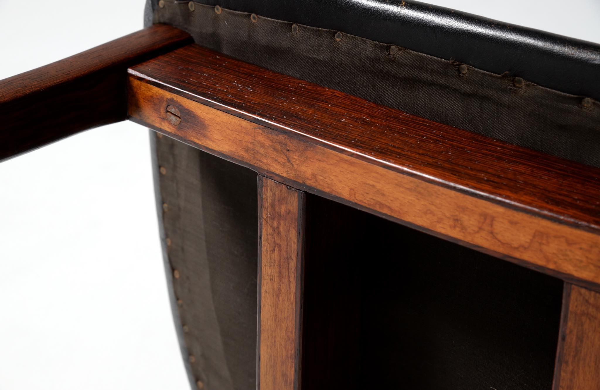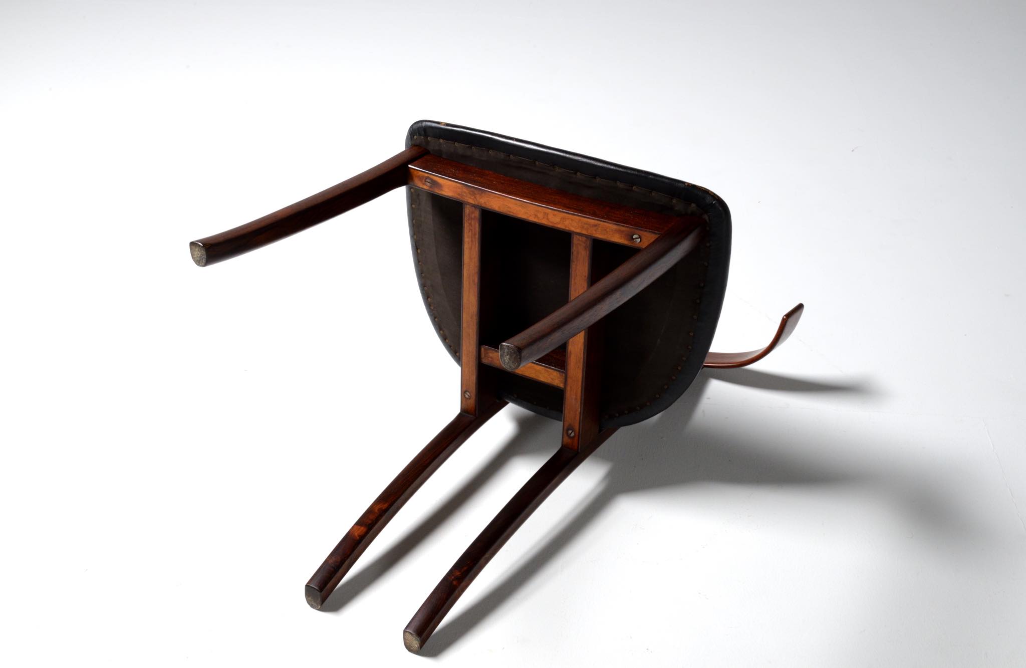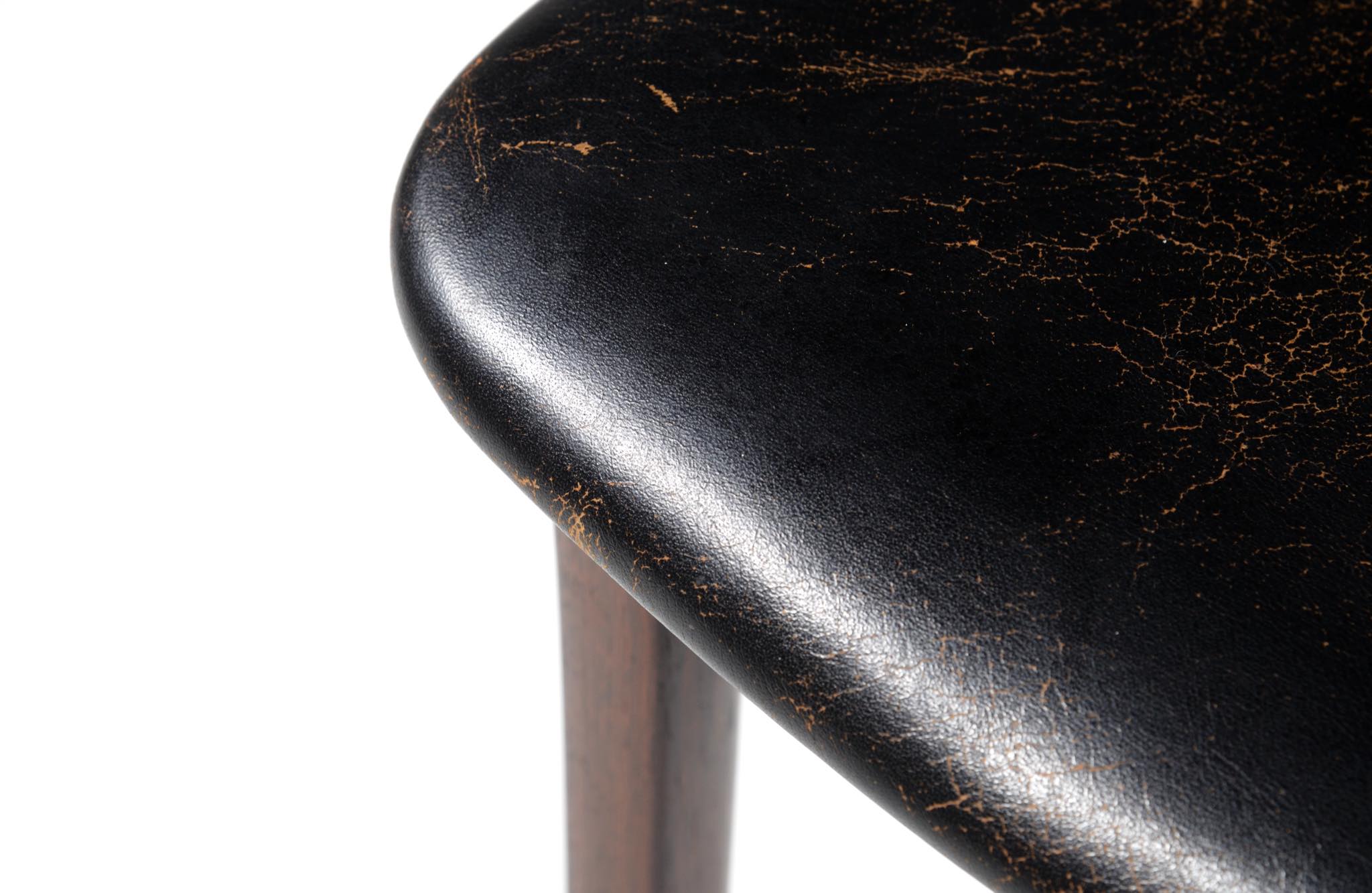 デンマークを代表する家具デザイナー、Ole Wanscher/オーレ・ヴァンシャーによる"T-chair"です。ヴァンシャーの良質なプロダクトを手がけた名工 A.J.イヴァーセン工房によって作られたもので、T-chairは1957年に発表され、改良を重ね全部で4種類ほどあると云われています。1957年のモデルは笠木と後脚を縦軸に接合しており、このタイプは2003年にオーレ・ヴァンシャー生誕100歳を記念して P. Jeppesen社より限定で復刻生産されています。また現在ではCarl Hansen & Son社にて同じく1957年タイプが復刻生産されています。こちらは1961年に発表されたモデルで、大きく湾曲した笠木を横軸で後脚に留めた構造が特徴で、素材にはブラジリアンローズウッドが用いられています。笠木の一部にダメージが見られたため補修しています。シートはオリジナルの状態を留めています。
