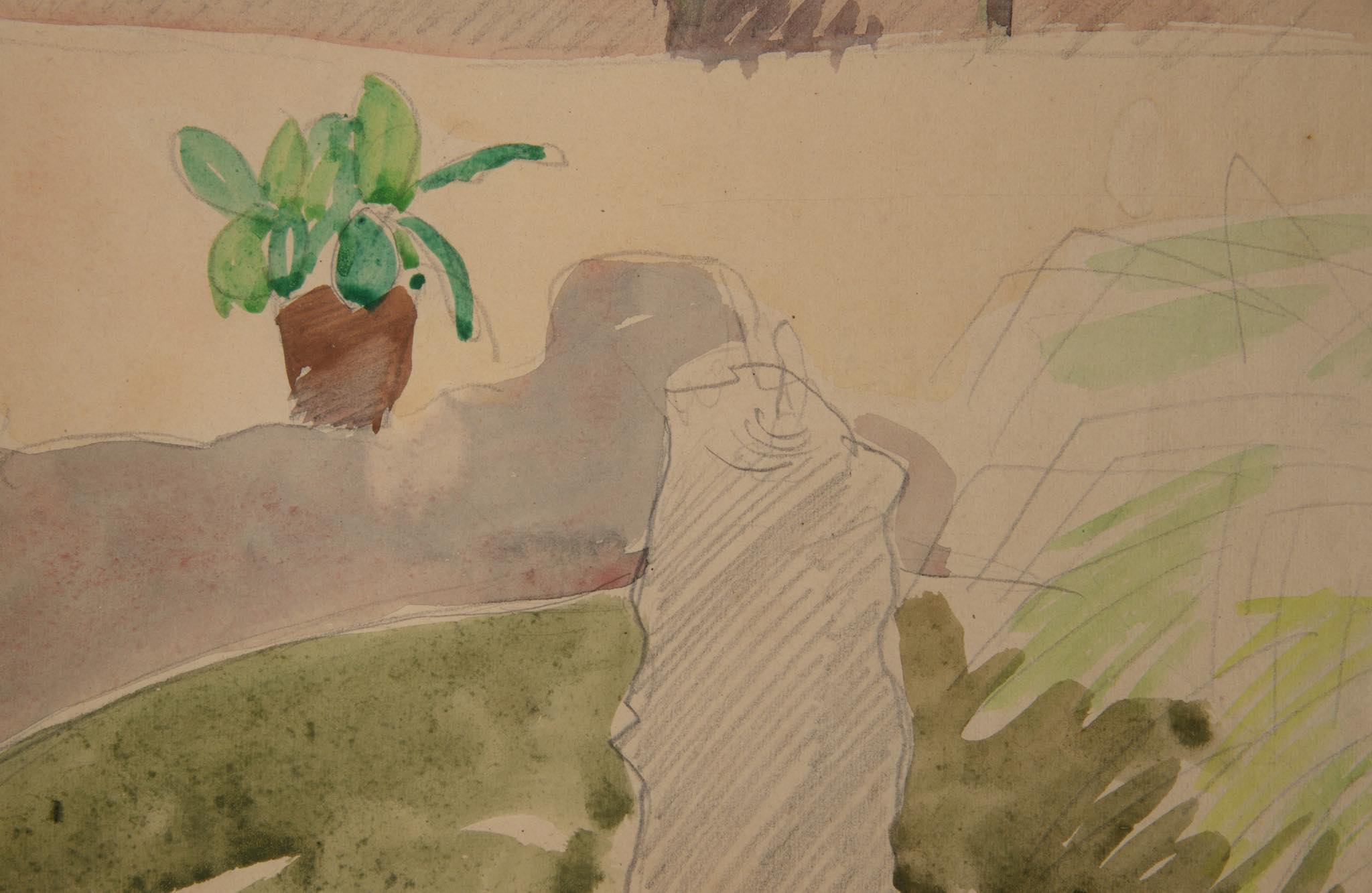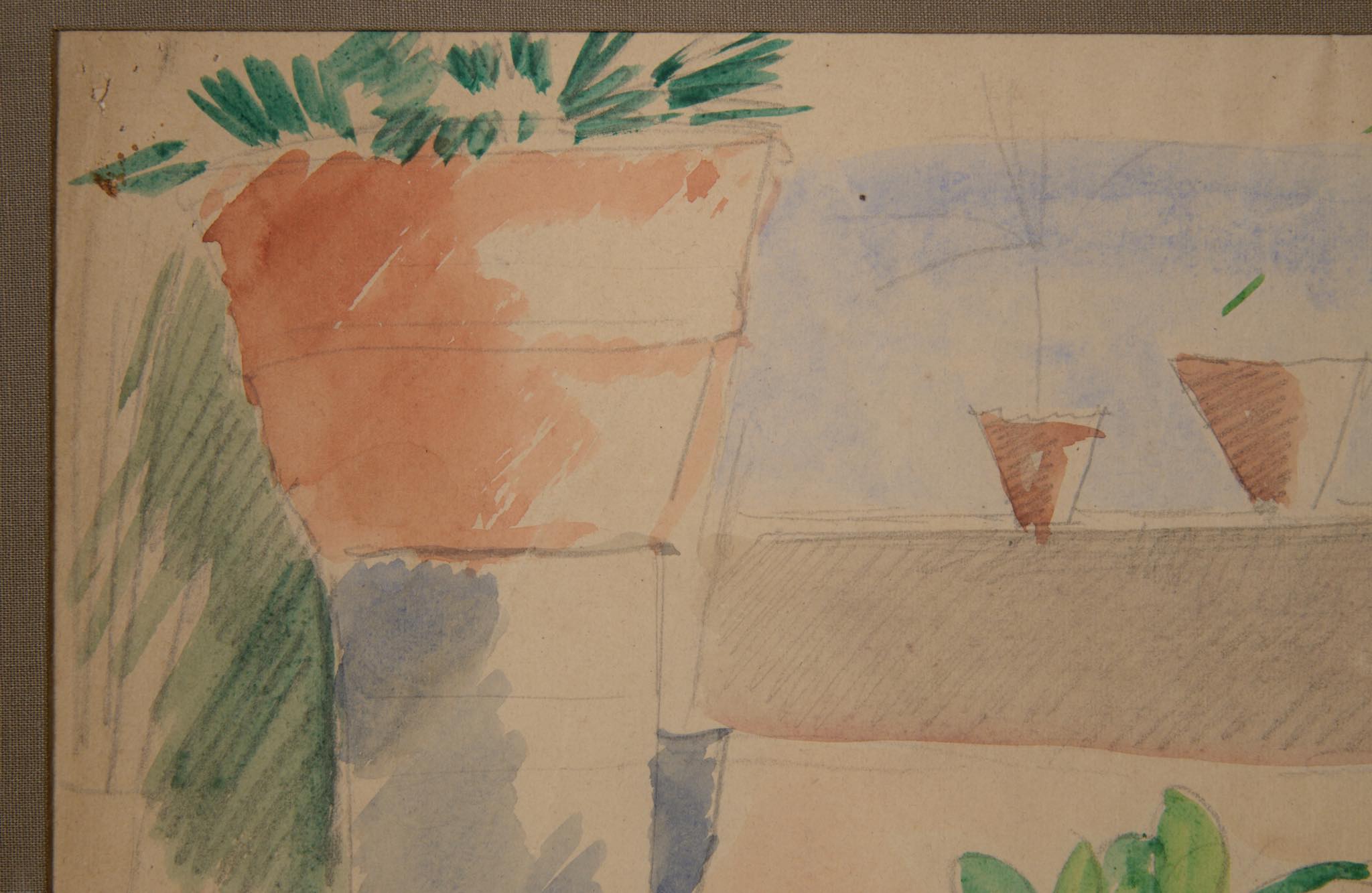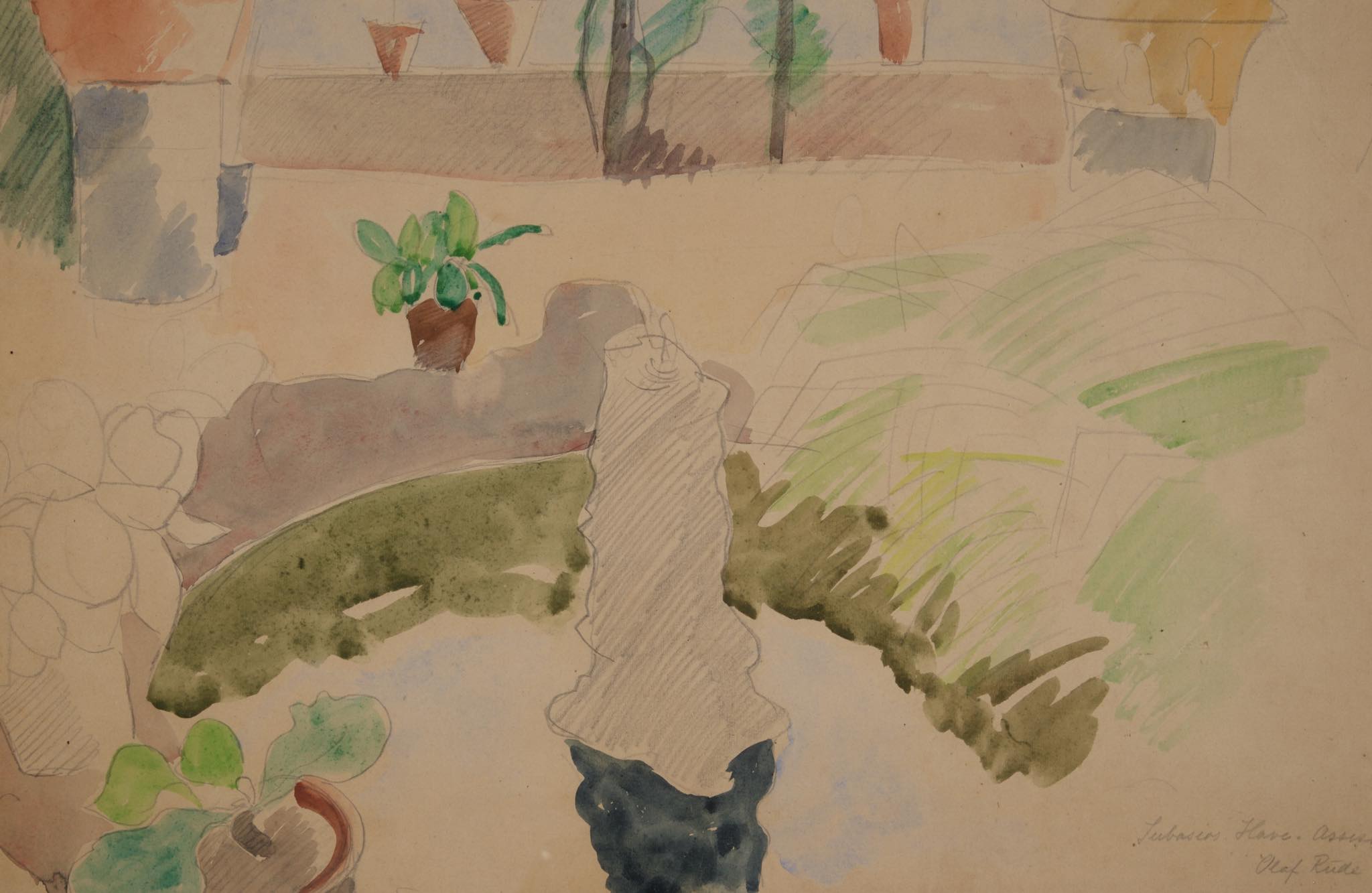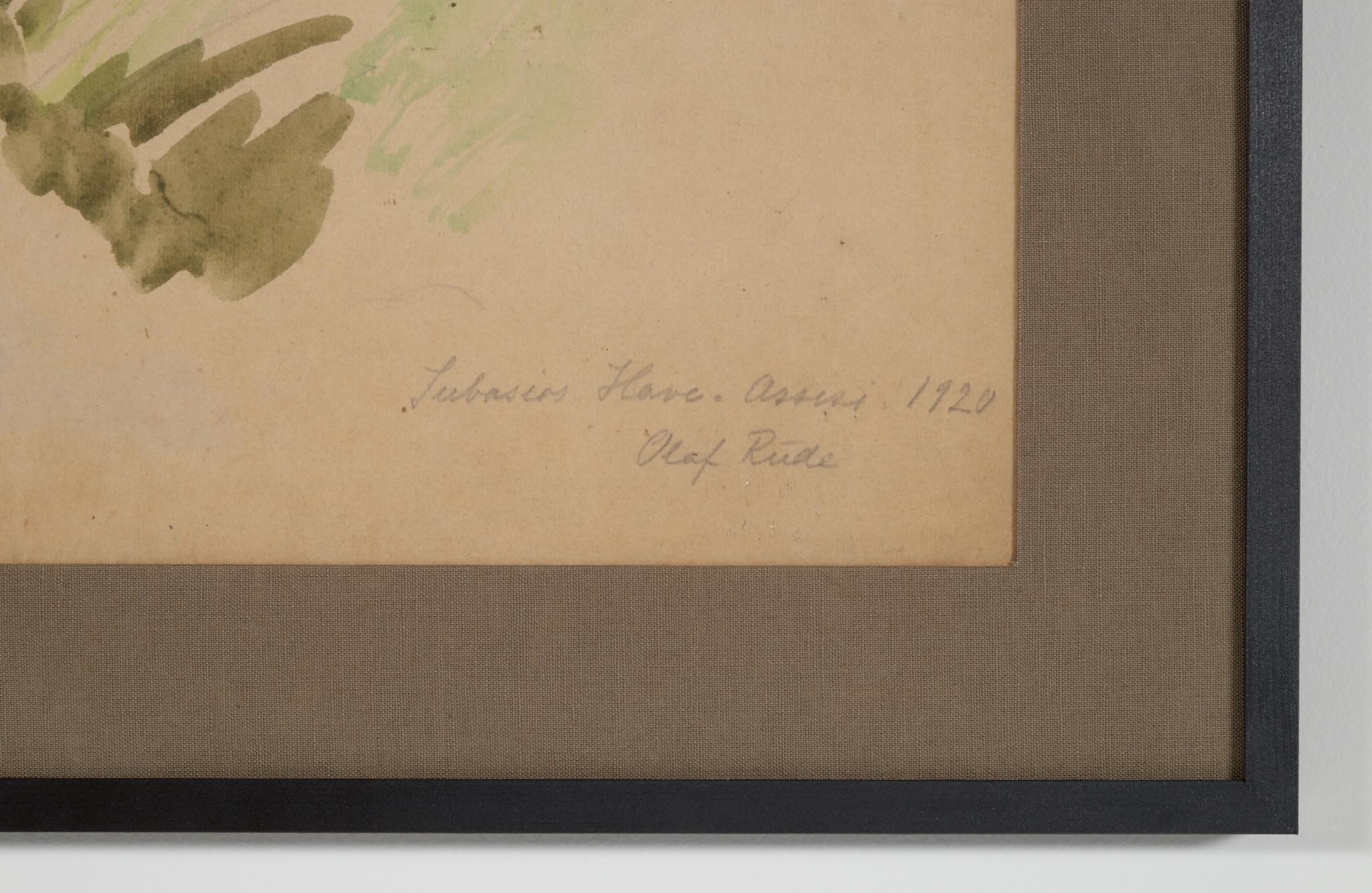 デンマークの画家、Olaf Rude/オラフ・ルードによる風景画水彩作品、1920年代に描かれたものです。イタリア中部の町アッシジの公園か庭園(Have)を描いているようです。中央の噴水のようなものや、周囲の葉が一部彩色されていませんが、鉛筆でテクスチャーを表現しています。タイトルは判読できませんがサインがあるので作品(完成)なのでしょう。四隅に画鋲の跡、紙に若干の経年感が見られるなど、しばらく裸で飾られていたと思われます。フレームやマットは新たに誂えました。