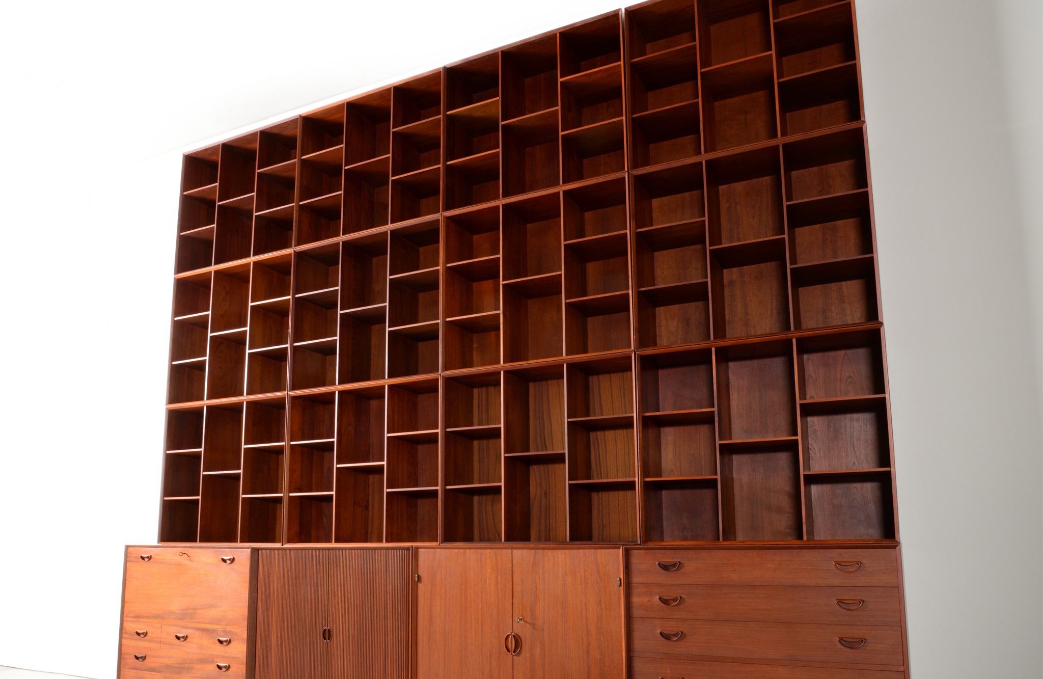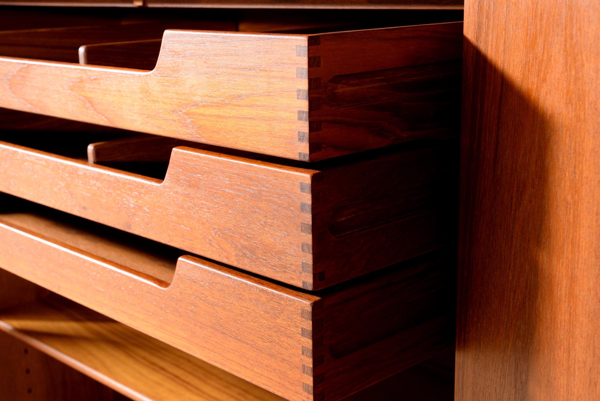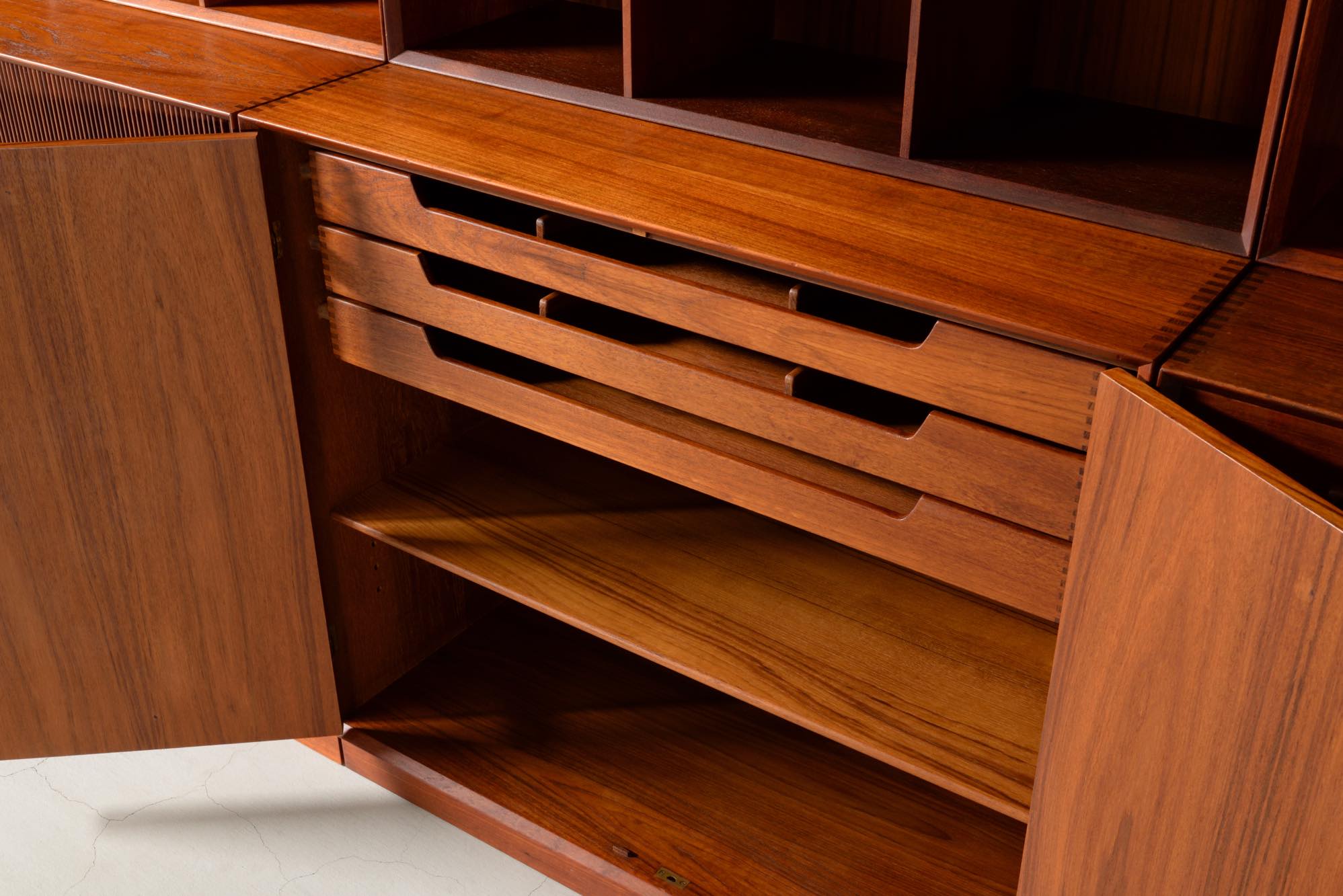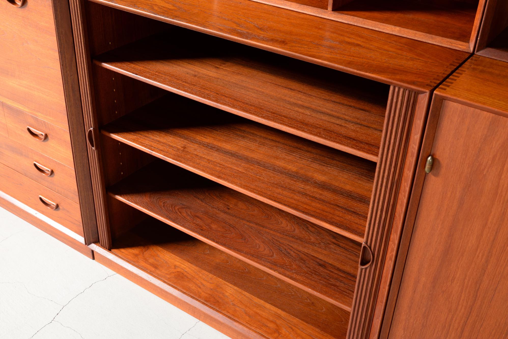 1950年代に活躍したデンマークのデザイナーユニット、Peter Hvidt/ピーター・ヴィッツとOrla Mølgaard Nielsen/オルラ・ミュルゴー・ニールセンによるブックケースとキャビネットです。タイ国原産と思しき良質のチークの無垢材を用いて、優れた技術によって作られたものです。棚板の位置替えは可能です。