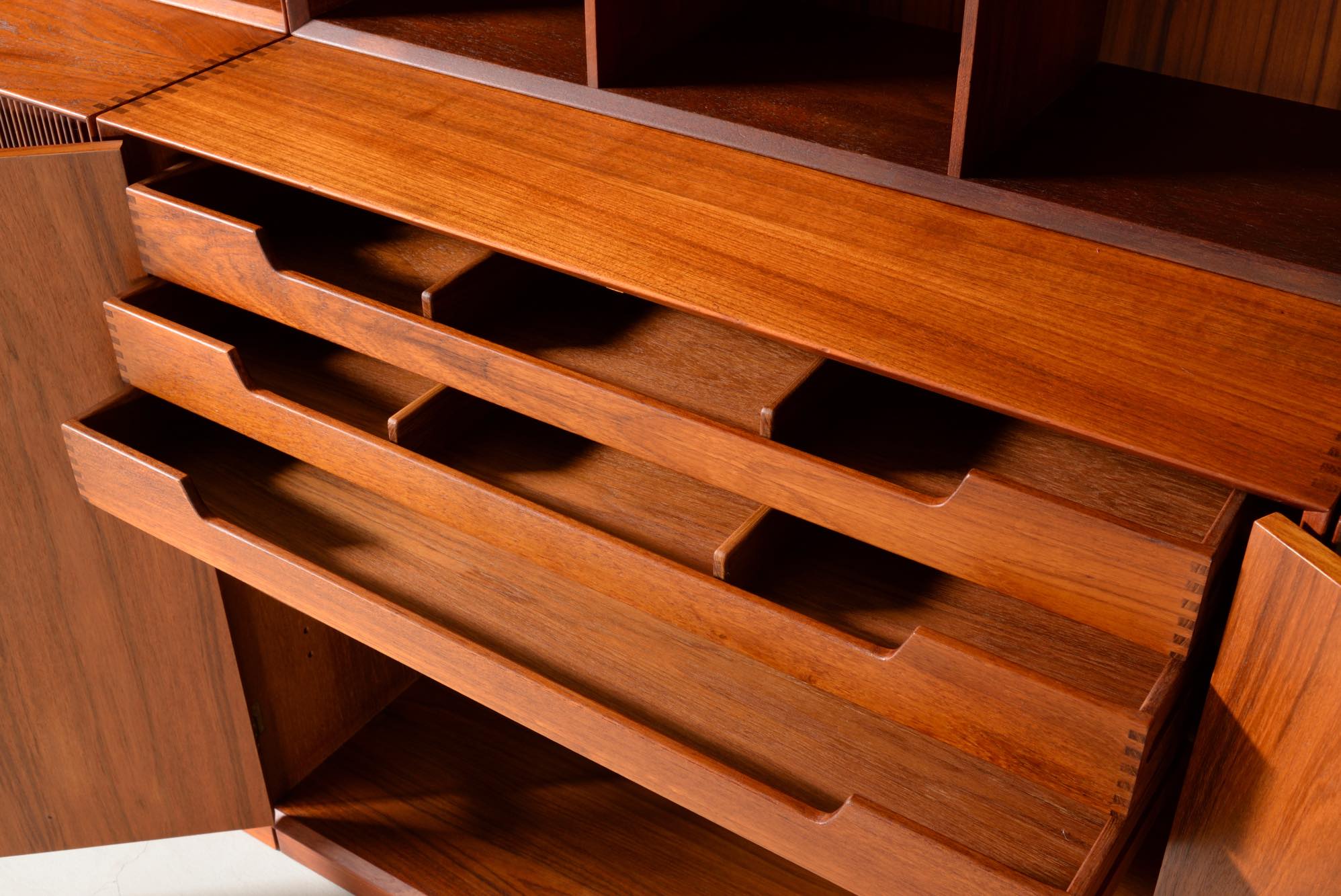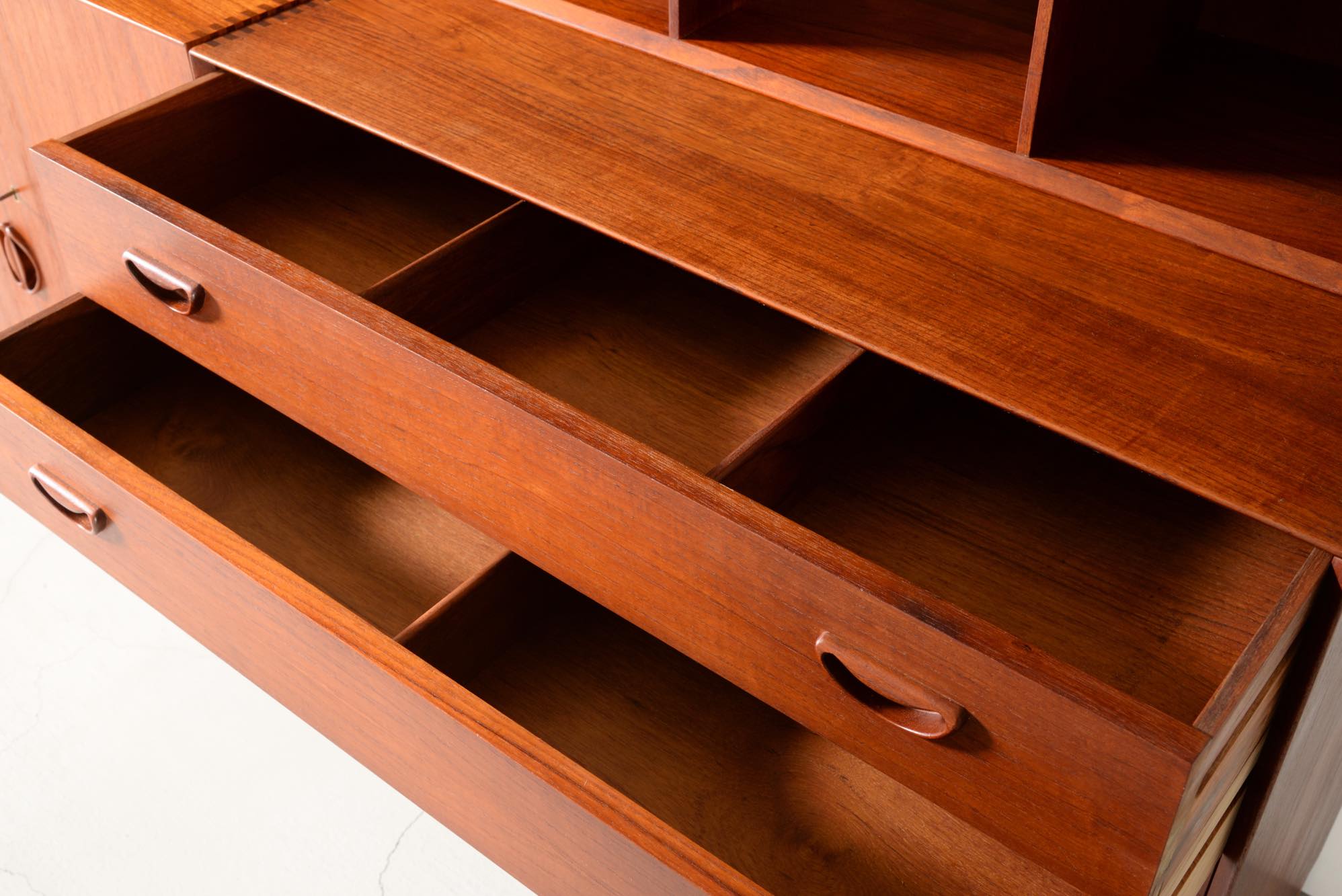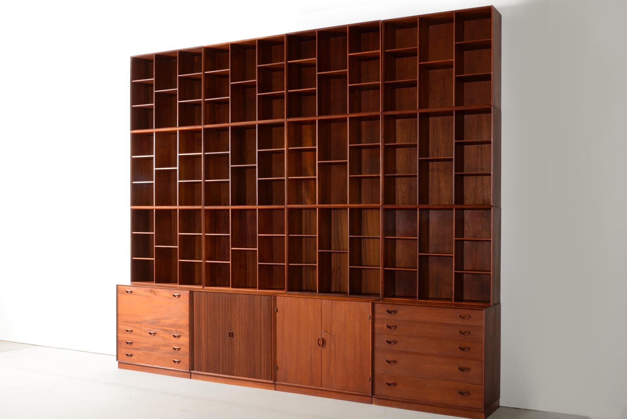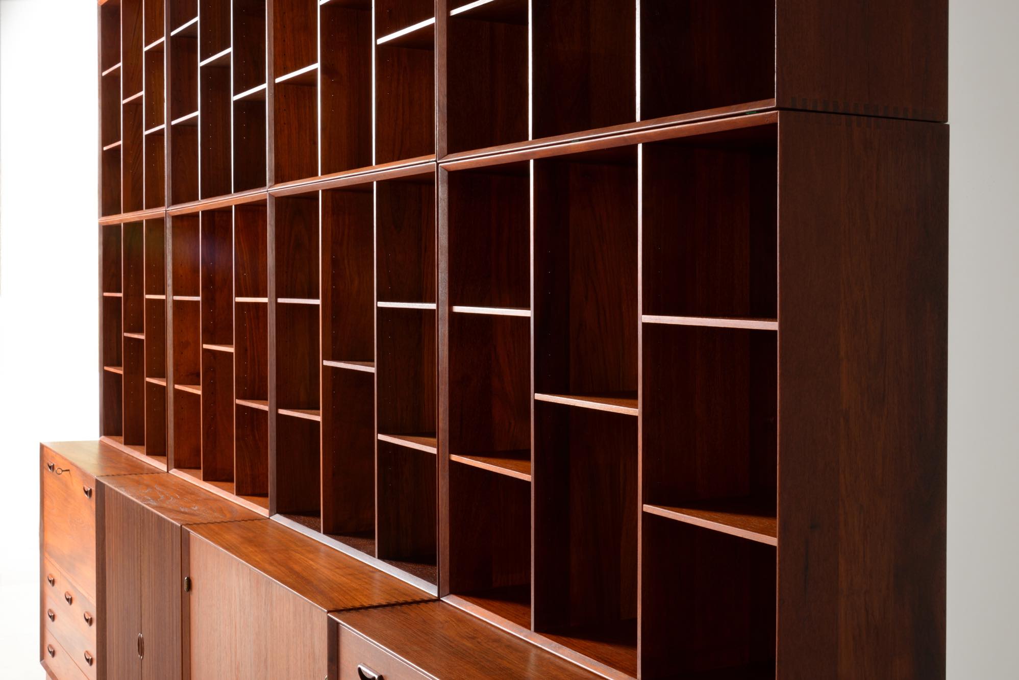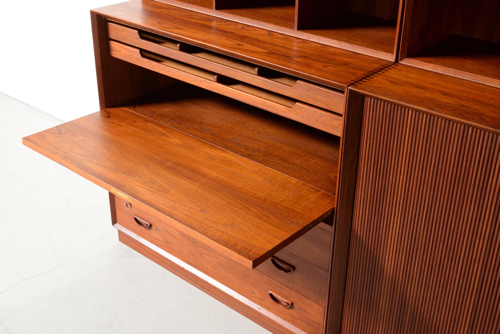 1950年代に活躍したデンマークのデザイナーユニット、Peter Hvidt/ピーター・ヴィッツとOrla Mølgaard Nielsen/オルラ・ミュルゴー・ニールセンによるブックケースとキャビネットです。タイ国原産と思しき良質のチークの無垢材を用いて、優れた技術によって作られたものです。棚板の位置替えは可能です。
