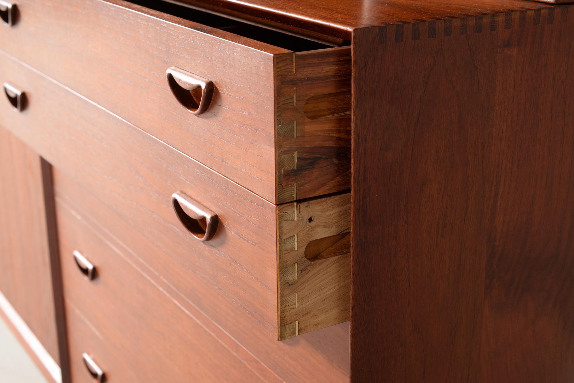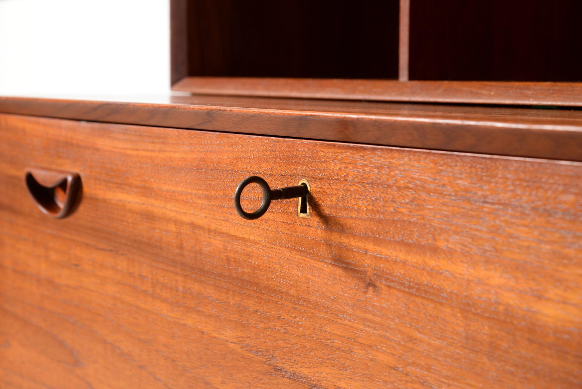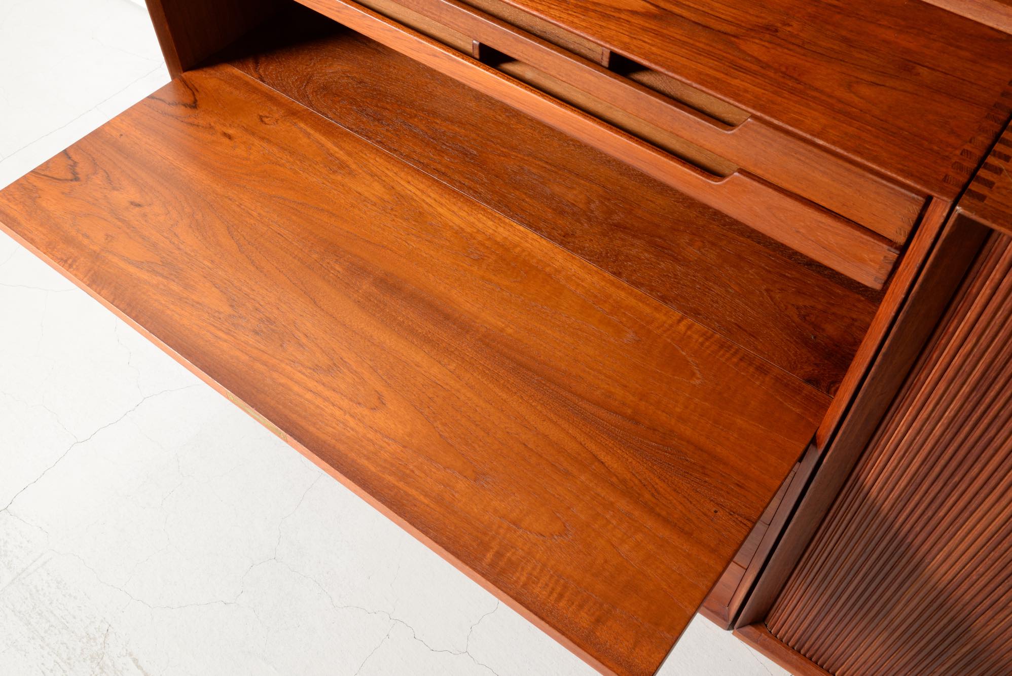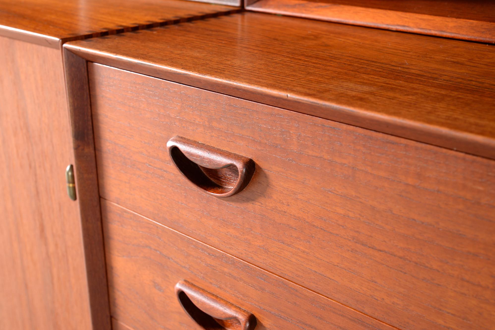 1950年代に活躍したデンマークのデザイナーユニット、Peter Hvidt/ピーター・ヴィッツとOrla Mølgaard Nielsen/オルラ・ミュルゴー・ニールセンによるブックケースとキャビネットです。タイ国原産と思しき良質のチークの無垢材を用いて、優れた技術によって作られたものです。棚板の位置替えは可能です。