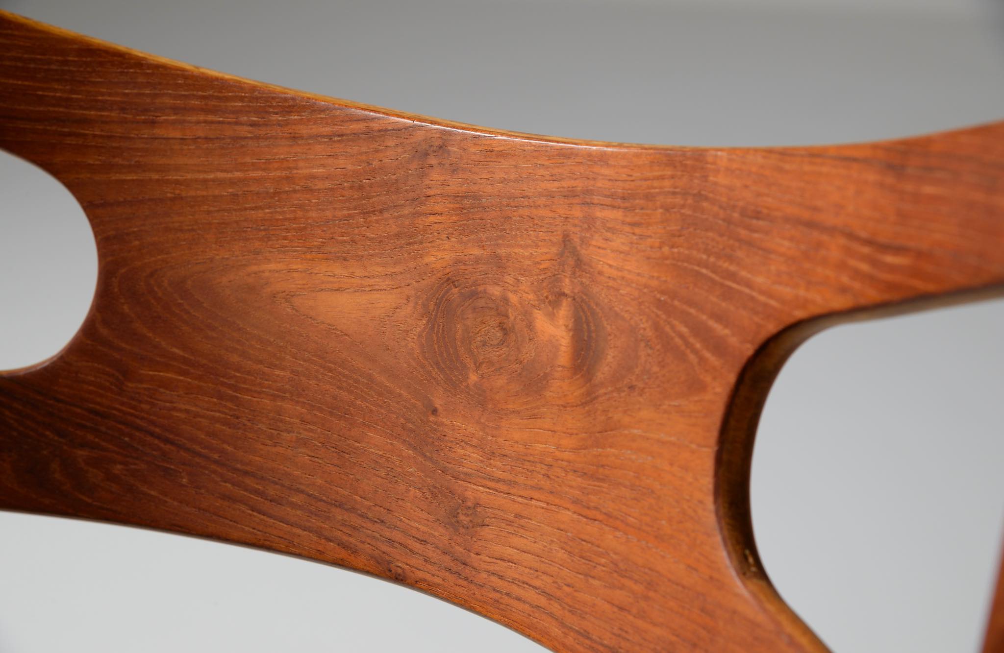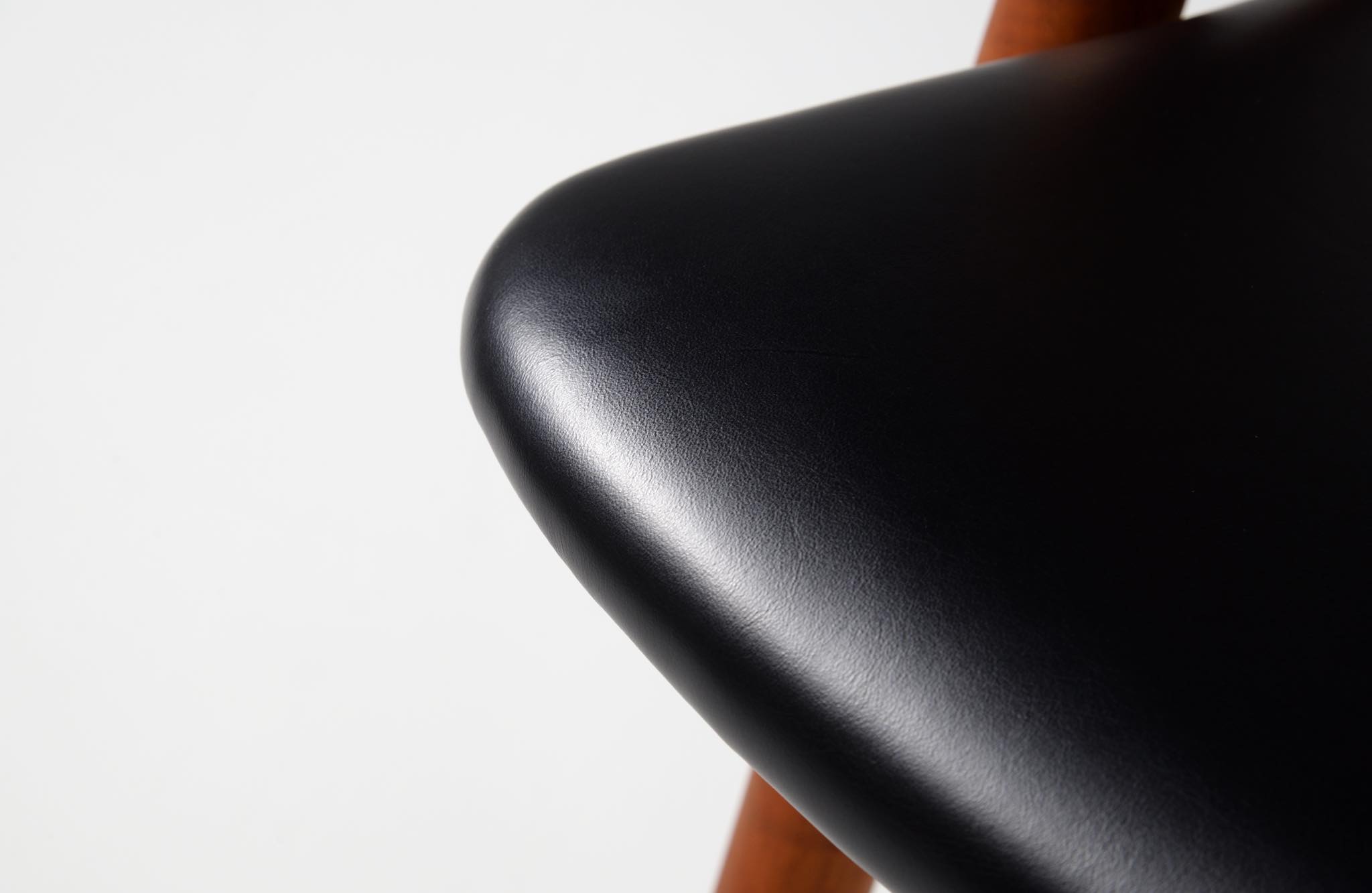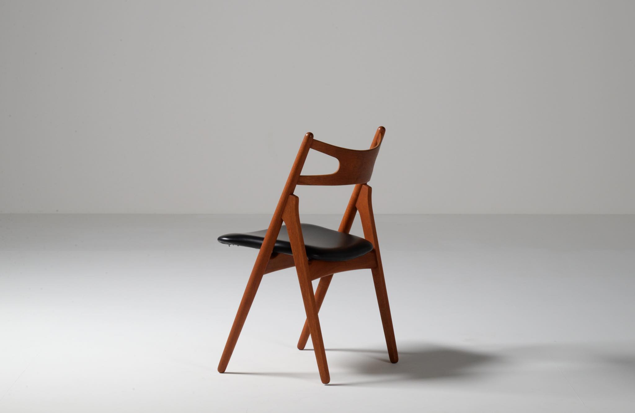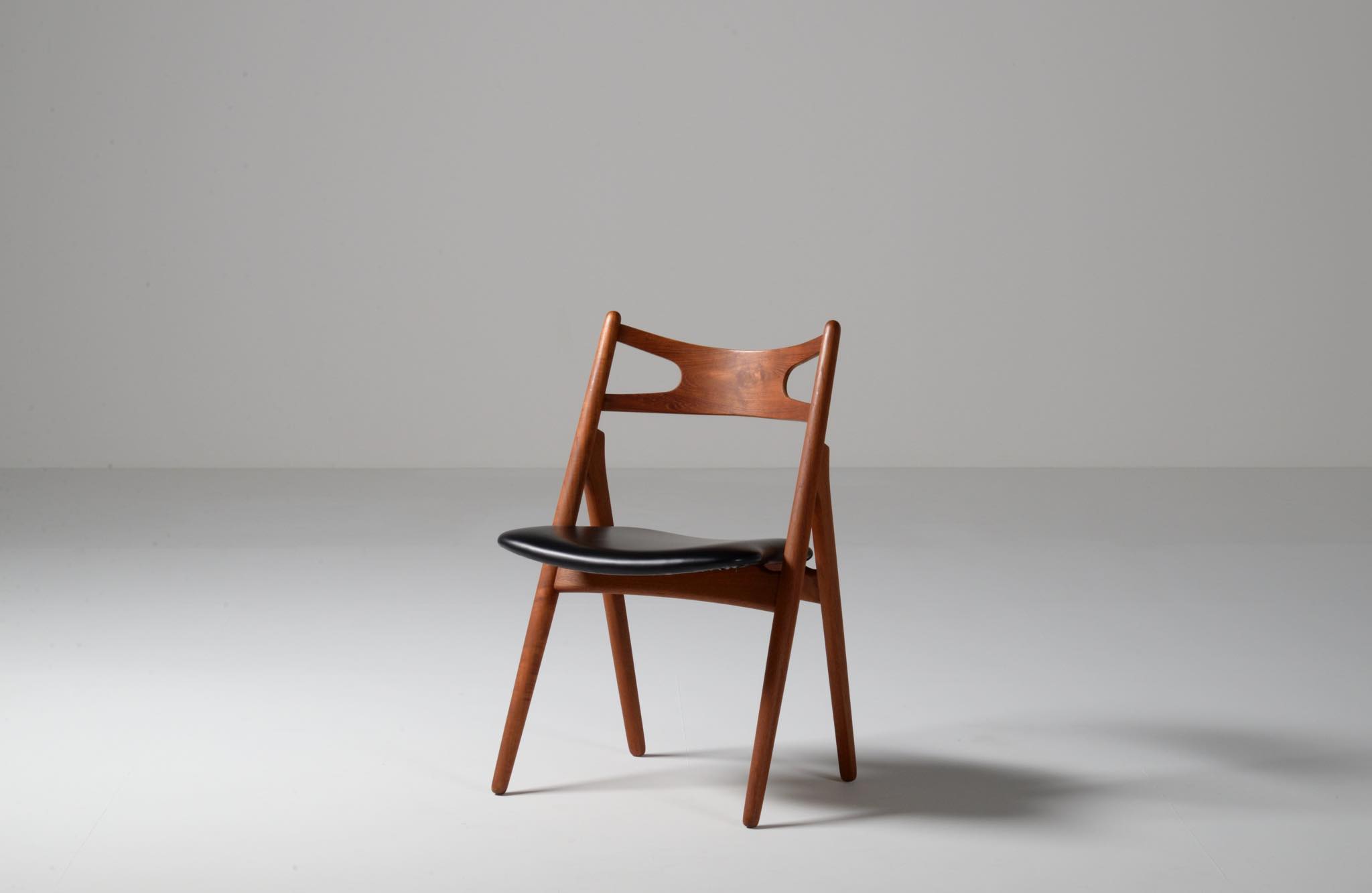 Hans J. Wegner/ハンス・ウェグナーよって1952年に発表されたダイニングチェア "CH29" です。傾斜した前脚に後脚を接合させたユニークな構造の椅子で、デンマークで暖炉用の薪を伐る際に用いる「玉切り台」に形状が似ていることからデンマーク語で "Savbukstol/ソウバックストール" と呼ばれているようです。笠木はチーク材のプライウッド、フレームにはチーク無垢材が用いられています。座面は近年張り替えられているようです。