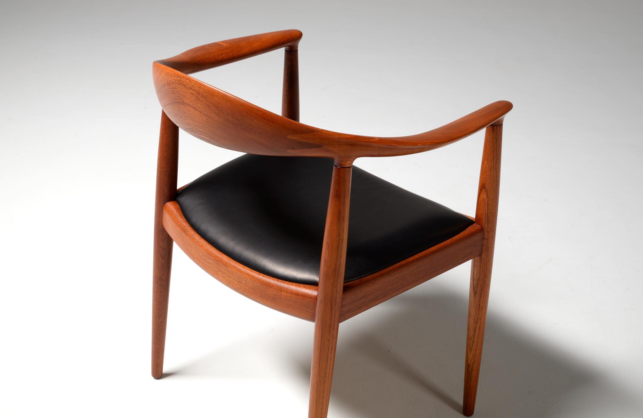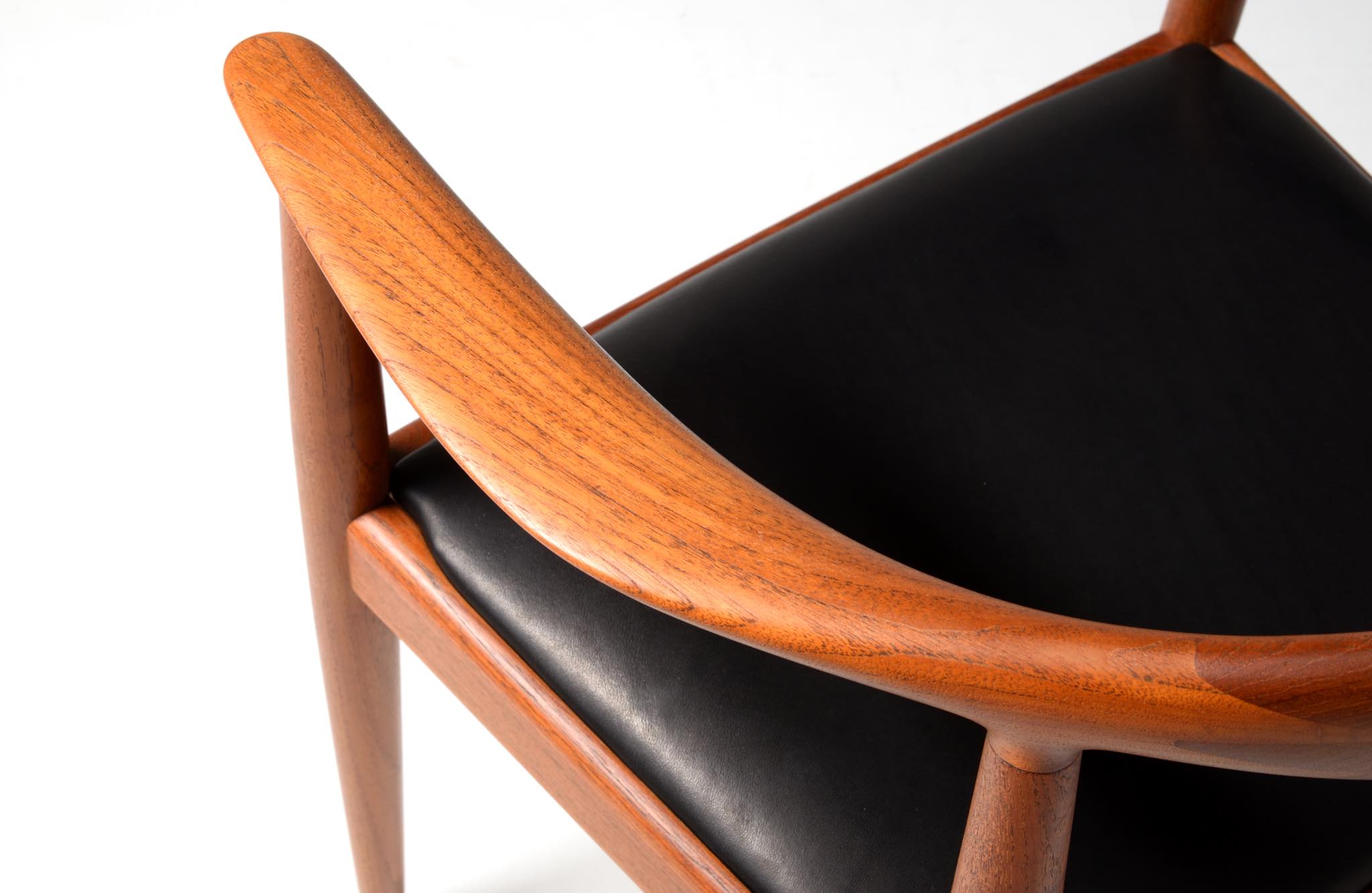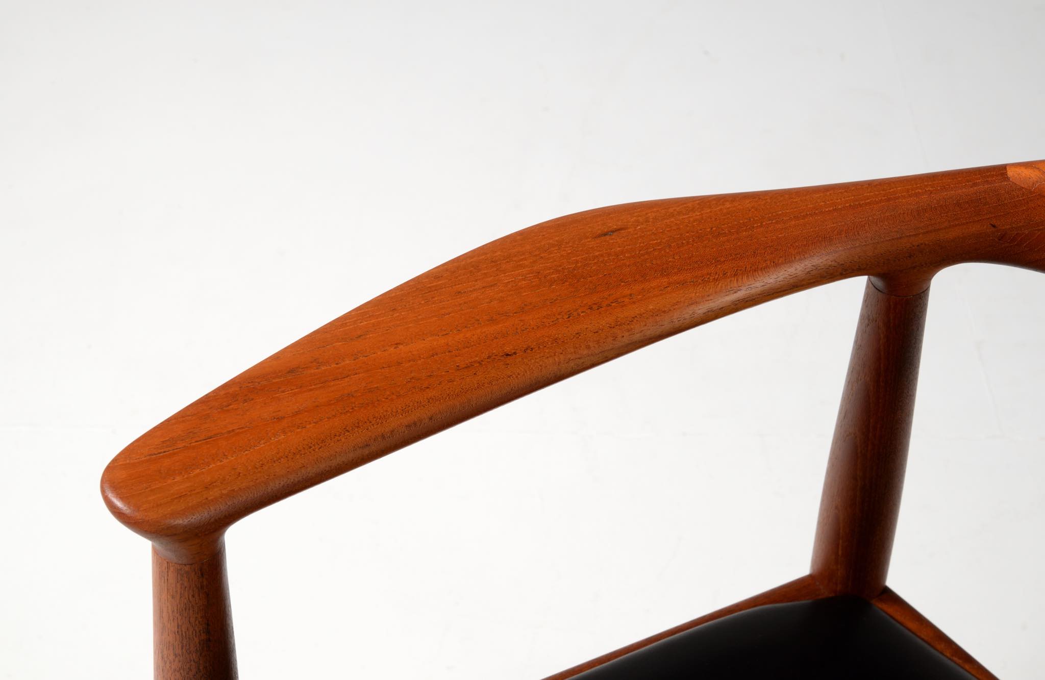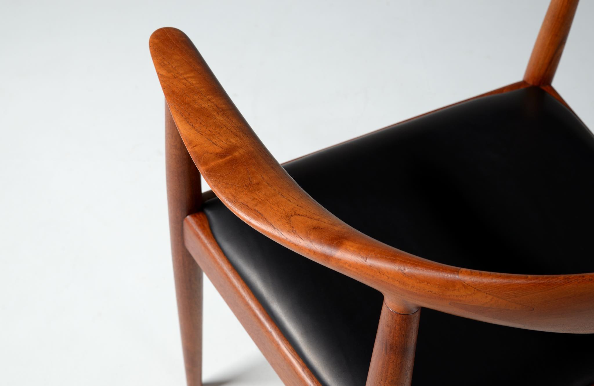 デンマークを代表する家具デザイナー、Hans J. Wegner/ハンス・ウェグナーによる代表作 “ザ・チェア”、チーク材、皮革張りのタイプです。1960年にアメリカのCNNテレビで大統領候補のジョン・F・ケネディとリチャード・ニクソンが討論会を行った際に使われた椅子として知られています。笠木には木目に変化のある材を木取りしています。ウェグナー作品では木目に変化のある部位をあえて表に出すよう木取りすることが多いように見受けられます。