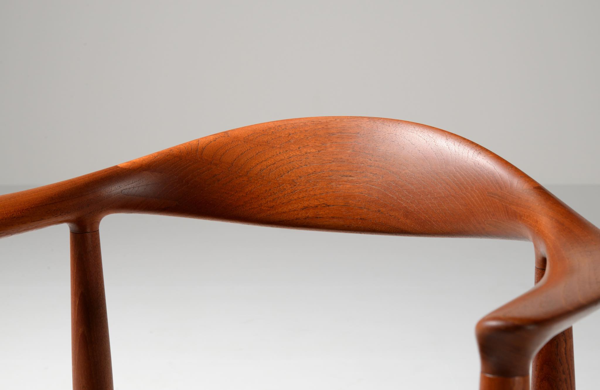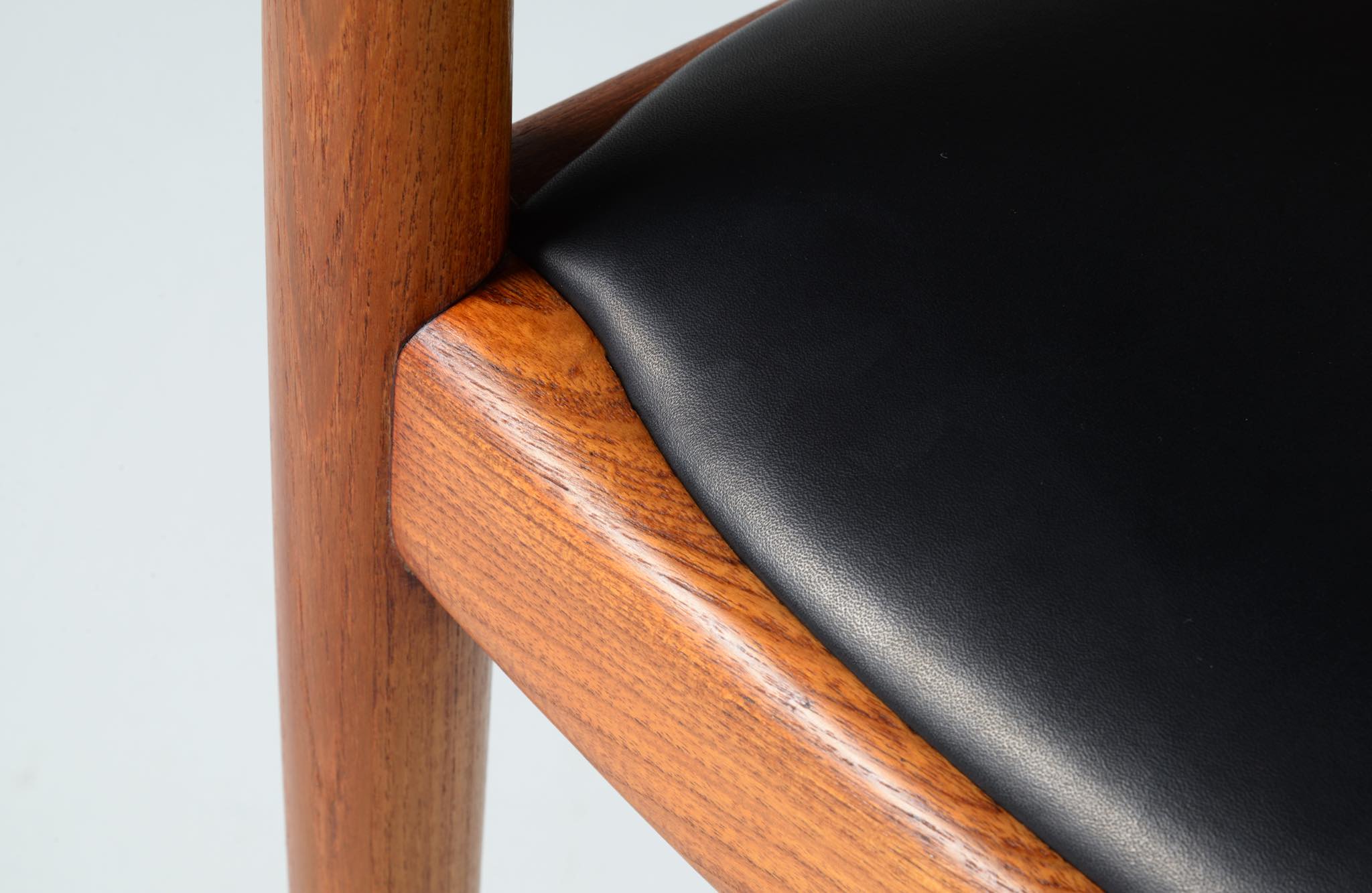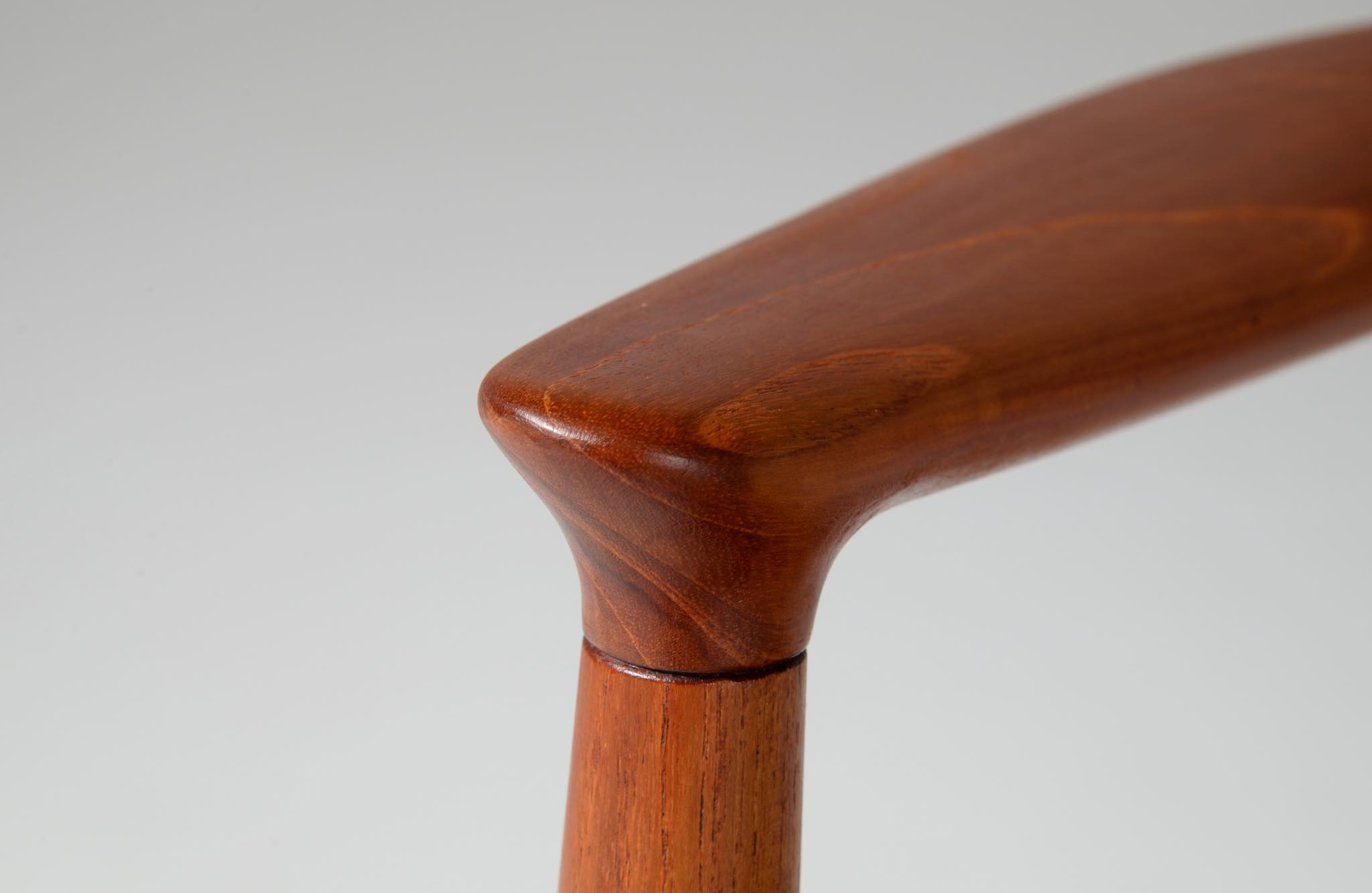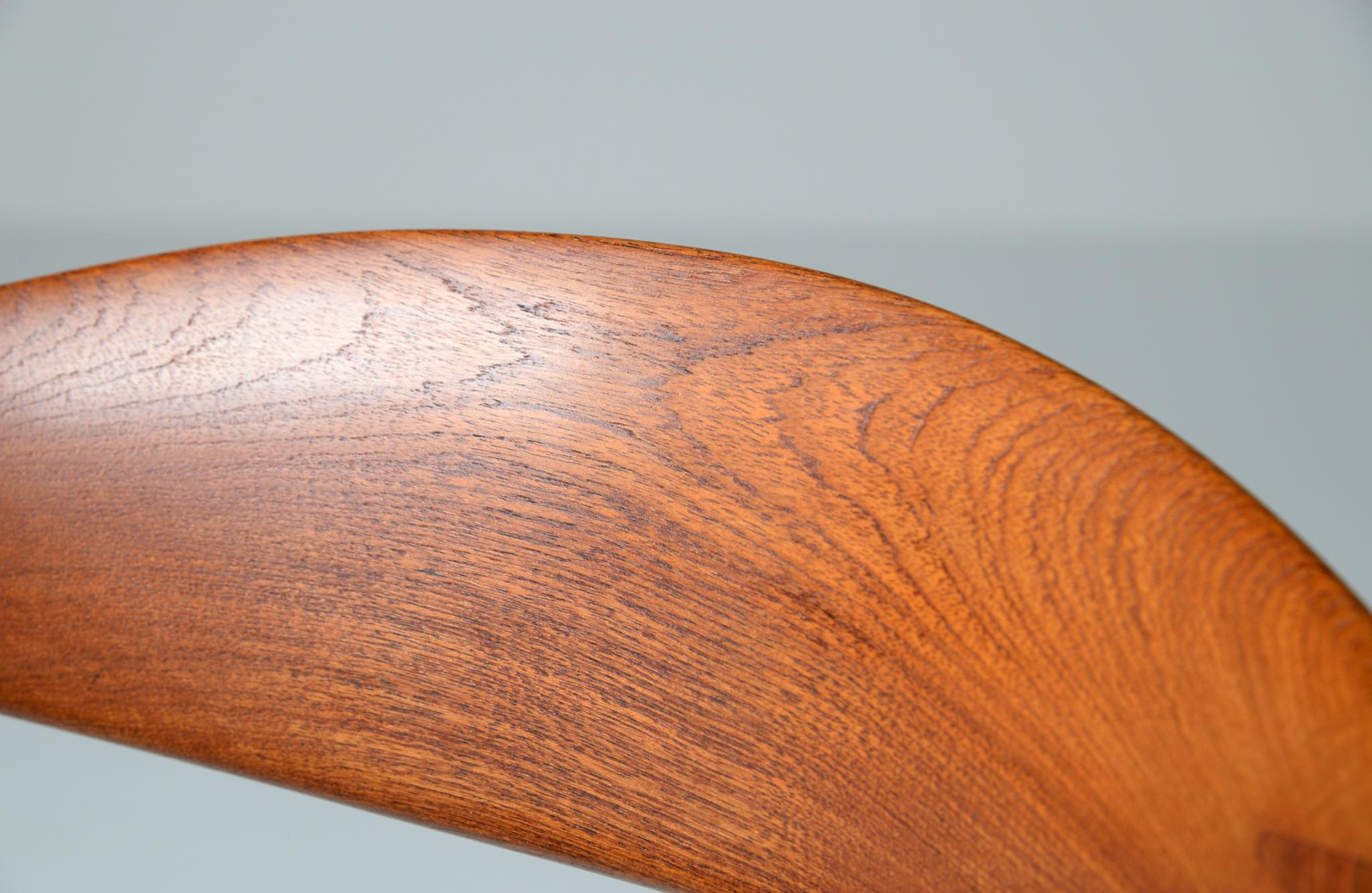 デンマークを代表する家具デザイナー、Hans J. Wegner/ハンス・ウェグナーによる代表作 “ザ・チェア”、チーク材、皮革張りのタイプです。1960年にアメリカのCNNテレビで大統領候補のジョン・F・ケネディとリチャード・ニクソンが討論会を行った際に使われた椅子として知られています。笠木には木目に変化のある材を木取りしています。ウェグナー作品では木目に変化のある部位をあえて表に出すよう木取りすることが多いように見受けられます。