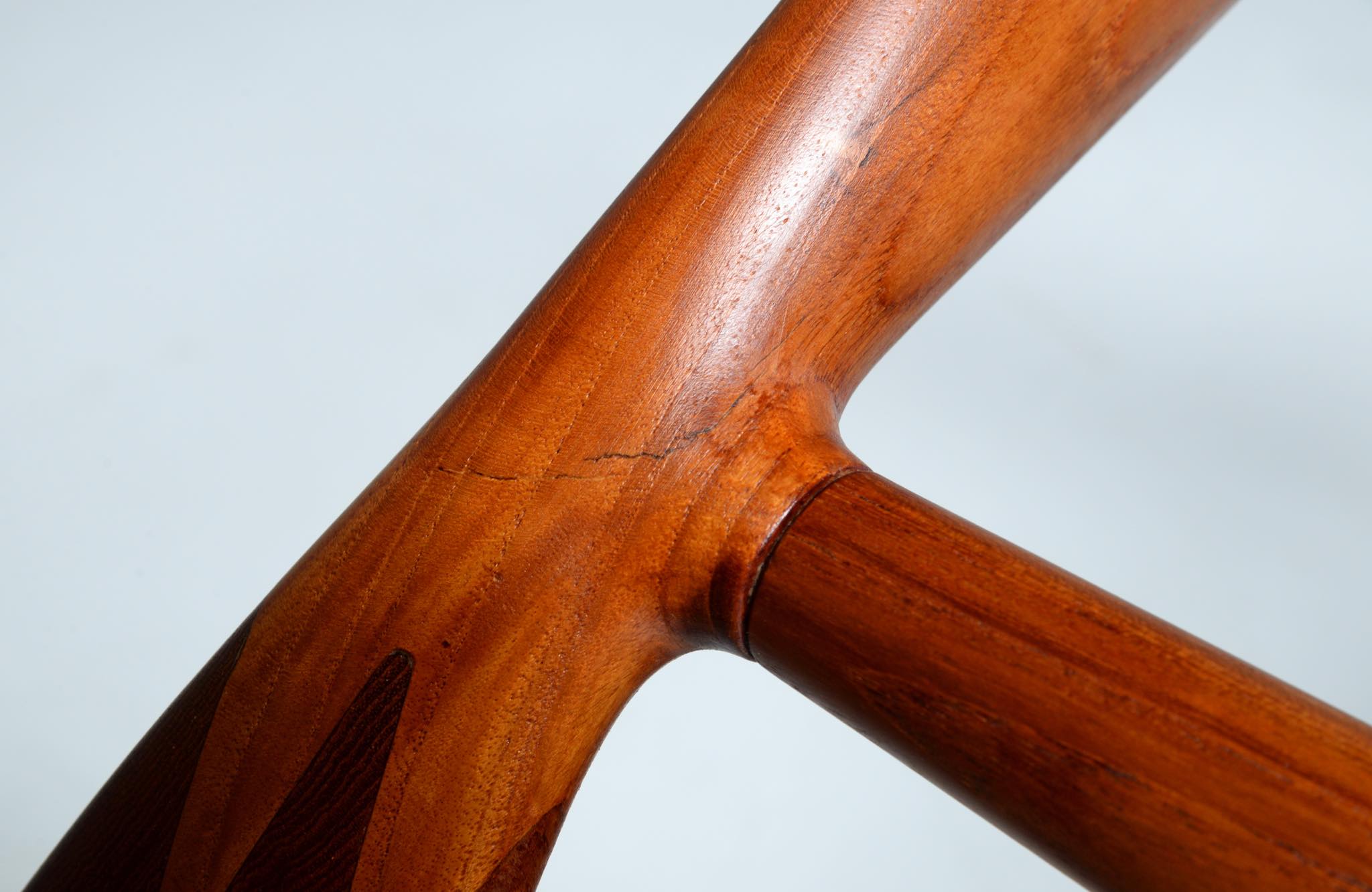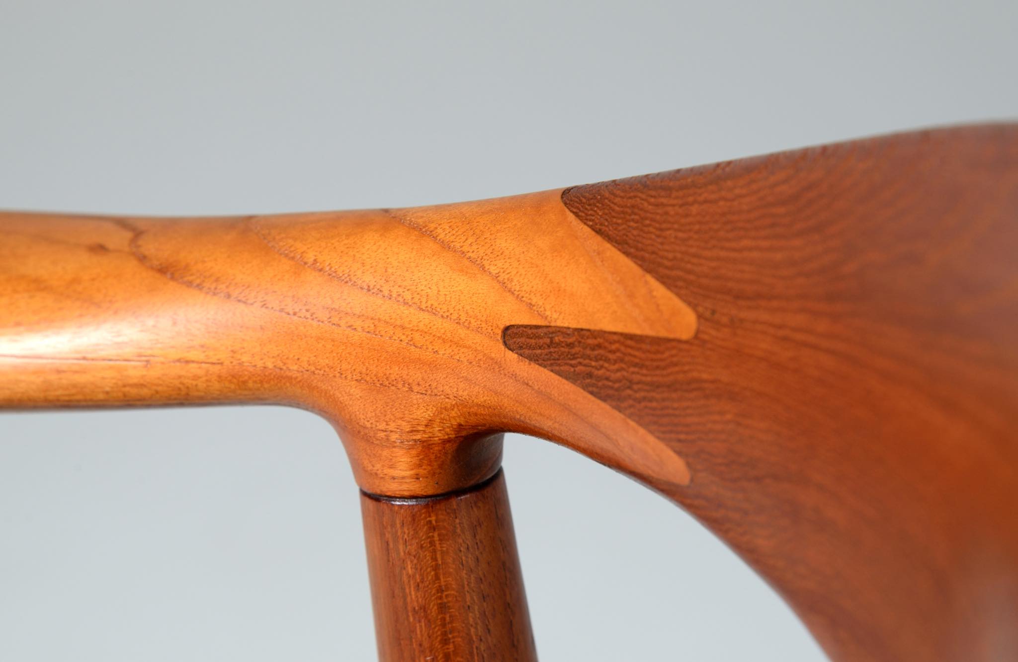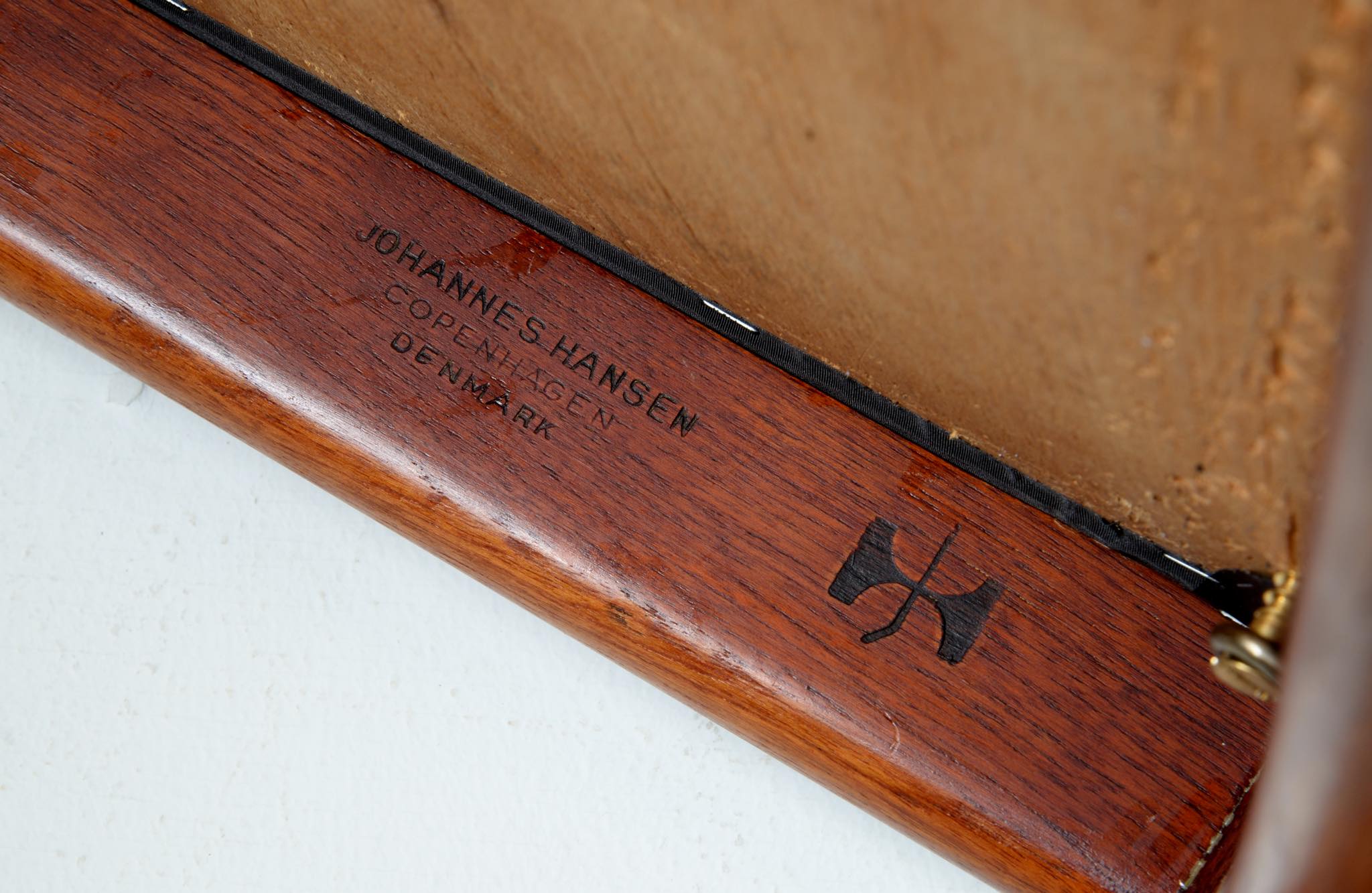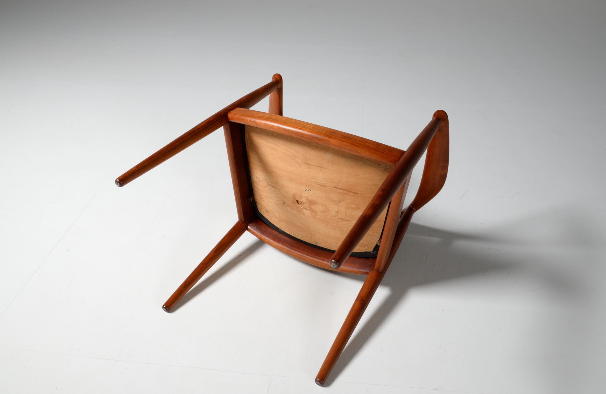 デンマークを代表する家具デザイナー、Hans J. Wegner/ハンス・ウェグナーによる代表作 “ザ・チェア”、チーク材、皮革張りのタイプです。1960年にアメリカのCNNテレビで大統領候補のジョン・F・ケネディとリチャード・ニクソンが討論会を行った際に使われた椅子として知られています。笠木には木目に変化のある材を木取りしています。ウェグナー作品では木目に変化のある部位をあえて表に出すよう木取りすることが多いように見受けられます。