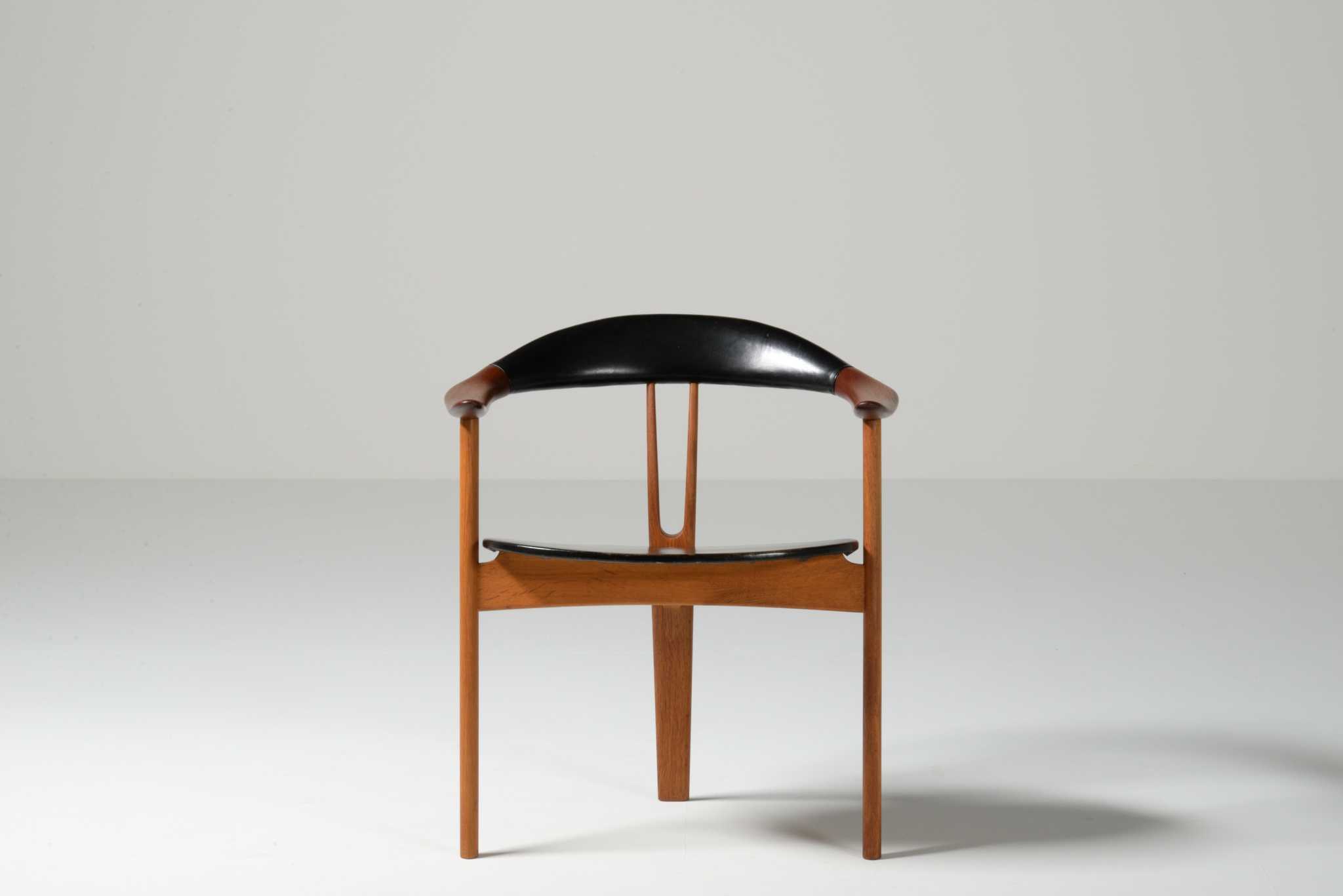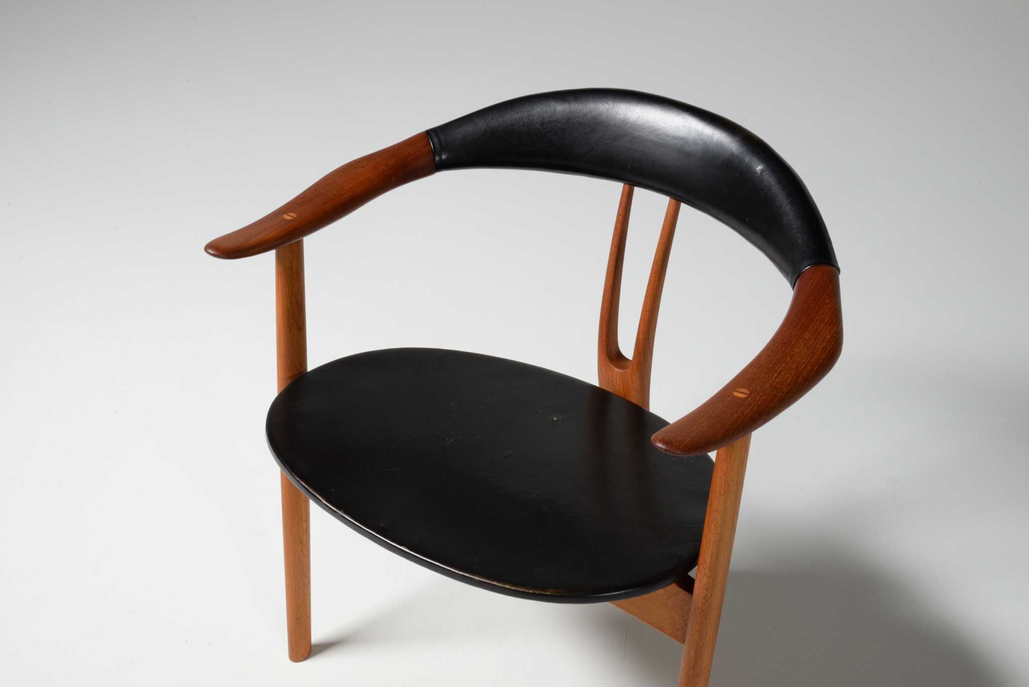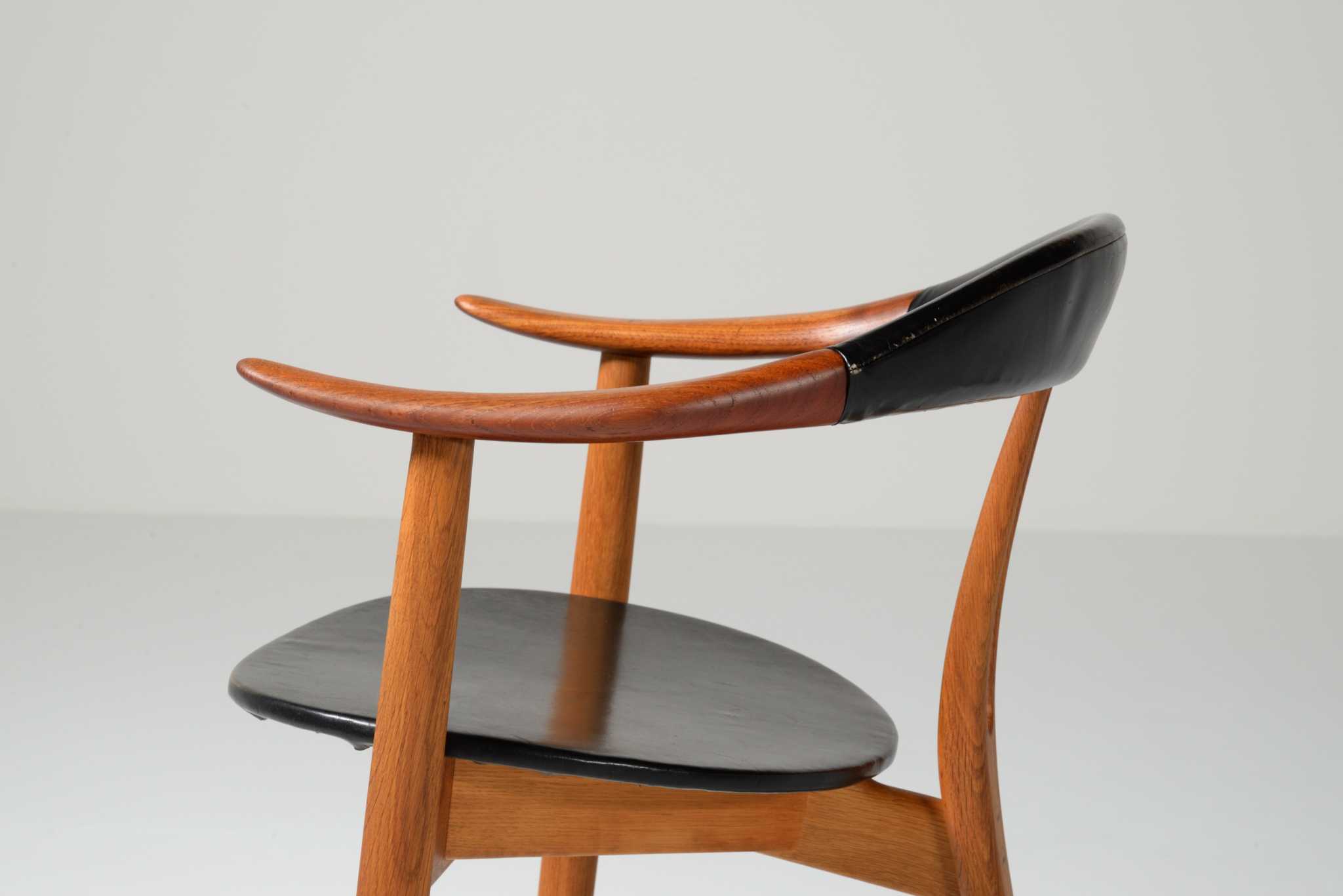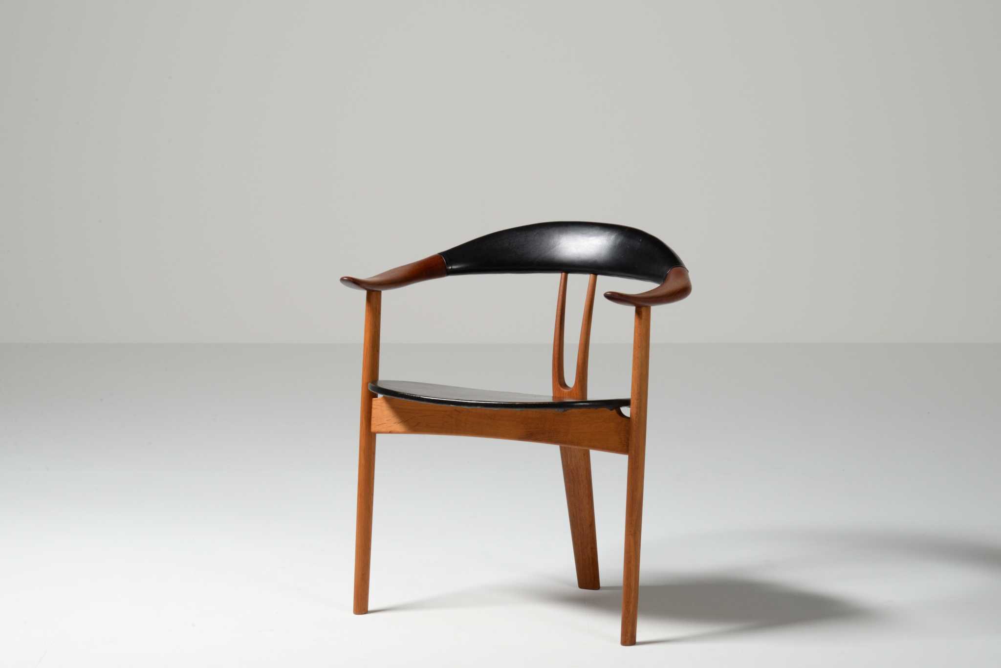 20世紀前中葉のデンマークで活躍した家具デザイナー、Arne Hovmand Olsen/アルネ・ホフマンド・オルセンによるアームチェアです。反り上がったアームと3本脚の構造が特徴的なモデルで、同年代の他の椅子に比べても異彩を放っています。思ったよりは安定しており座り心地も悪くはないですが、スカルプチャー的な用途が良さそうです。実用であれば比較的高身長の方におすすめです。皮革はオリジナルのようで、時代感も見応えがあります。