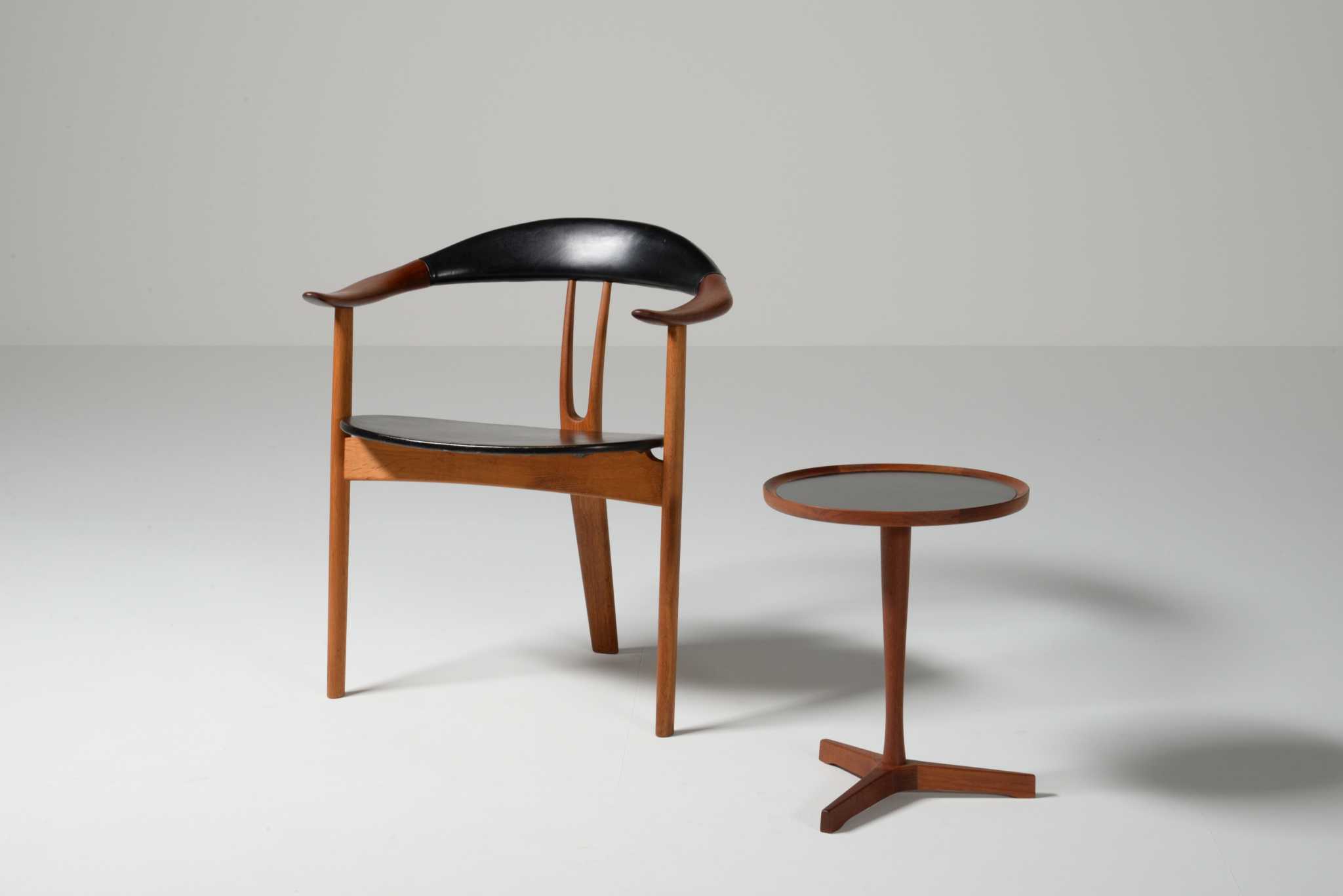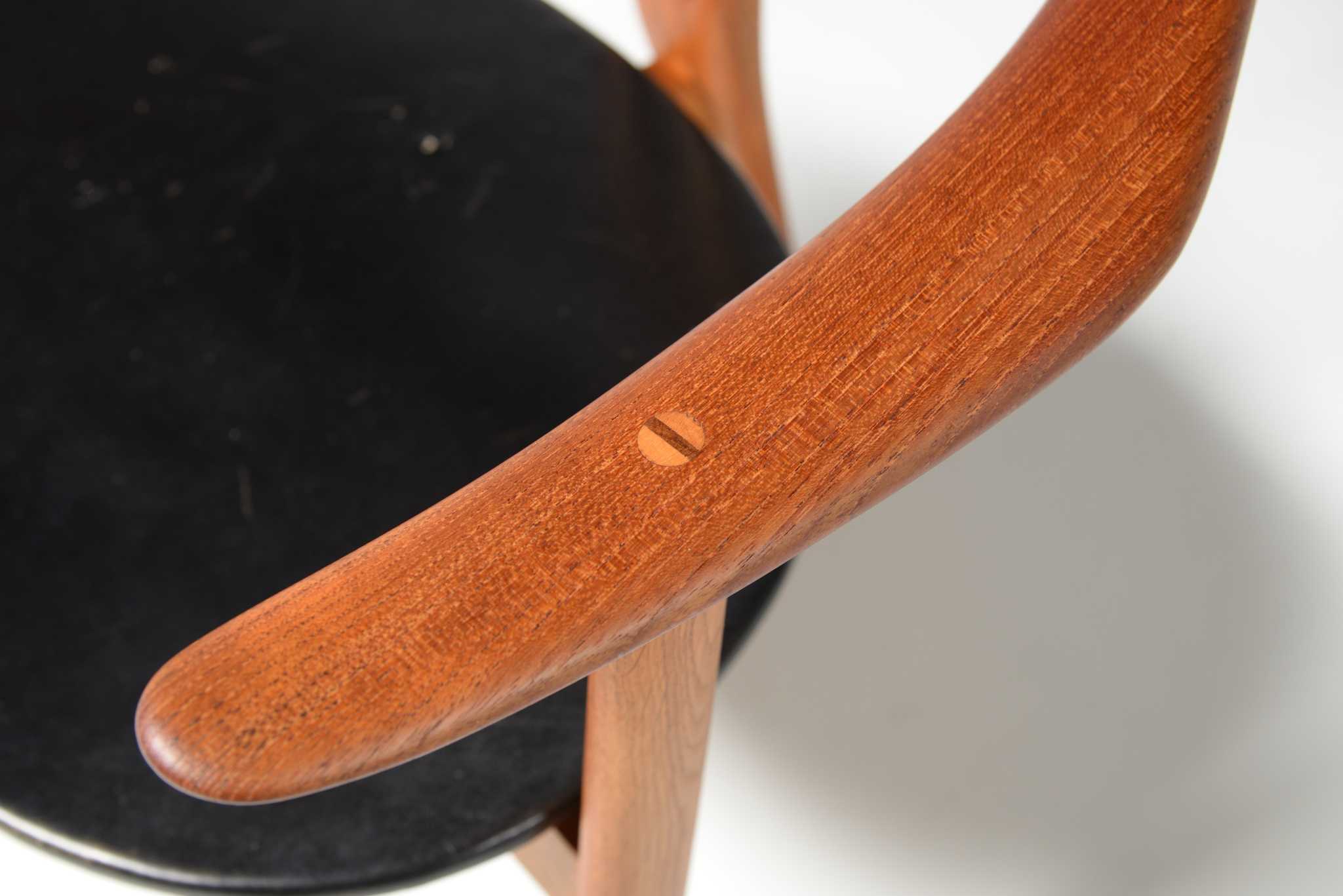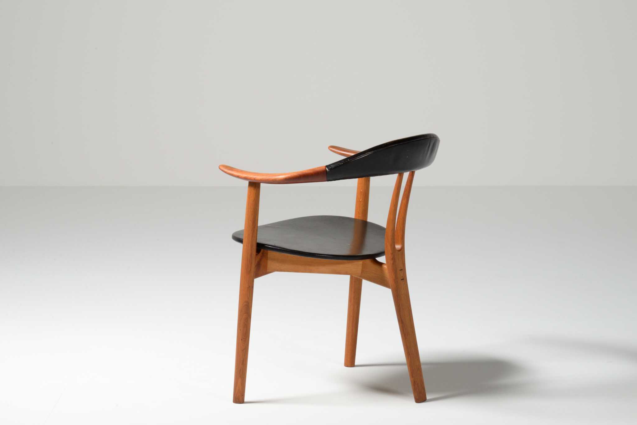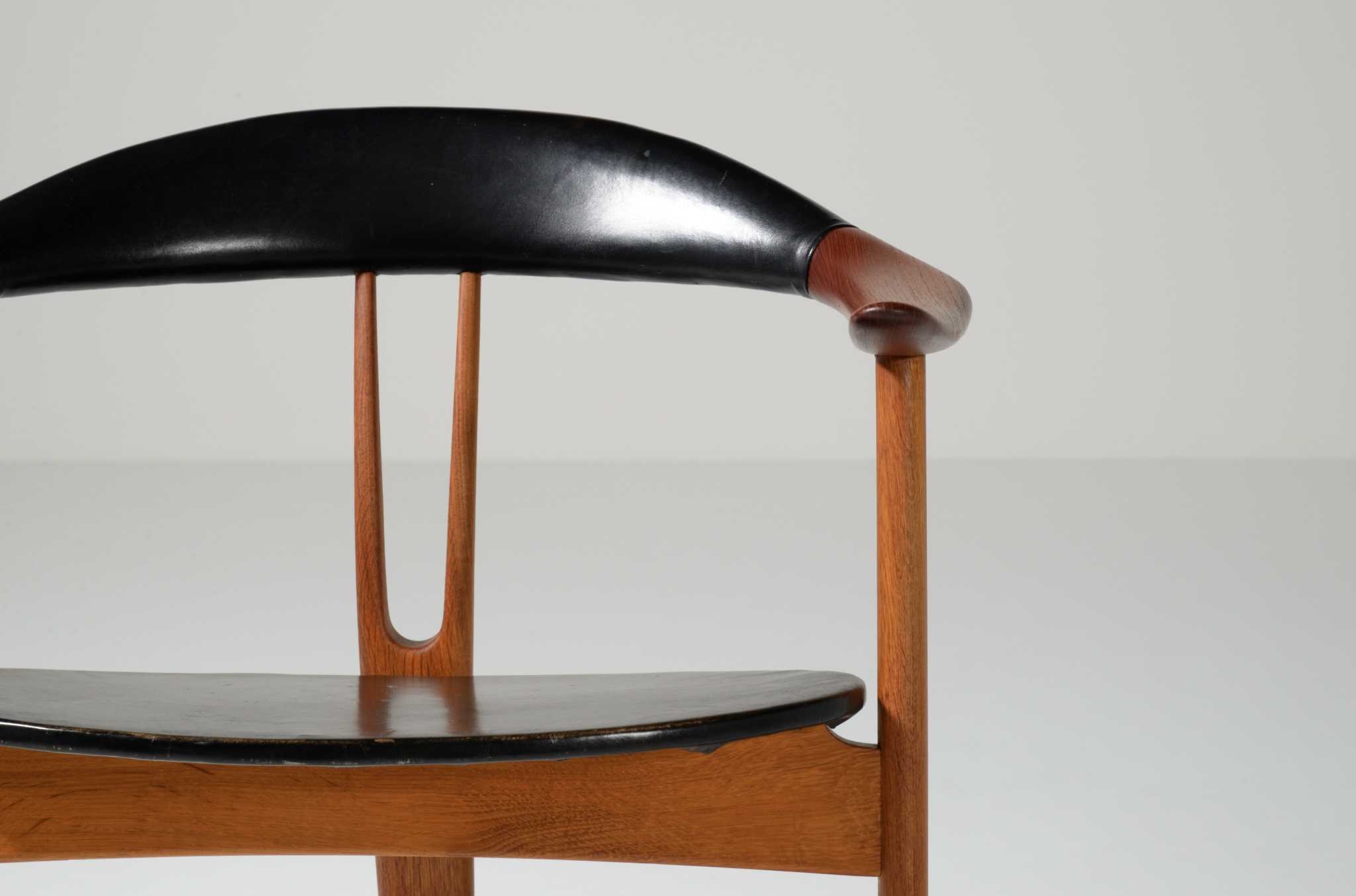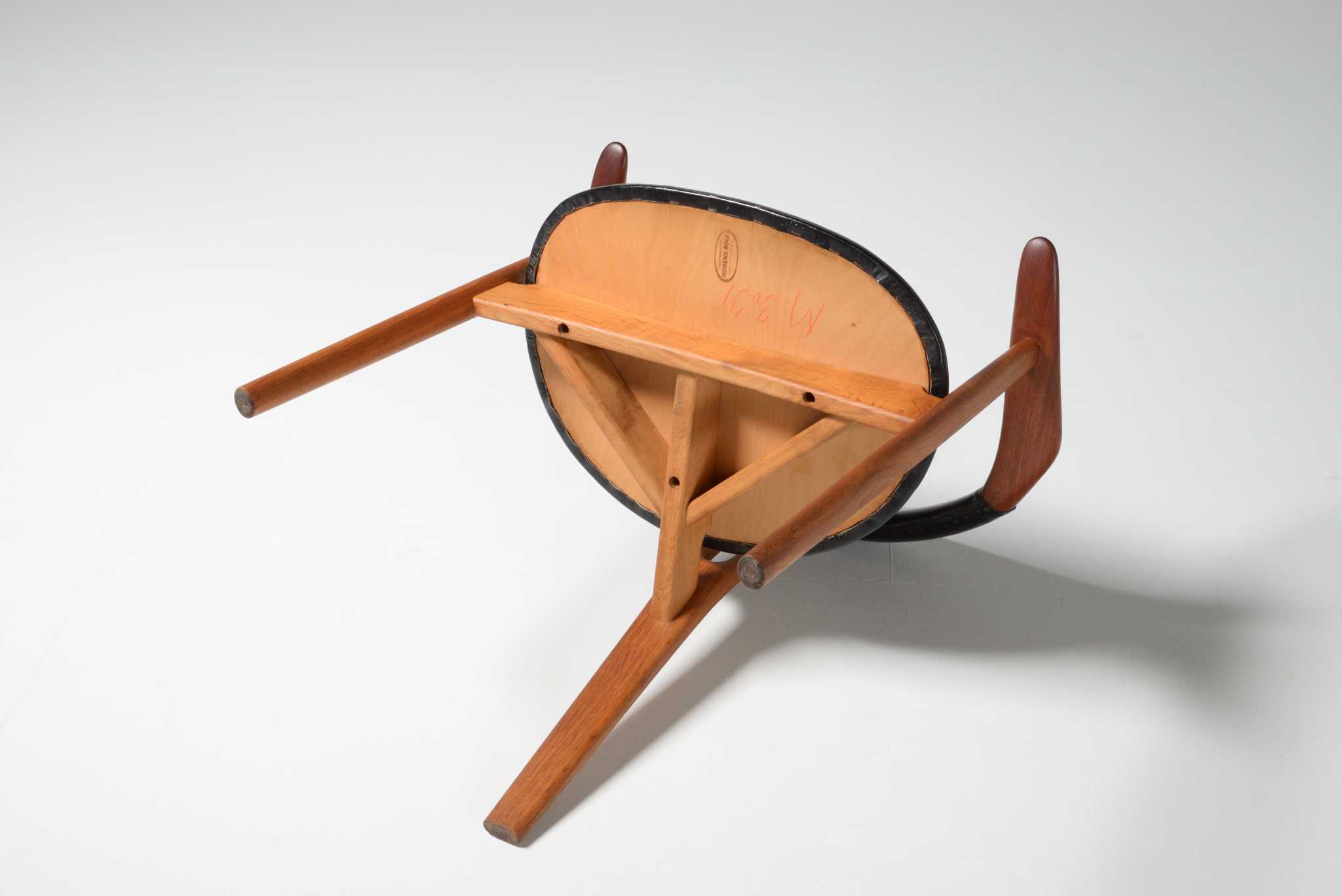 20世紀前中葉のデンマークで活躍した家具デザイナー、Arne Hovmand Olsen/アルネ・ホフマンド・オルセンによるアームチェアです。反り上がったアームと3本脚の構造が特徴的なモデルで、同年代の他の椅子に比べても異彩を放っています。思ったよりは安定しており座り心地も悪くはないですが、スカルプチャー的な用途が良さそうです。実用であれば比較的高身長の方におすすめです。皮革はオリジナルのようで、時代感も見応えがあります。